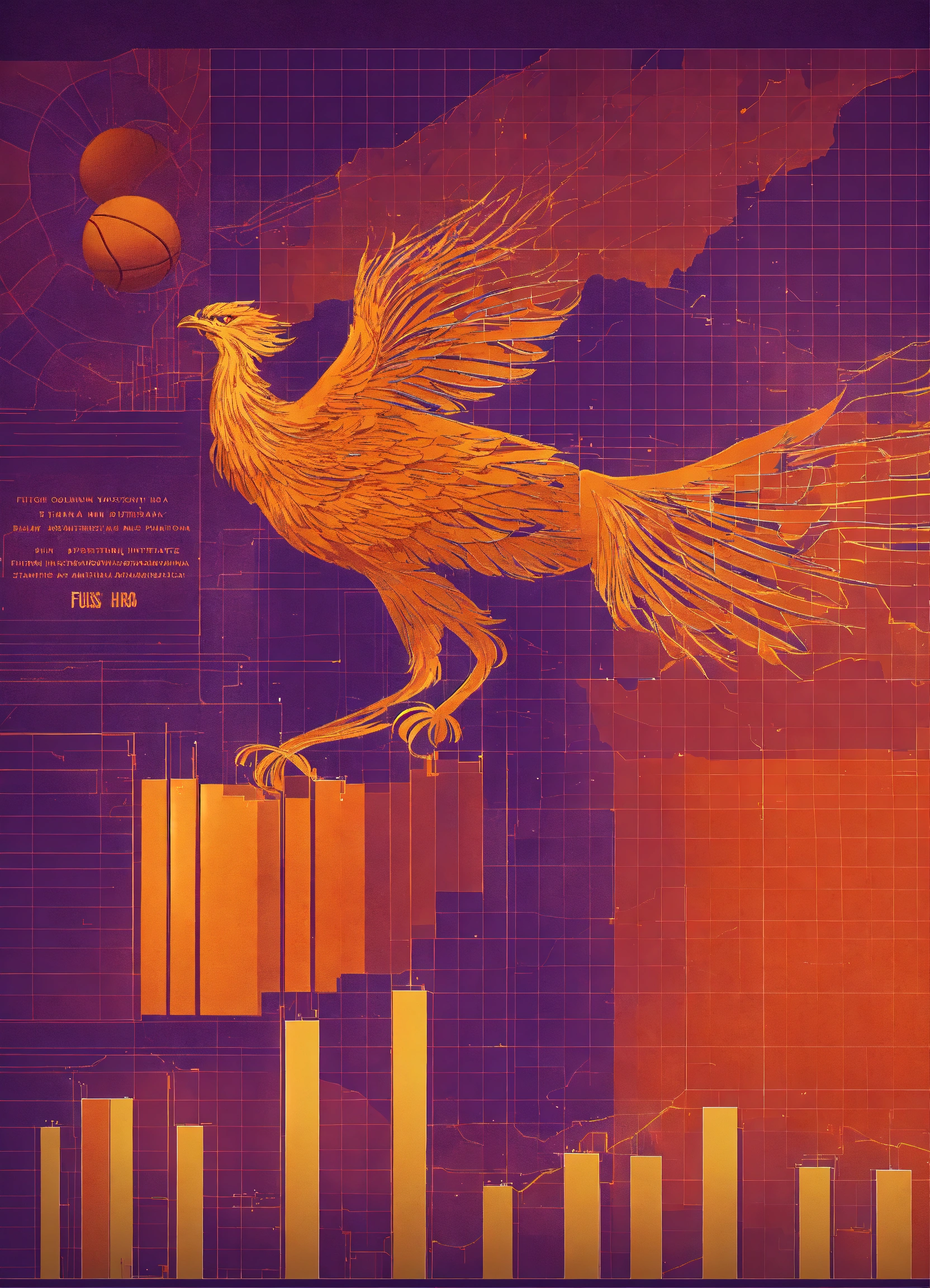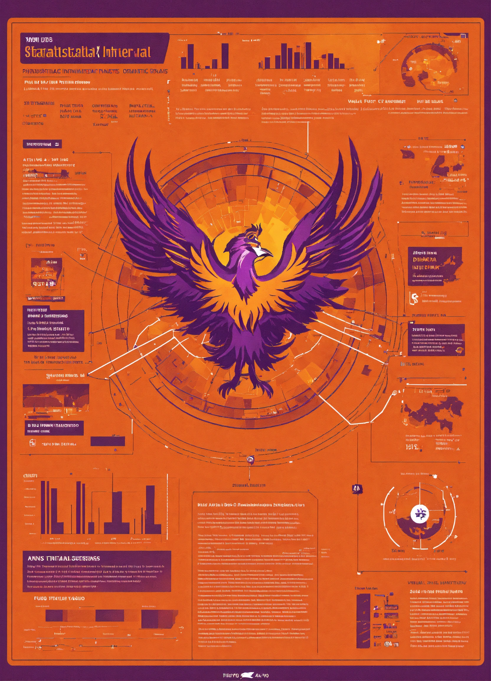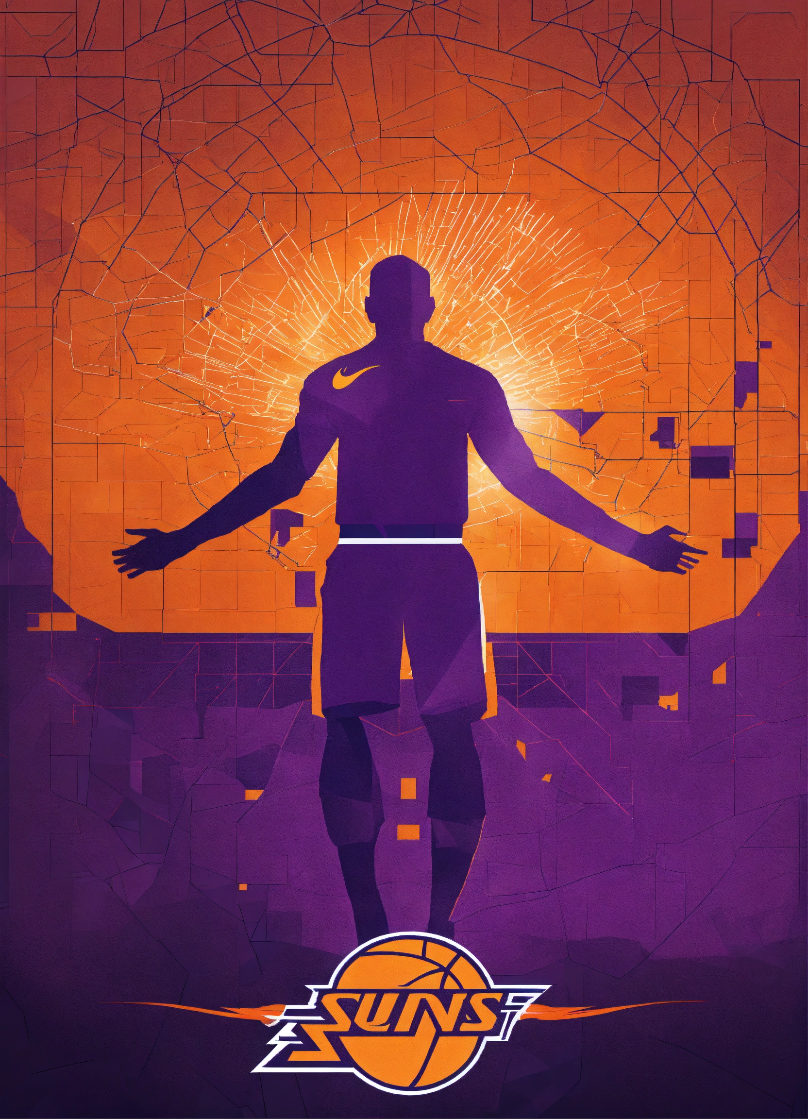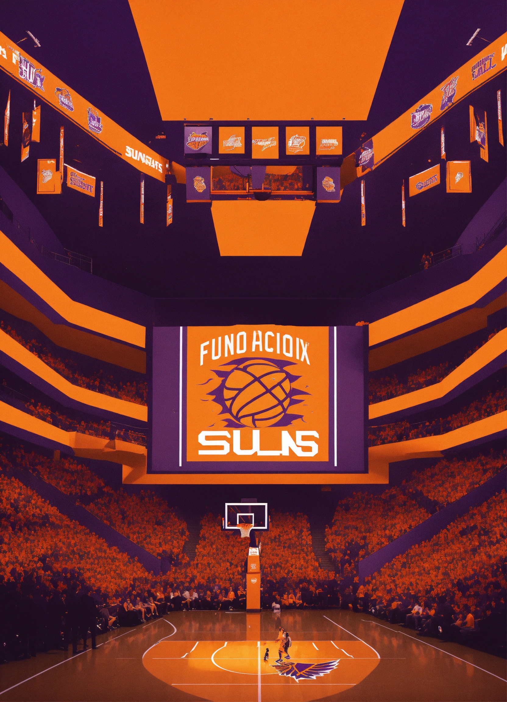 Create an image that represents the fusion of statistical analysis and visual data interpretation within the phoenix suns organization. show data scientists engaged in statistical analysis and visual data interpretation, intertwined with cinematic elements that convey the vibrant atmosphere of a suns game.