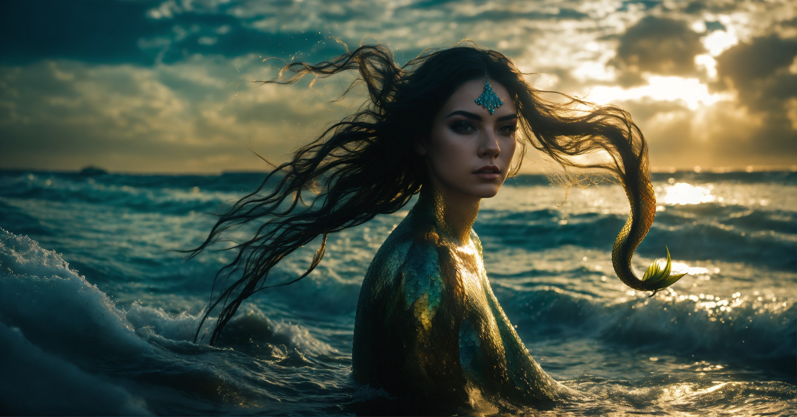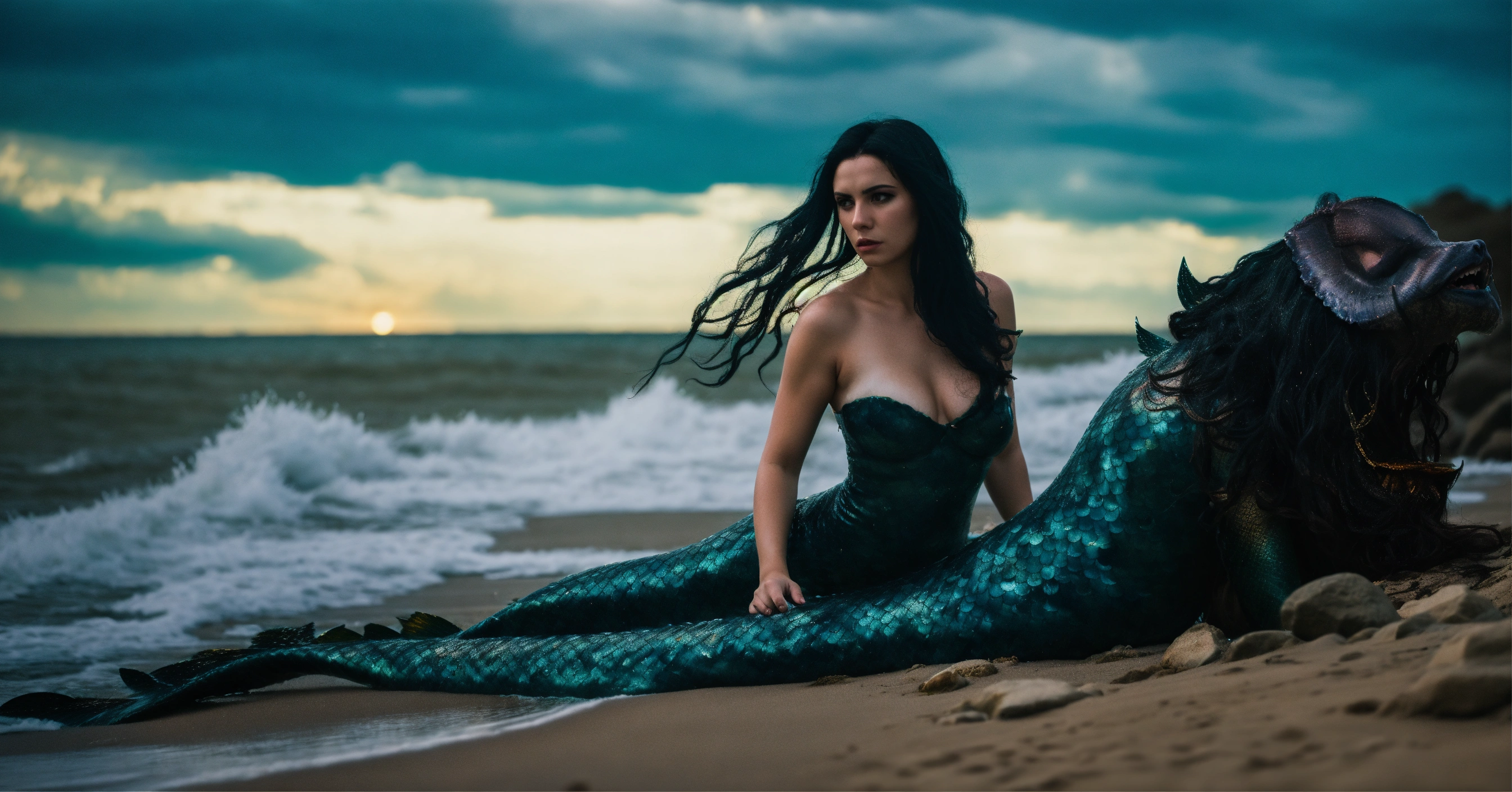 Create a 4k detailed stereoscopic photo of an evil mermaid with black hair, at the shore, dramatic lighting