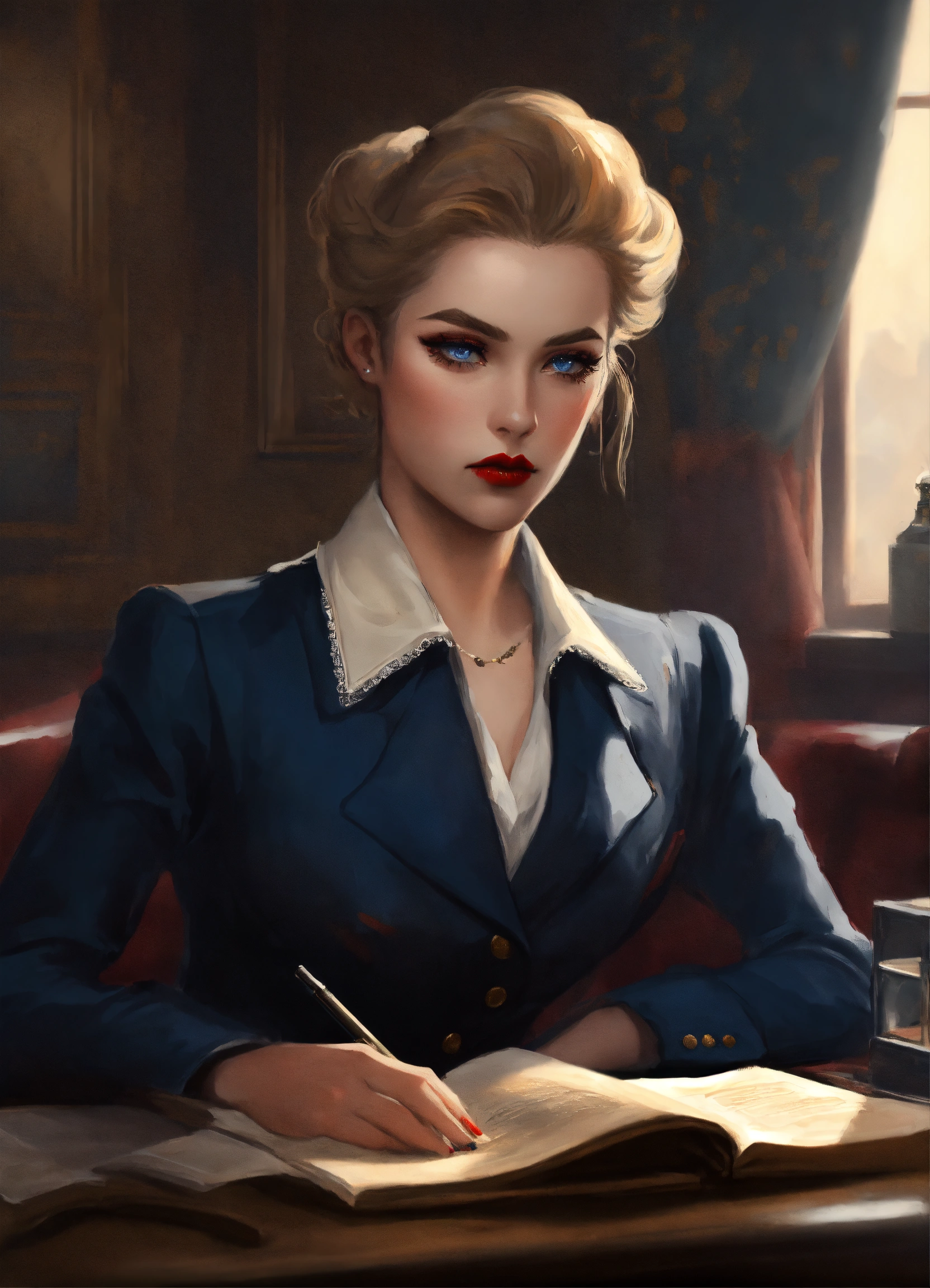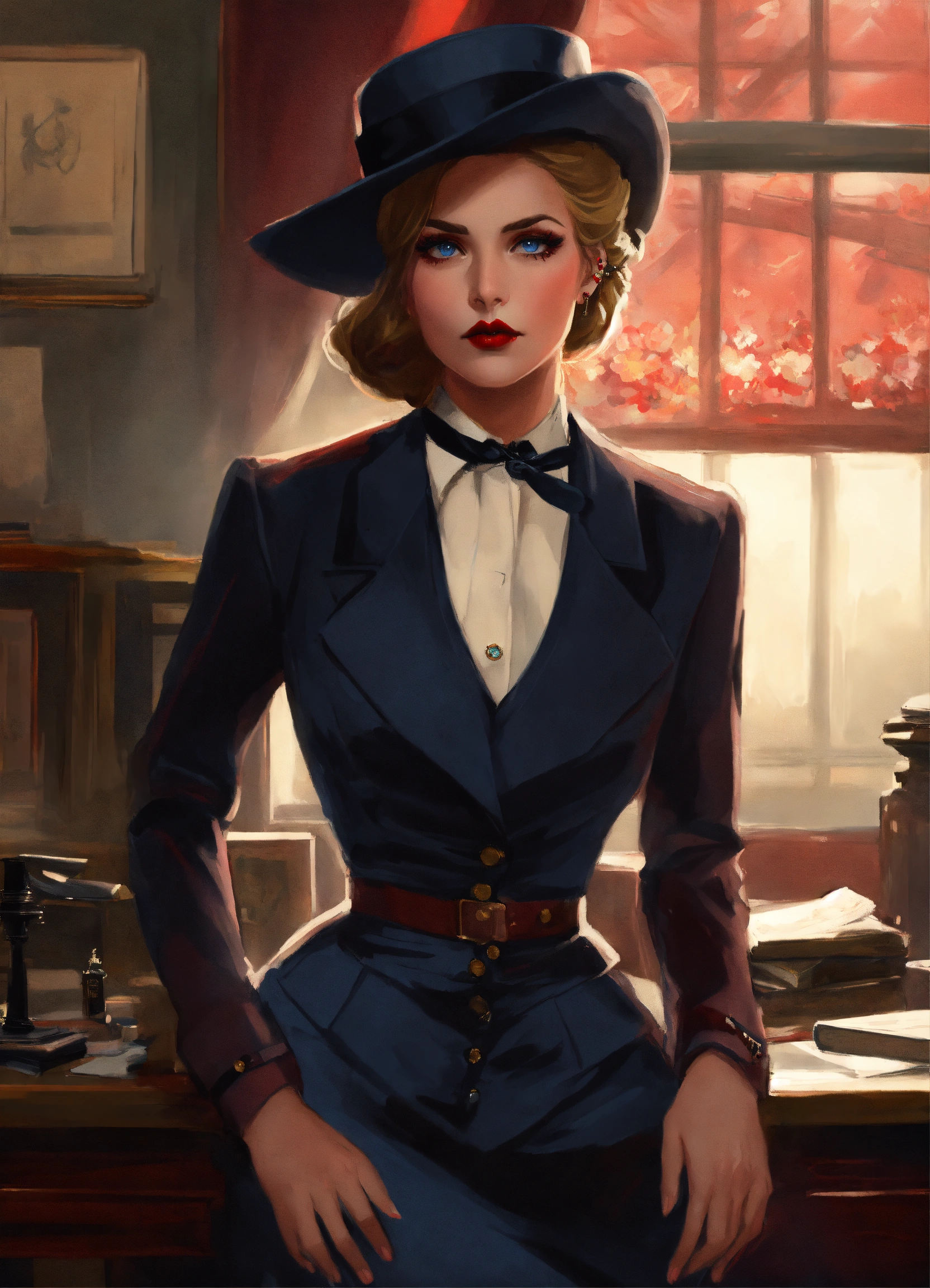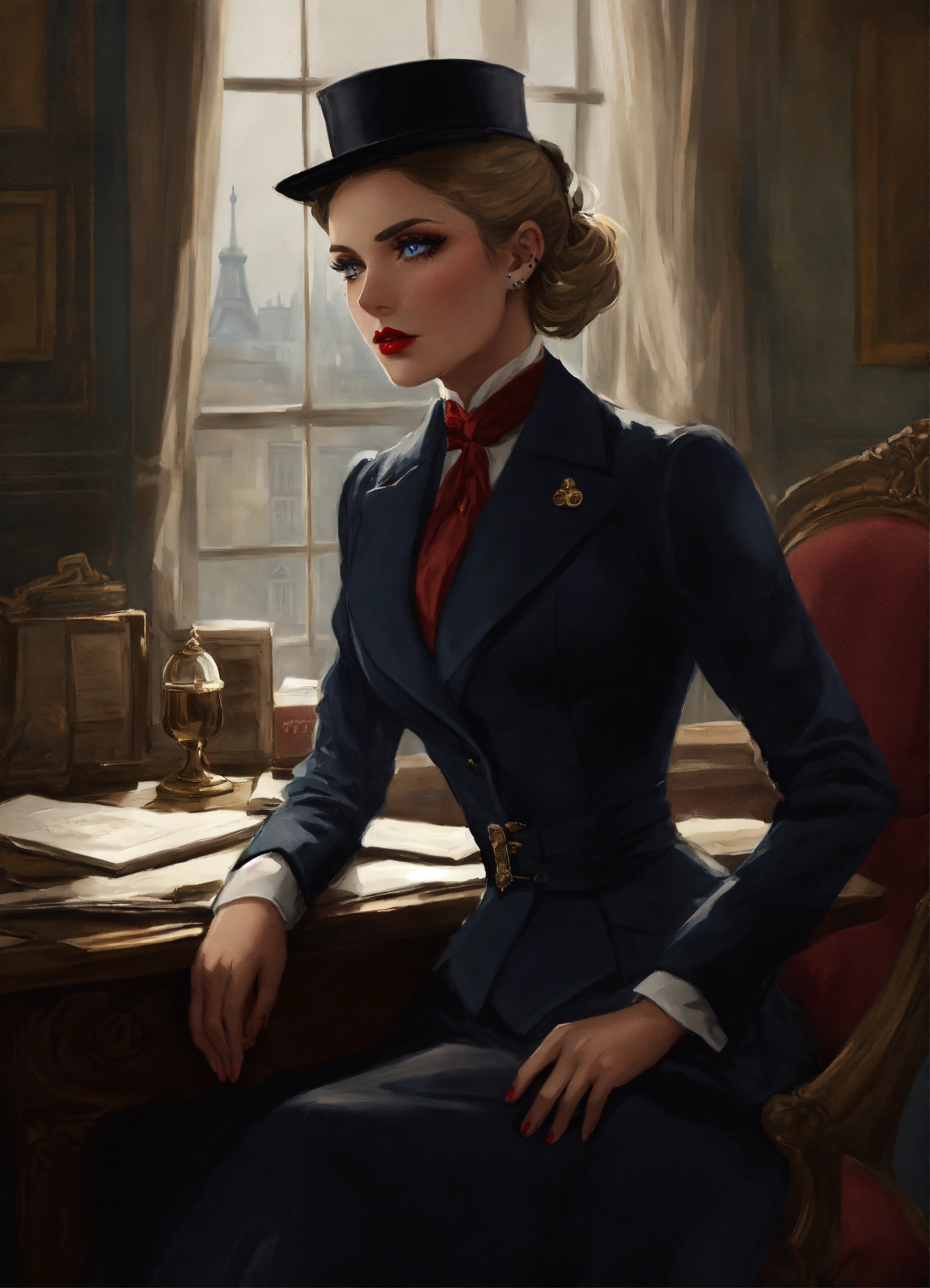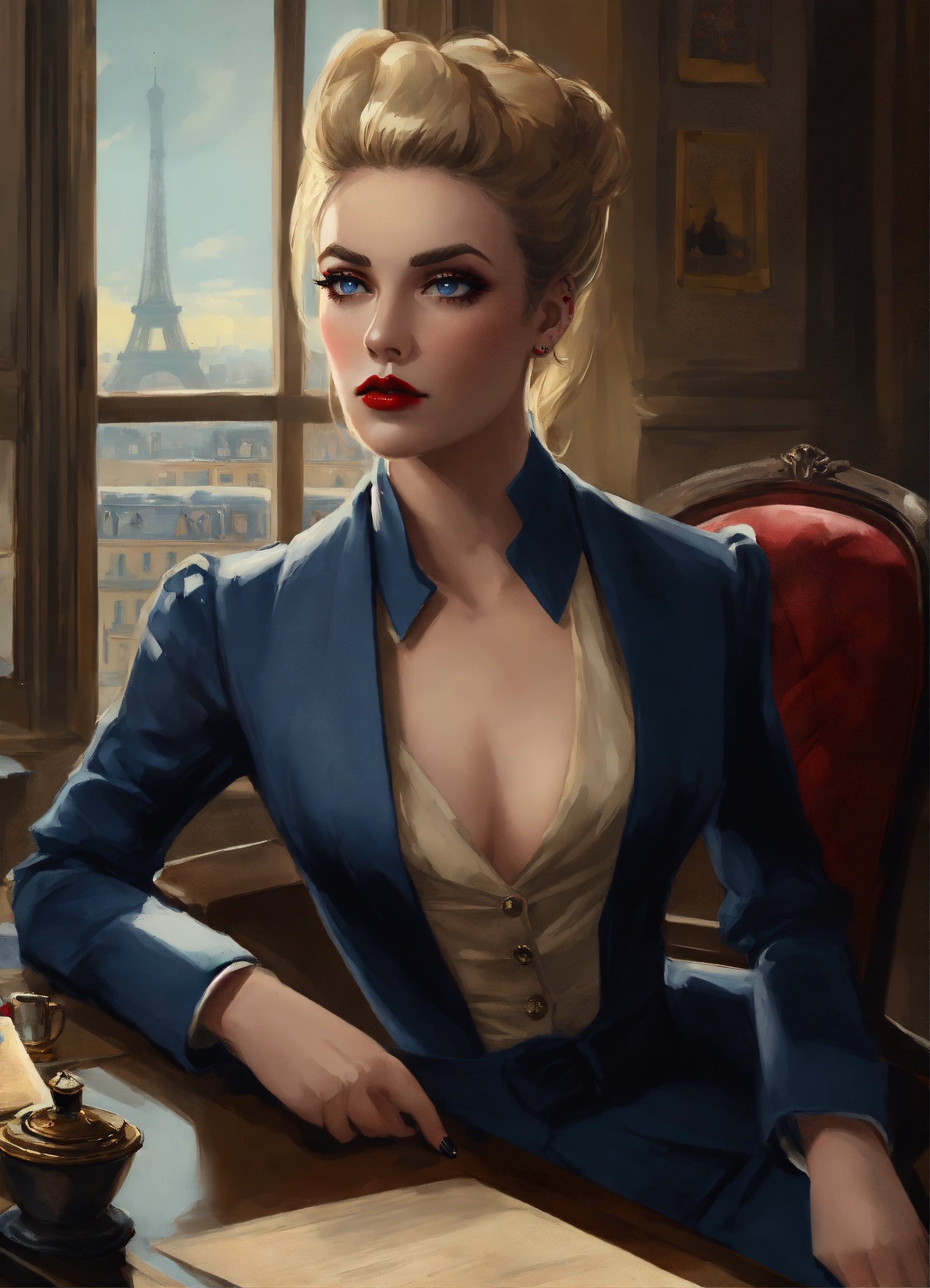 Digital painting of paris in 1890 showing a strong female leader with an athletic build seated confidently at her office desk on a gloomy day. she wears a stylish female 1950s outfit with open chest buttons, a matte top hat, and a sleek black coat. her blonde hair is neatly tied in a low ponytail. her face features bright skin, piercing blue eyes, arched eyebrows, and subtle makeup, contrasted with her full lips painted in dark red lipstick. the somber ambiance and her cunning expression intensify the vintage feel and enigmatic vibe.