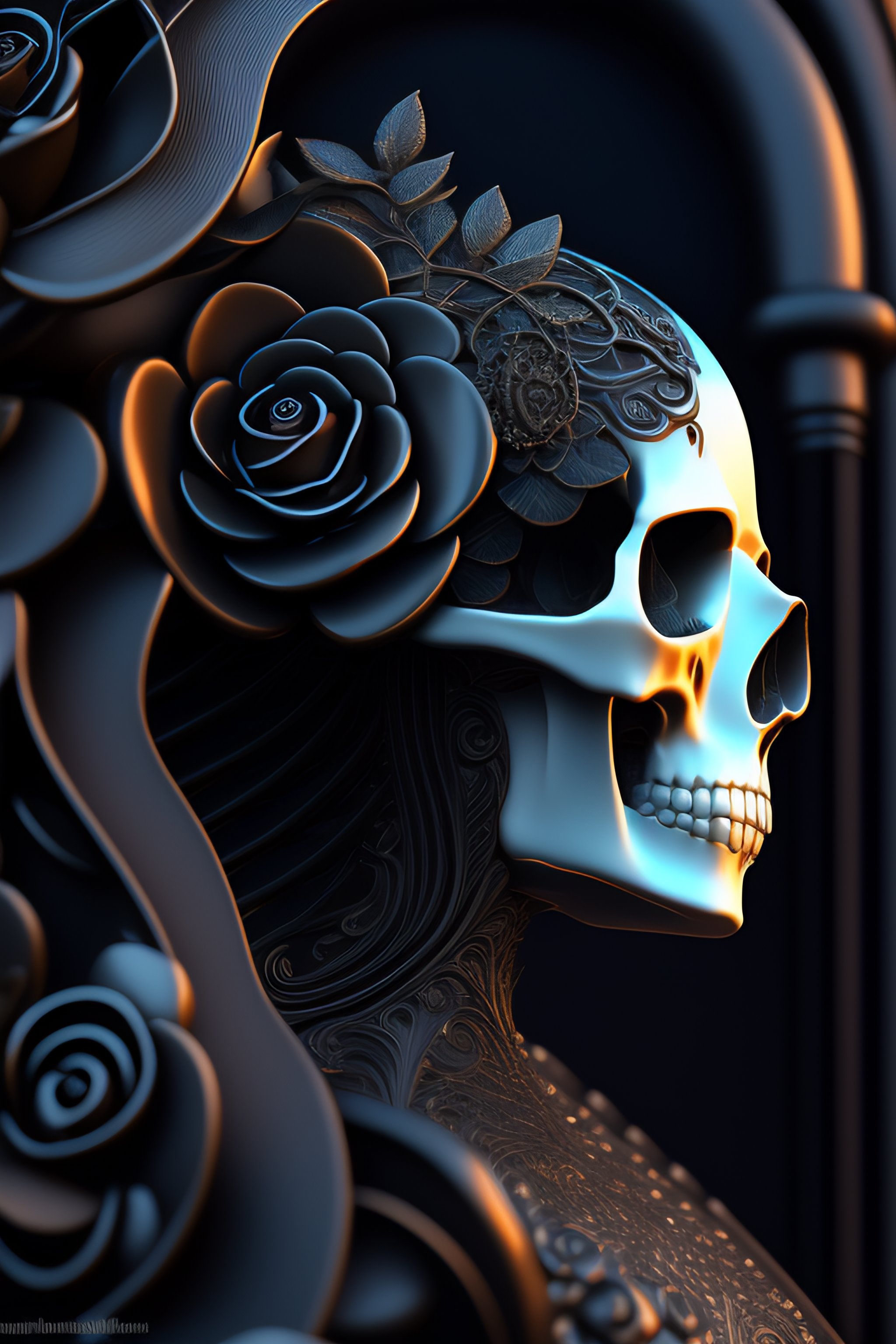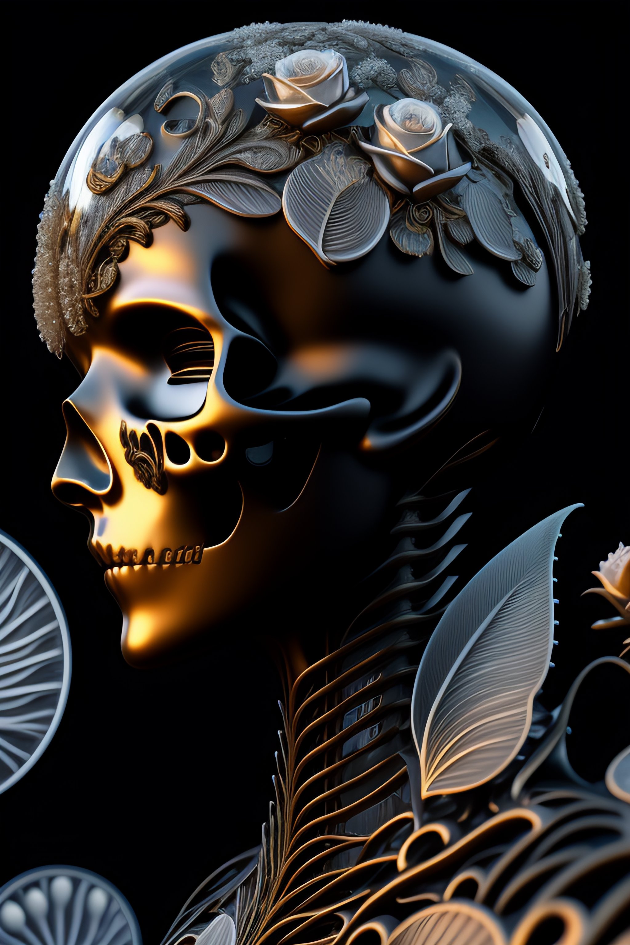 Mythical dreamy black and white organic bio - mechanical spinal ribbed profile face portrait of skull praying, detail of translucent steampunk beautiful intricate monochrome angelic - human - clockwork - vegetal - roses - gothic - cyborg, highly detailed, intricate translucent ivy jelly ornate, poetic, translucent microchip ornate, 3d render, digital art, octane render, 8k artistic lithography, cirlcle, gateway, wide shot