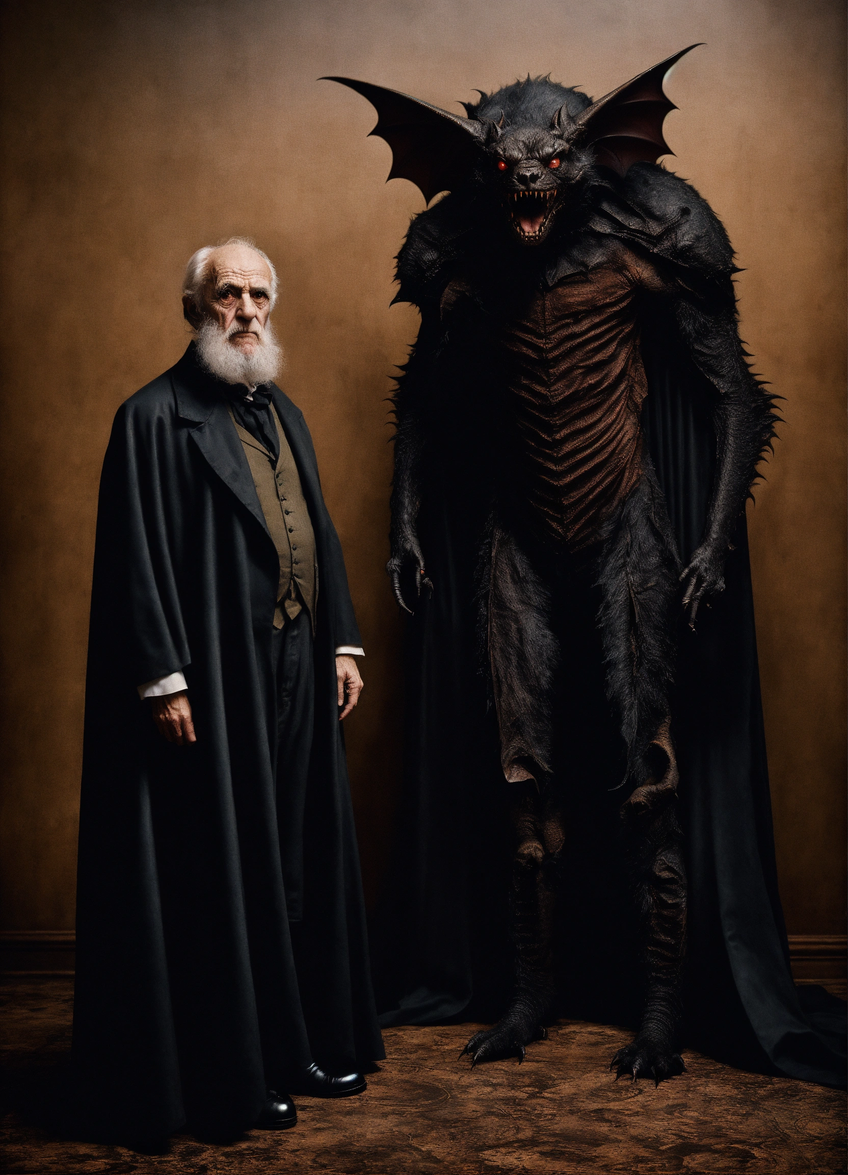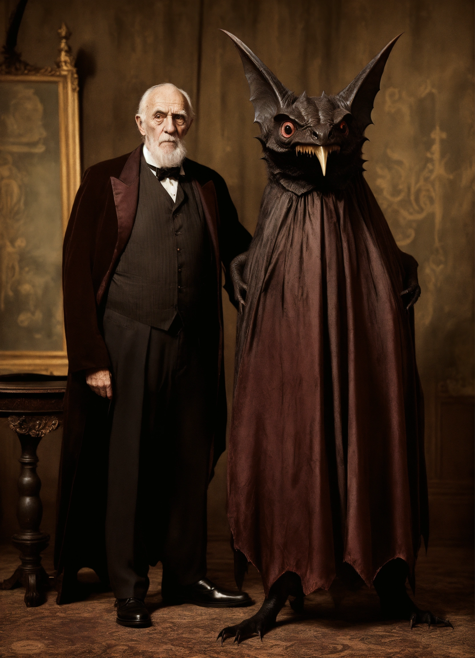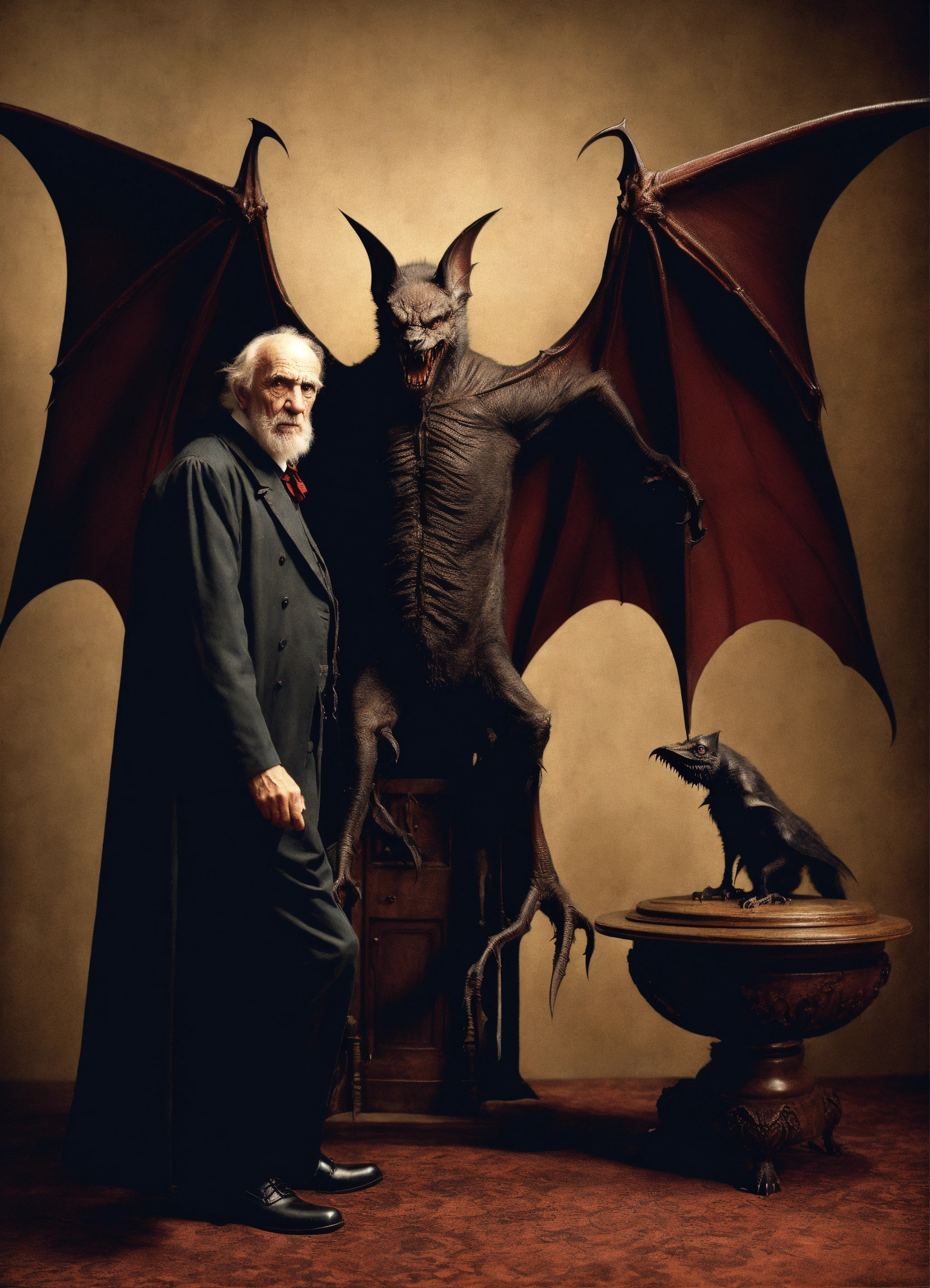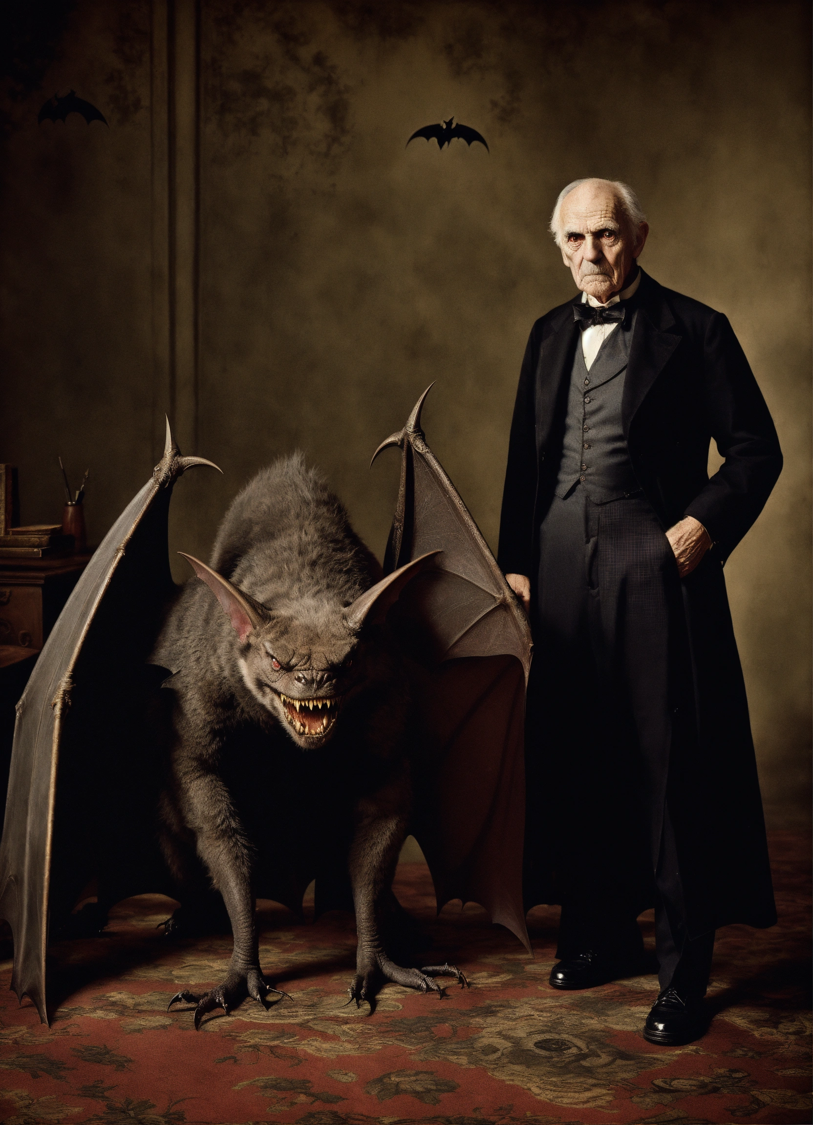 Old vampire man standing next to a giant bat monster, in the style of contemporary vintage photography, necronomicon illustrations, tabletop photography, 1890, hyperrealistic animal portraits, ghostly presence, whirring contrivances