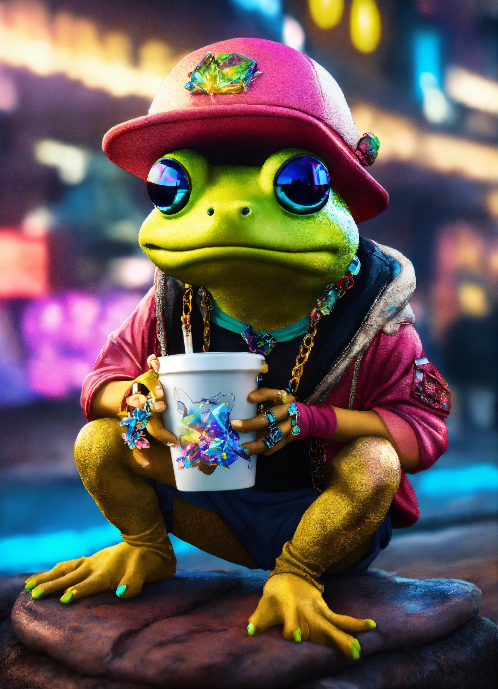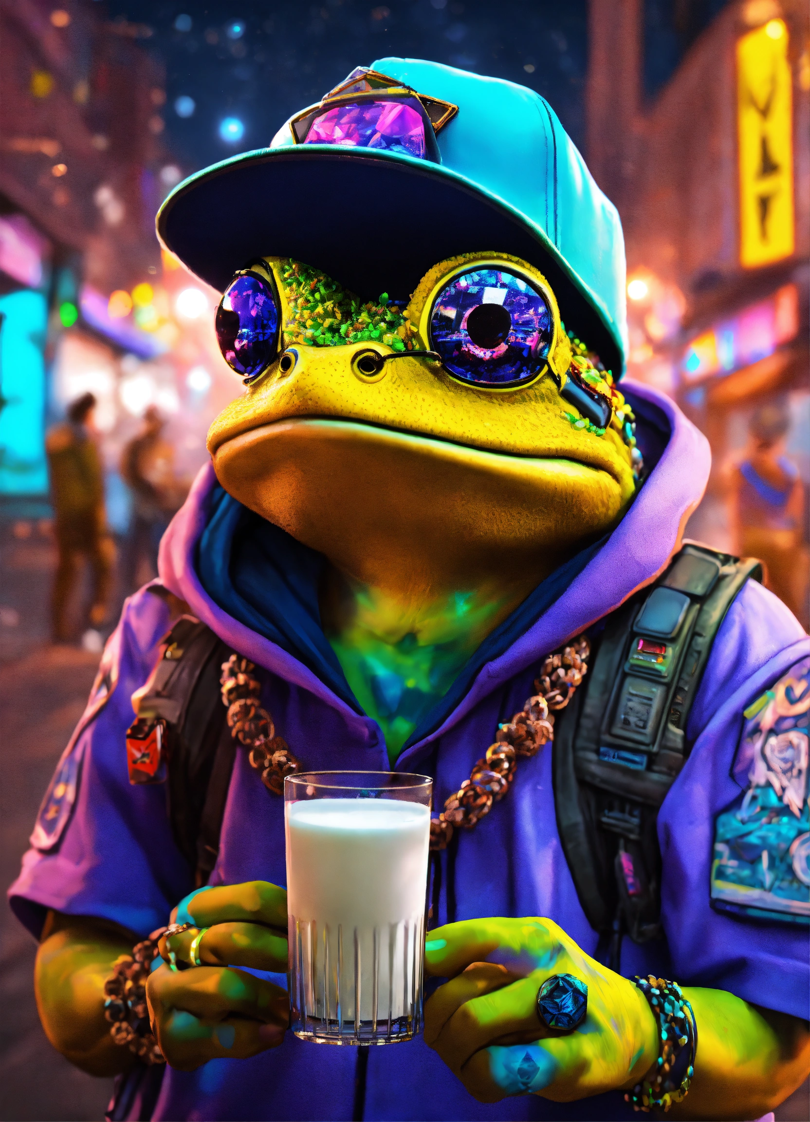 A toad drinking milk slice of life anime, cyberpunk colorado festival raver toad, crystal hemp necklace, baseball hat, of a person in urban street wear, psychedelic dmt clothing, vaping crystals photorealistic, volumetric lighting, 8k, highly detailed