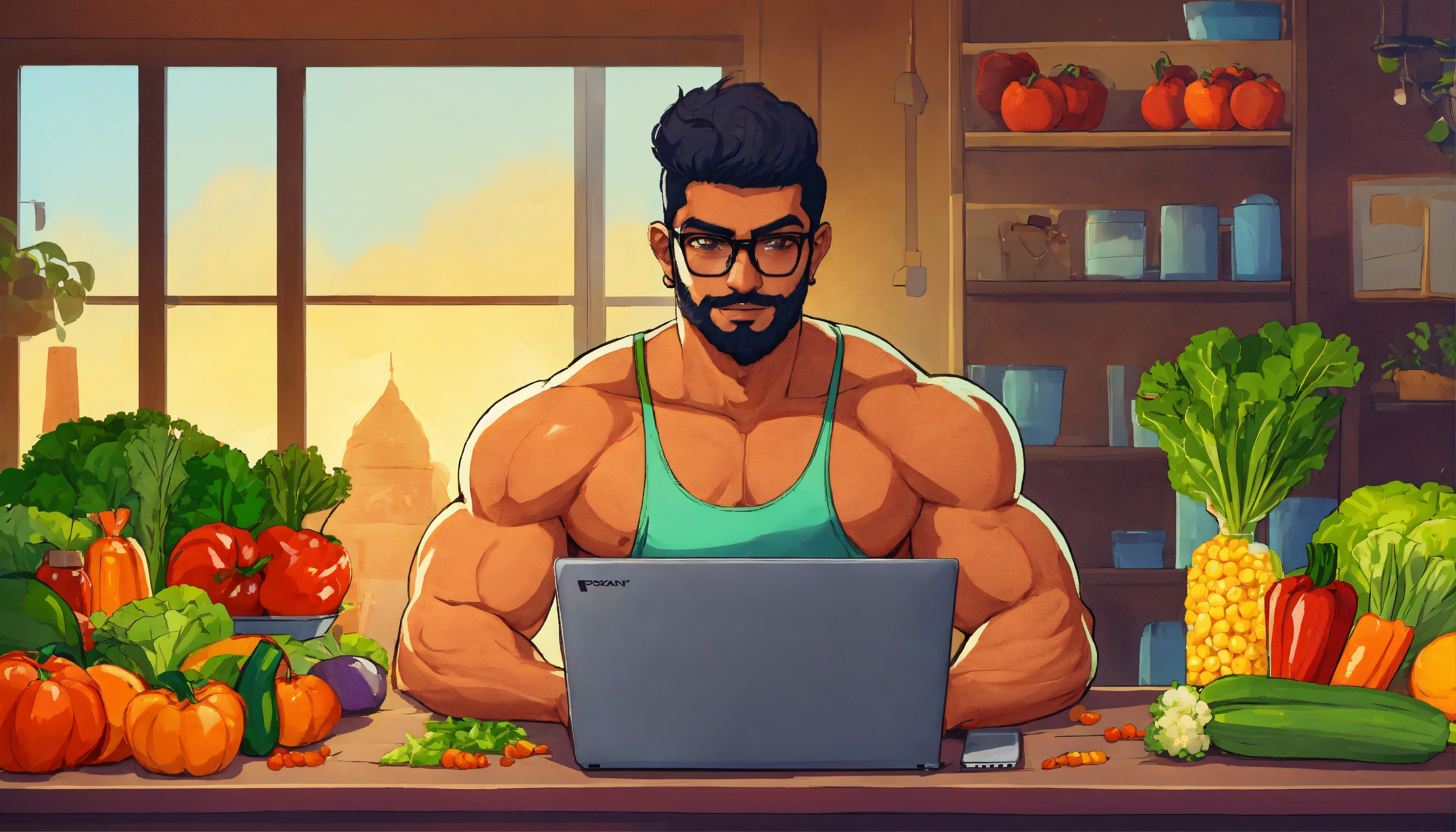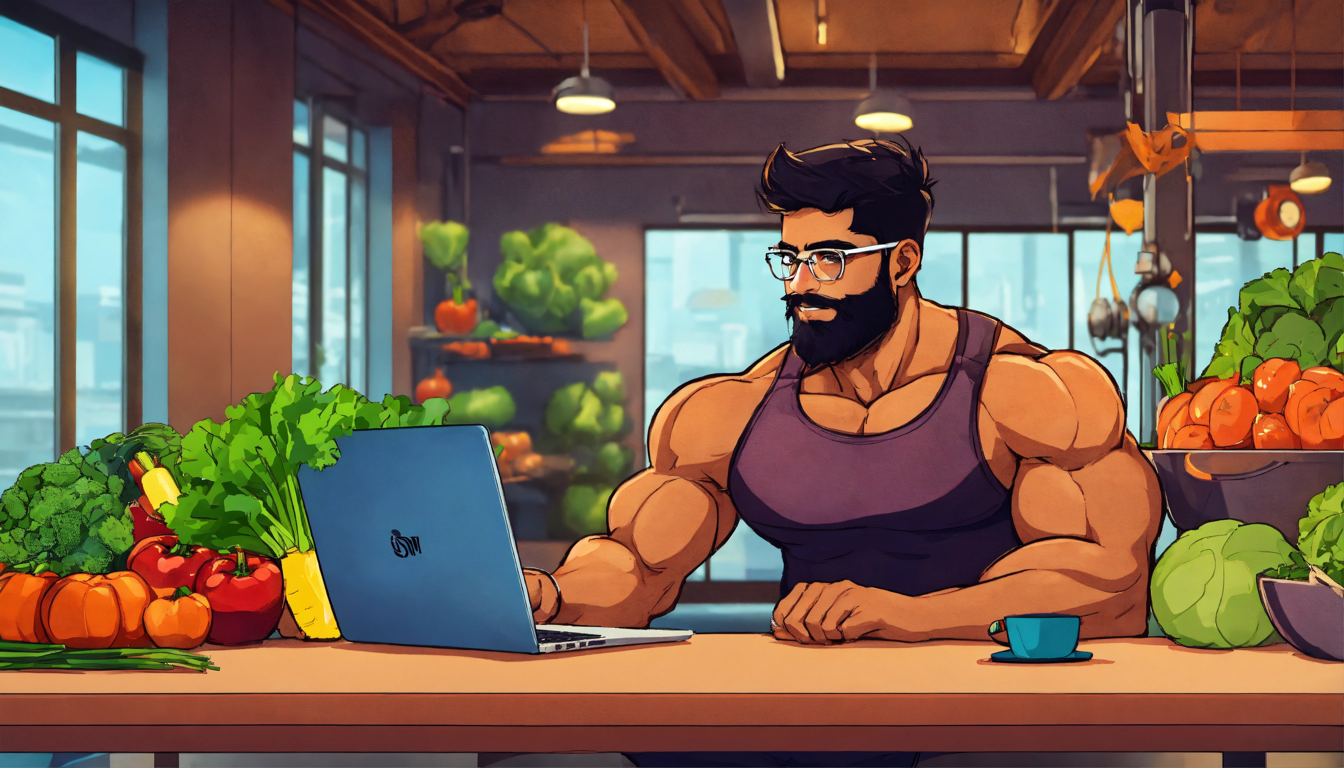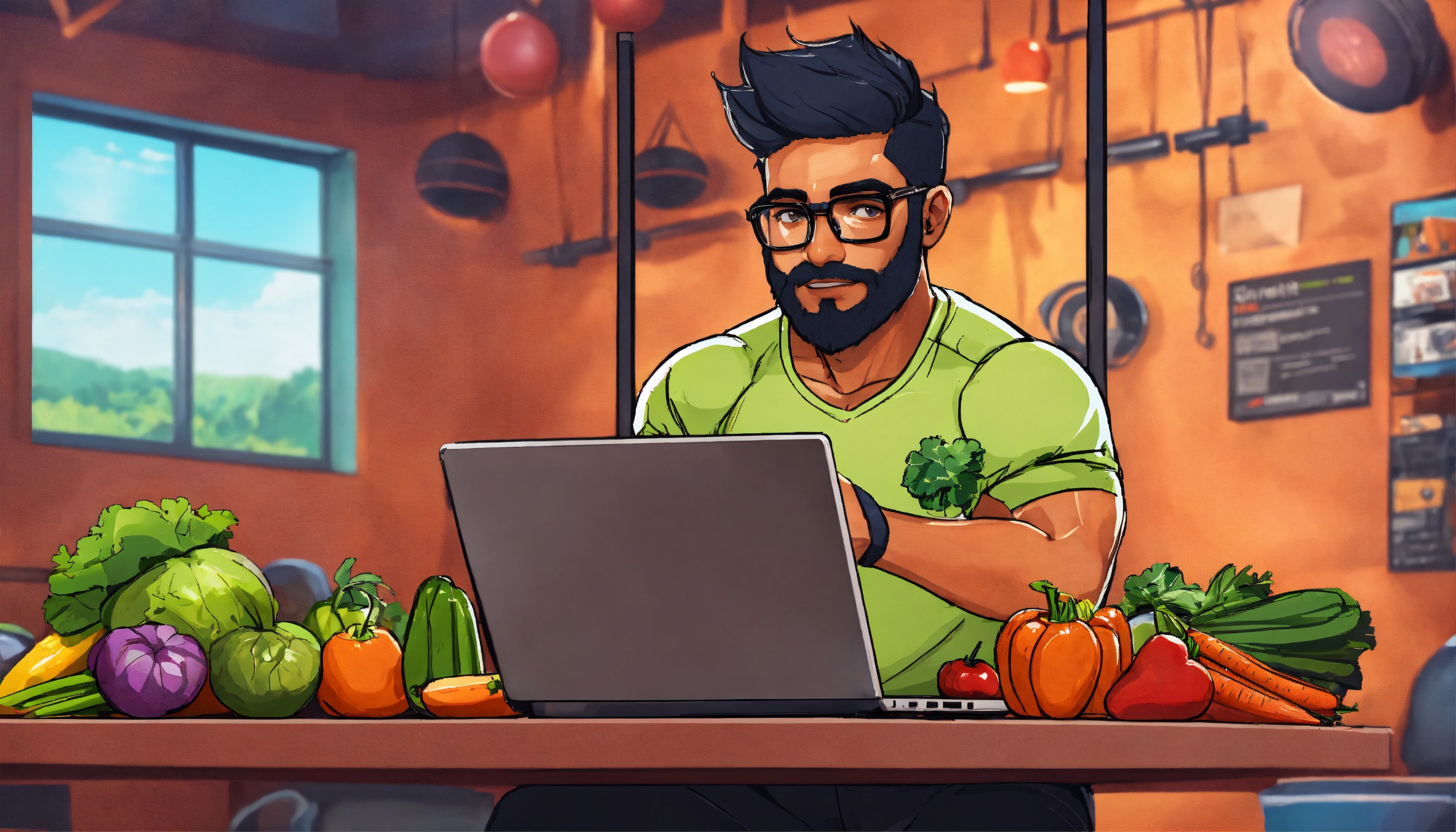 Indian man fitness freak wearing glasses at a fitness gym coding on a laptop with veggies in the style of a cartoon