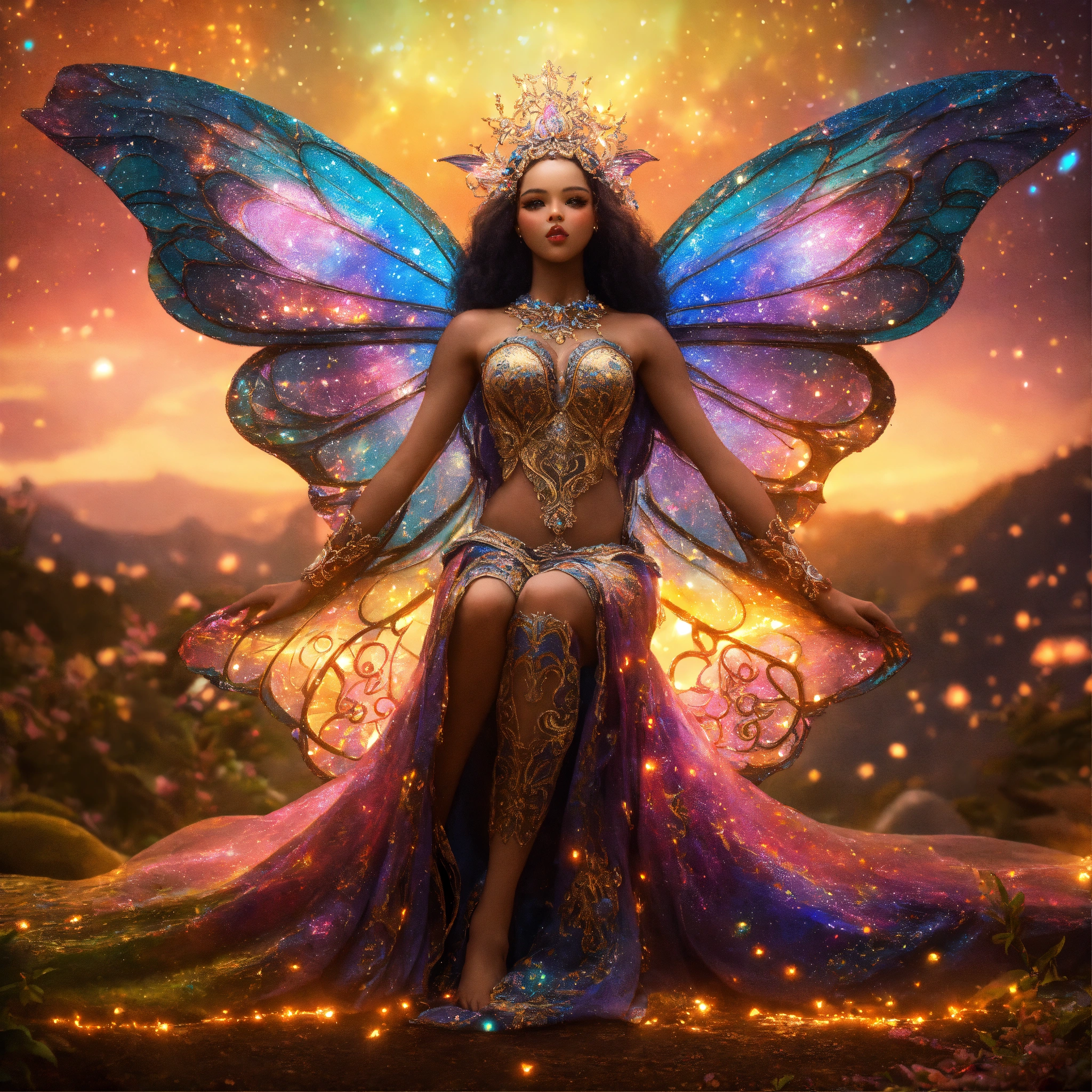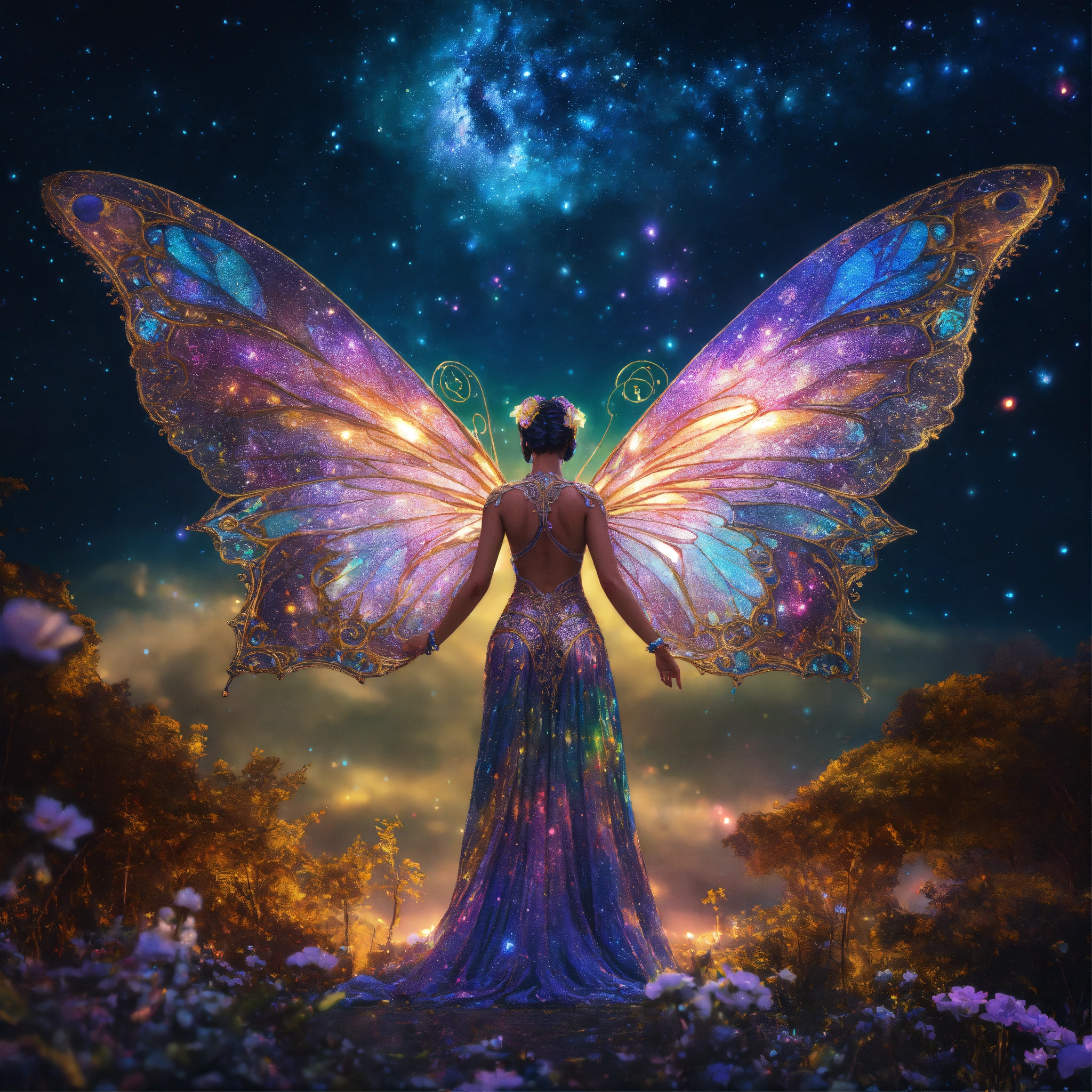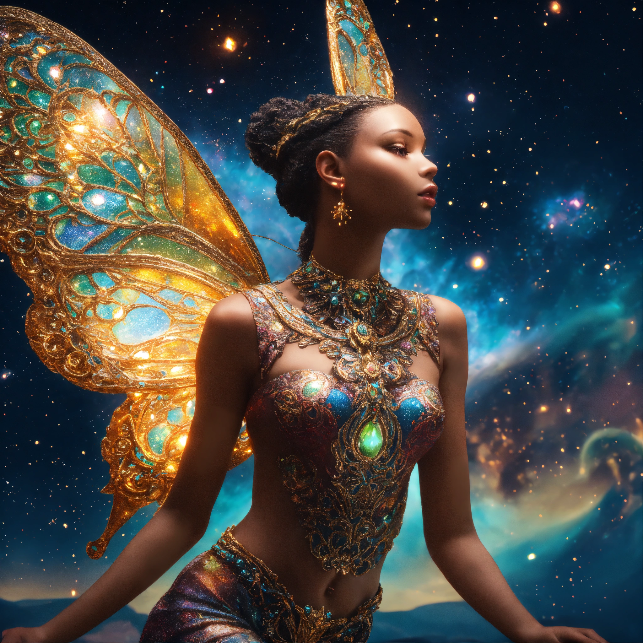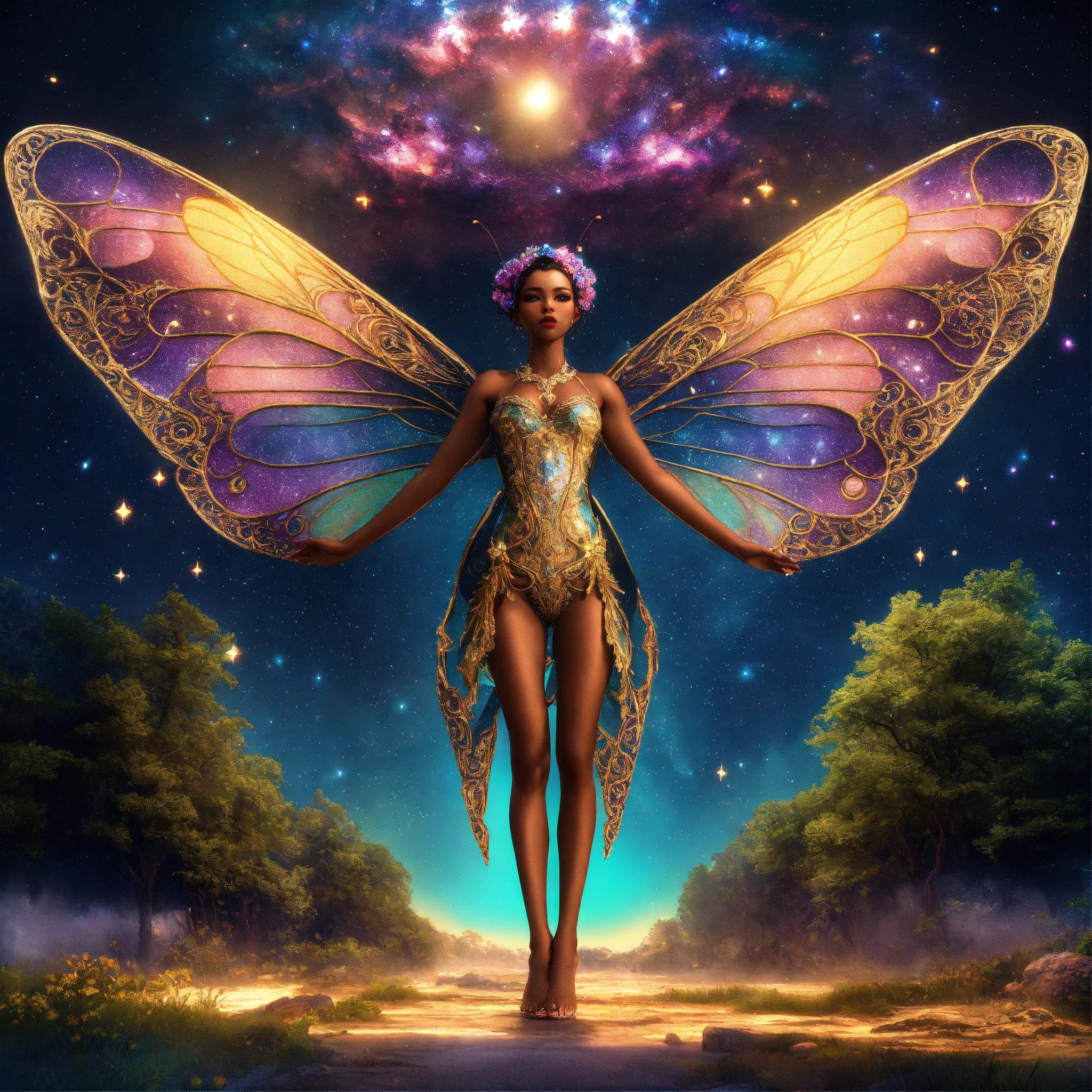 A 3d stunning interpretation full body shot rising up milky way, translucent, iridescent, fluorescent black woman faerie, queen of faerie butterfly, surreal, hyperdetailed, intricate details, shinning bright, extremely luminiscent, professional color grading, joy, innocence, natural lighting, fantasy, expressive, wings, beautifully ornate symmetrical face, perfect slender hand, enchanted fairytale milky way background insanely detailed and intricate ornate maximalist, full hd, 8k