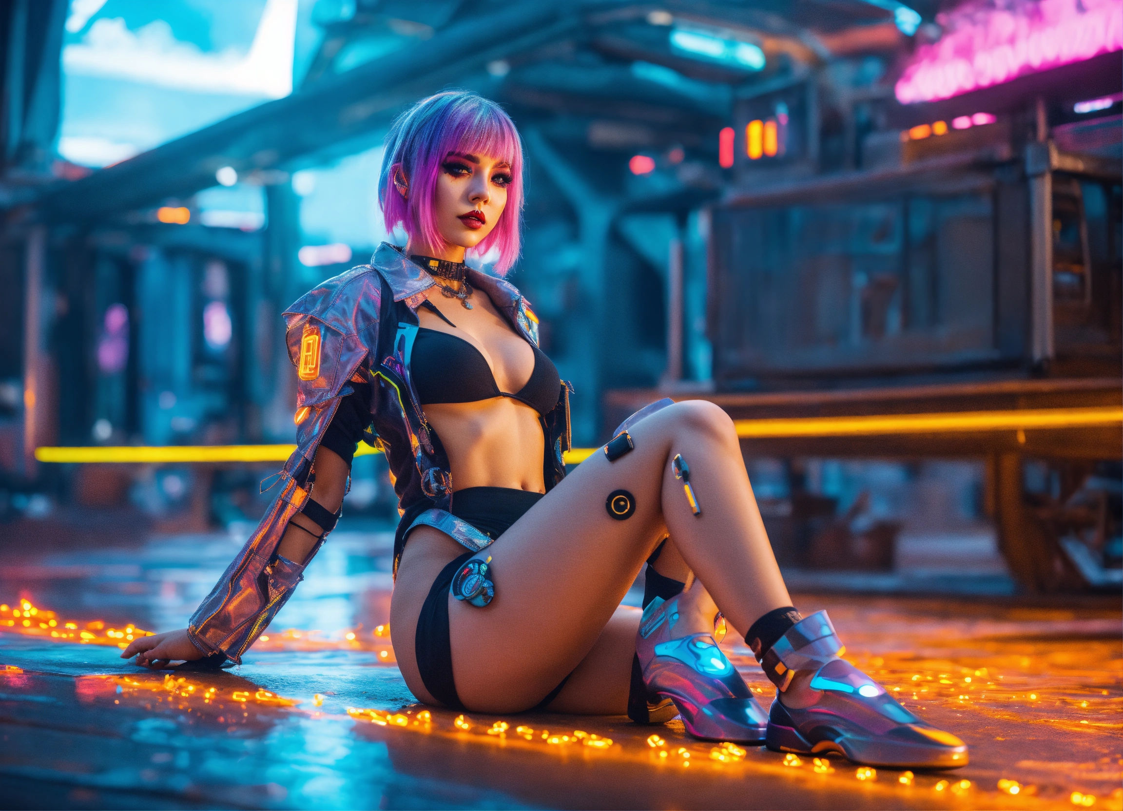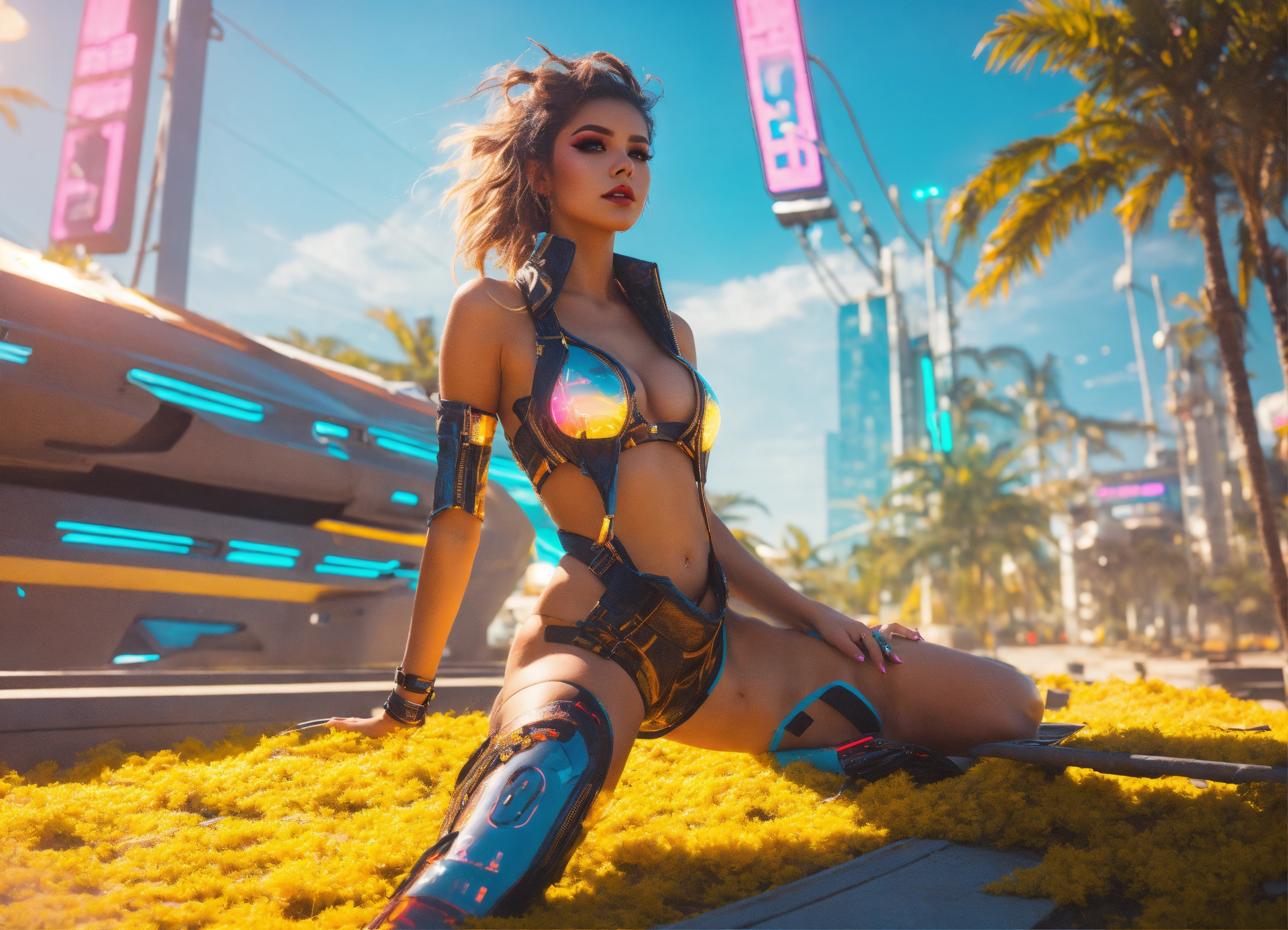 Full body, photo, sci-fi dream girl, futuristic, sunny weather, open shirt, wearing underwaee, 8k, extreme make-up, hair, neon, chilout