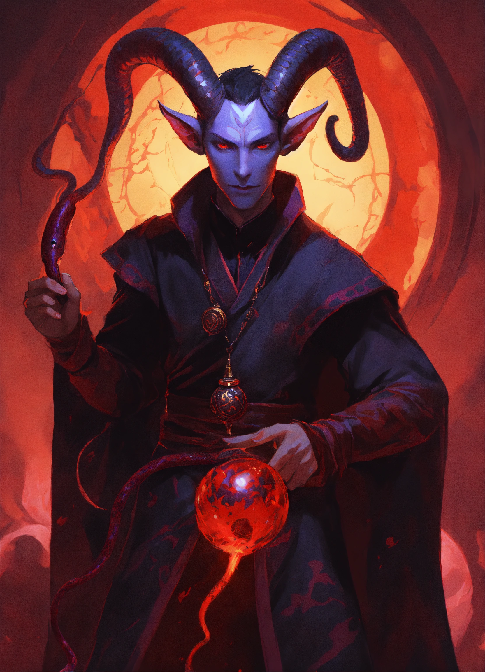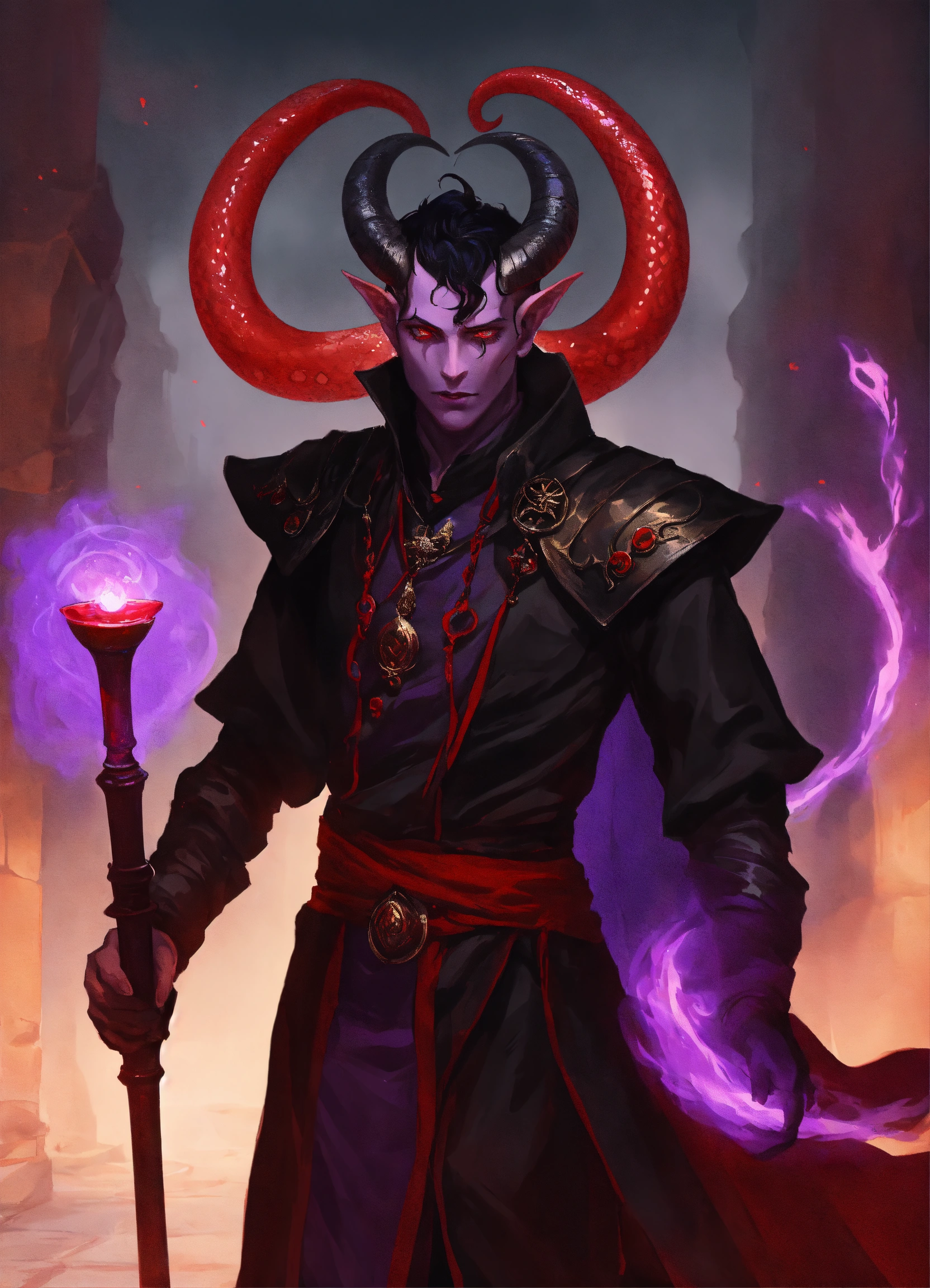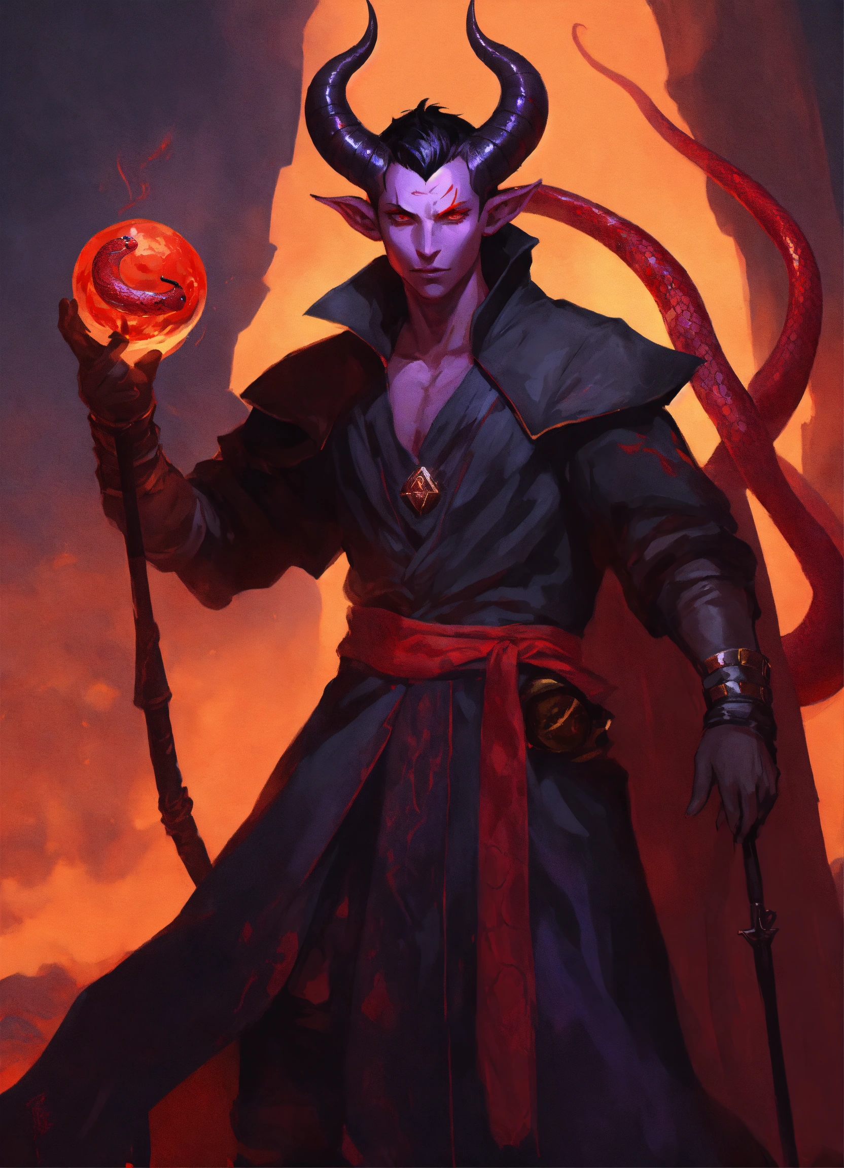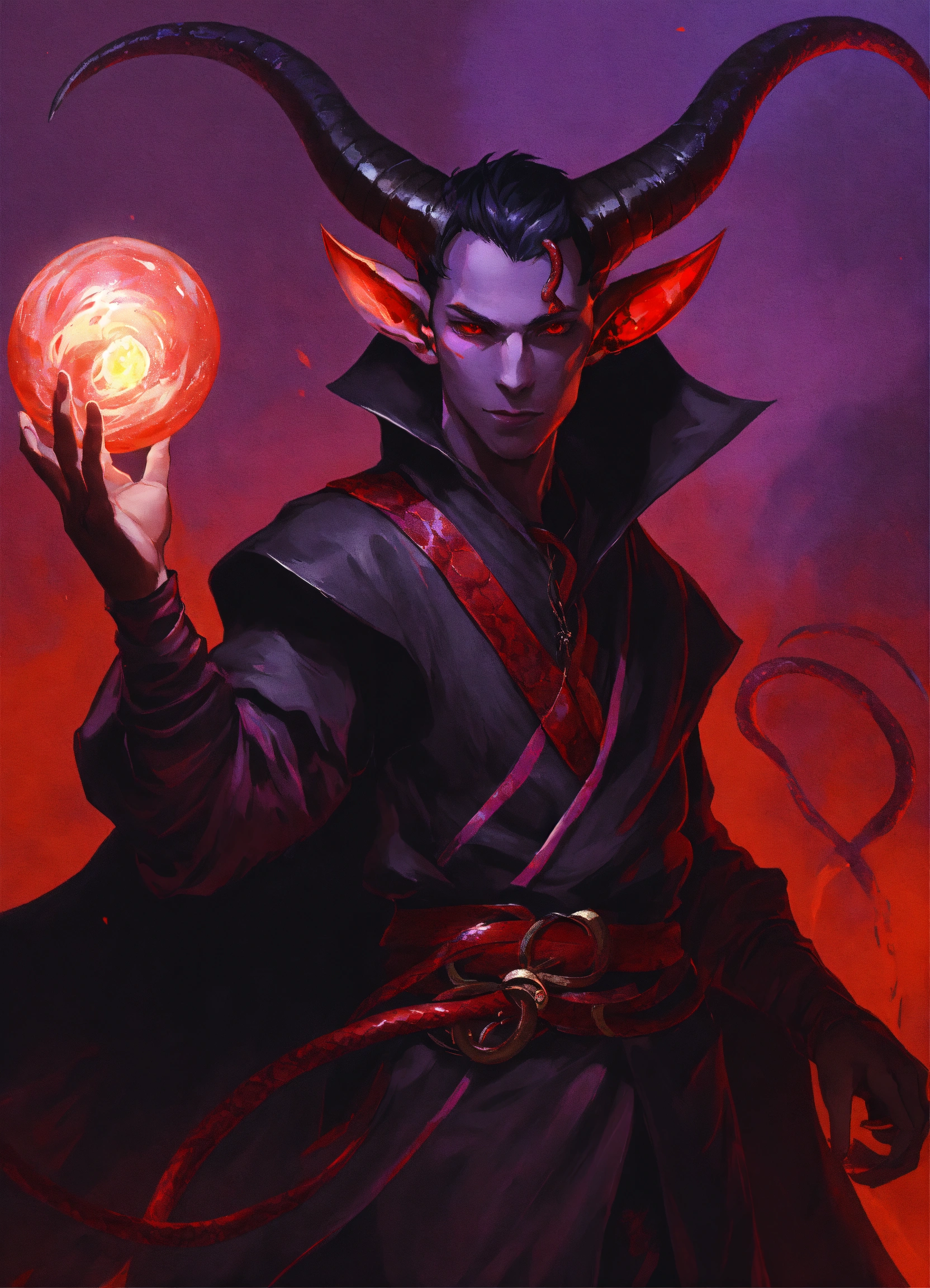 A d&d tiefling with pale red skin and red snake like eyes, he has small black horns, one of his two horns is snapped in half, he is wearing black robes with red and purple as secondary colours, he is holding a fireball, he has short black hair which reaches just above his shoulders, his skin is a pale red colour