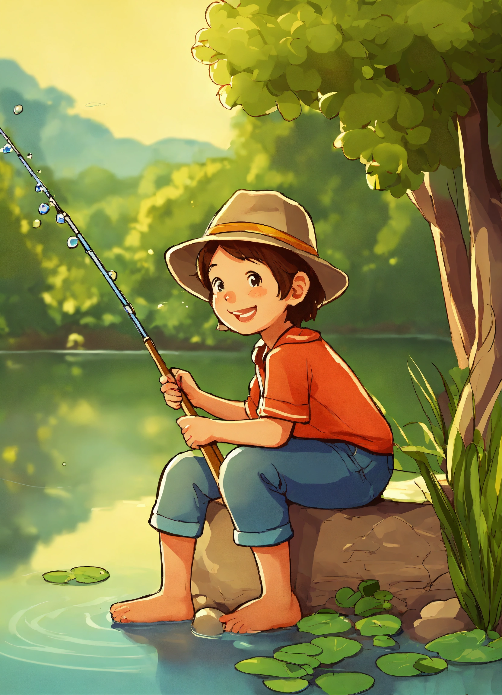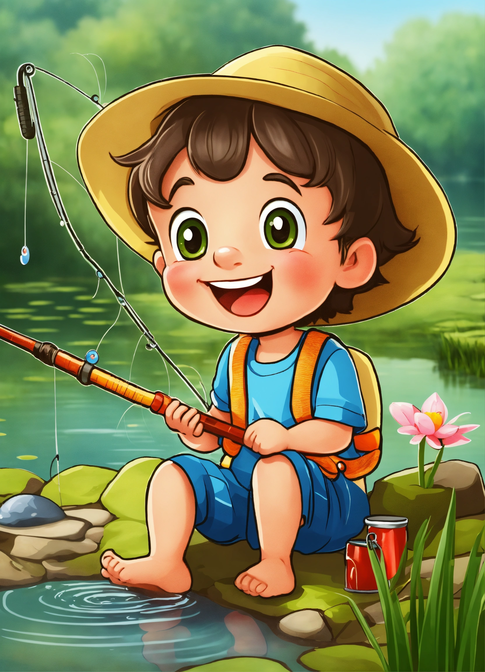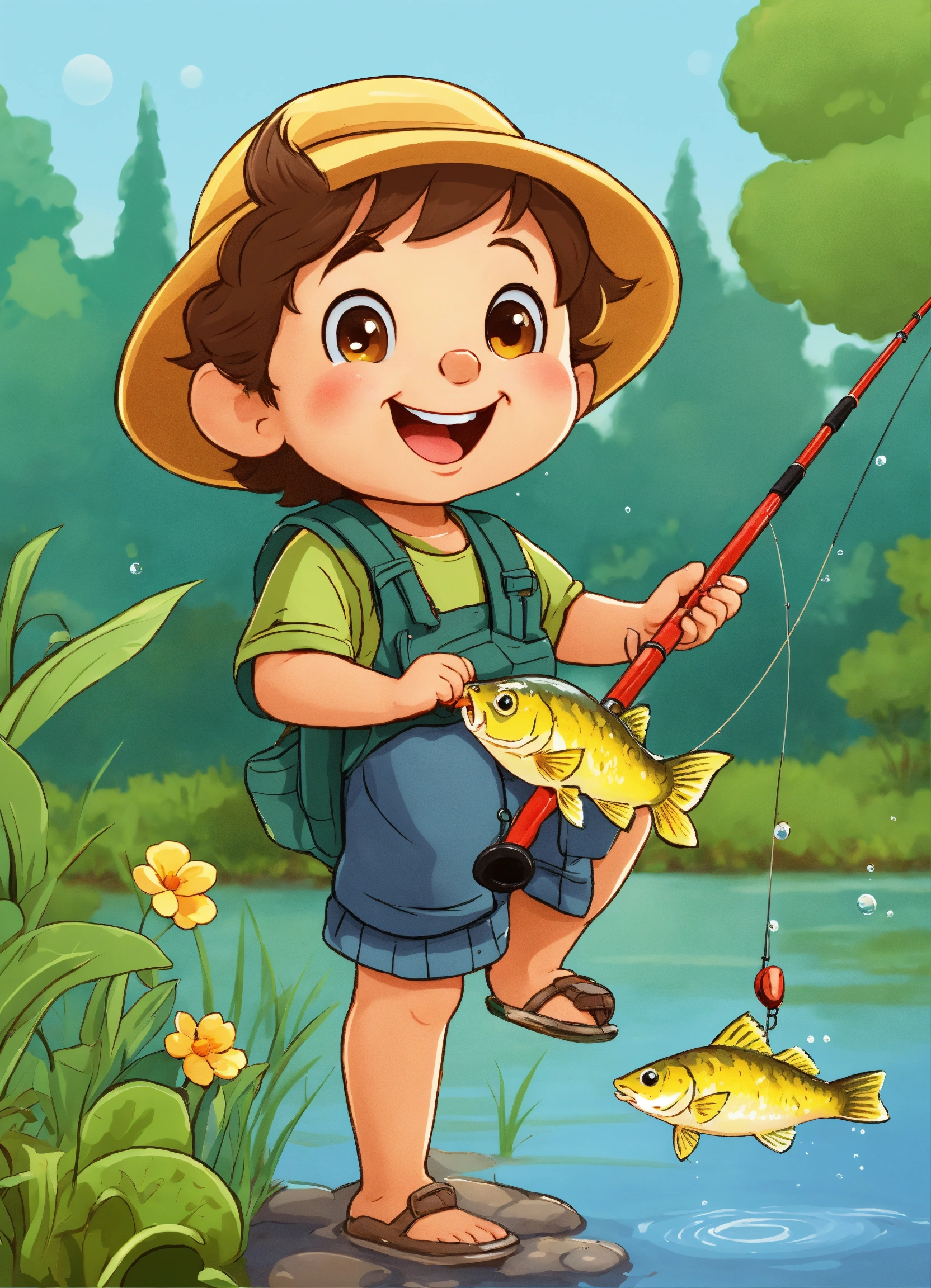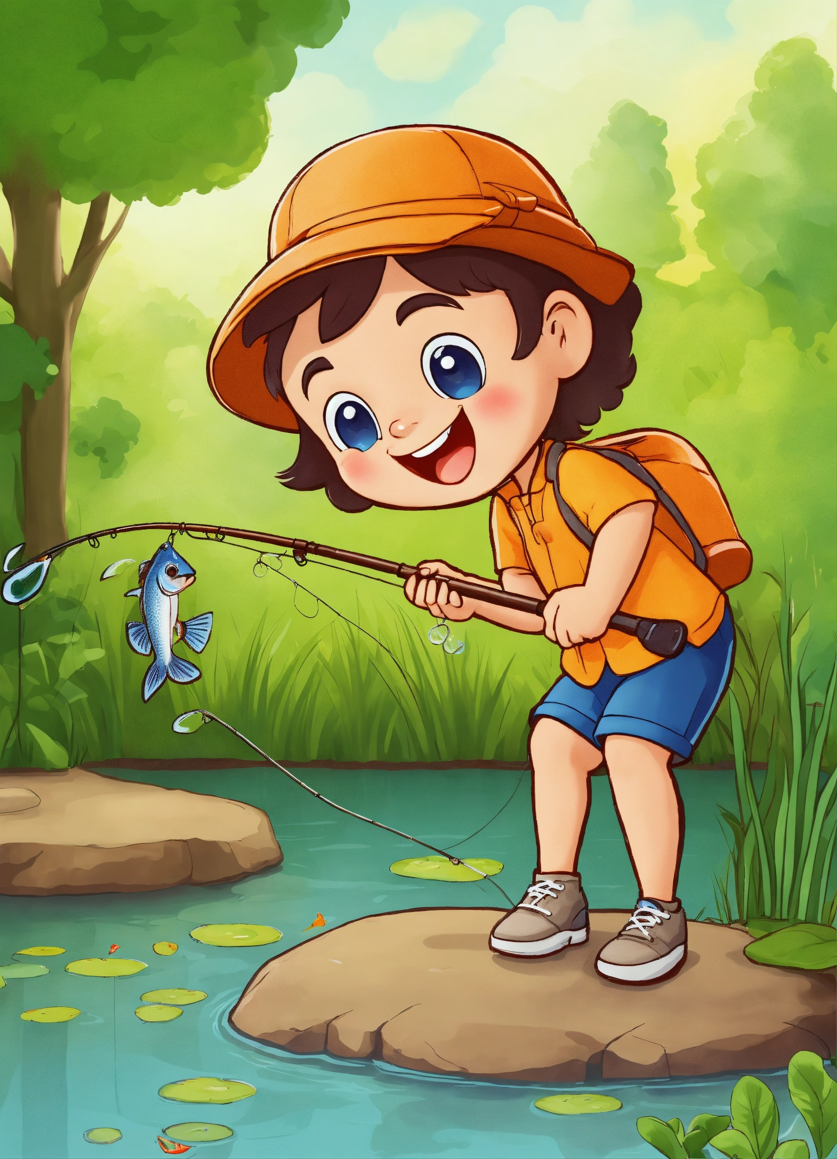 A happy child who is fishing by the pond and has just caught a fish cartoon picture