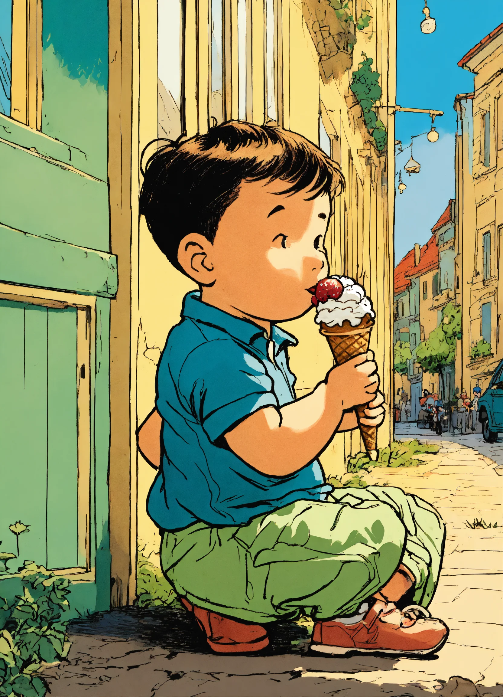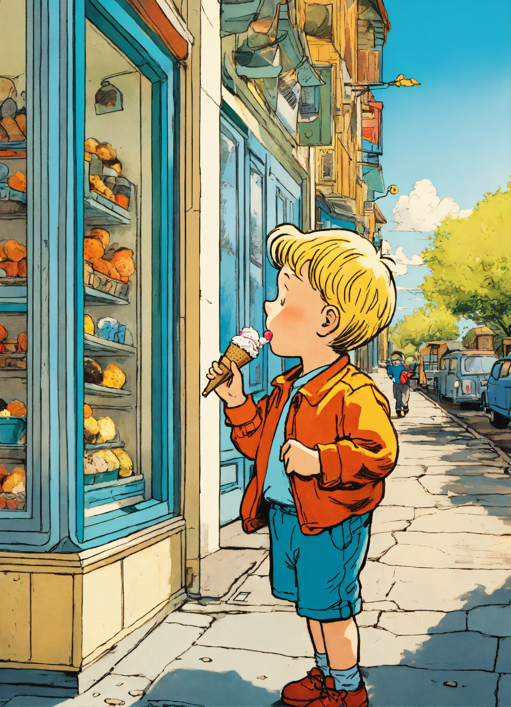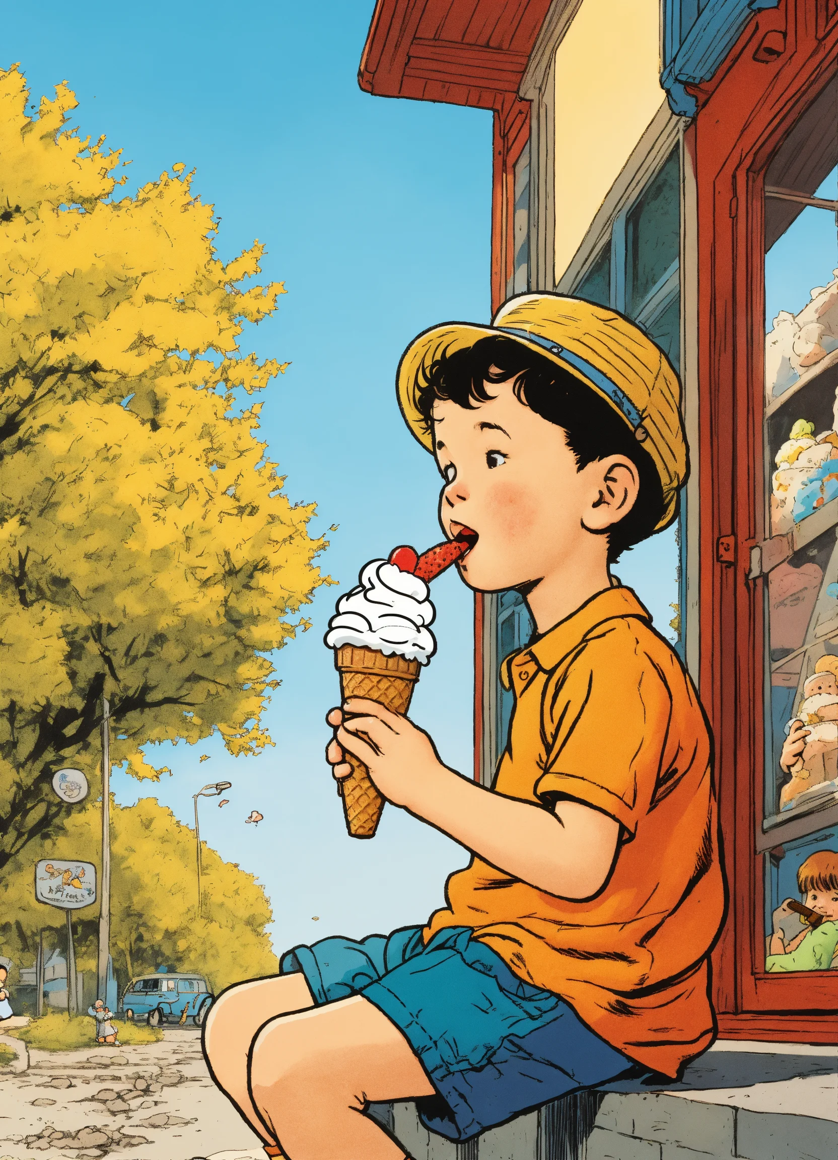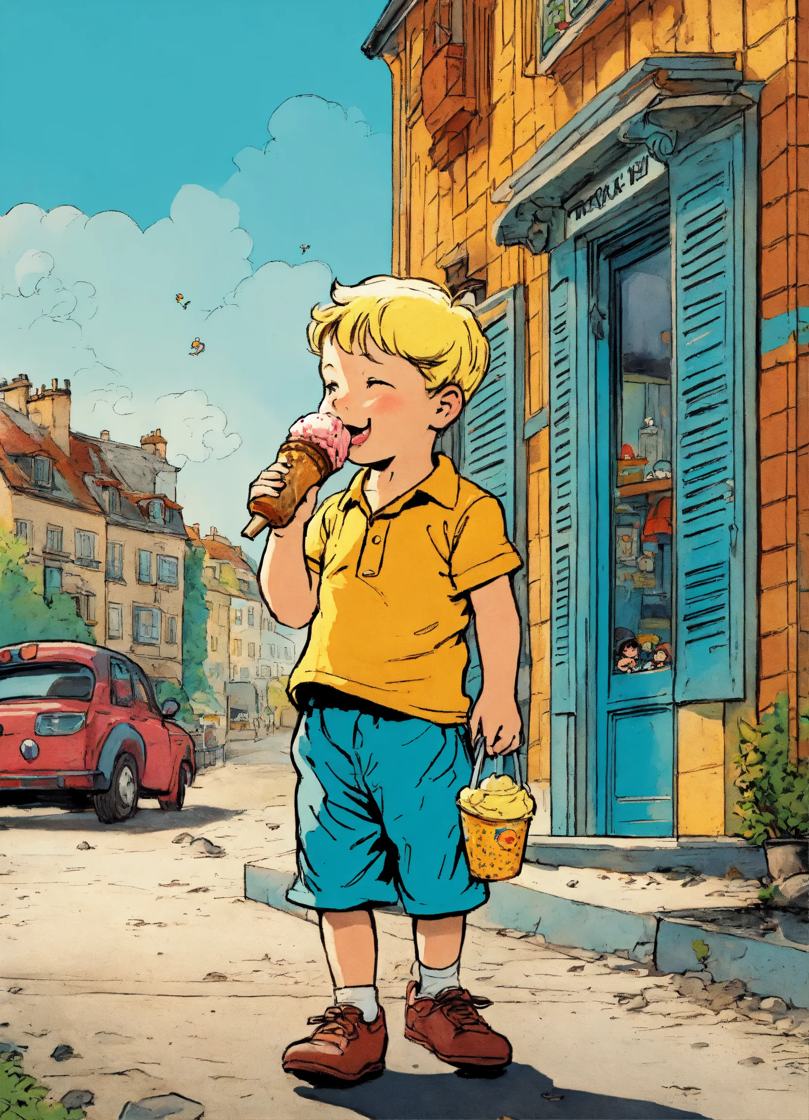 Detailed, vibrant illustration of a little boy eating an ice cream cone, by herge, in the style of tin-tin comics, vibrant colors, detailed, sunny day, attention to detail, 8k