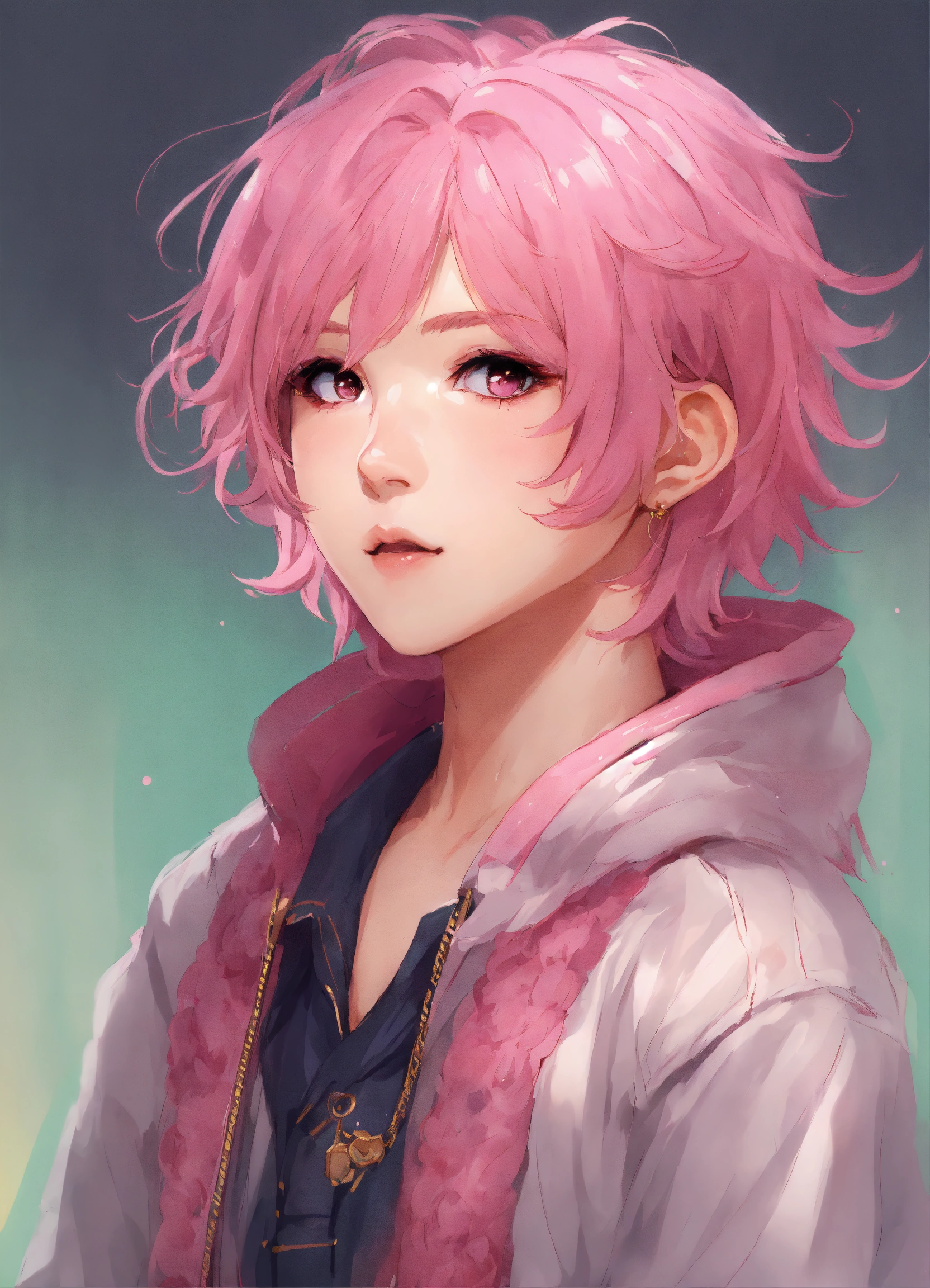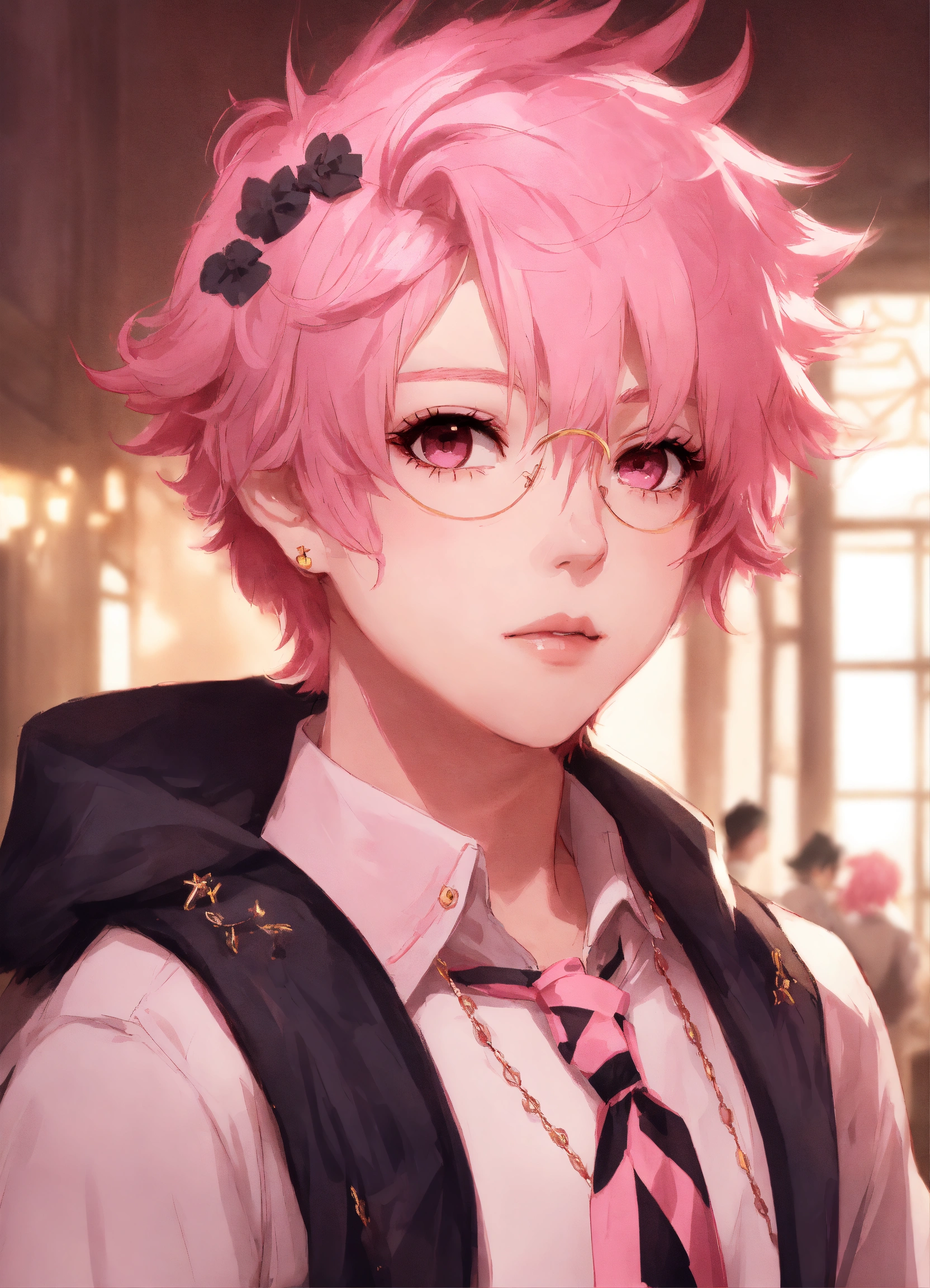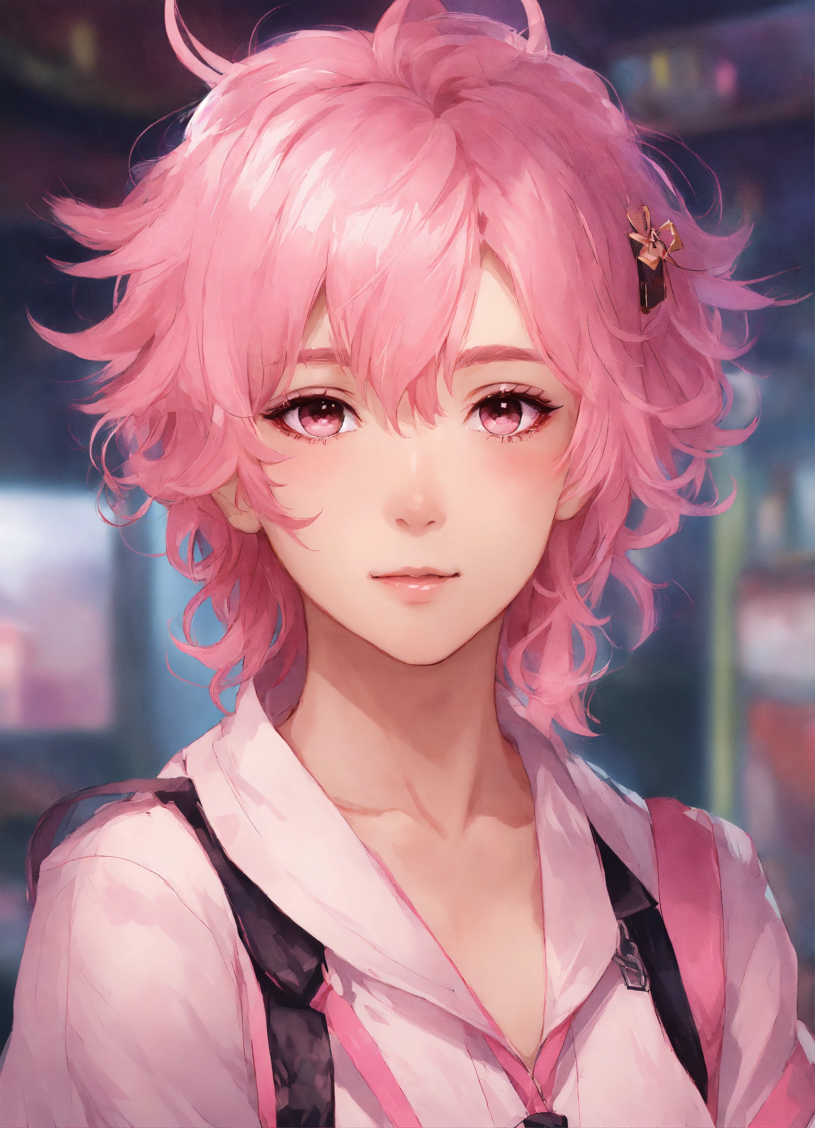 Concept art of a cute astolfo feminine boy wearing makeup and pink hair