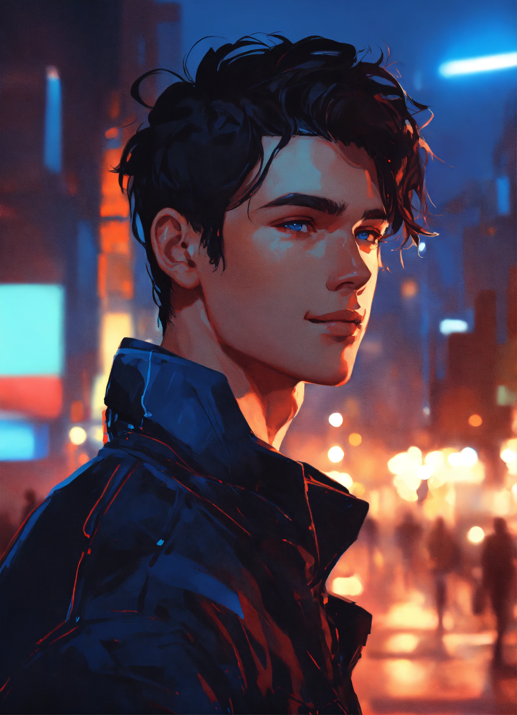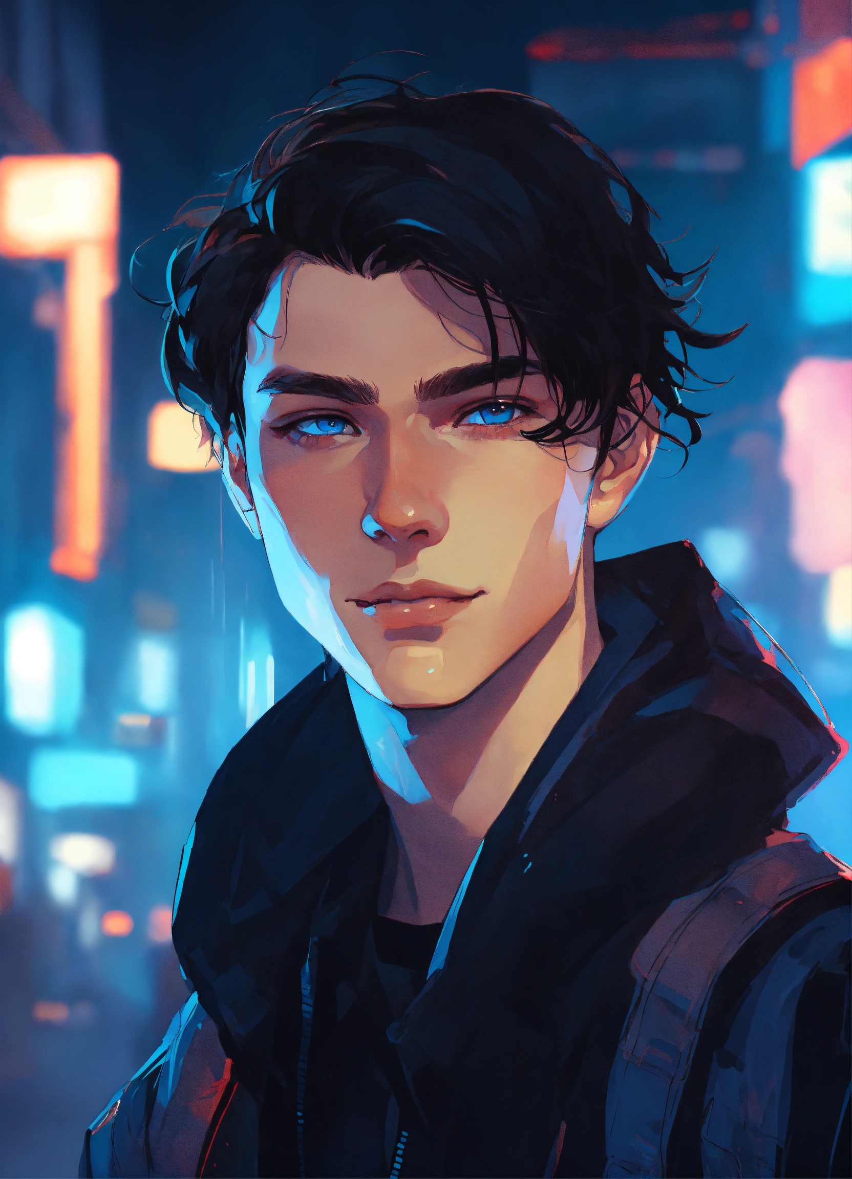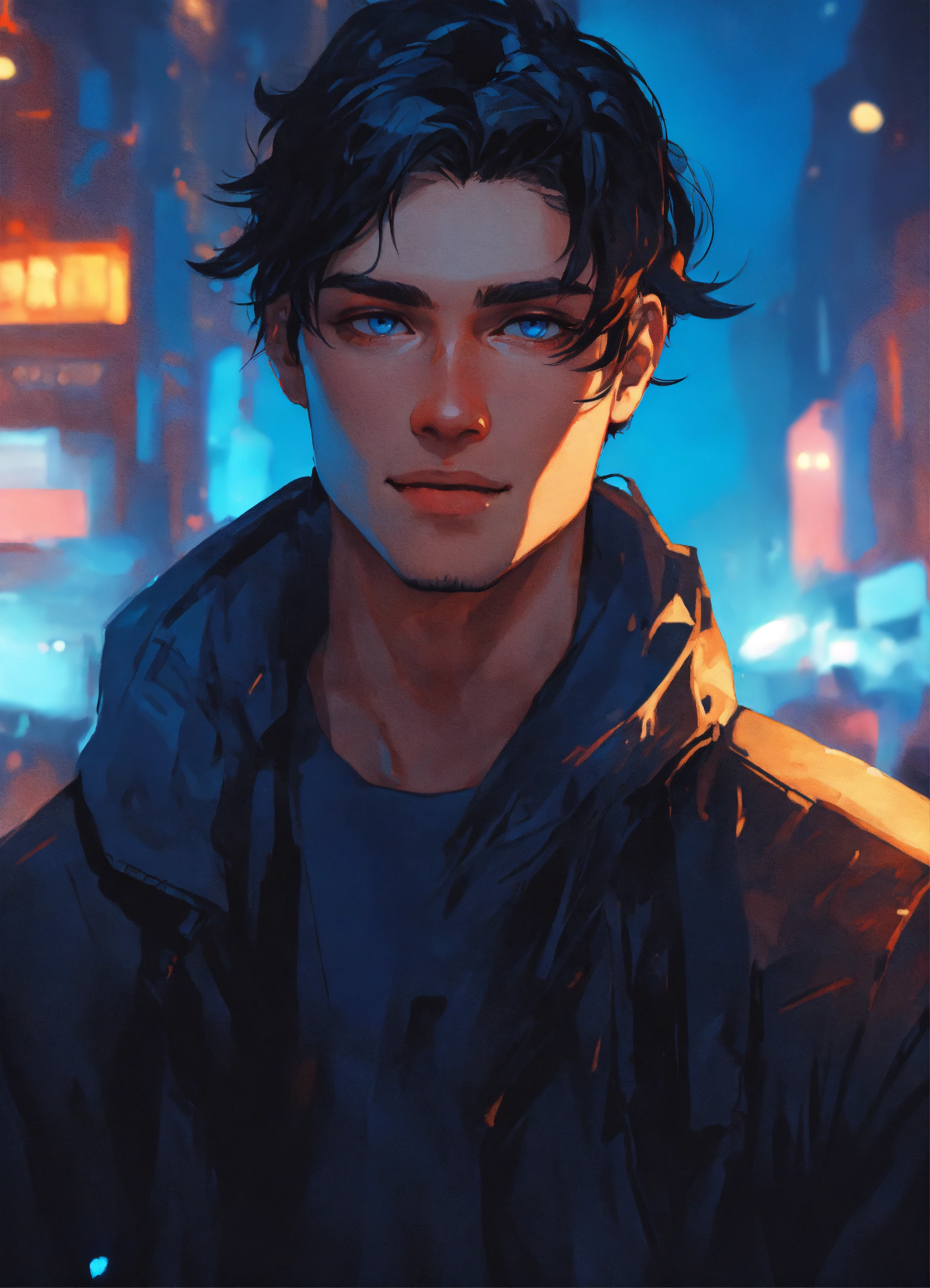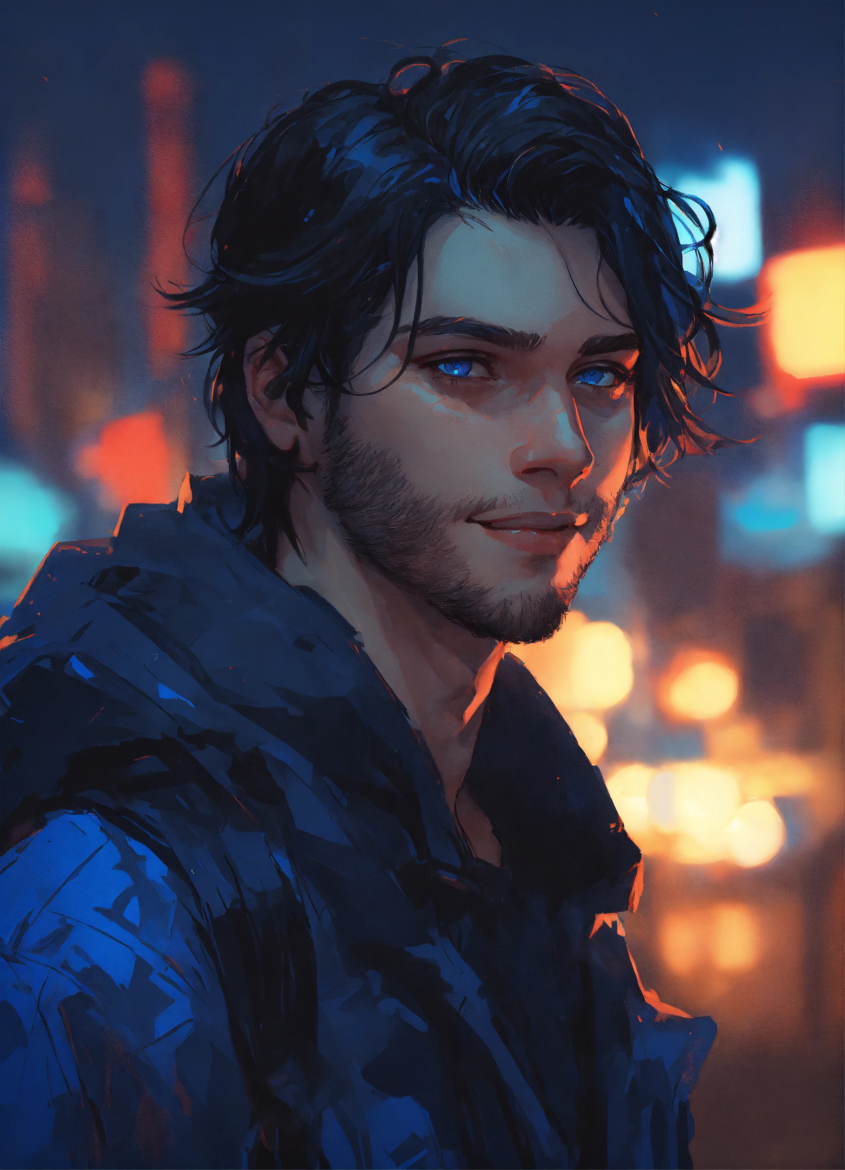 Highly detailed night time portrait of russian young man 27 years old, smile, black length hair, blue eyes, in black and blue streetstyle, by atey ghailan, by greg rutkowski, by greg tocchini, by james gilleard, black, grunge aesthetic!!! cyberpunk background