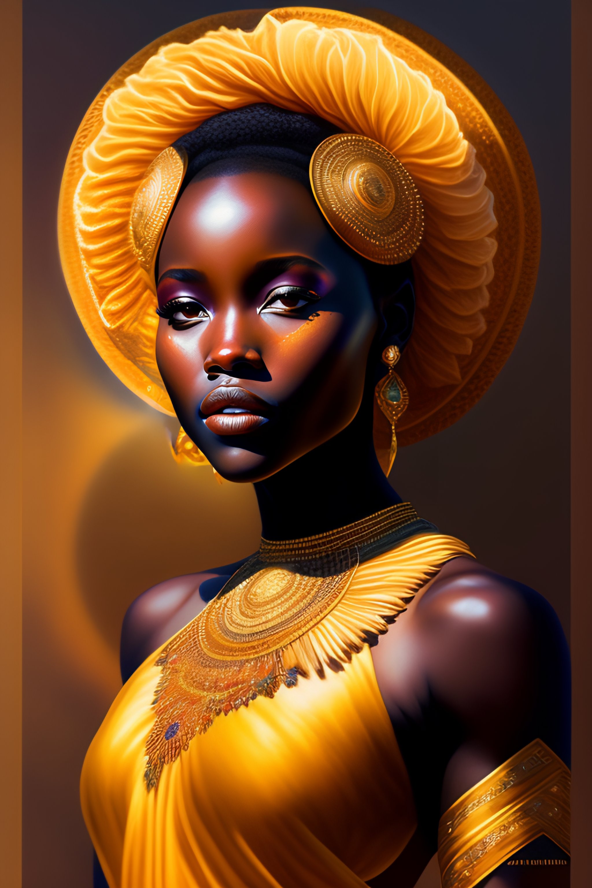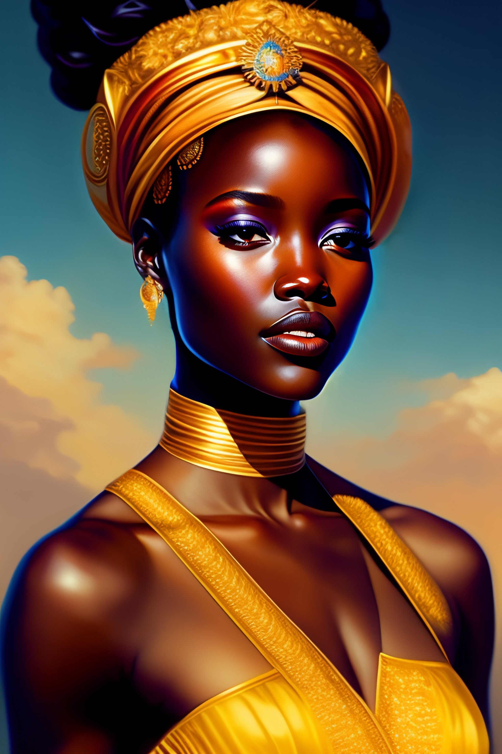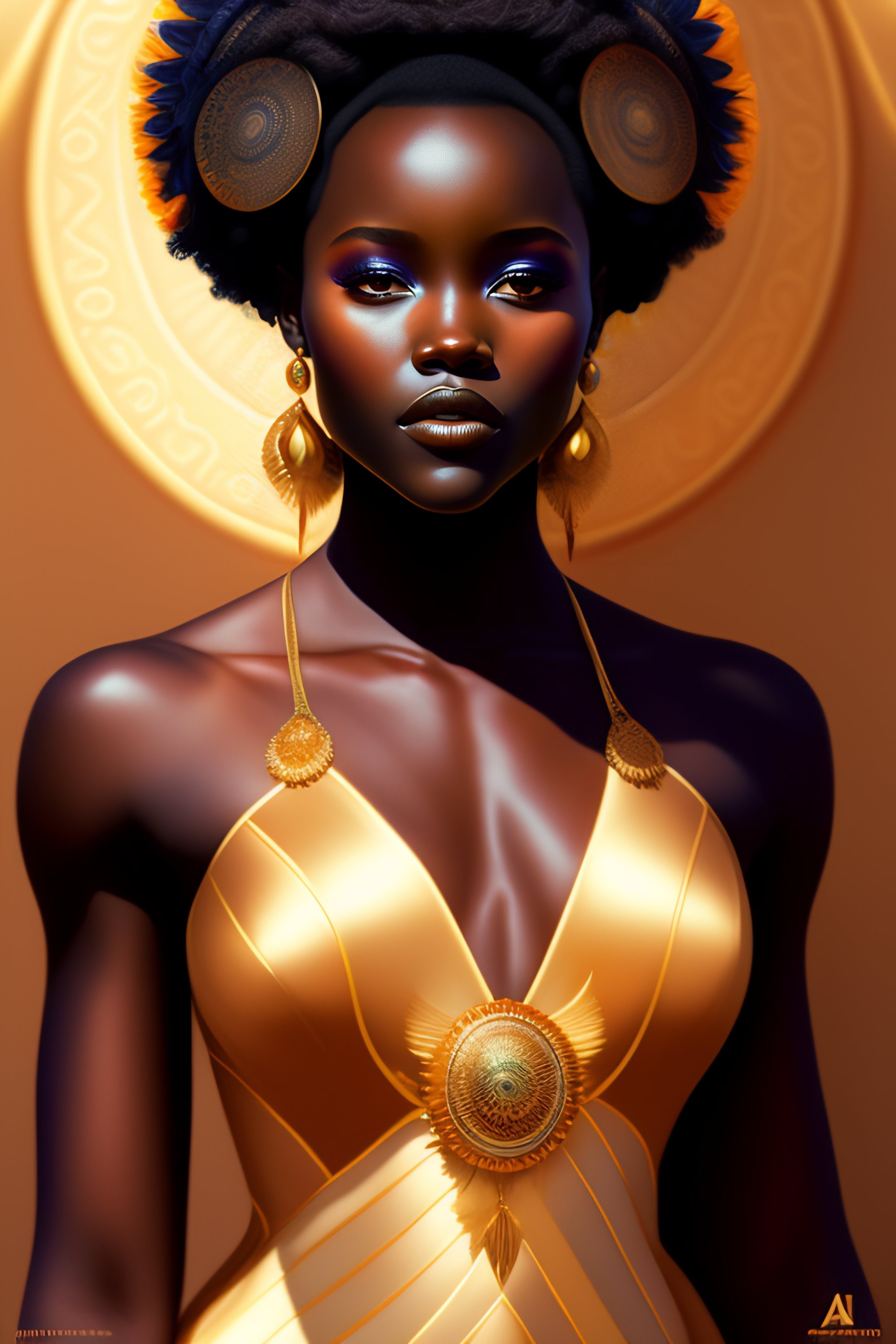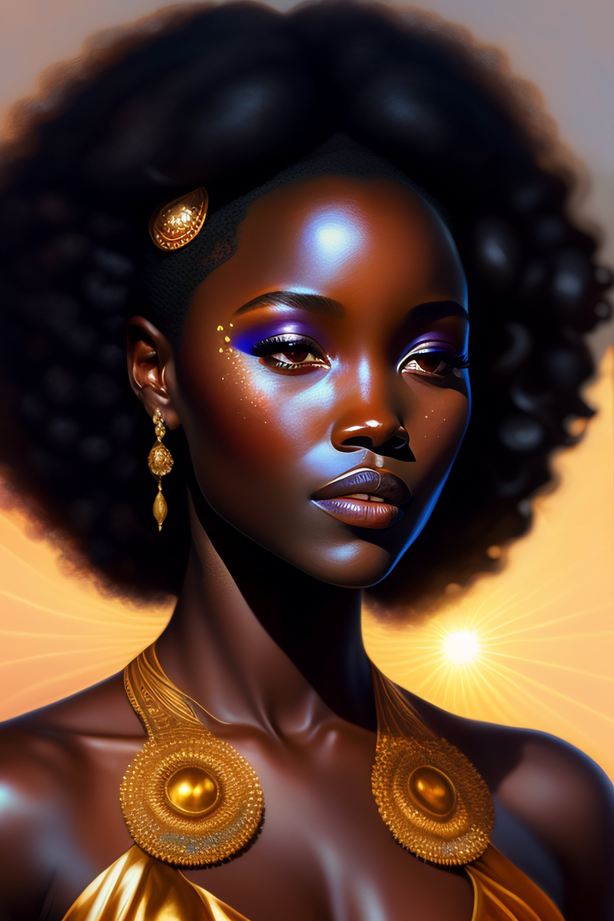 Sun goddess, lupita nyong'o, shine sun, full body, intricate, elegant, highly detailed, digital painting, artstation, concept art, smooth, sharp focus, illustration, art by artgerm and greg rutkowski and alphonse mucha and william - adolphe bouguereau and stephanie law, small chest, (curly hair)