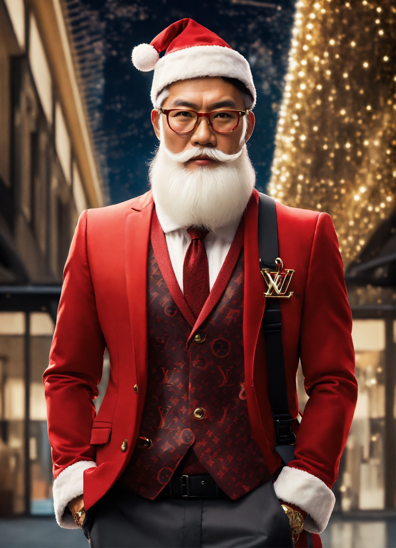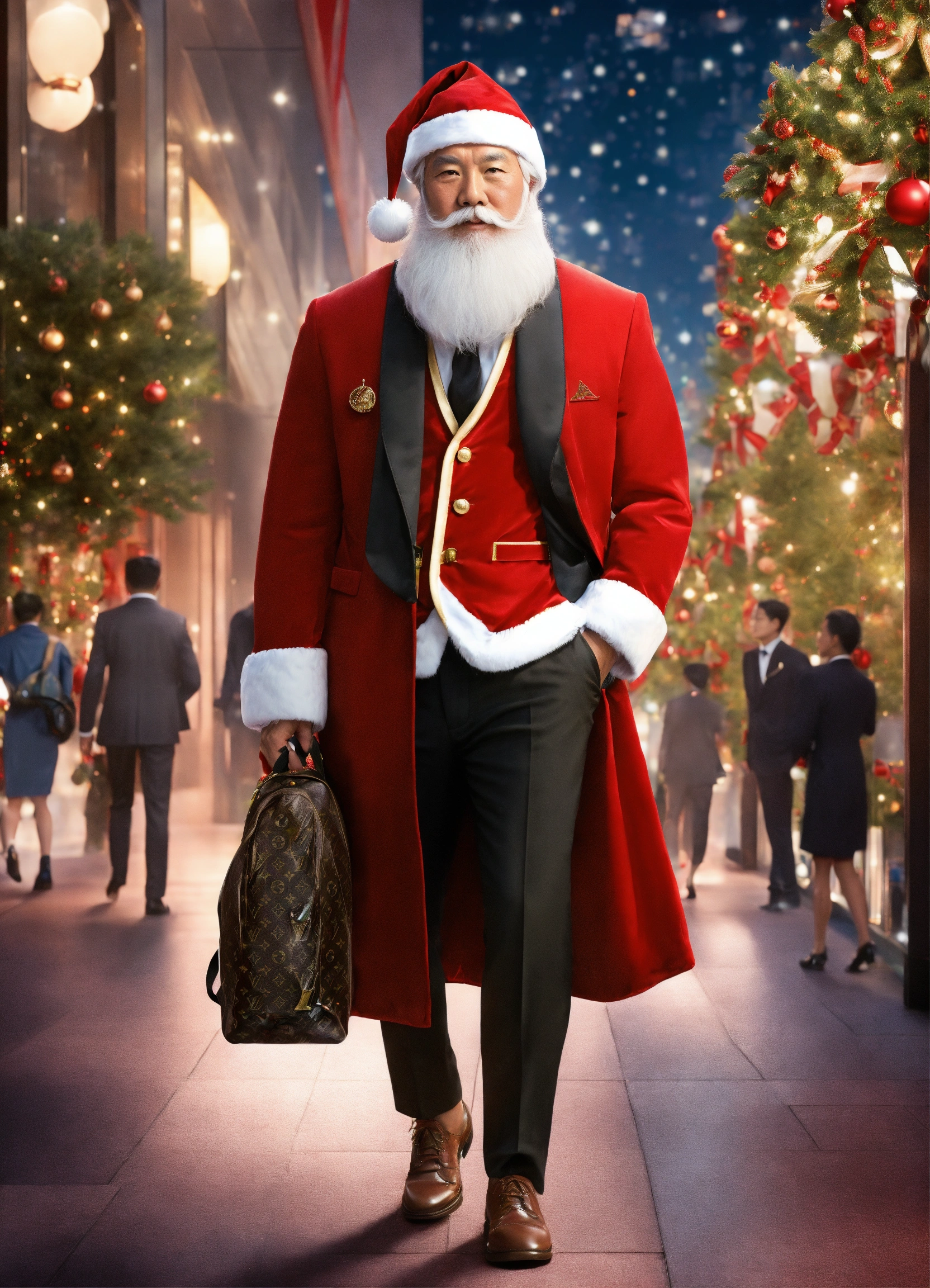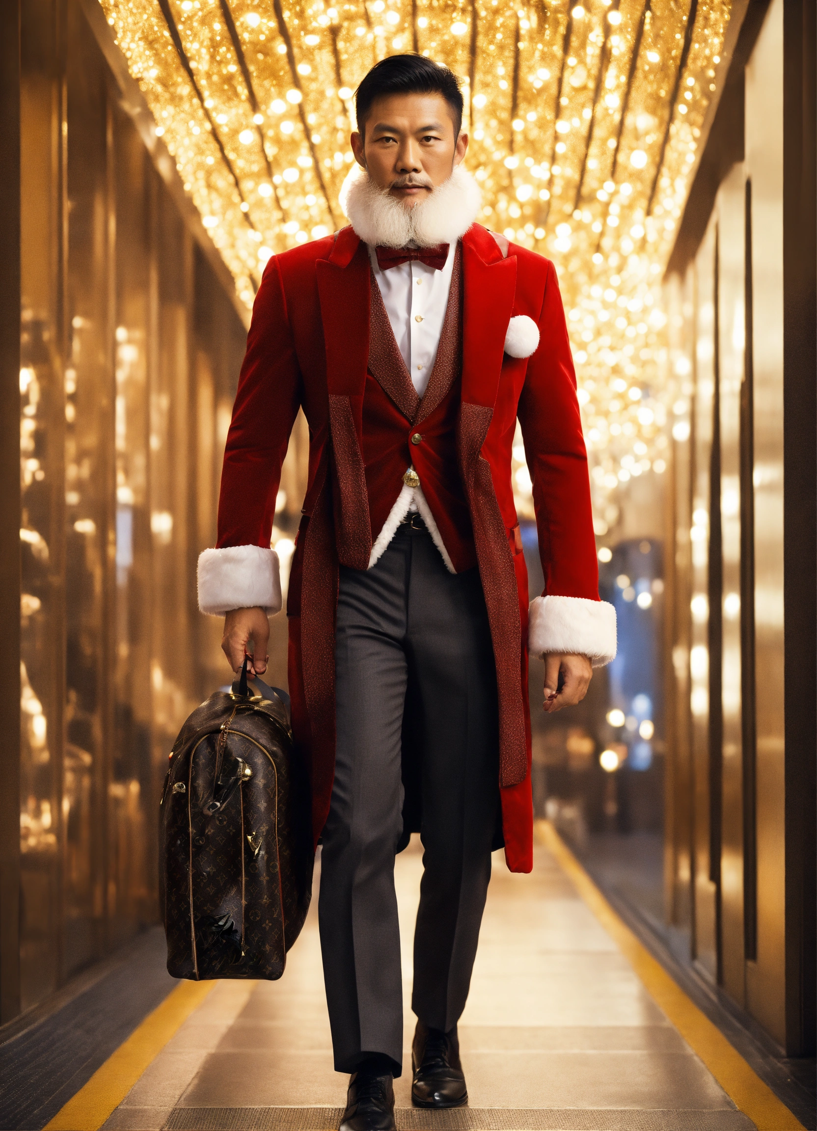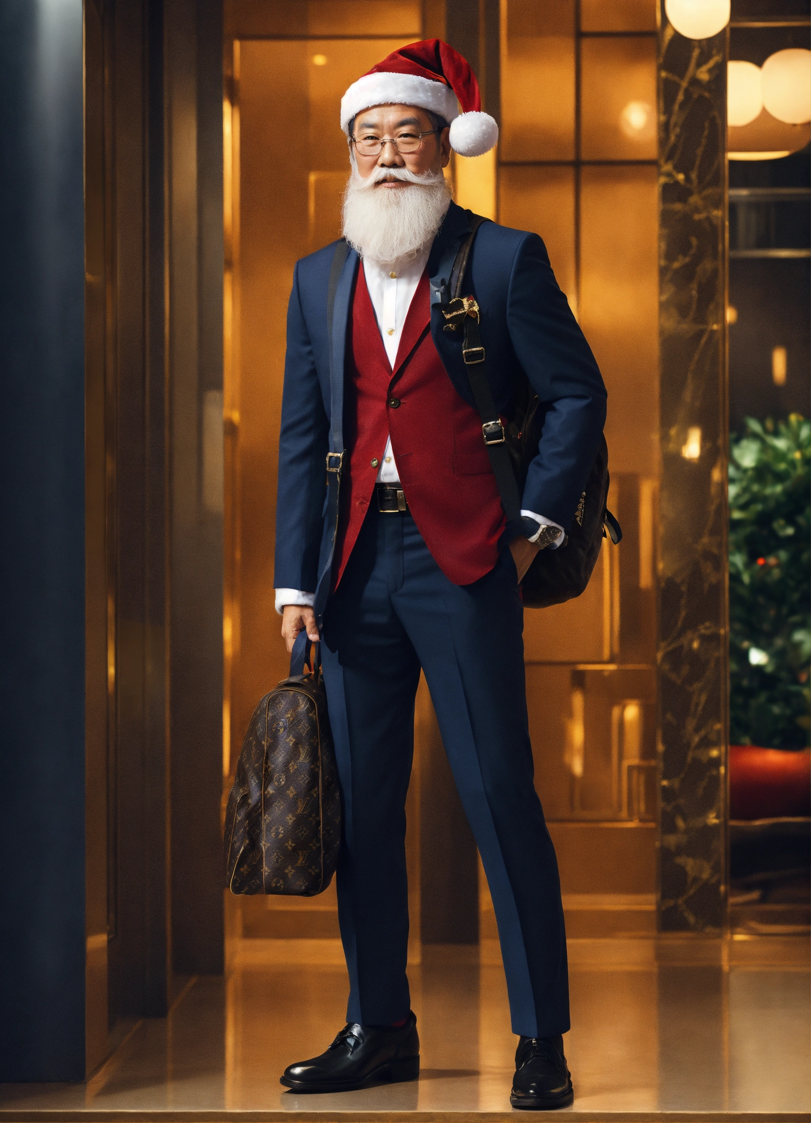 A extremely handsome modern asian santa claus, wearing a backpack and formal suit, inspired by louis vuitton. --v 5.0