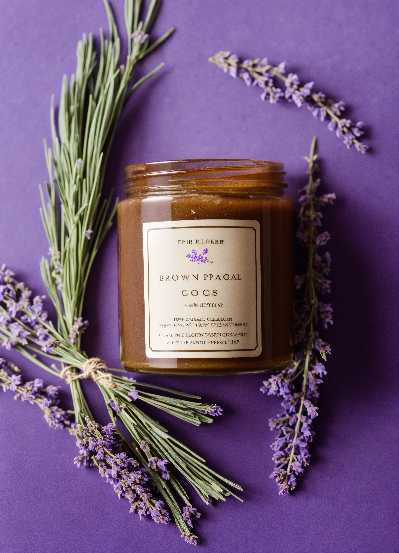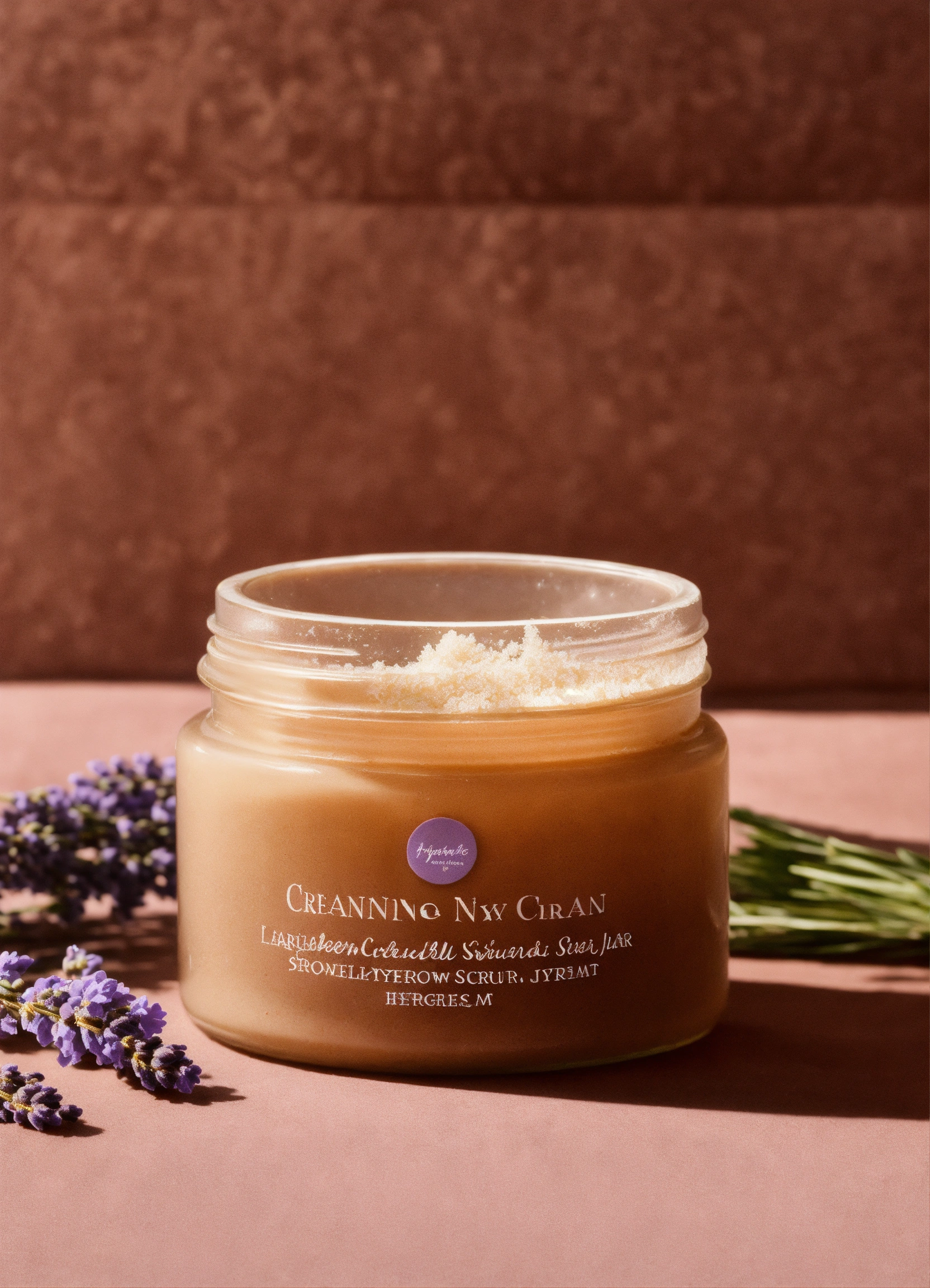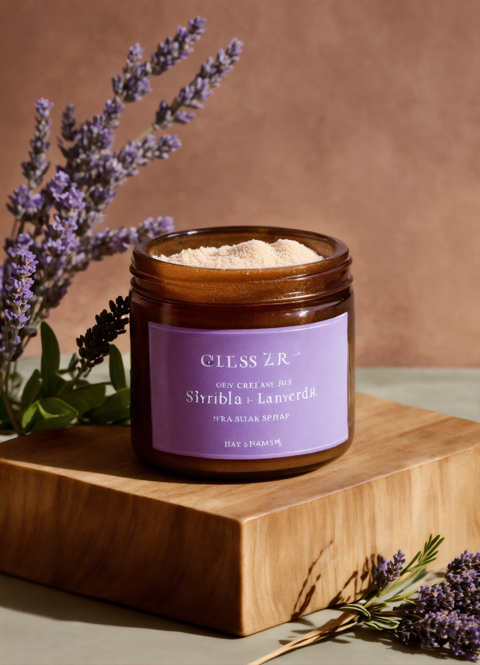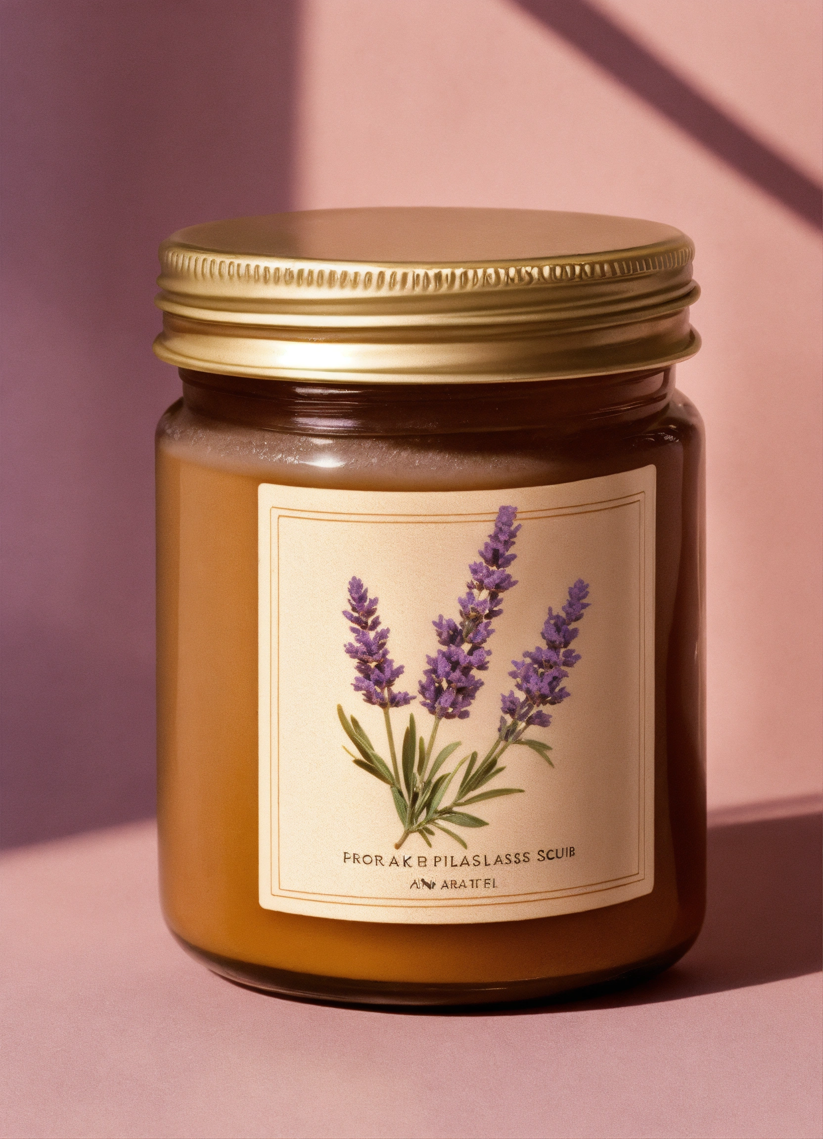 For a brown glass facial scrub jar, a hyper-realistic creamy-colored sticker adorned with faint imprints of lavender sprigs in a muted purple, emphasizing the product's natural and calming qualitie.