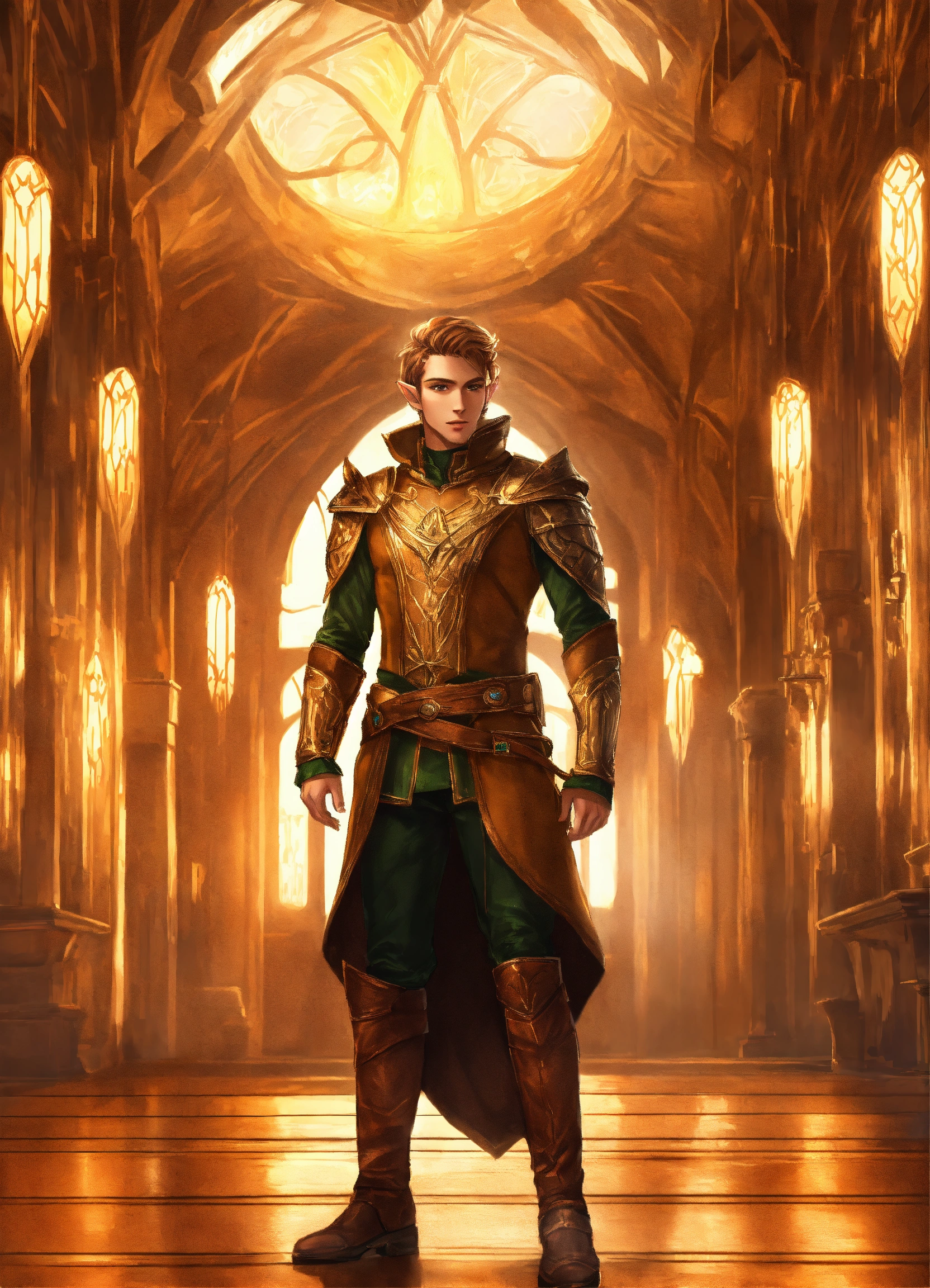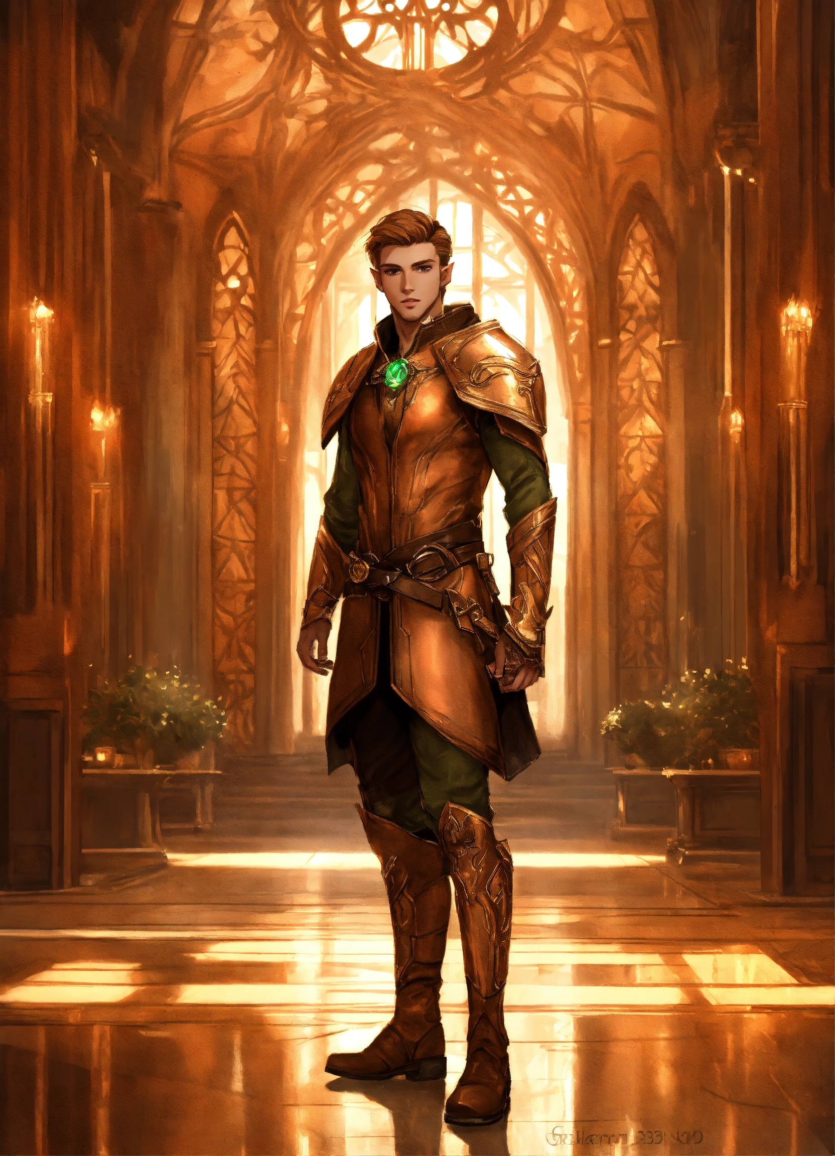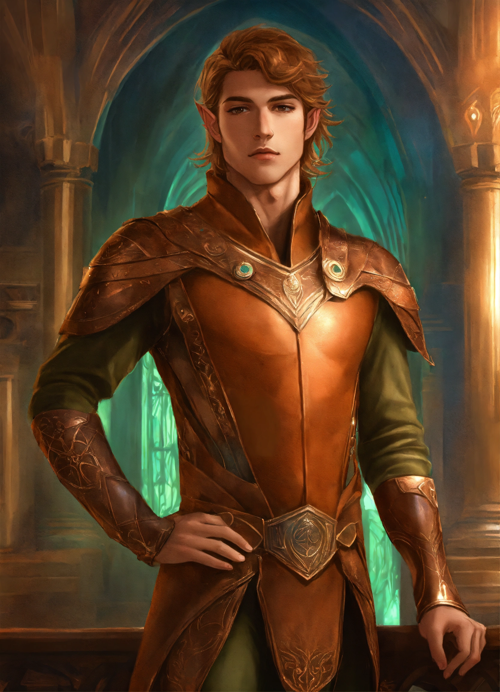 Drawing of an elf, royalty, sci fi, copper and brown leather cybernetic outfit, light brown hair, standing in a copper elven palace hall, handsome, male high elf, 23 years old, full body