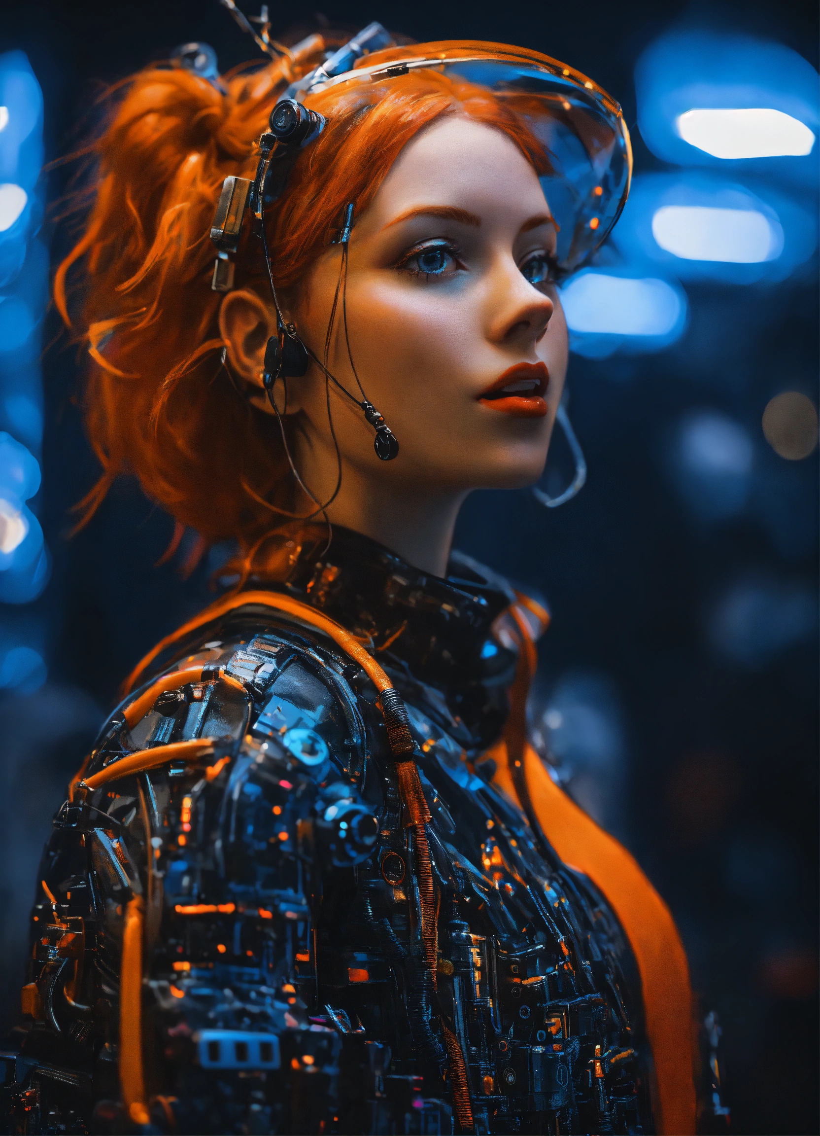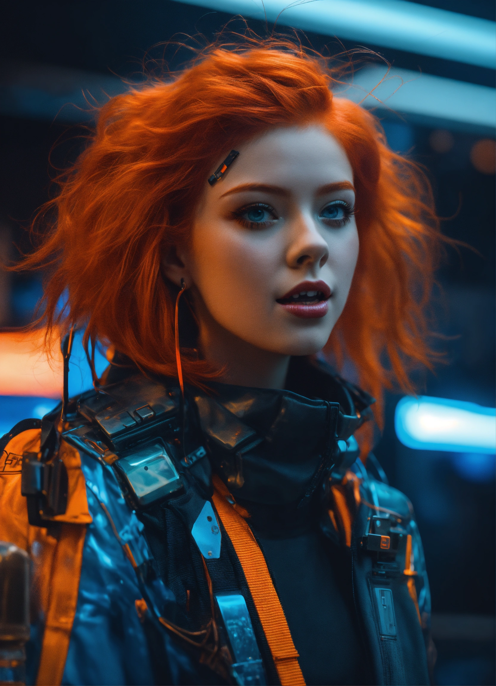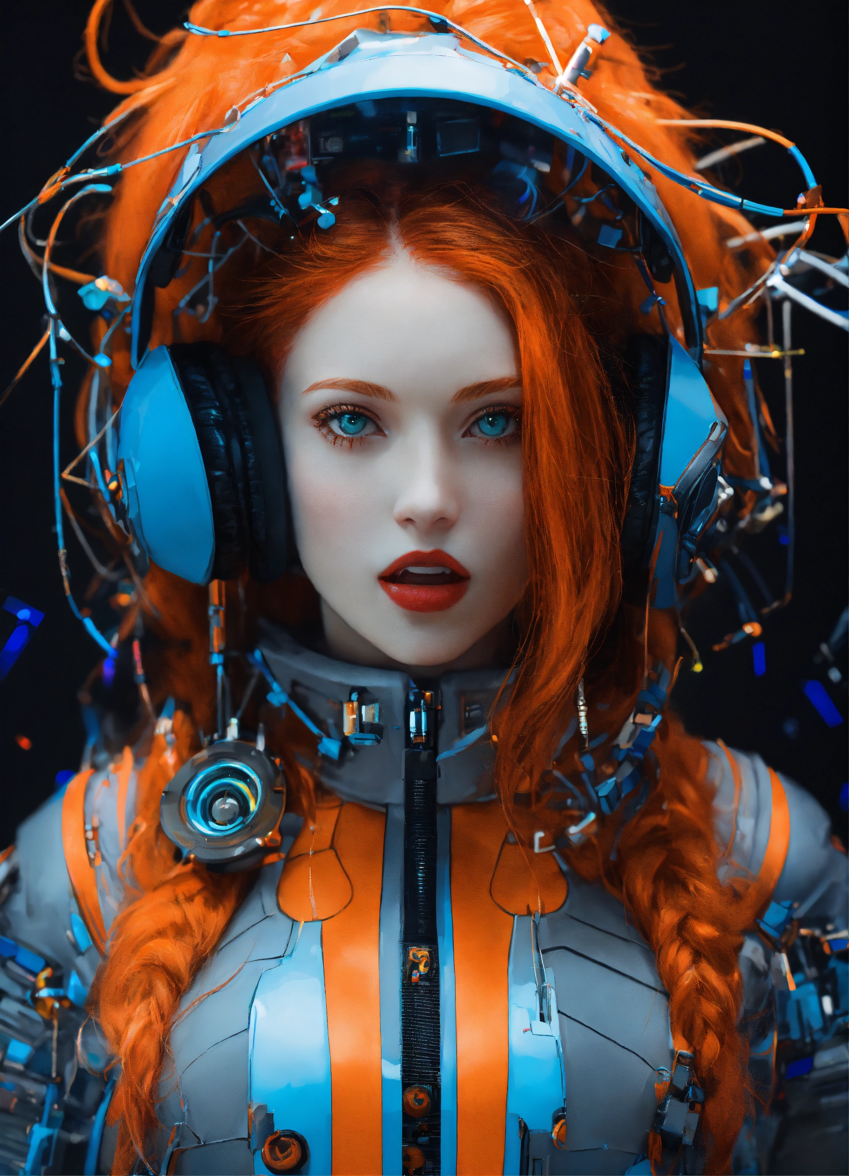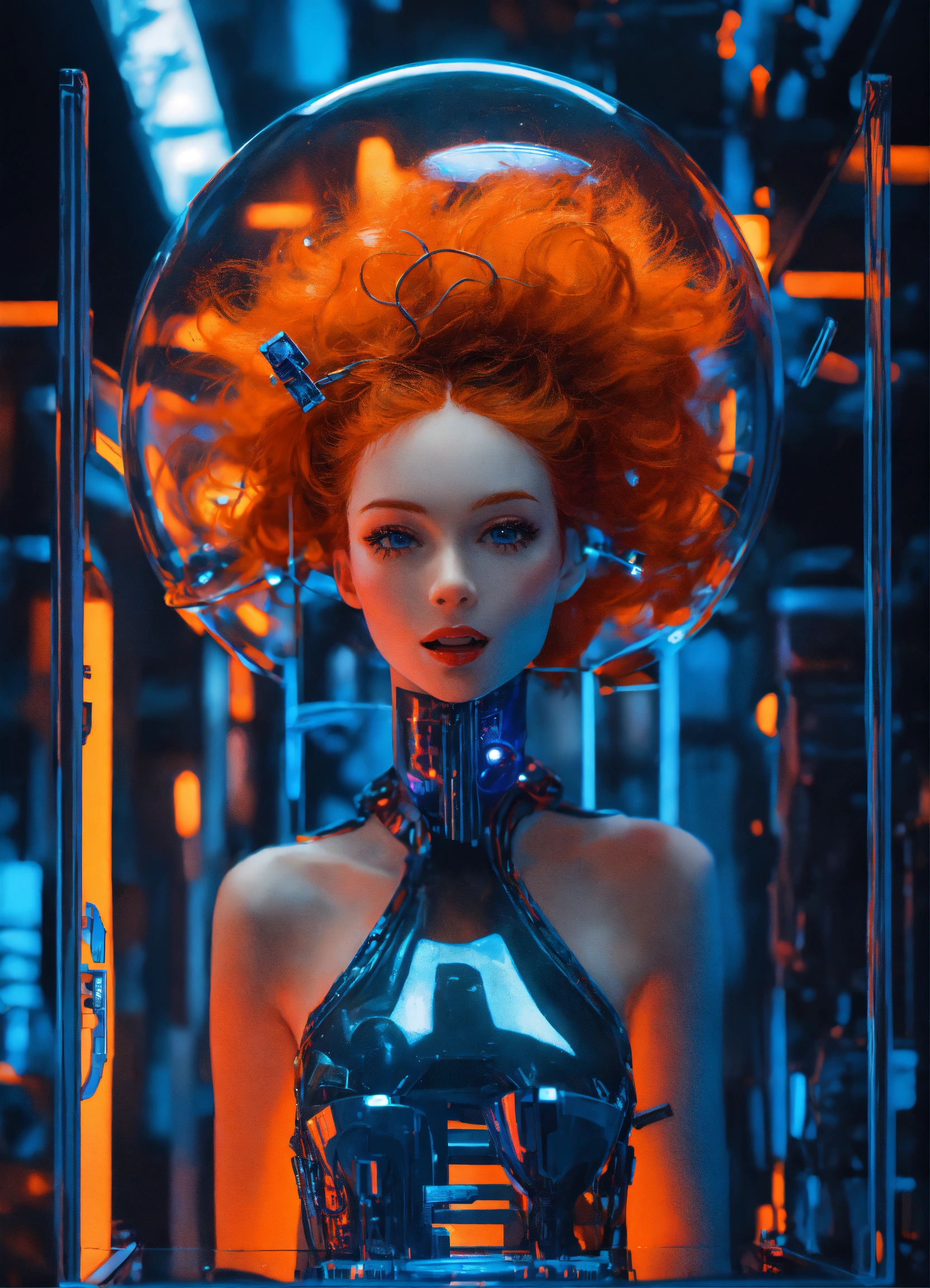 An excited redhead girl, in the style of cyber punk surrealism, mobile sculptures, blue and orange saturation, black background, tinkercore, made of glass, vaporwave, grey academia