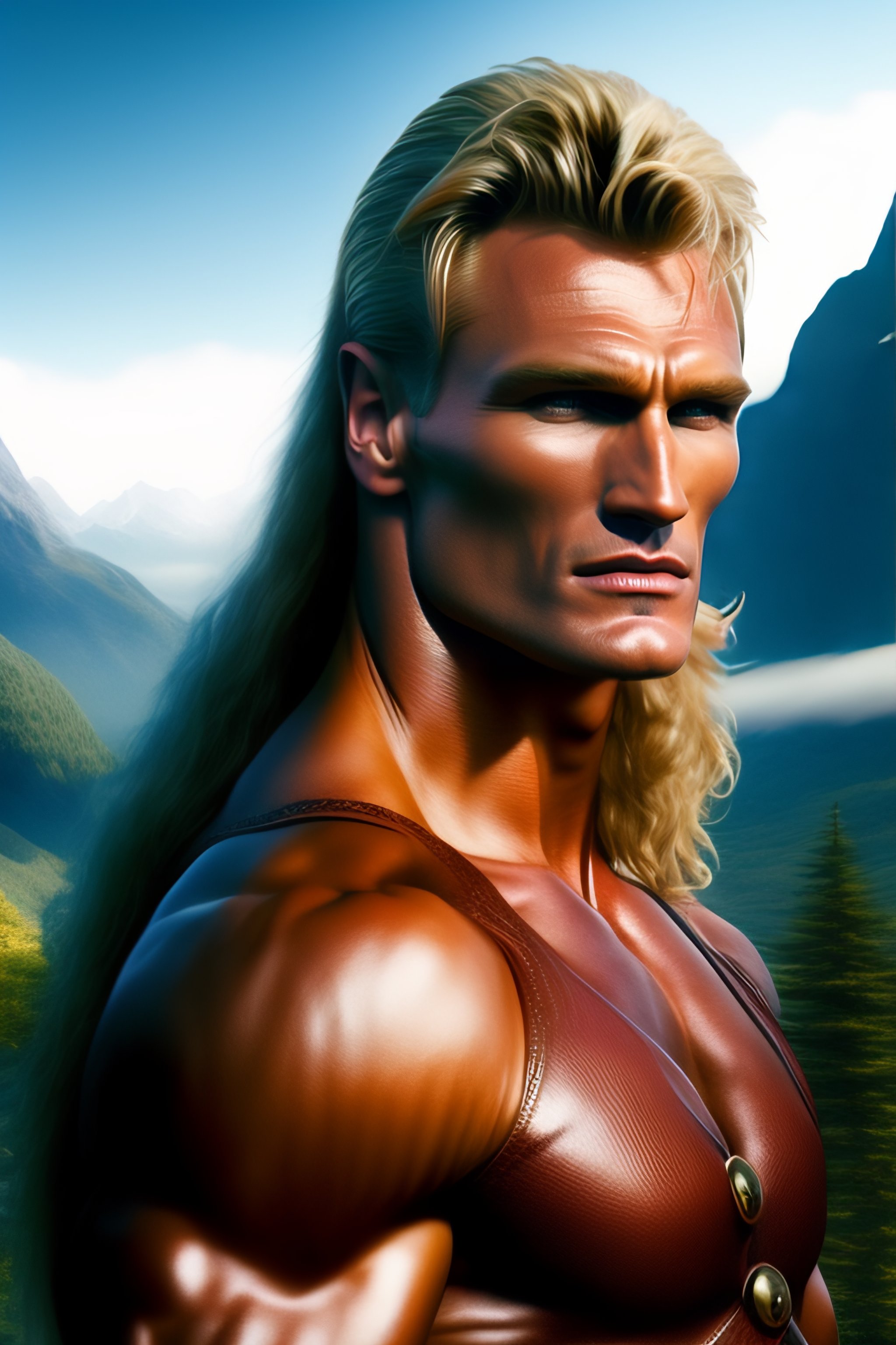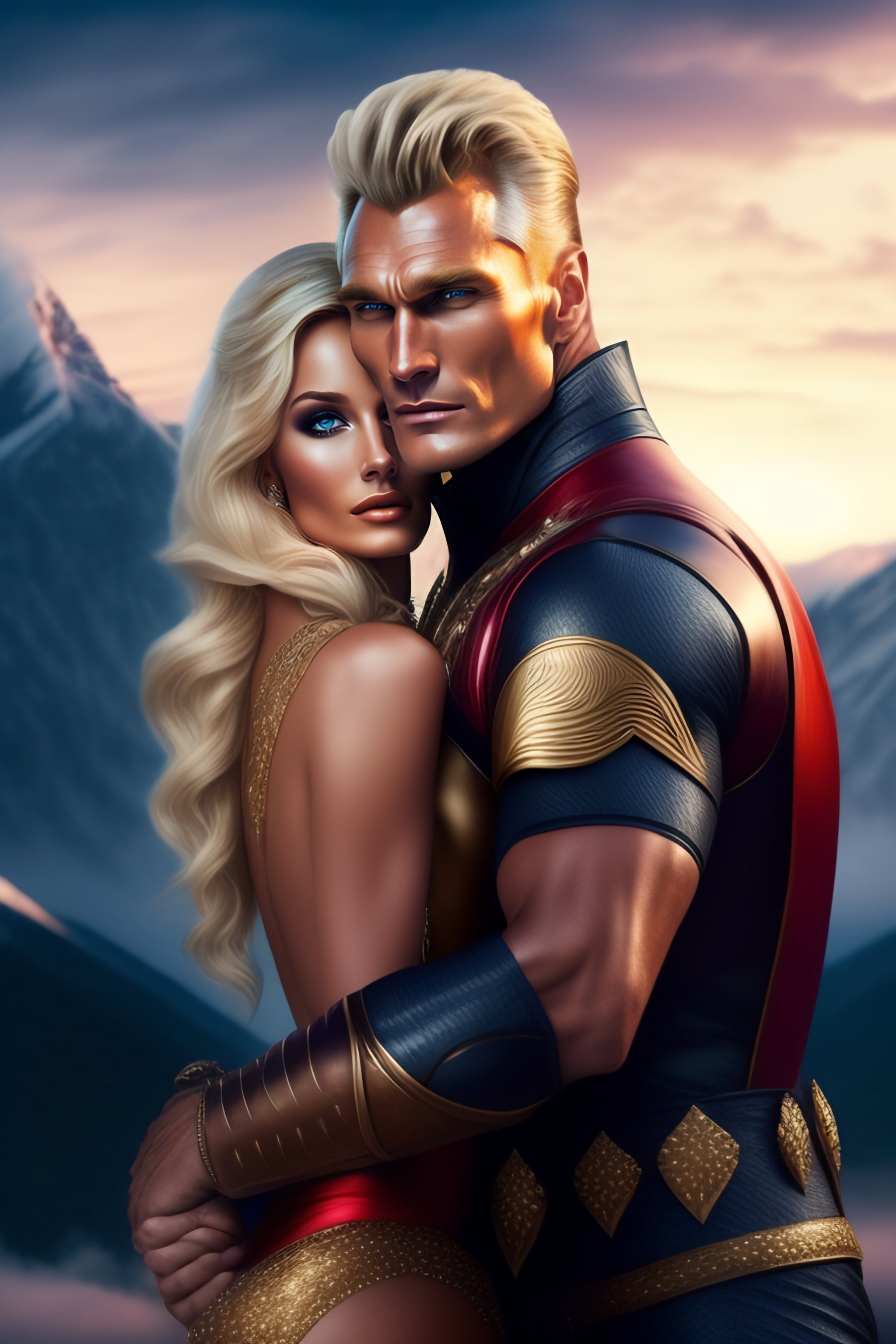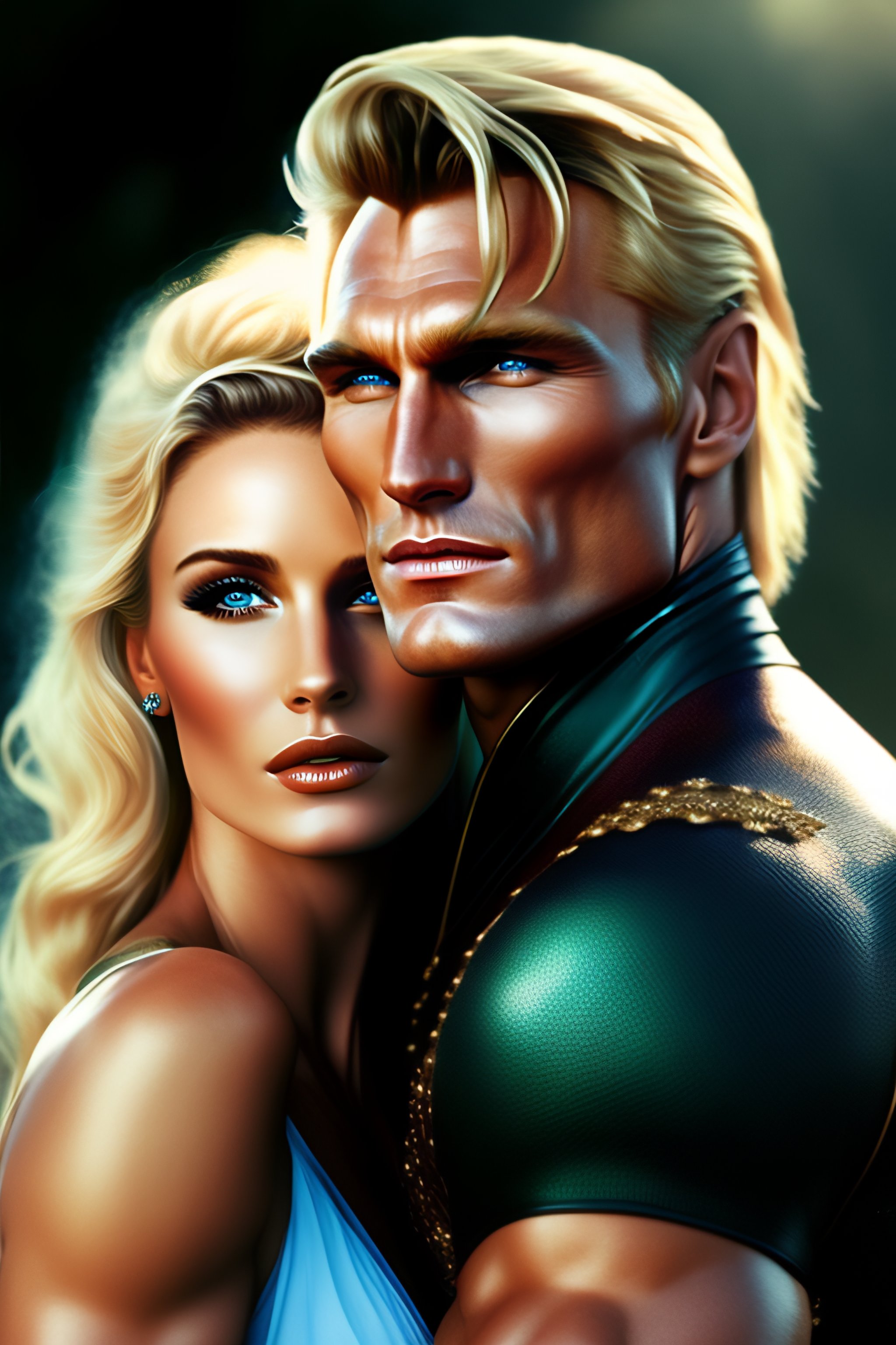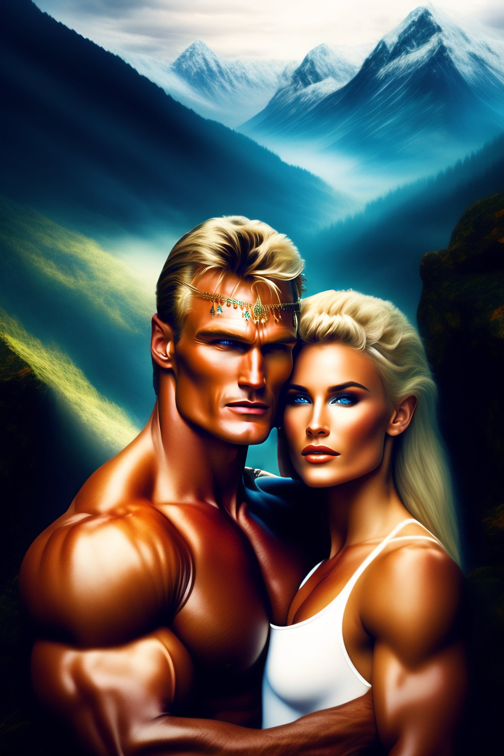 Dolph lundgren in his youth hugs a beautiful elf girl, beautiful fantasy landsape, mountains, flying island