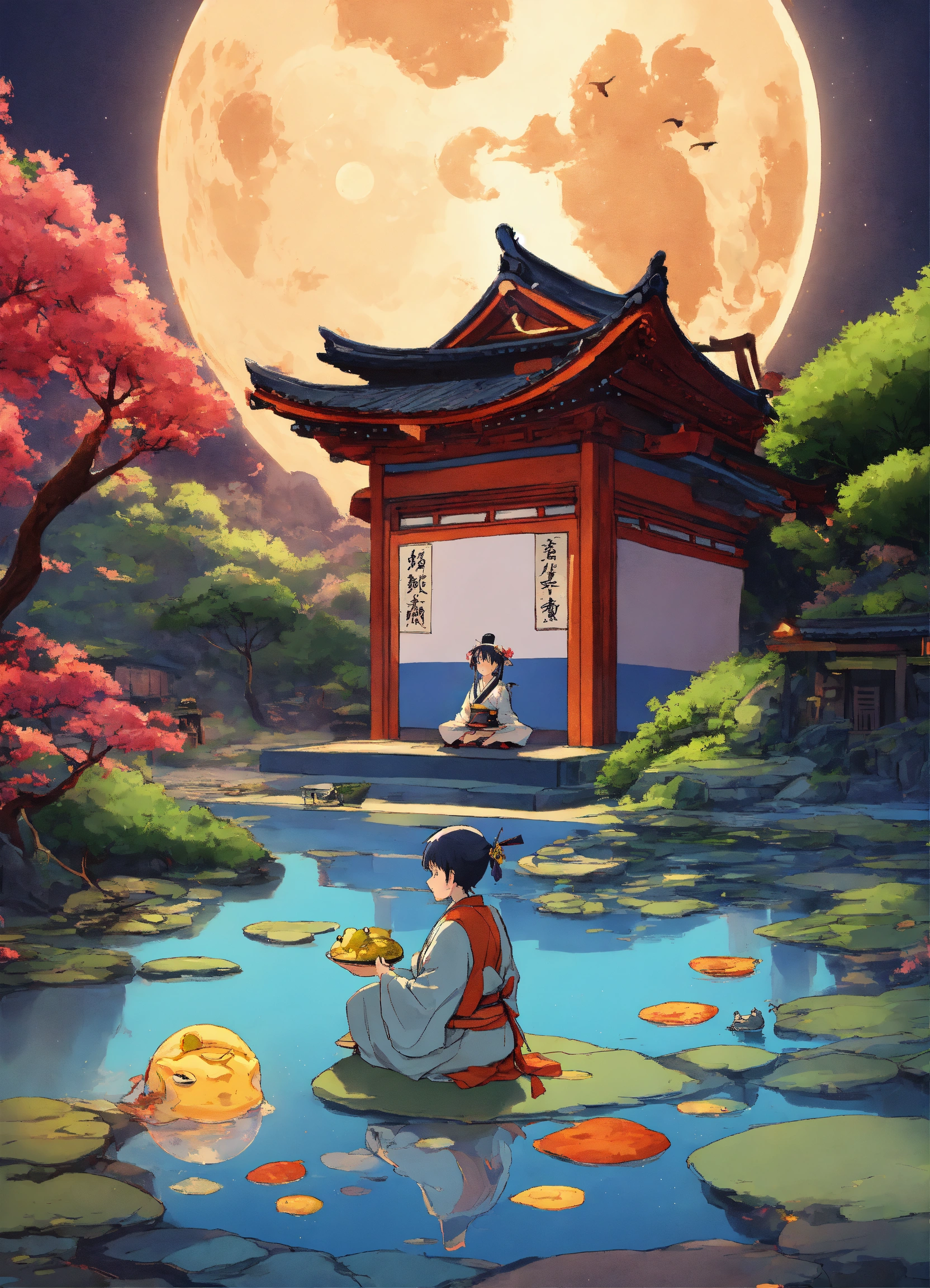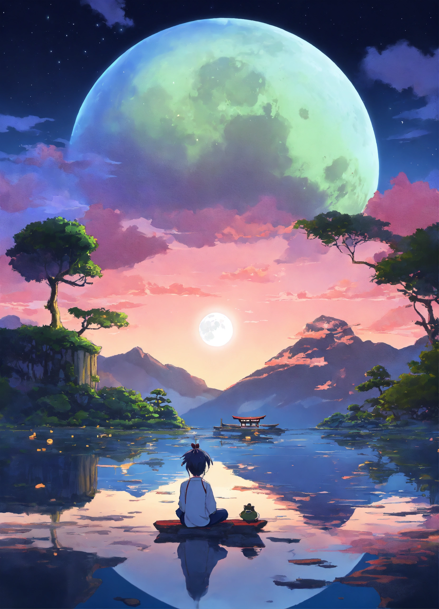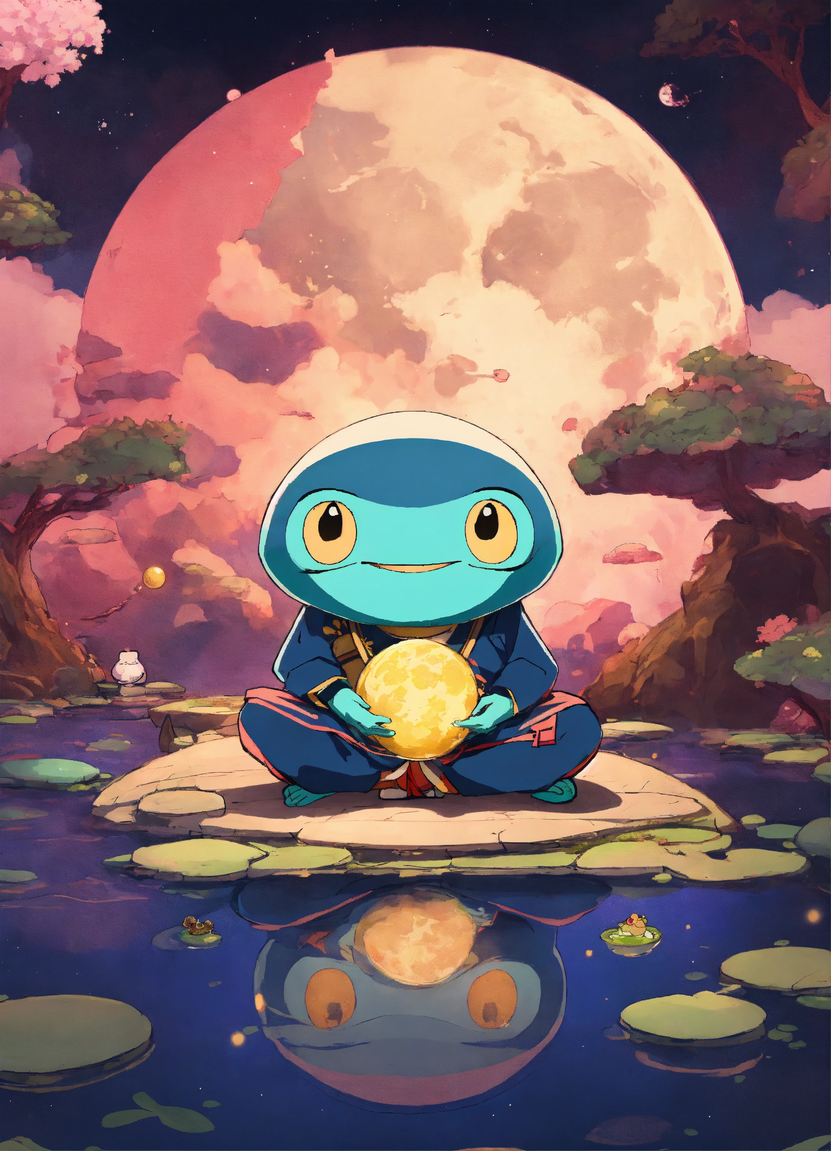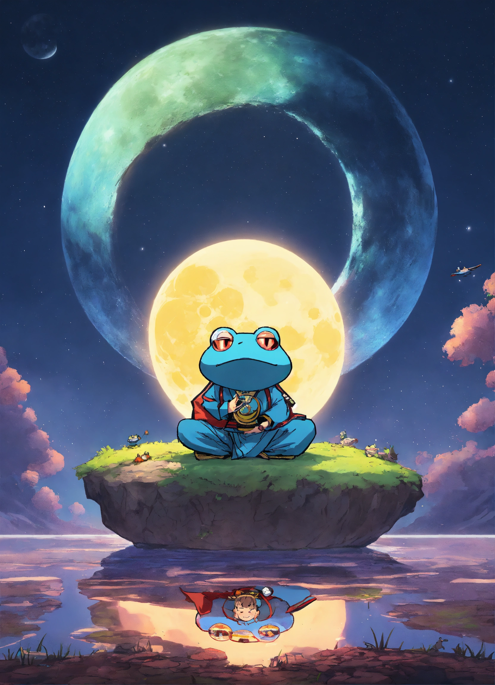 A cartoon anime moon floating with a face in meditation with a toad samurai in meditation in a slice of life anime