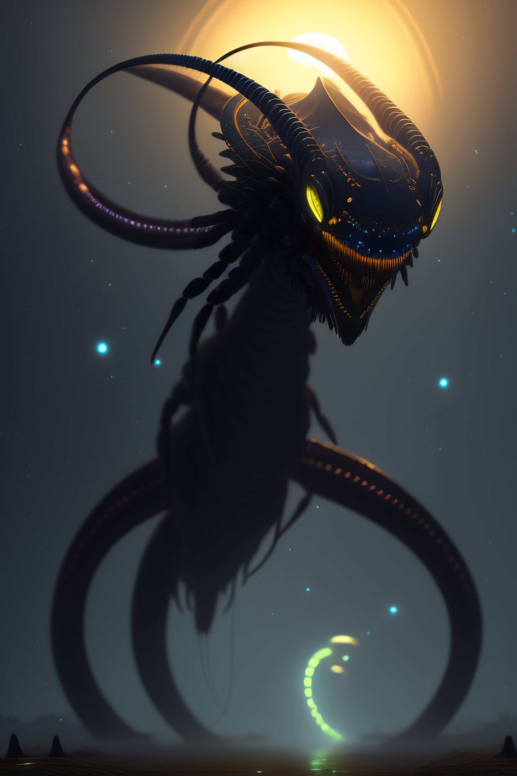 Alien female with six long spider legs, powerful jaws, beautiful and terrible, flexible body, long snake tail, luminous eyes, inspired by stellaris game, dark souls style