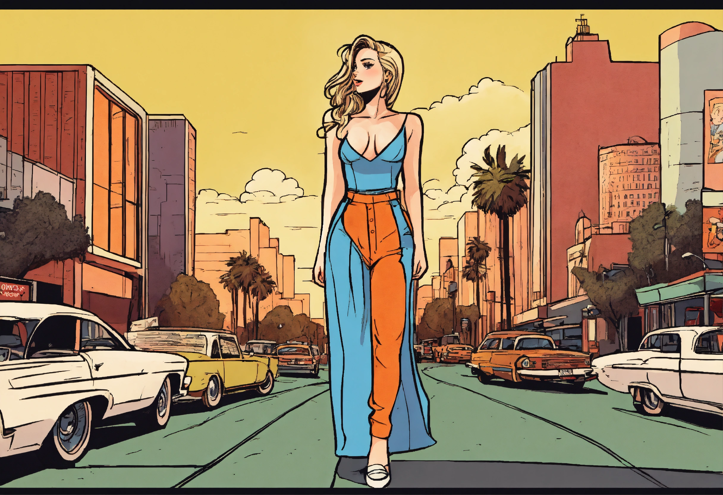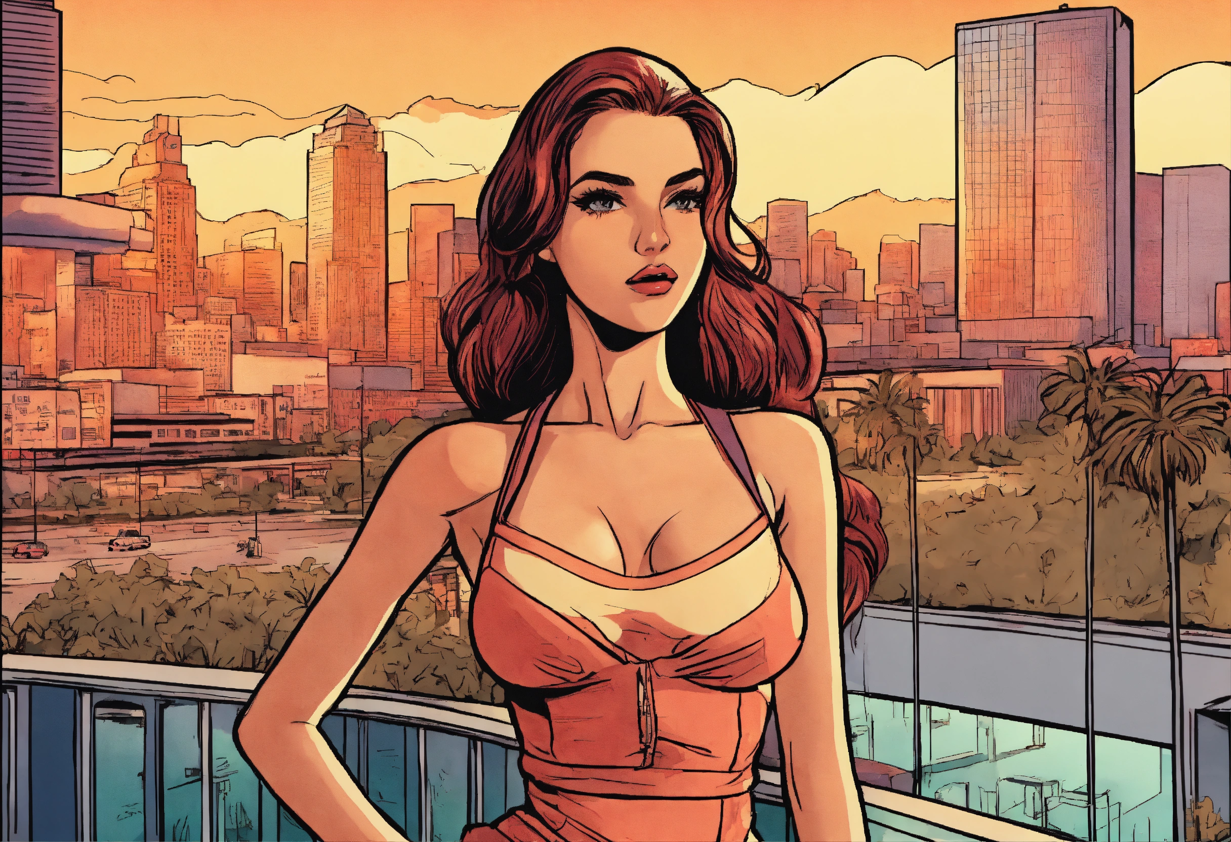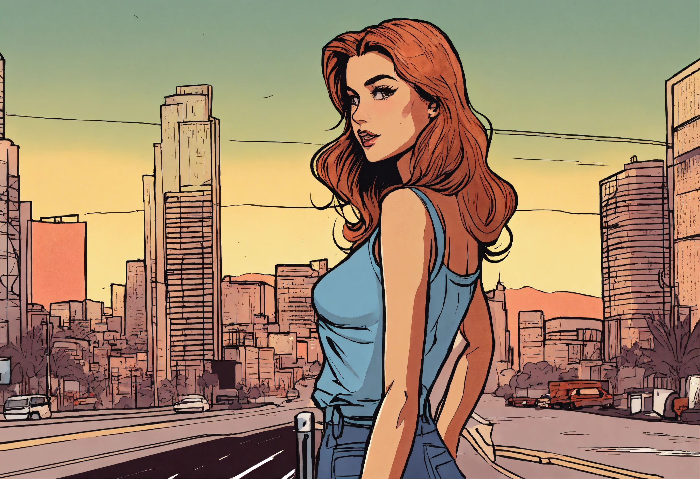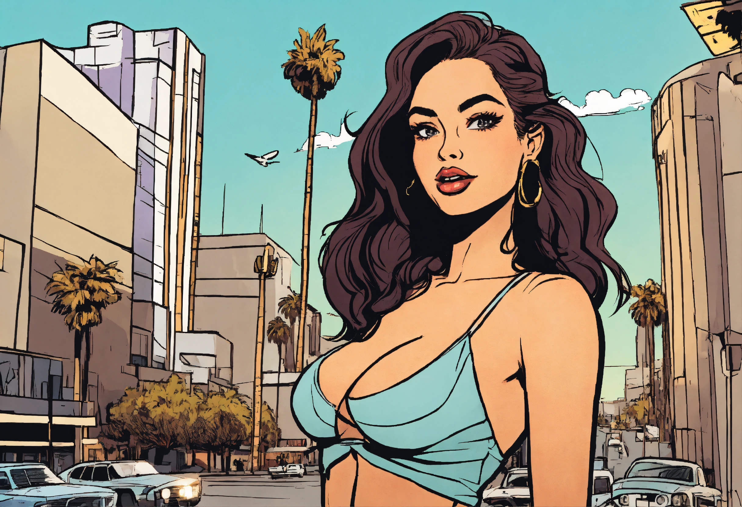 A european comic style hand drawn cartoon of a hot girl standing in los angeles
