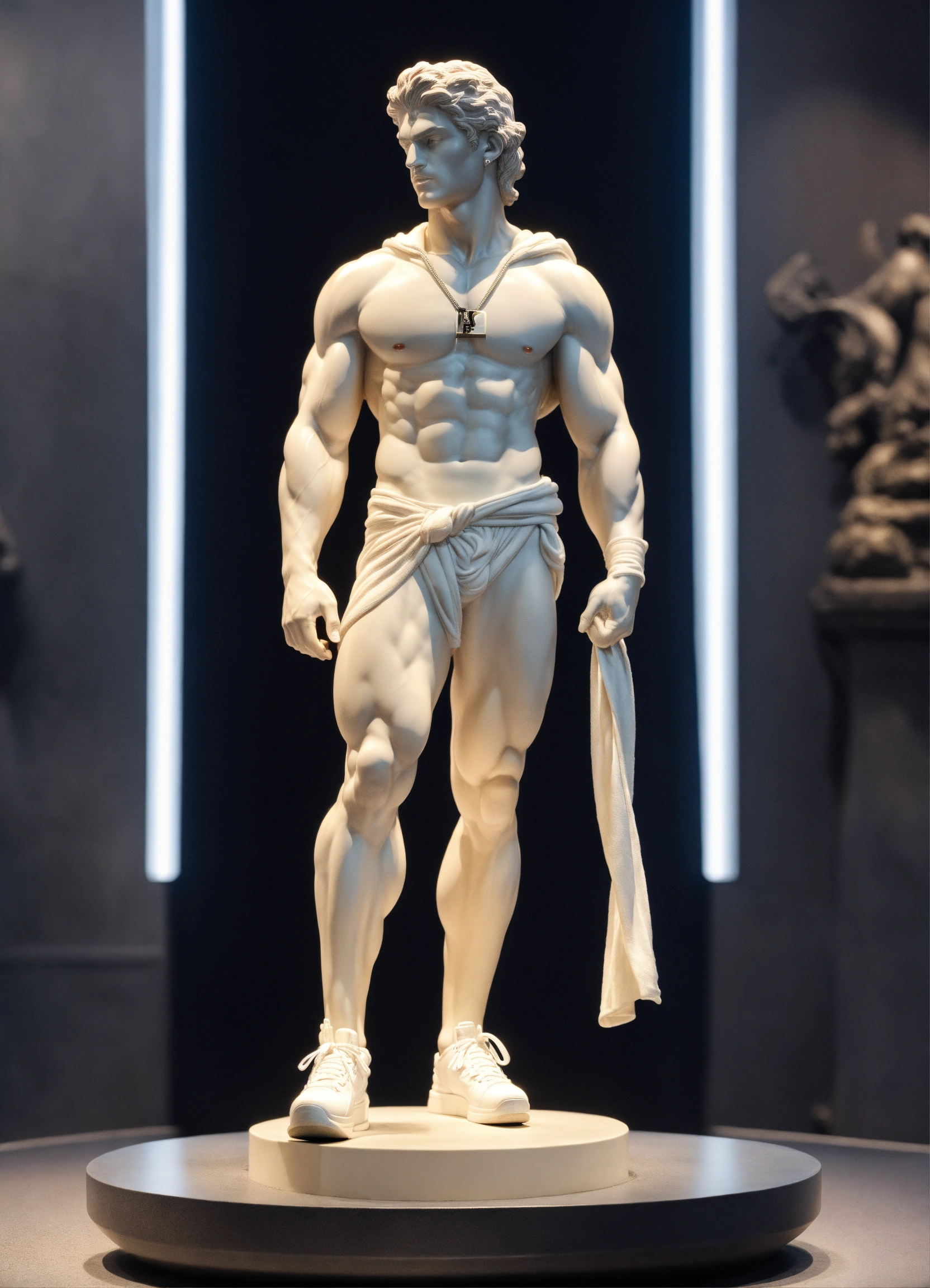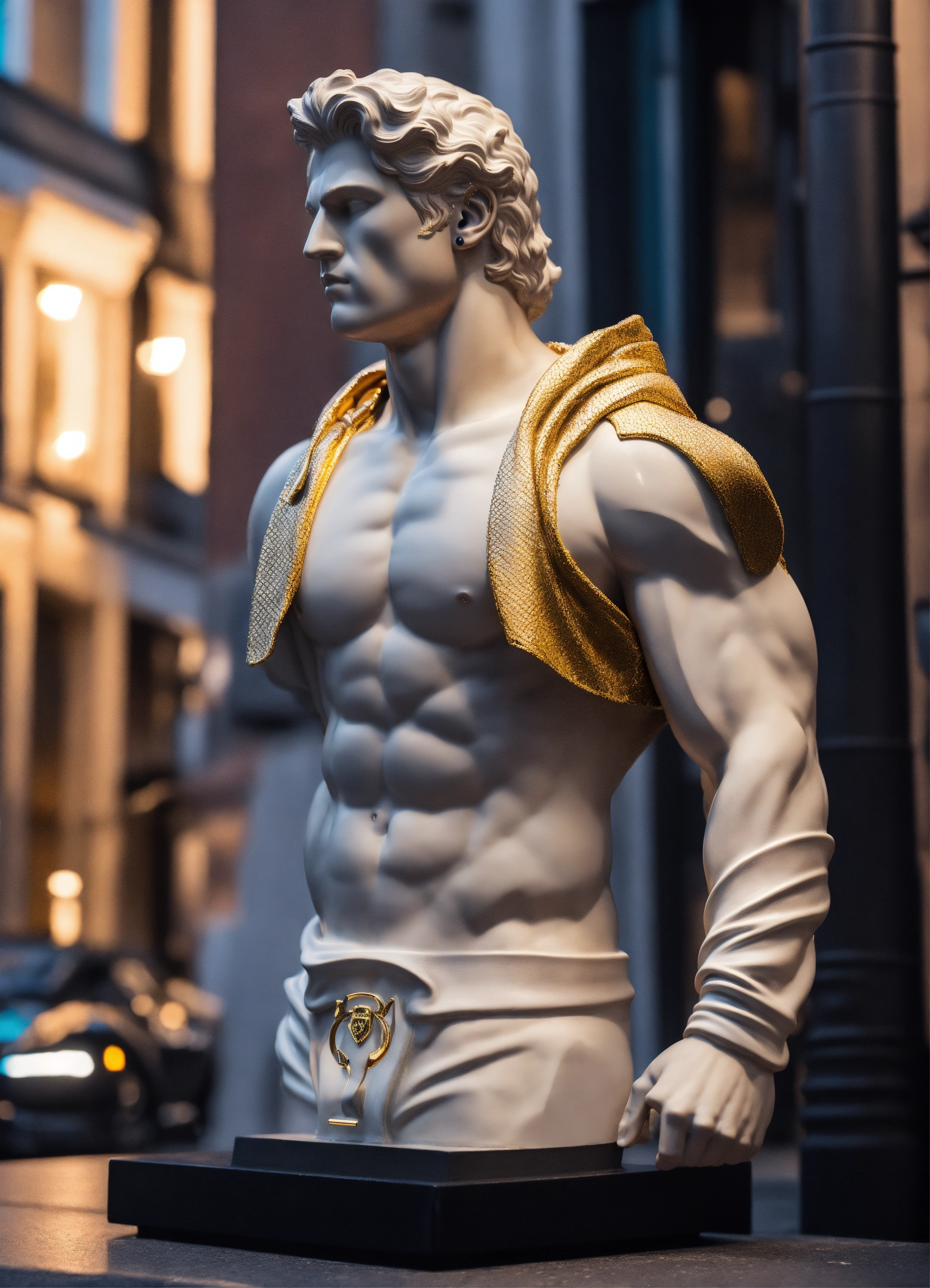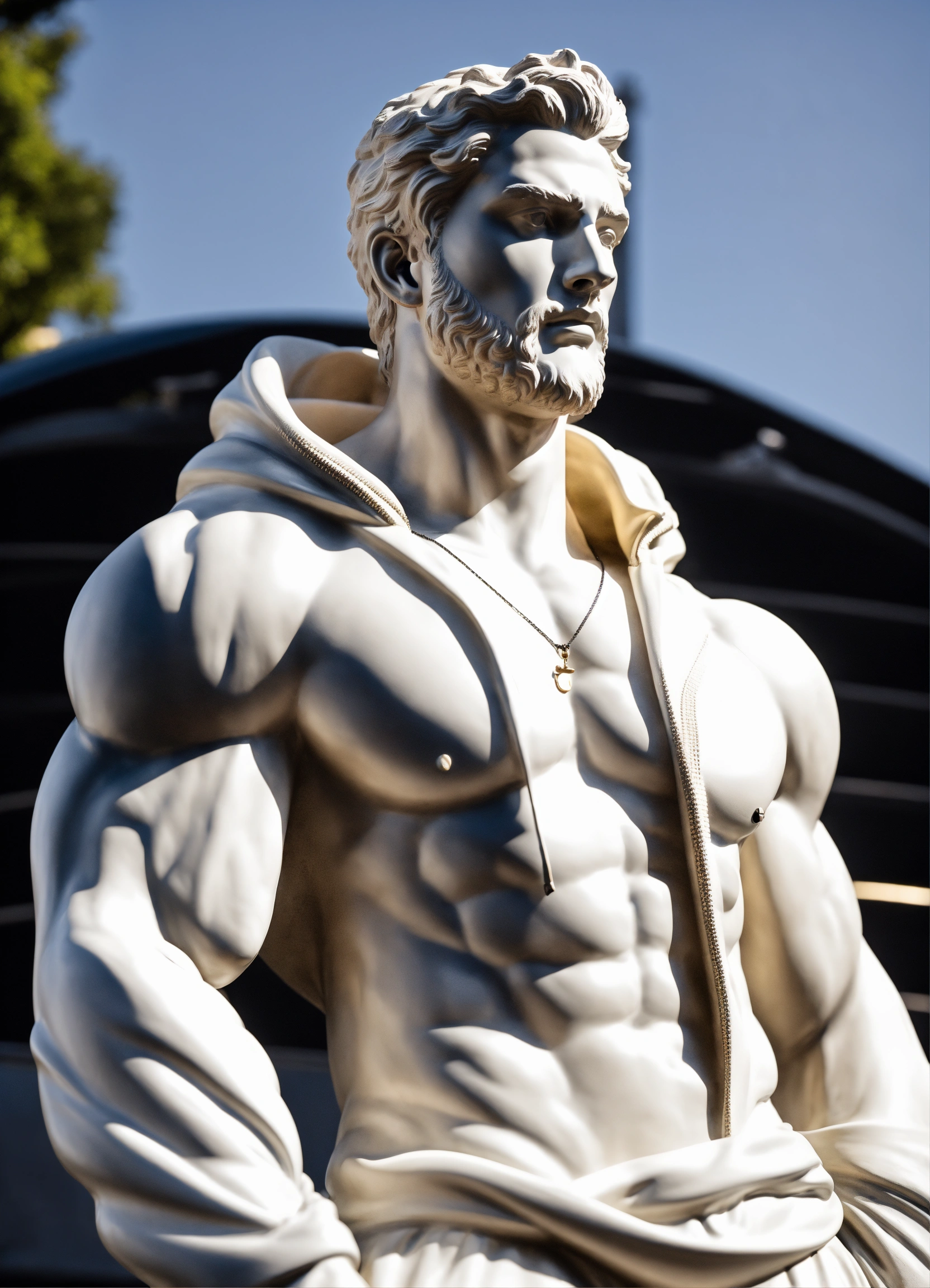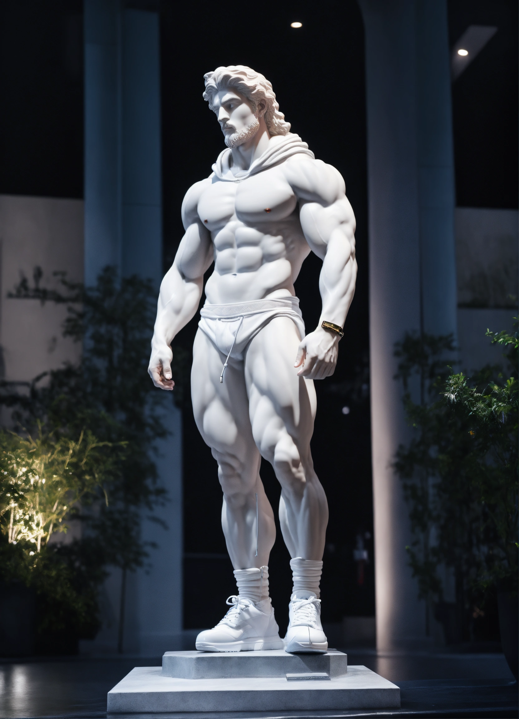 A statue from a muscular greek god statue with a wavey middel parting hair with white color on his body with a black backround standing on a podest animeted style 8k wearing airpods max and a black hoddie standing next to a lamborghini