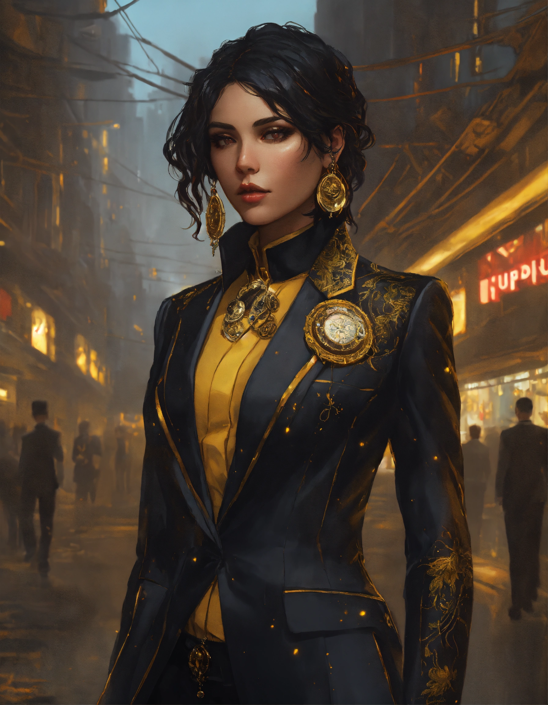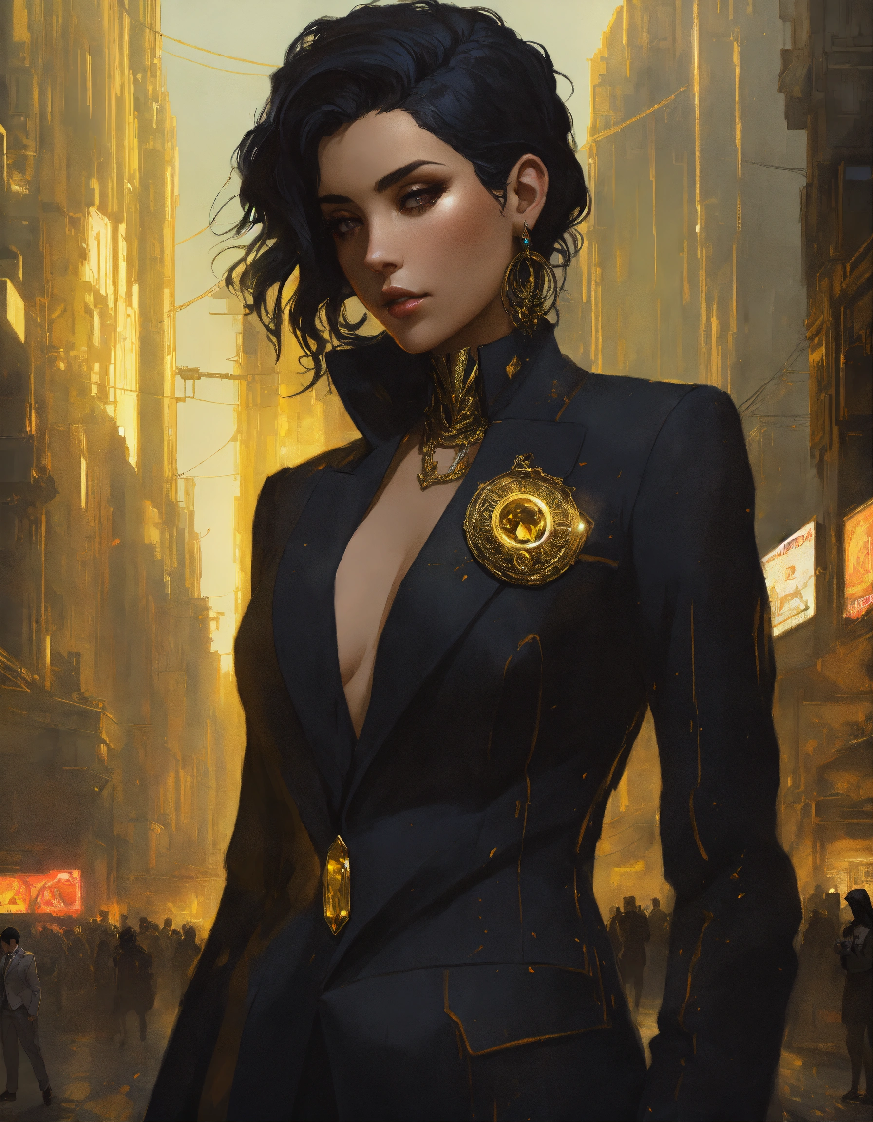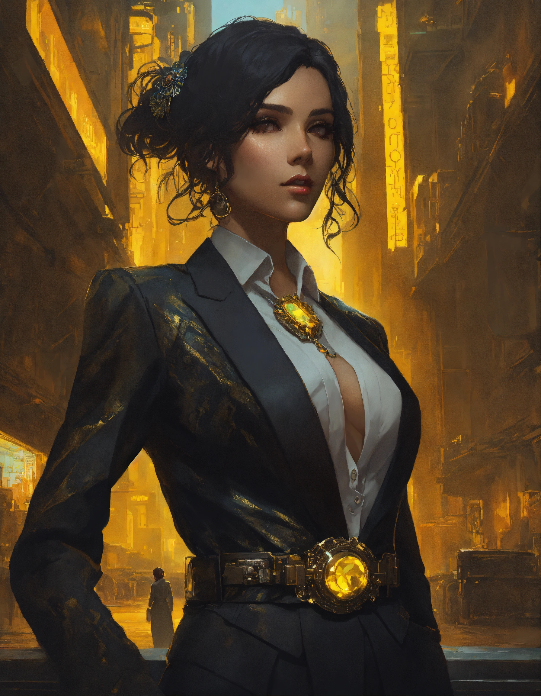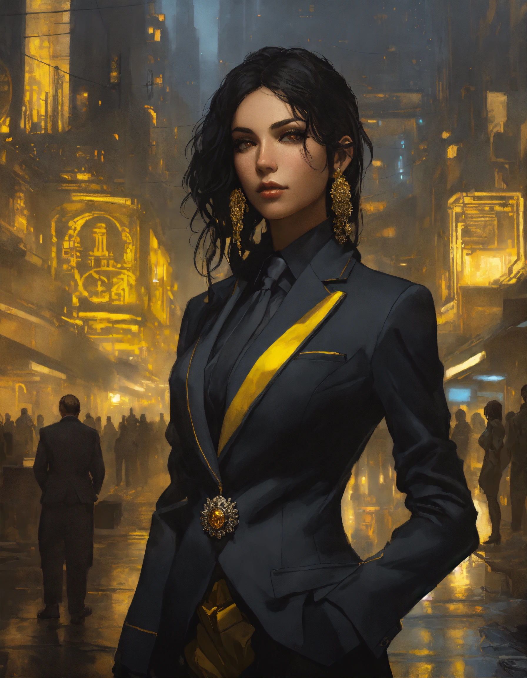 Arrogant middle eastern bimbo with dark hair wearing a black and citrine business suit and broach, in a dark dystopian city, hyper detailed, cyberpunk style, greg rutkowski, alphonse mucha, wlop face view
