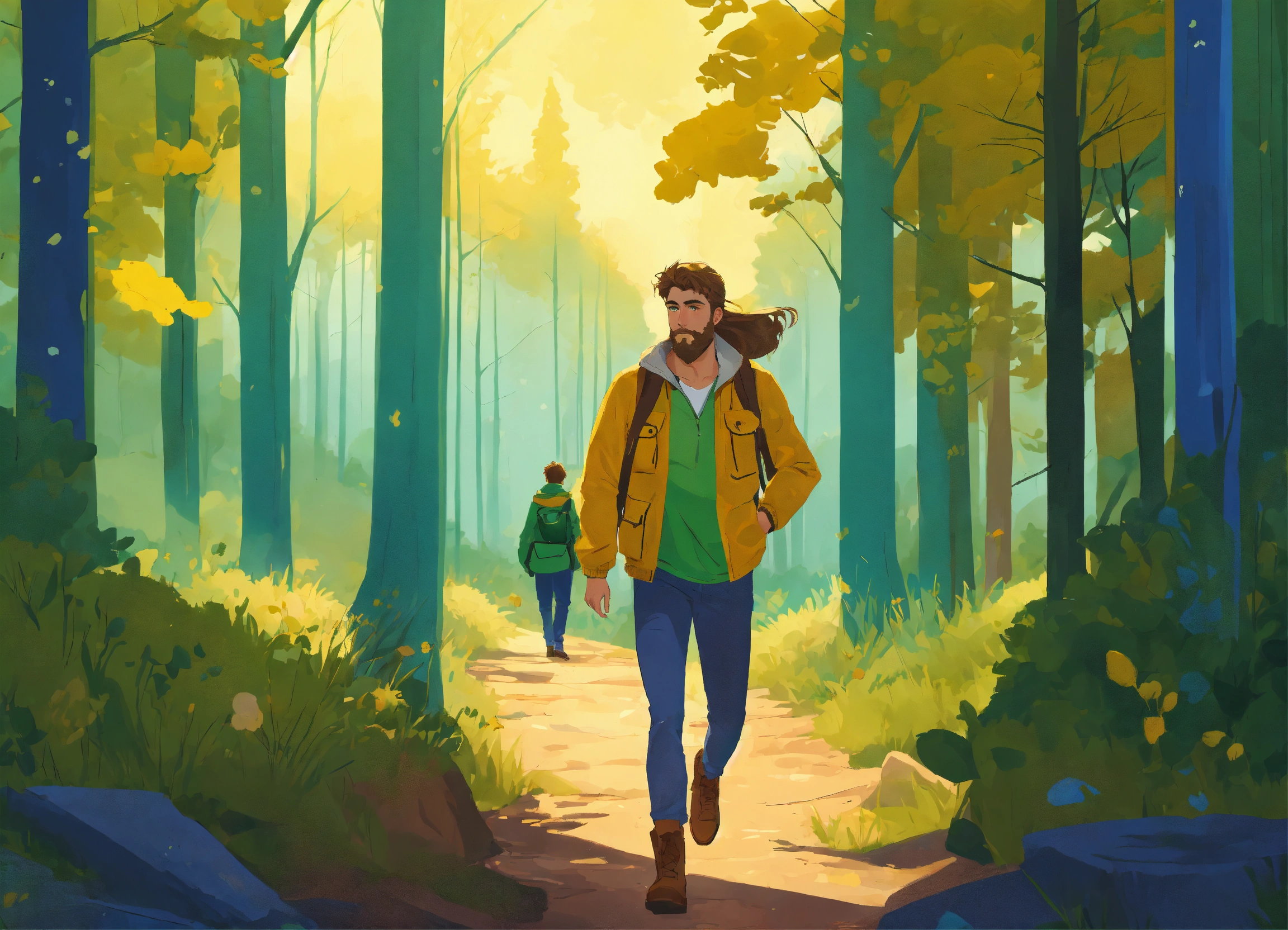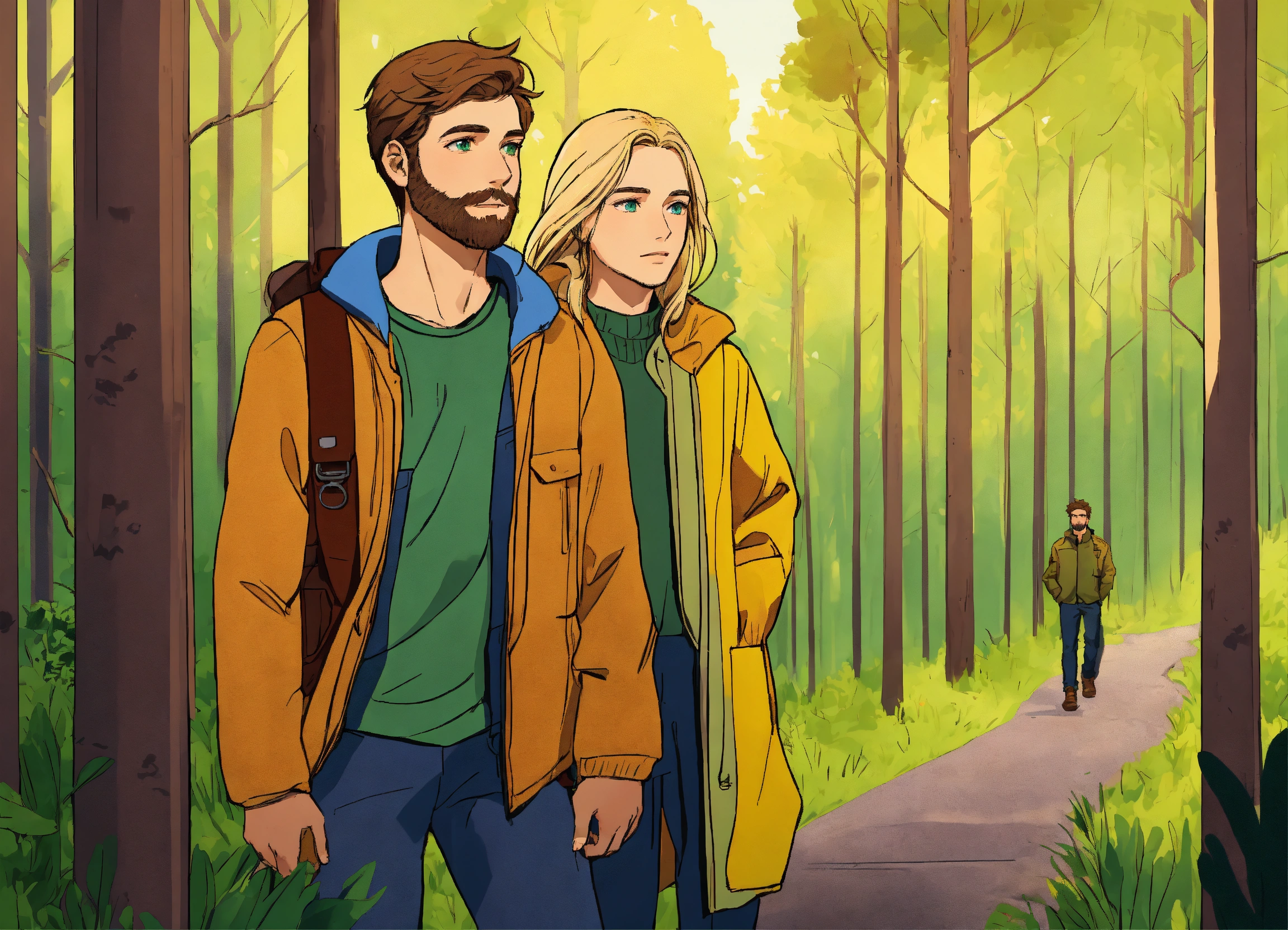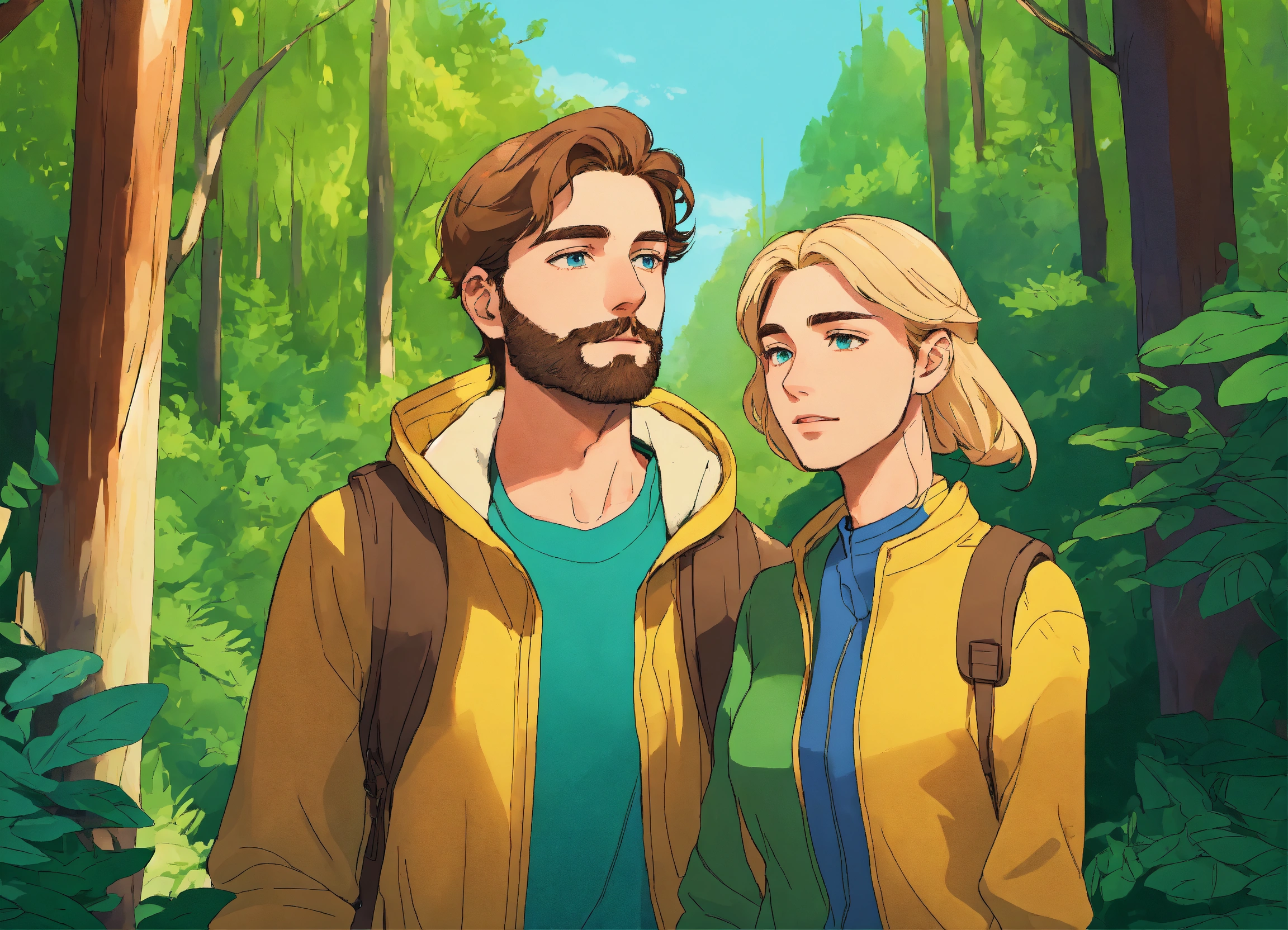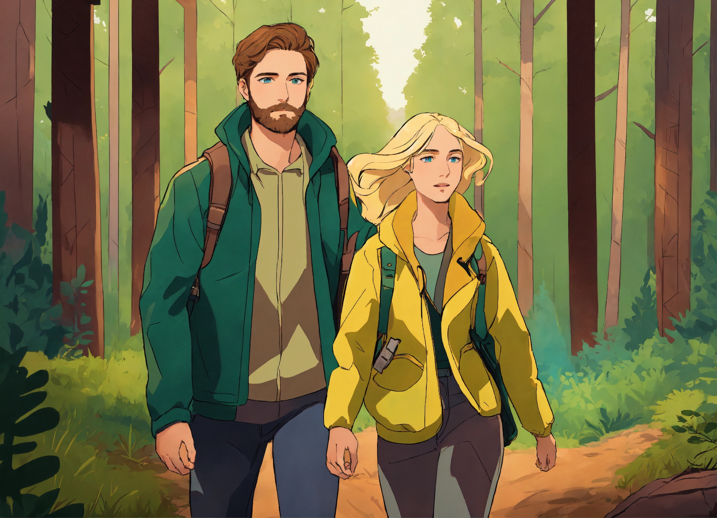 An illustration style where young man with brown hair, light thin brown beard and green eyes, yellow jacket and woman with blonde hair, blue eyes and v shape face embarks on their journey to forest. show dense forest in the background