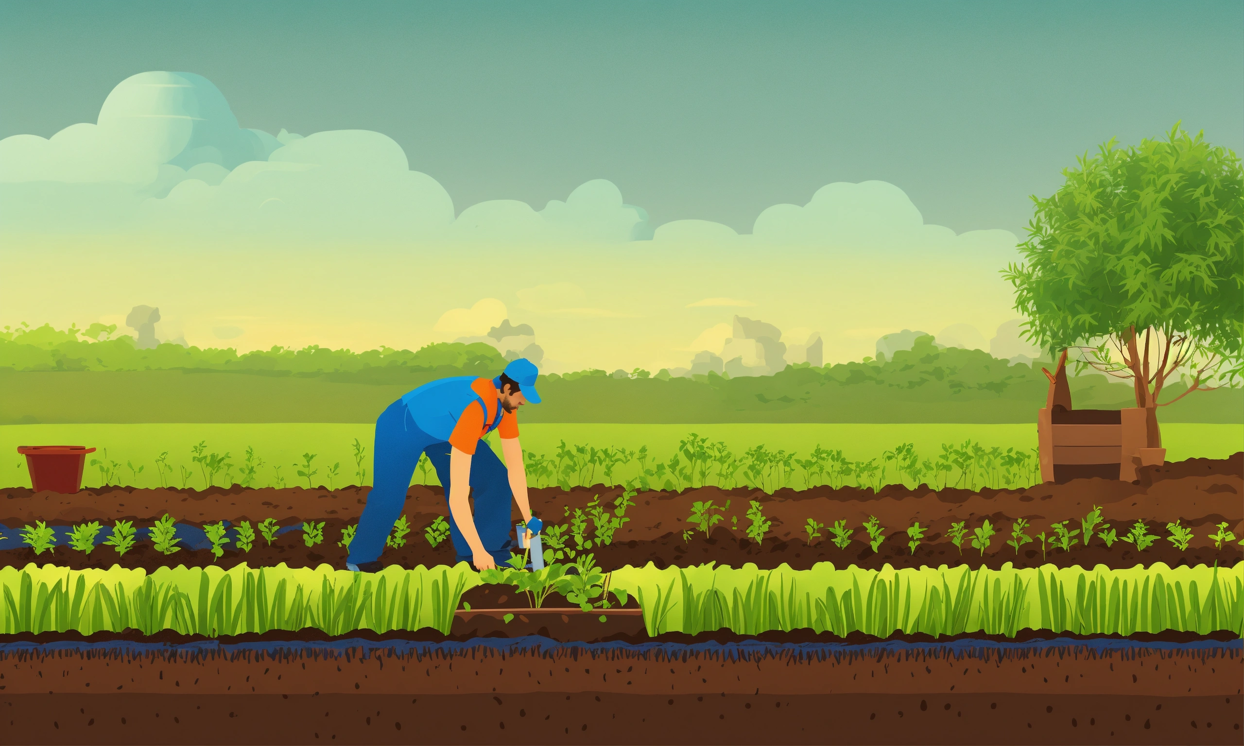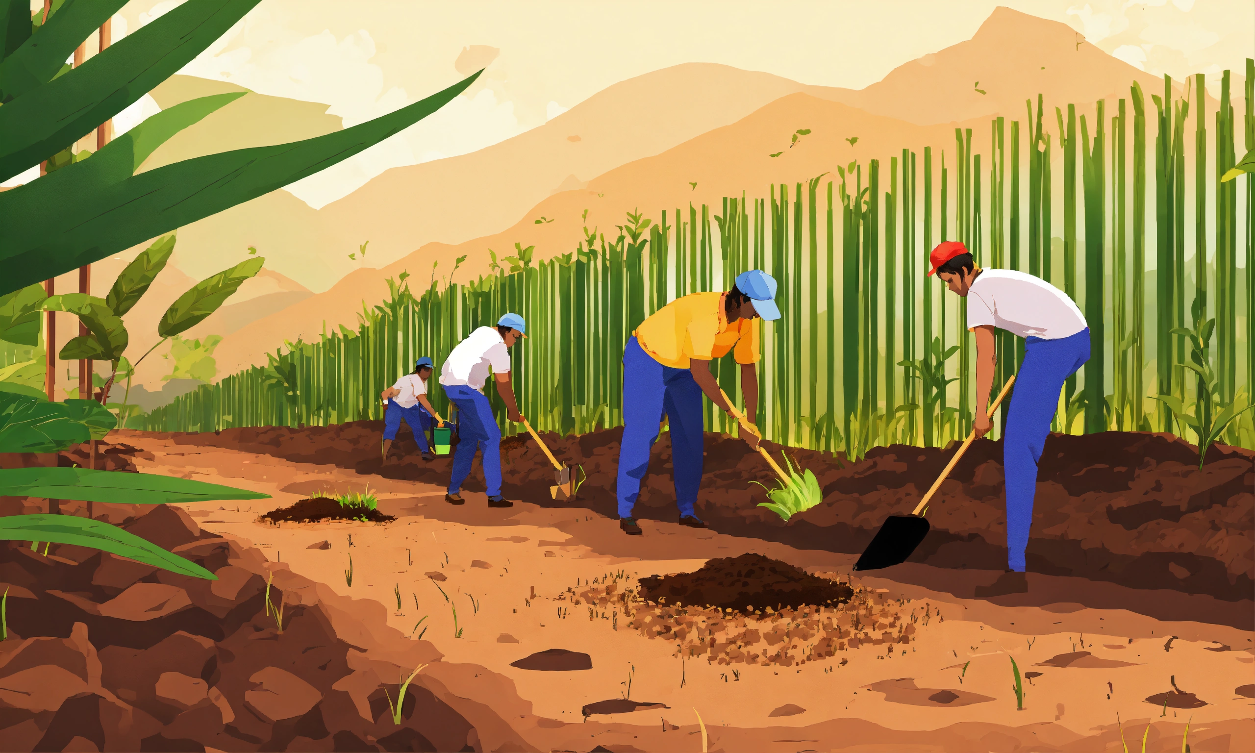 2d animation, vector graphics, very high detailed, 2d illustration of people doing plantation work or planting small plants in ground
