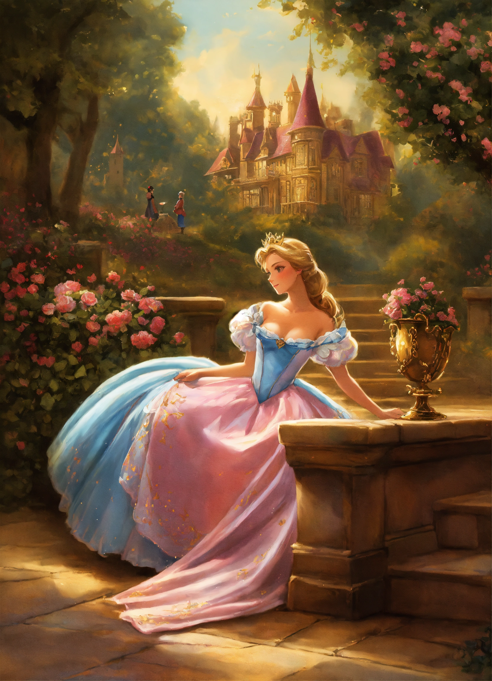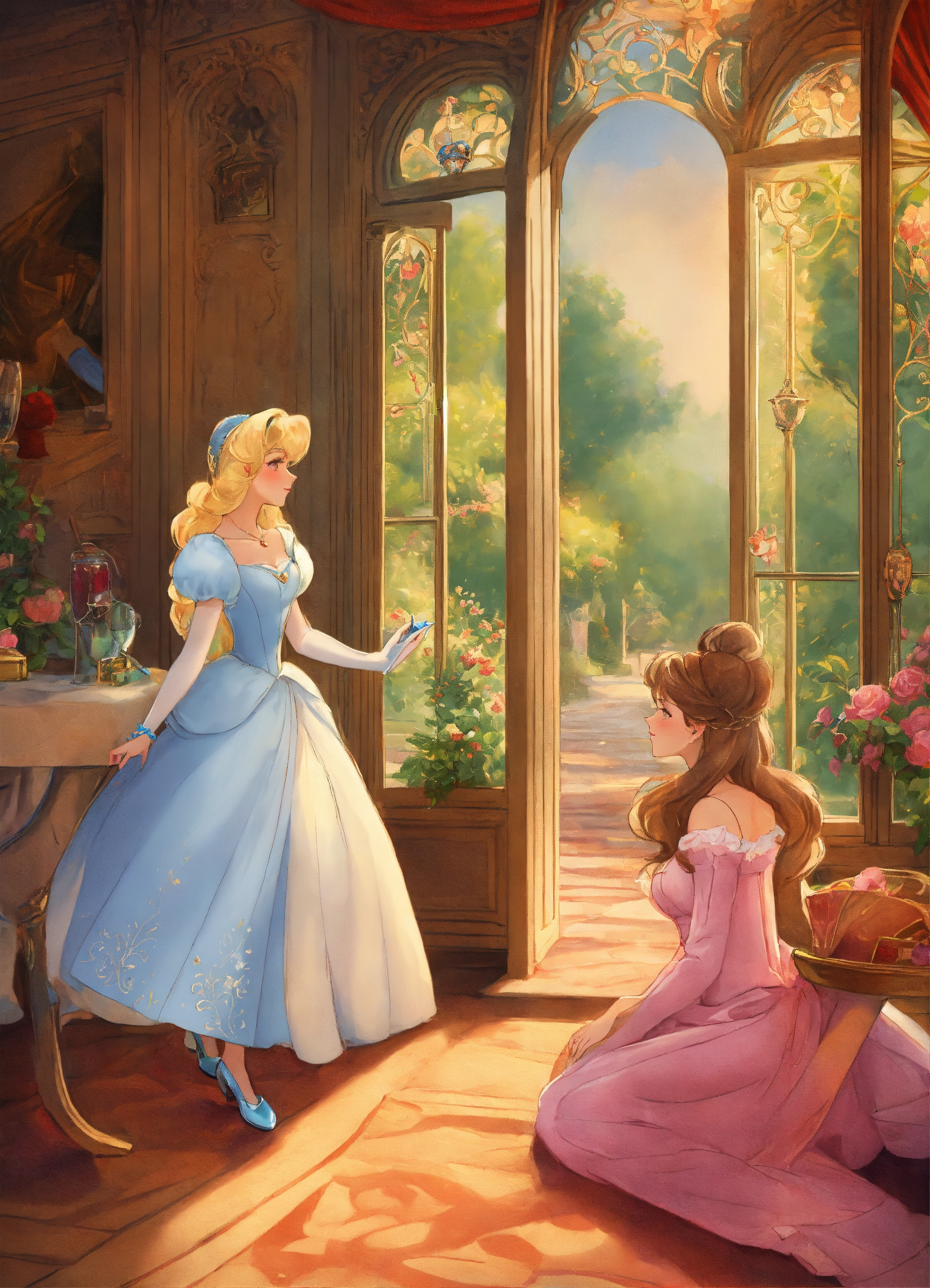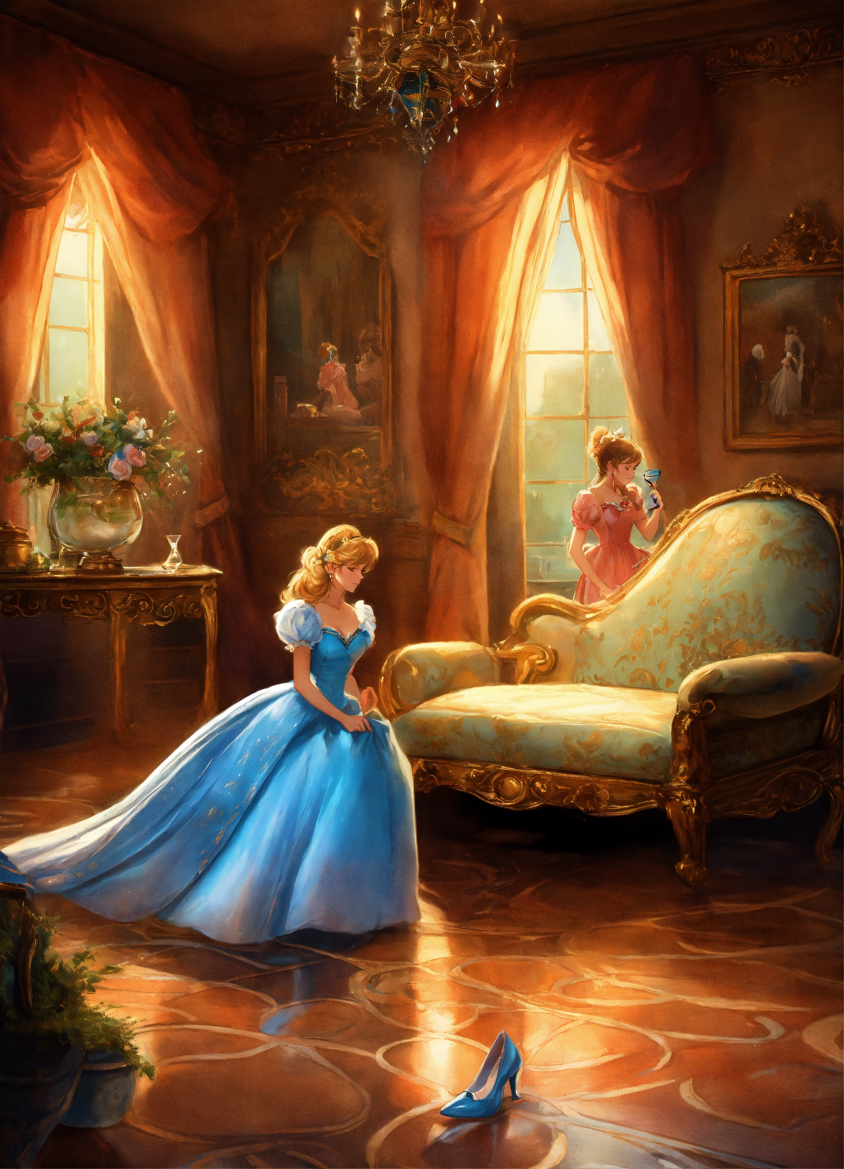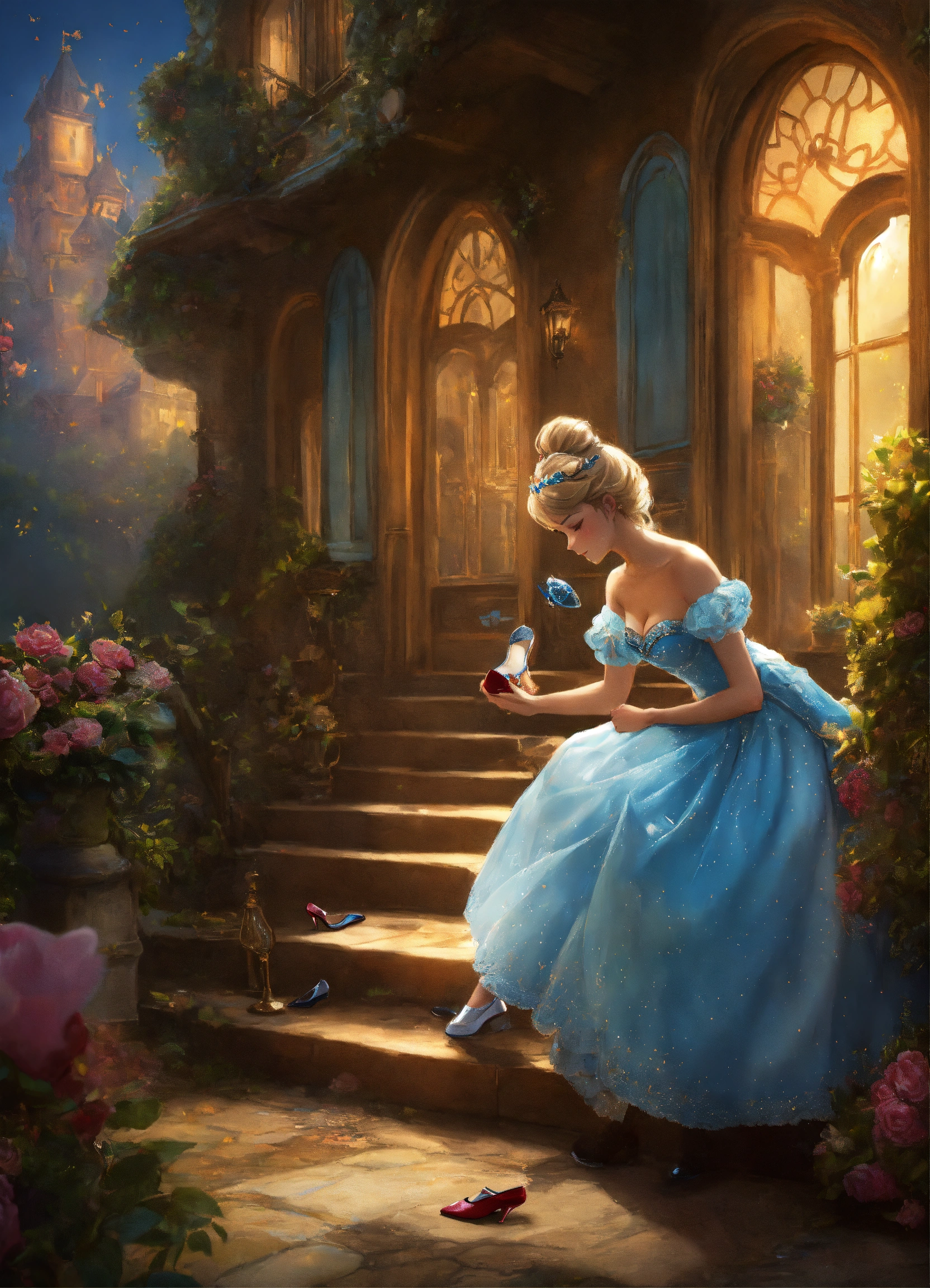 The next day, the prince was determined to find the mysterious beauty who had captured his heart. he sent his servants throughout the kingdom, trying the glass slipper on every maiden's foot. when they arrived at cinderella's house, her stepsisters tried to squeeze their feet into the tiny shoe, but it was a hopeless endeavor. finally, cinderella's turn came, and the glass slipper fit perfectly.