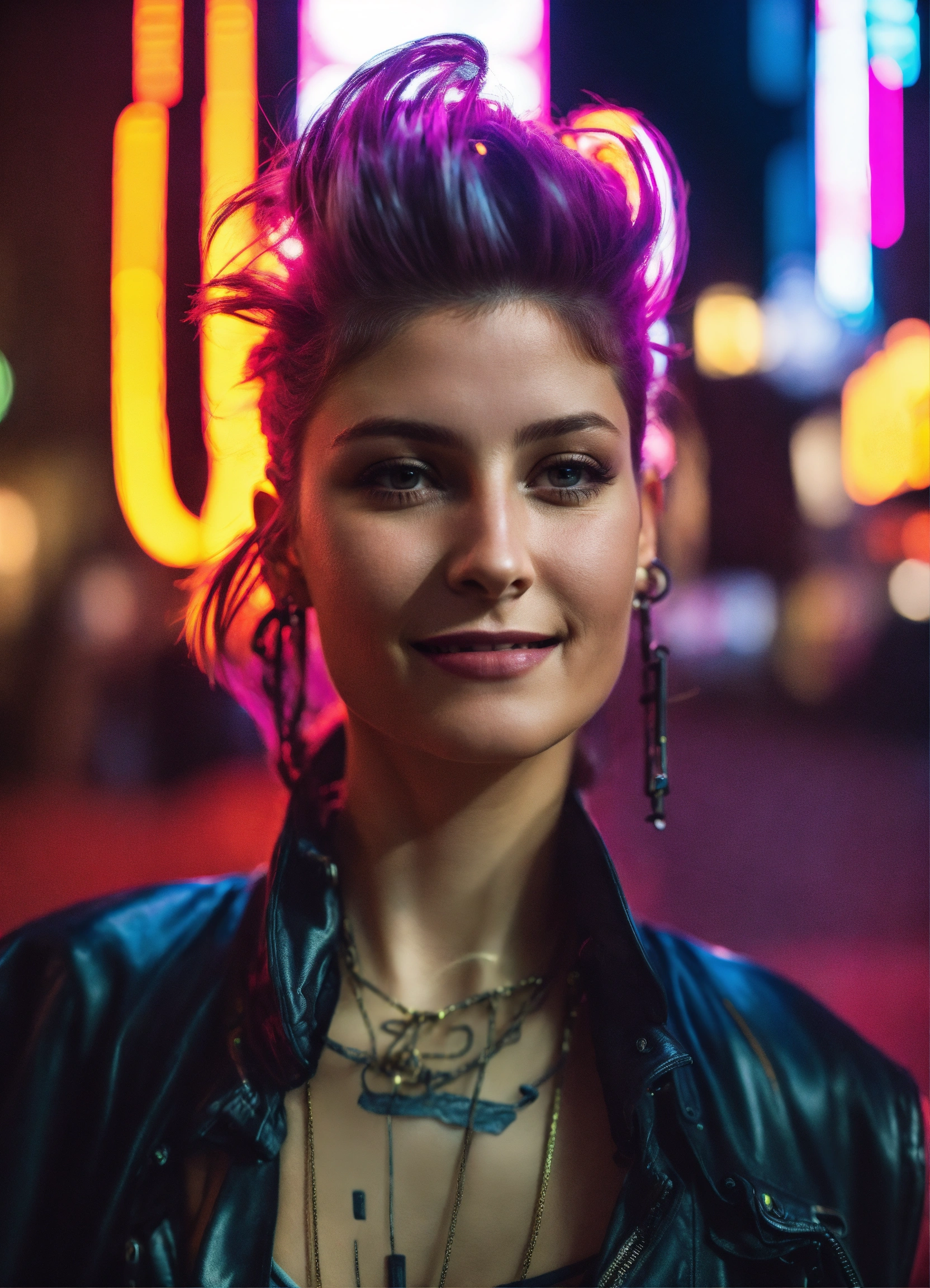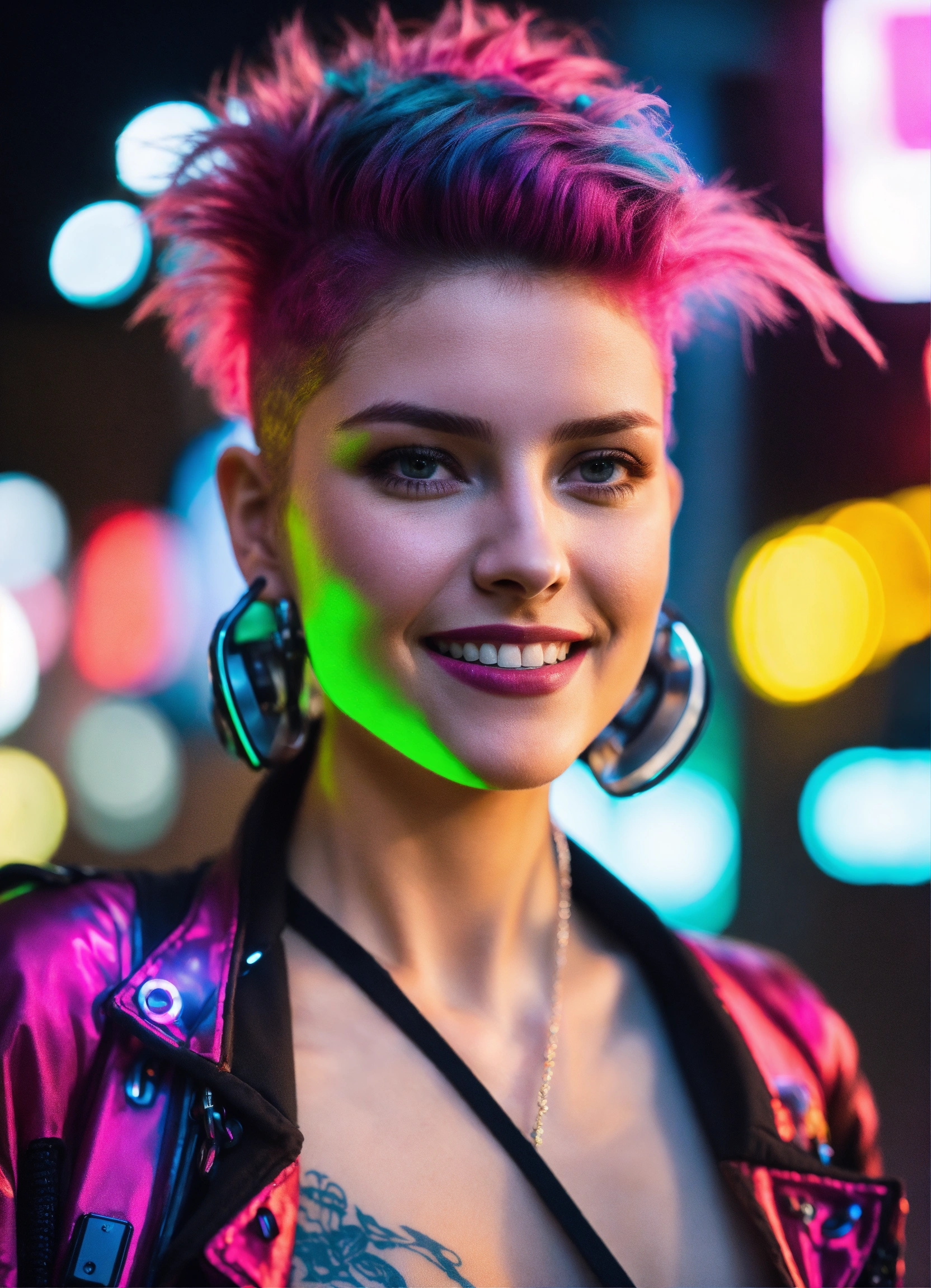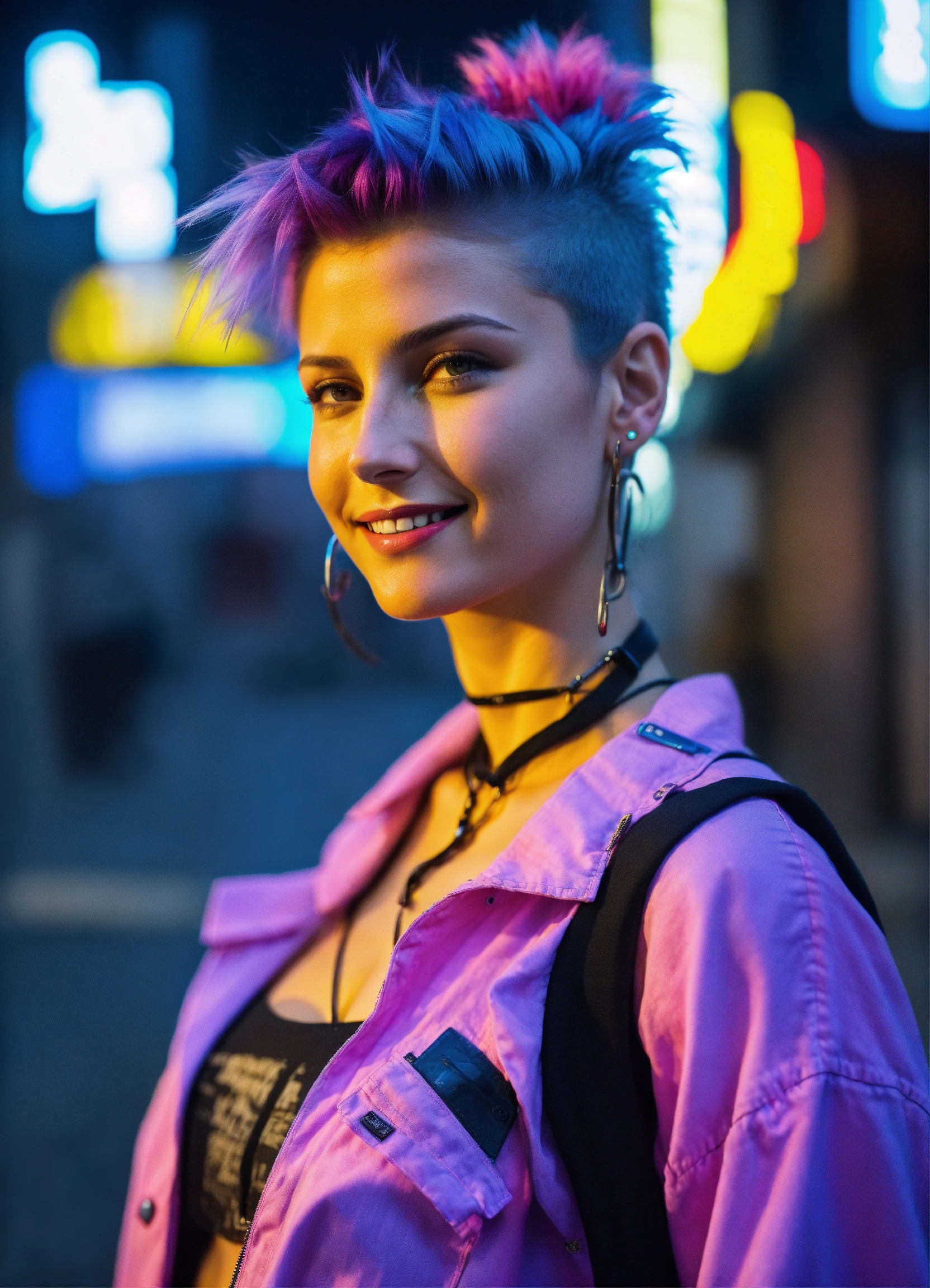 4k photo selfie of 25 year old punk girl looks like a cyberpunk girl mech suit open shirt ally street looking bored mowhawk neon big smile laetitia casta