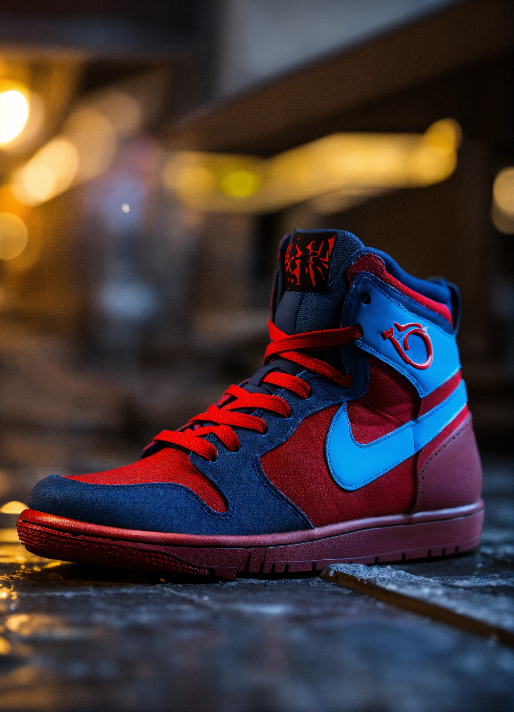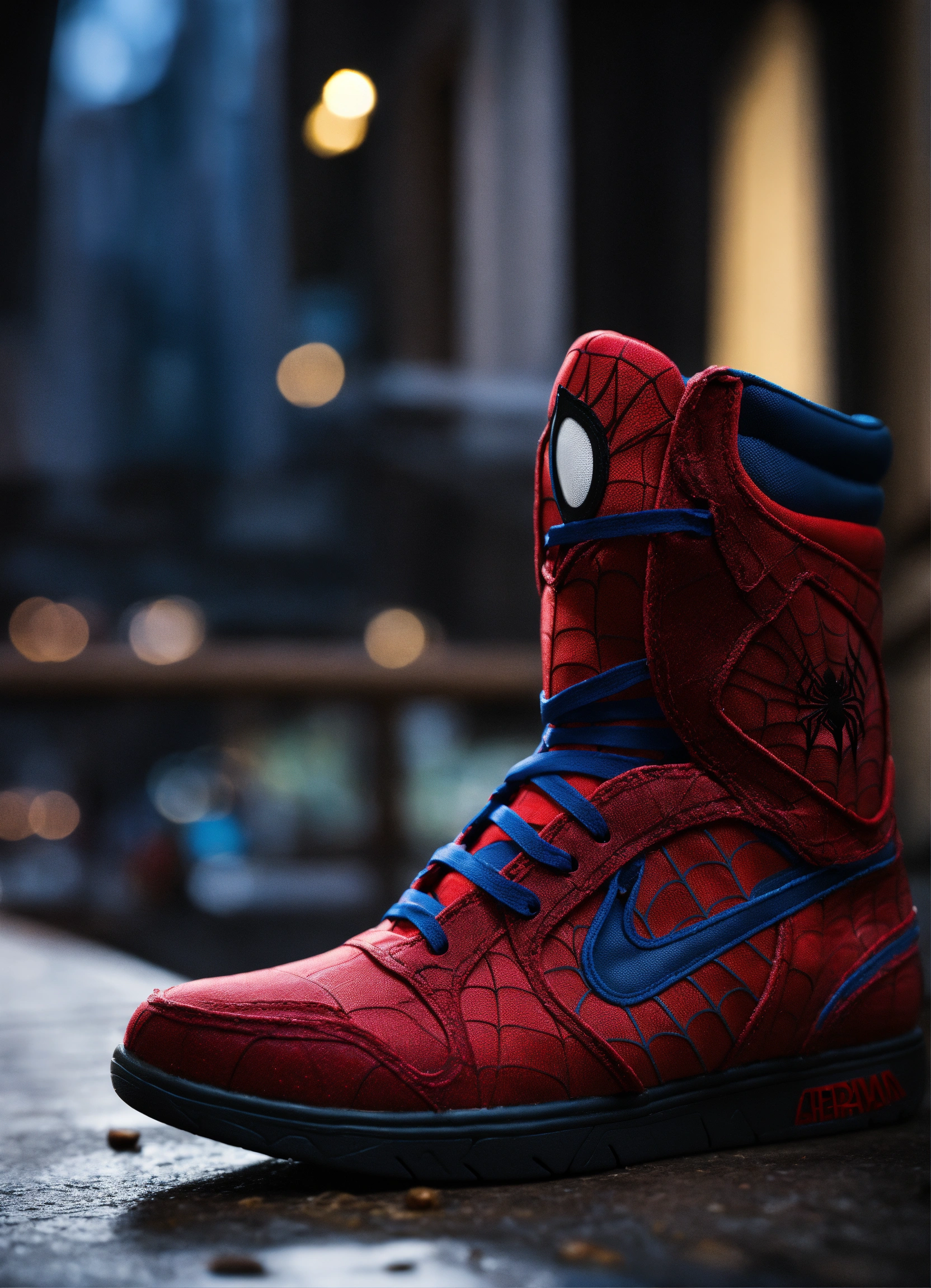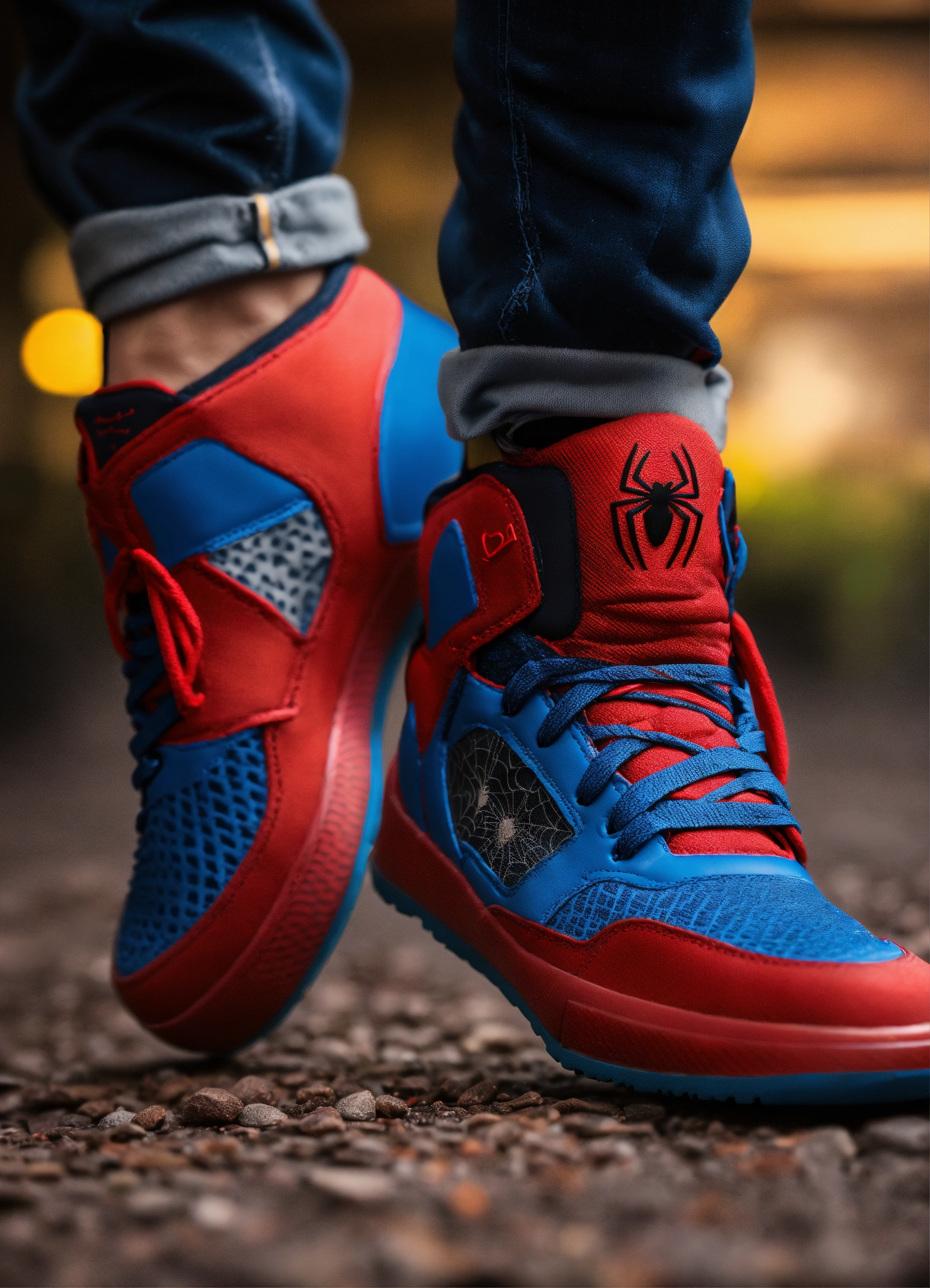 Spider-man inspired shoes, detailed, accurate, real, fun, crazy, high definition, dark background, focus