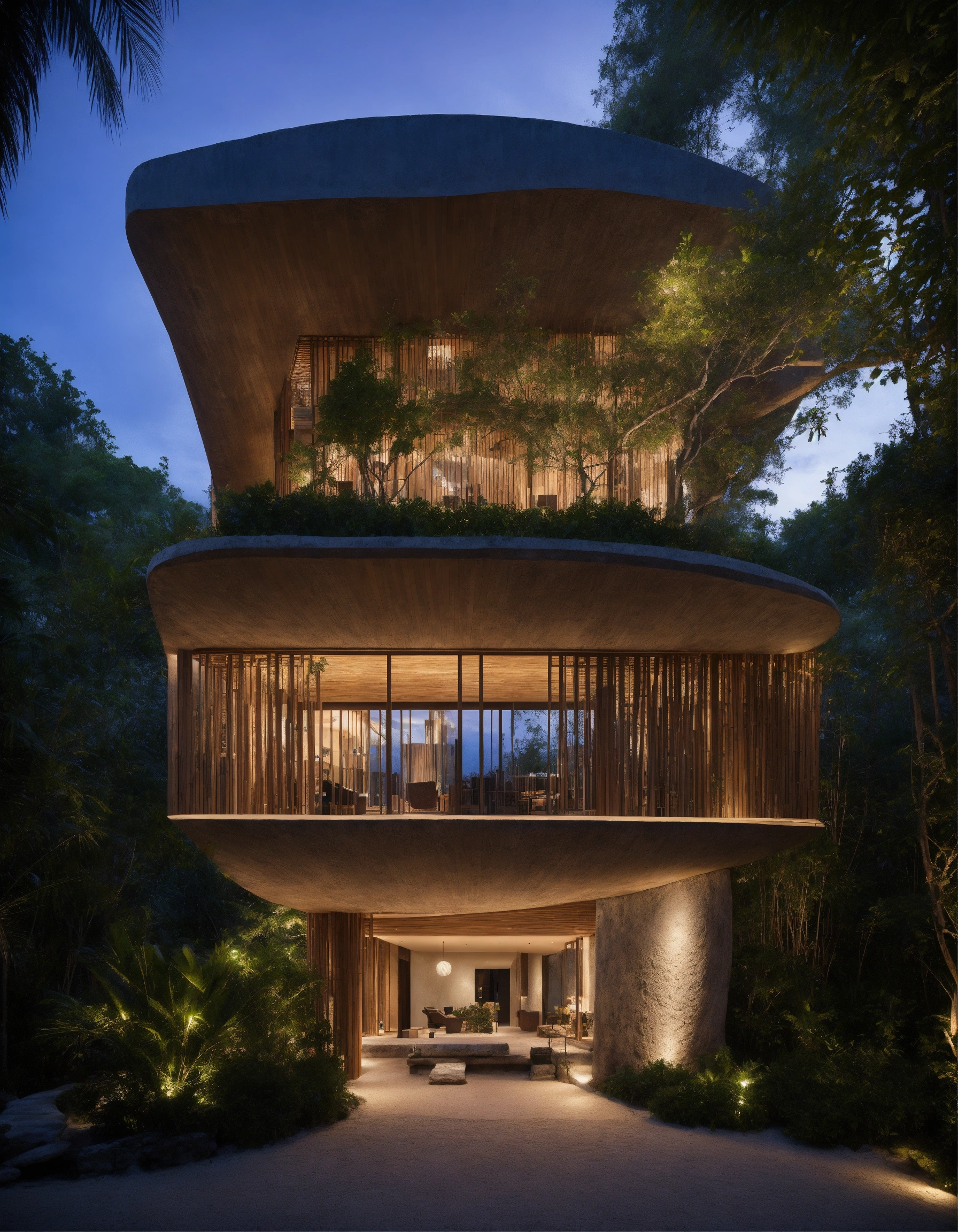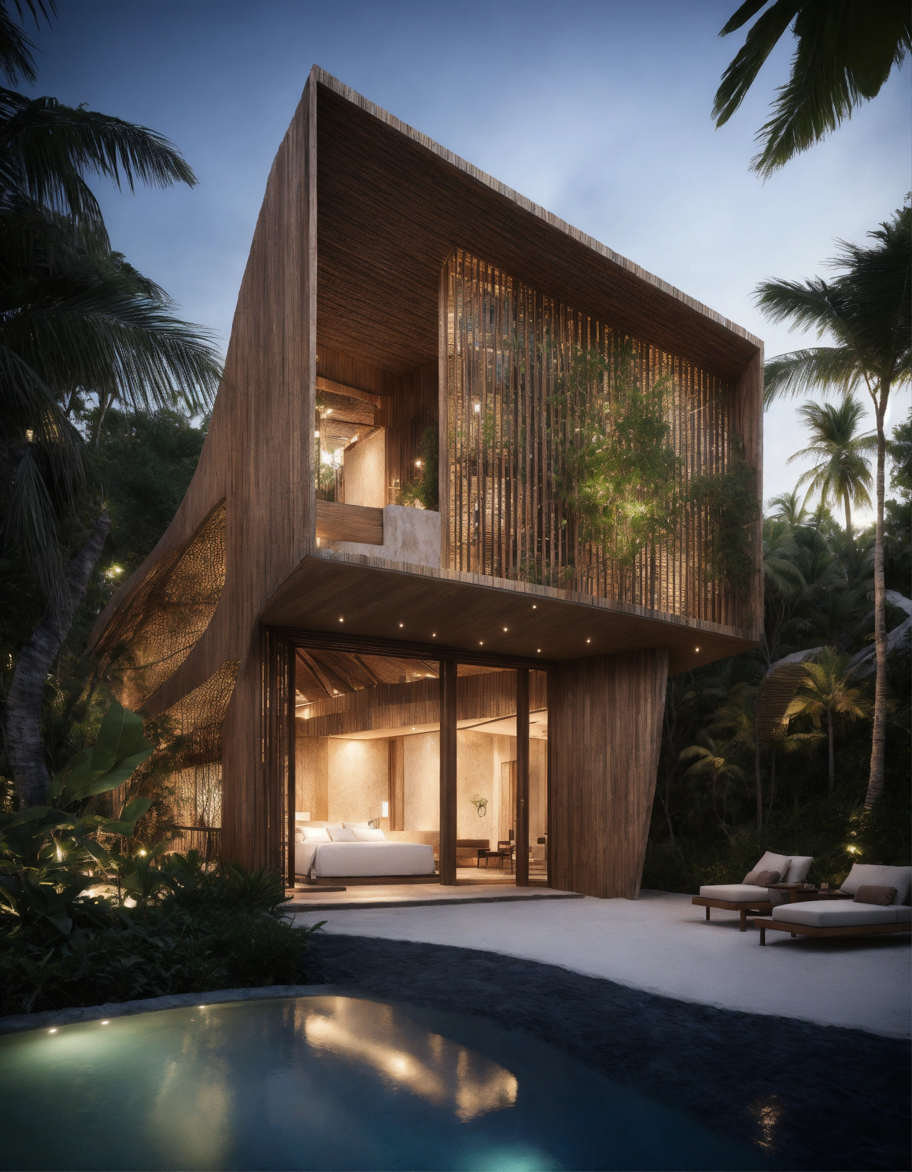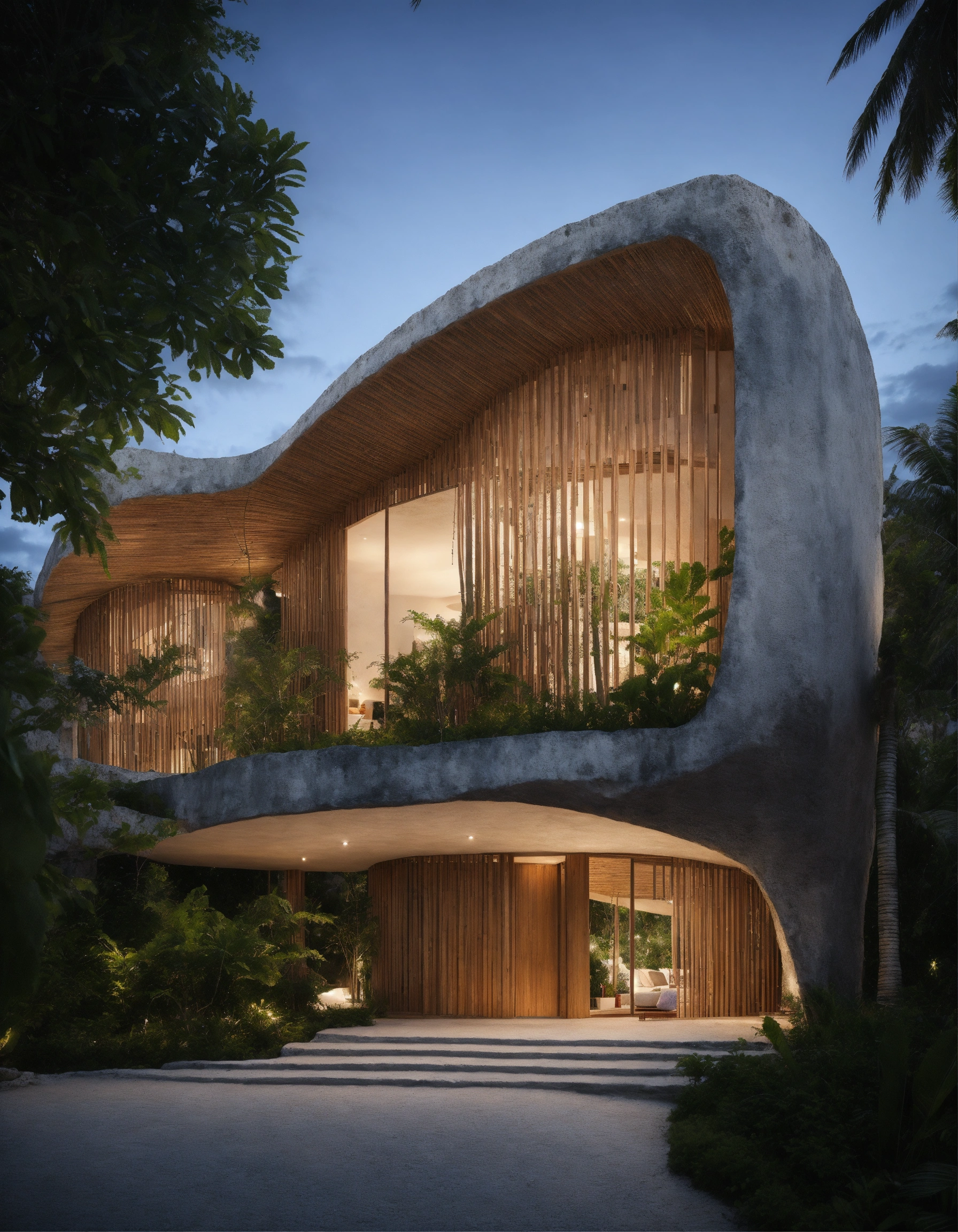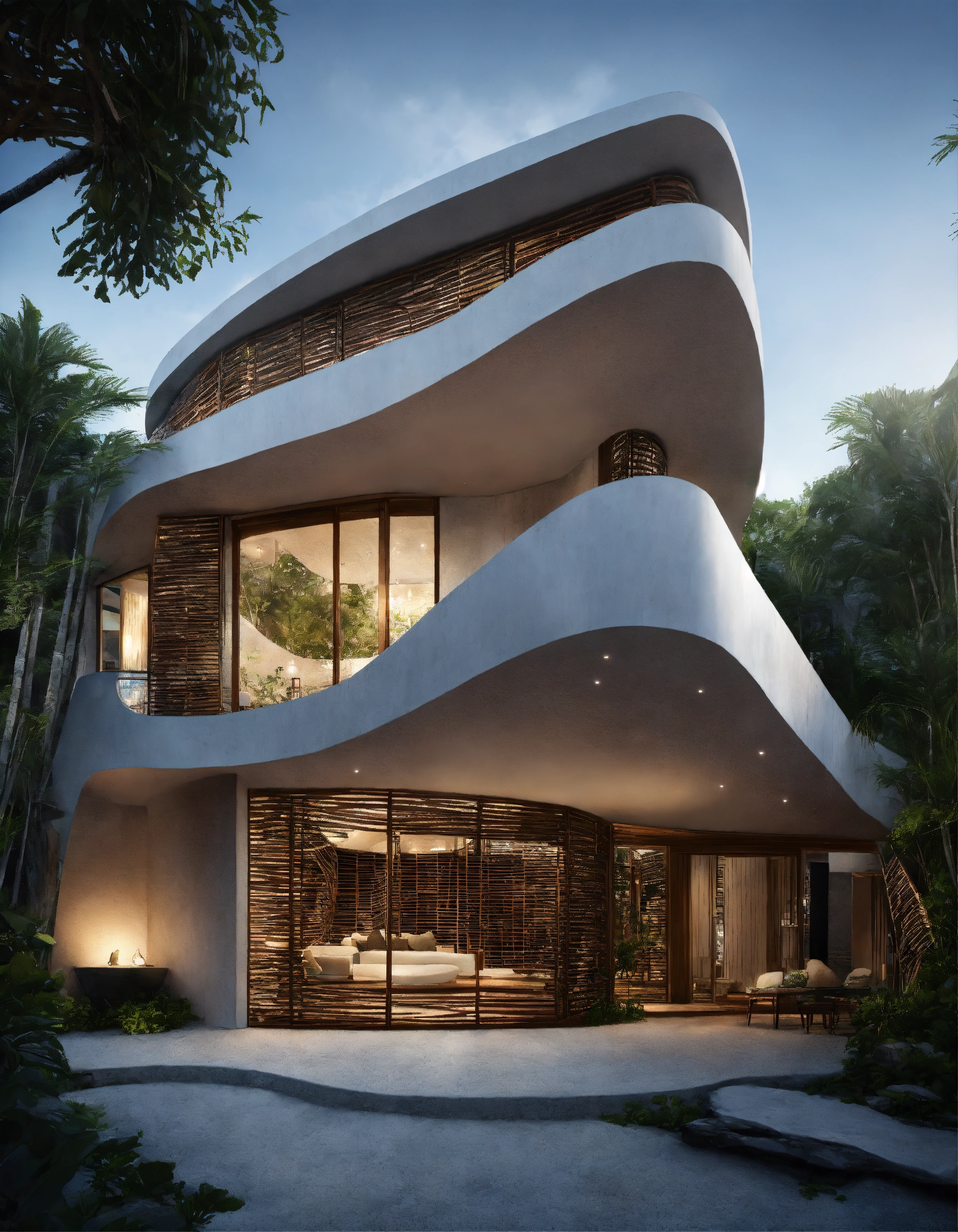 Envision a zaha hadid-styled, environmentally-conscious villa nestled within the bustling modern architecture of tulum, quintana roo. as you approach from the entrance, the street view reveals a facade adorned with a vertical bamboo lattice, gracefully contrasting with the stone finish. large overhangs hint at the interior's coolness, and the surrounding trees whisper tales of nature's embrace.
