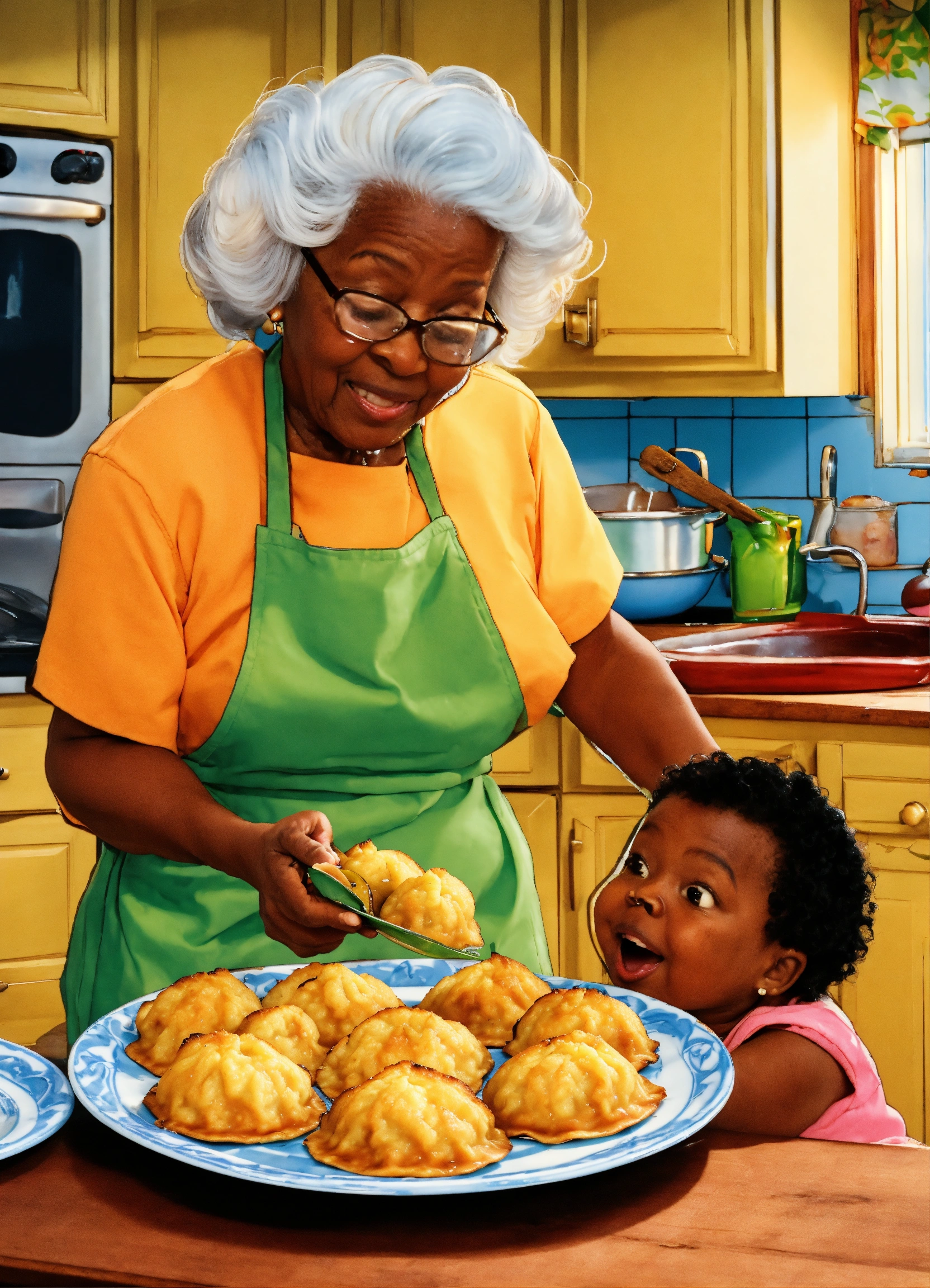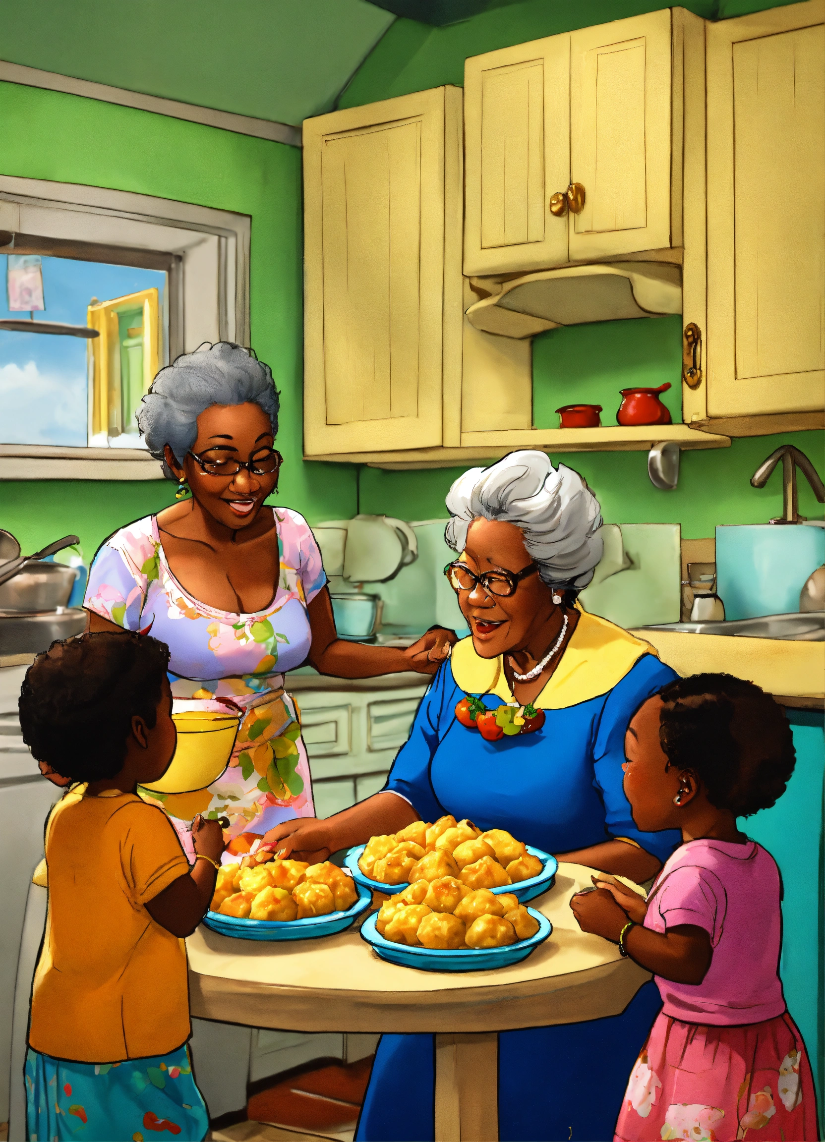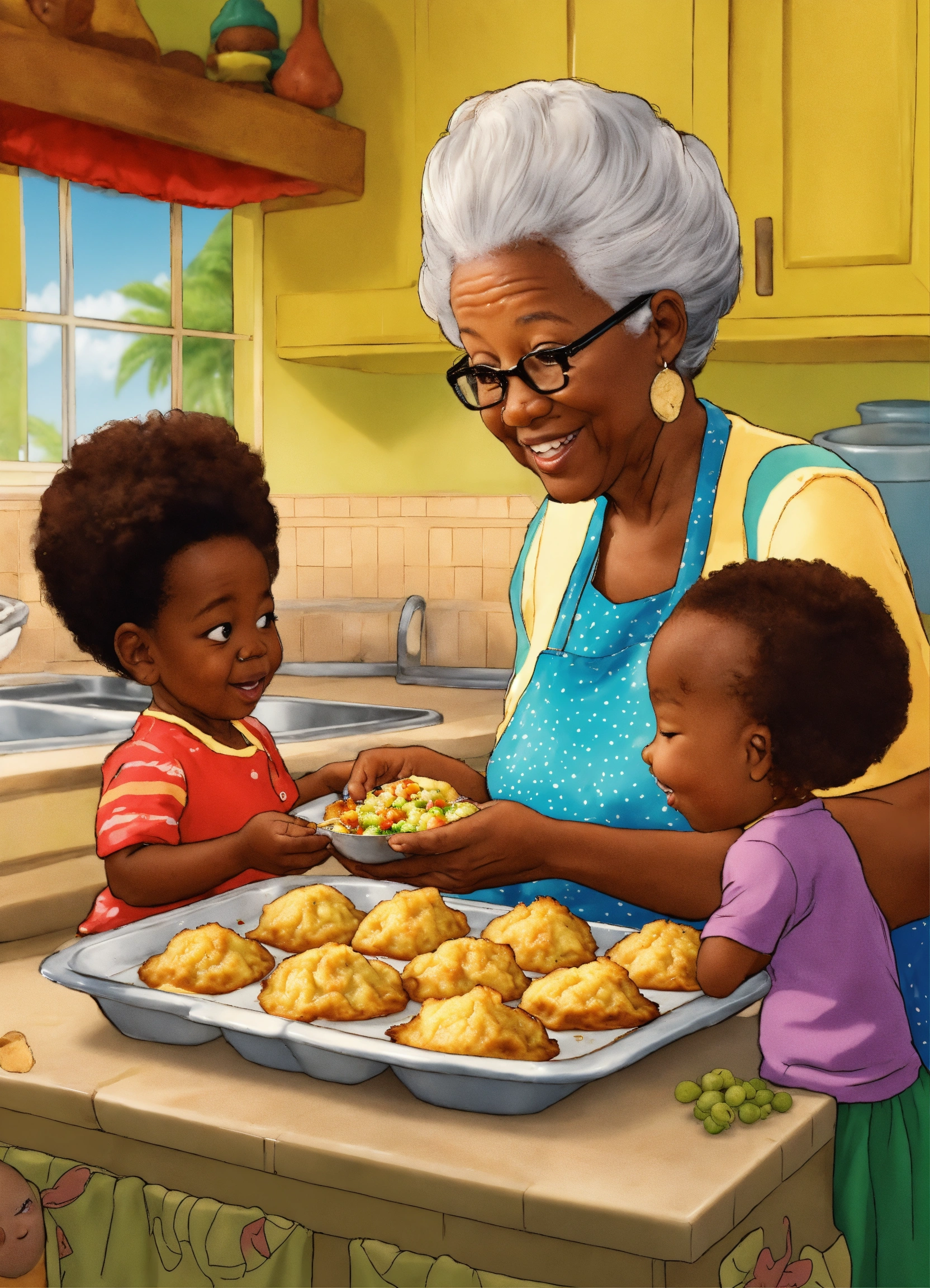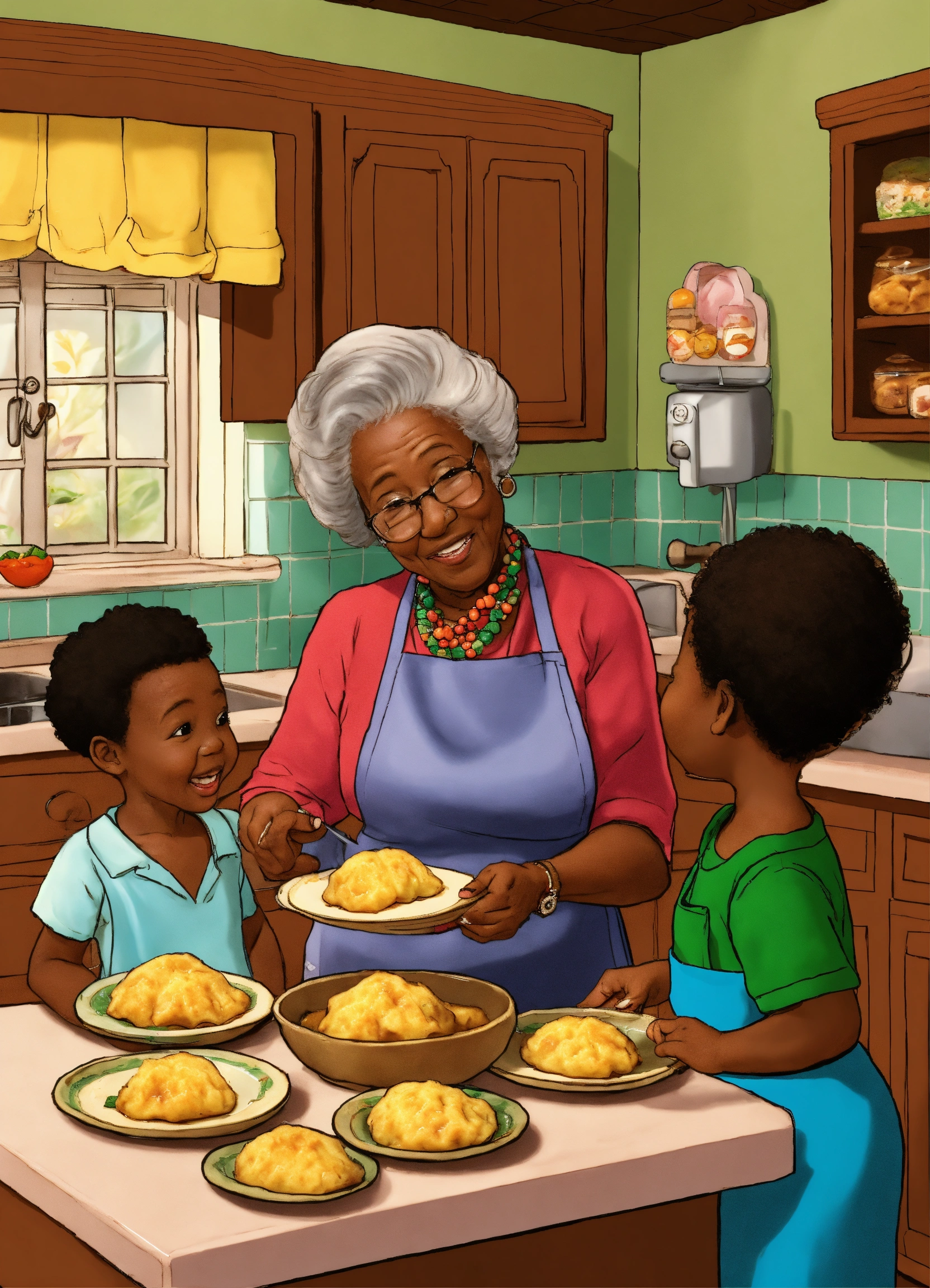 A cartoon of grandma sharing fried dumplings to three caribbean 3-year-old children