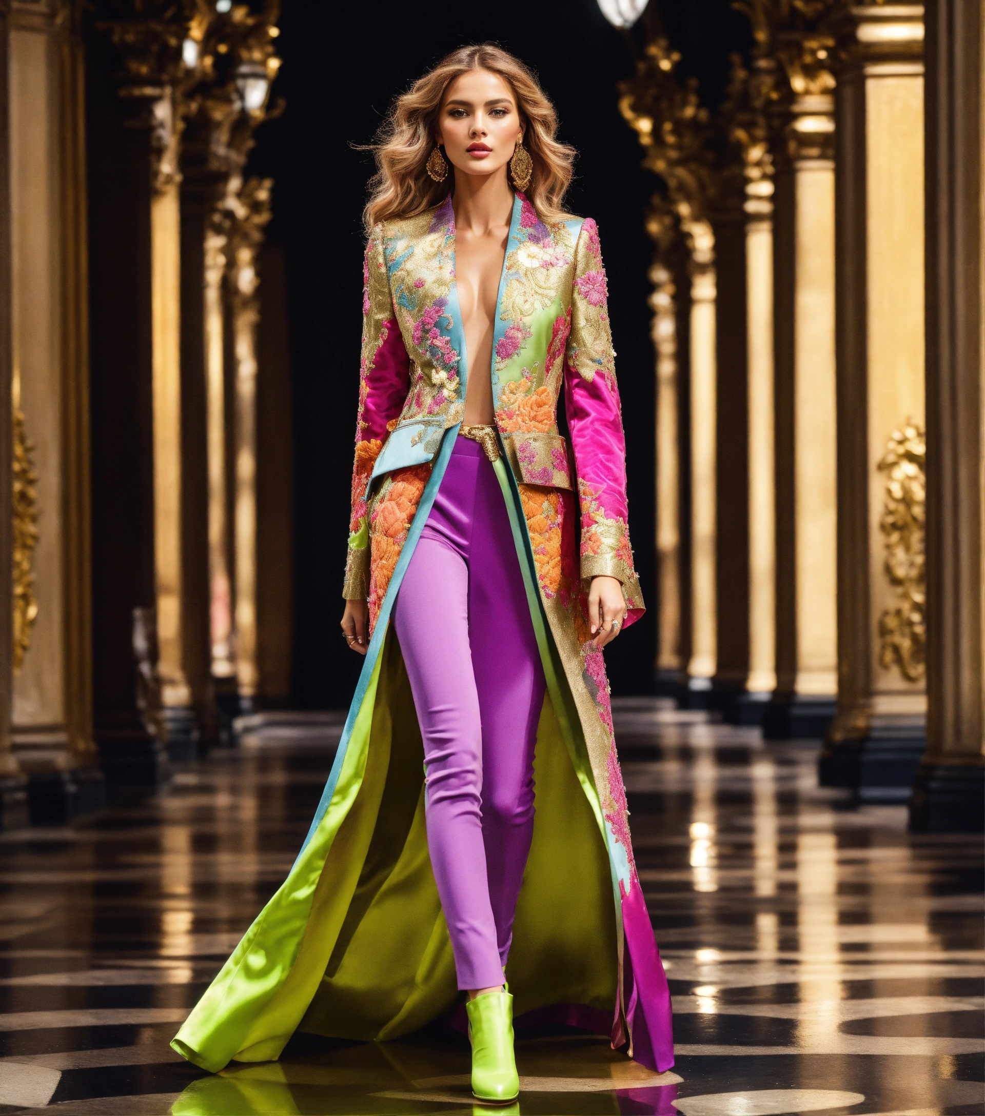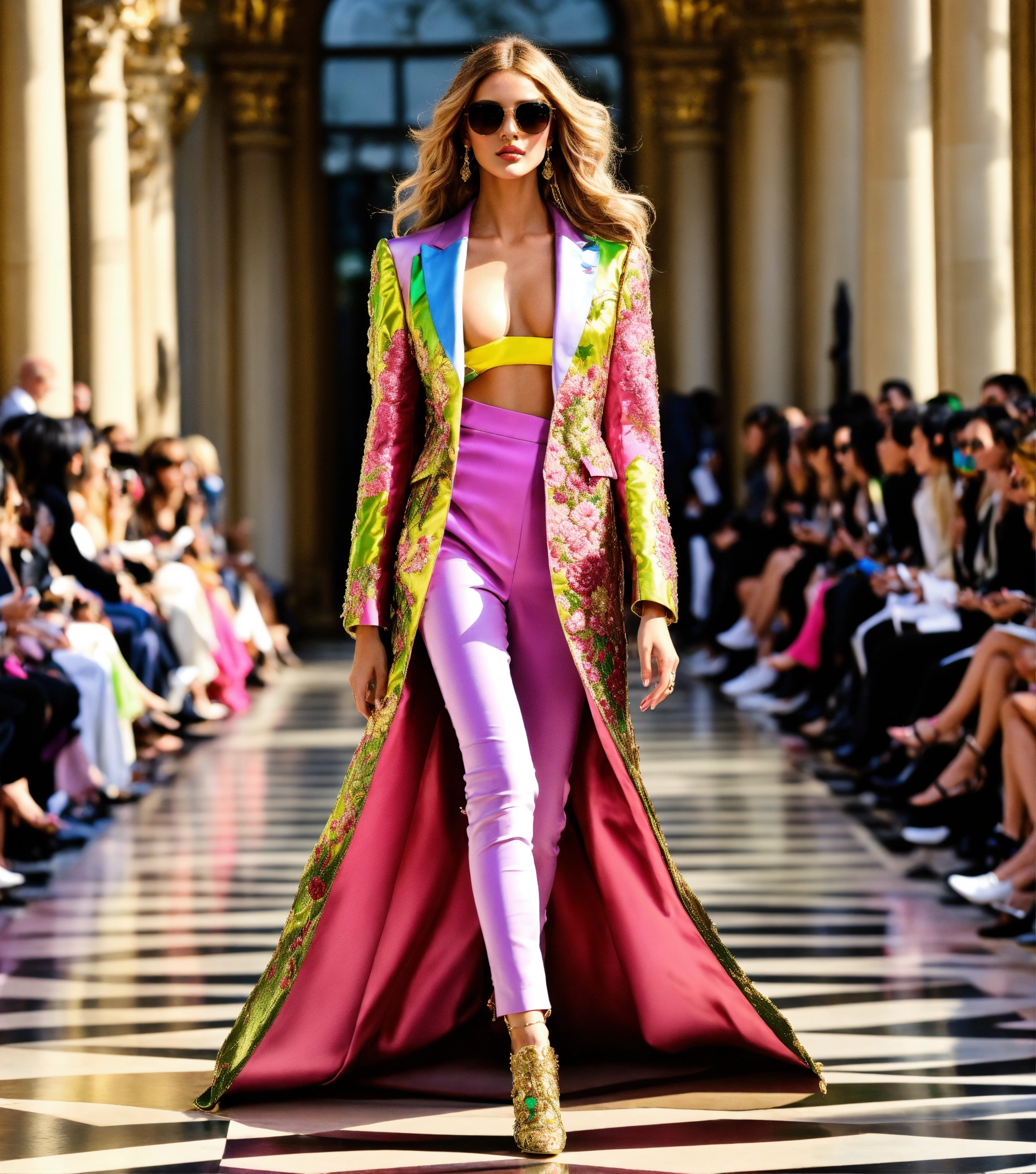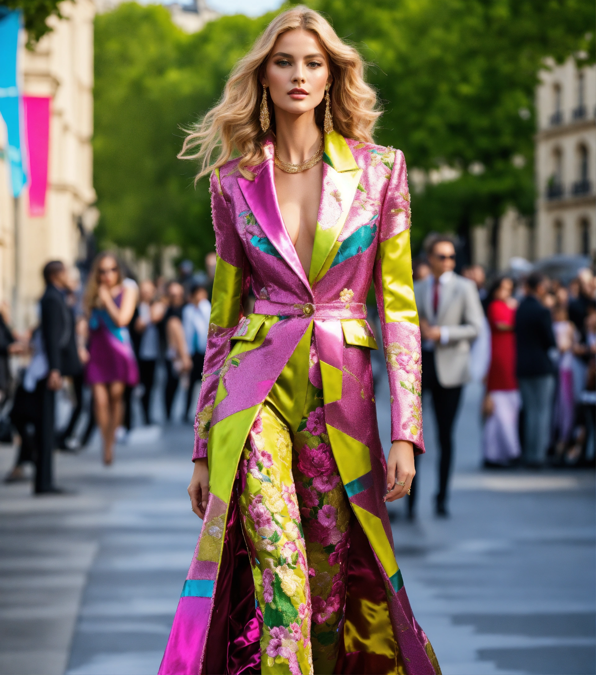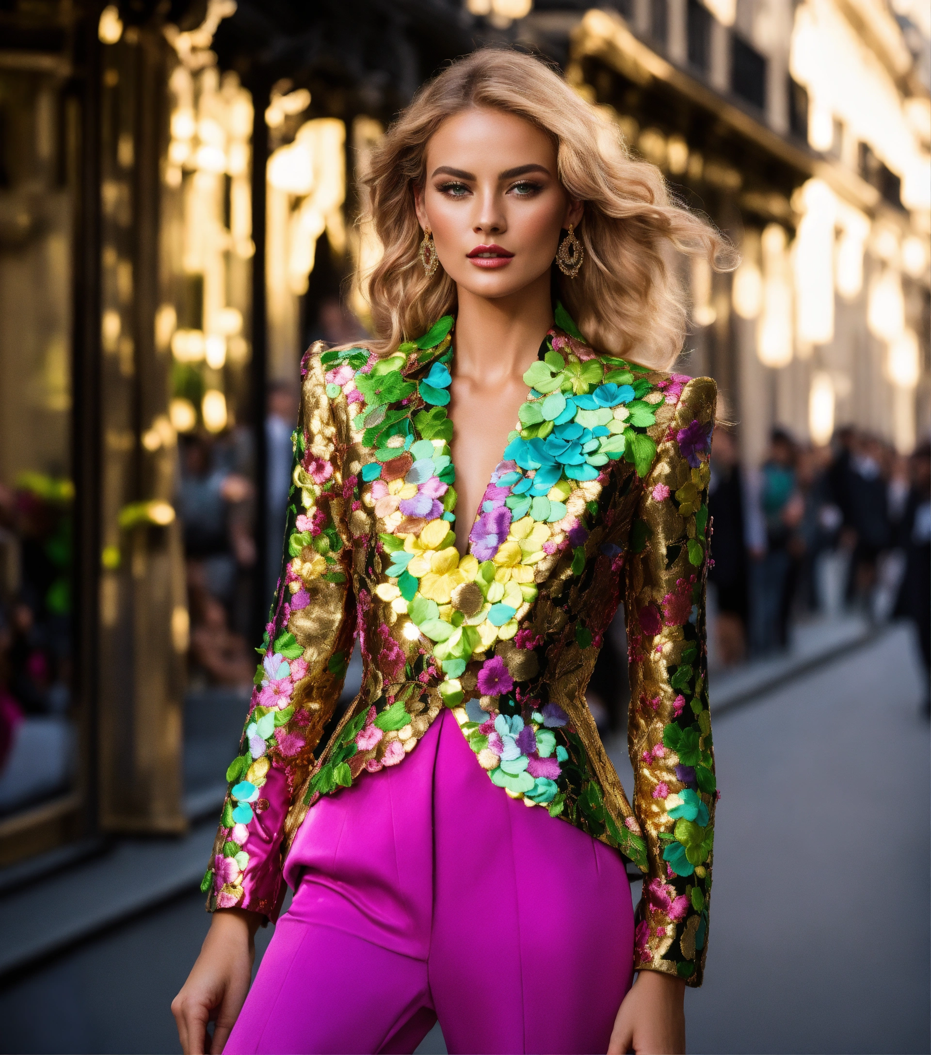 Ultra realistic full body photo of a stylish beautiful elegant german blonde supermodel voluminous wavy hair walking the runway modeling summer street designer wear brave, paris versailles details cutouts and gold geometric pattern floral structured tailored jacket pink gold green lilac peridot silver magenta lime fuchsia yellow blue black gray copper mauve bronze haute couture embroidered contrasting colors vivid intricate bold vibrant glamorous ultimate elegance beautiful luxurious awesome wealthy opulent exquisite resplendent metallic sheen magnificent sublime 12k