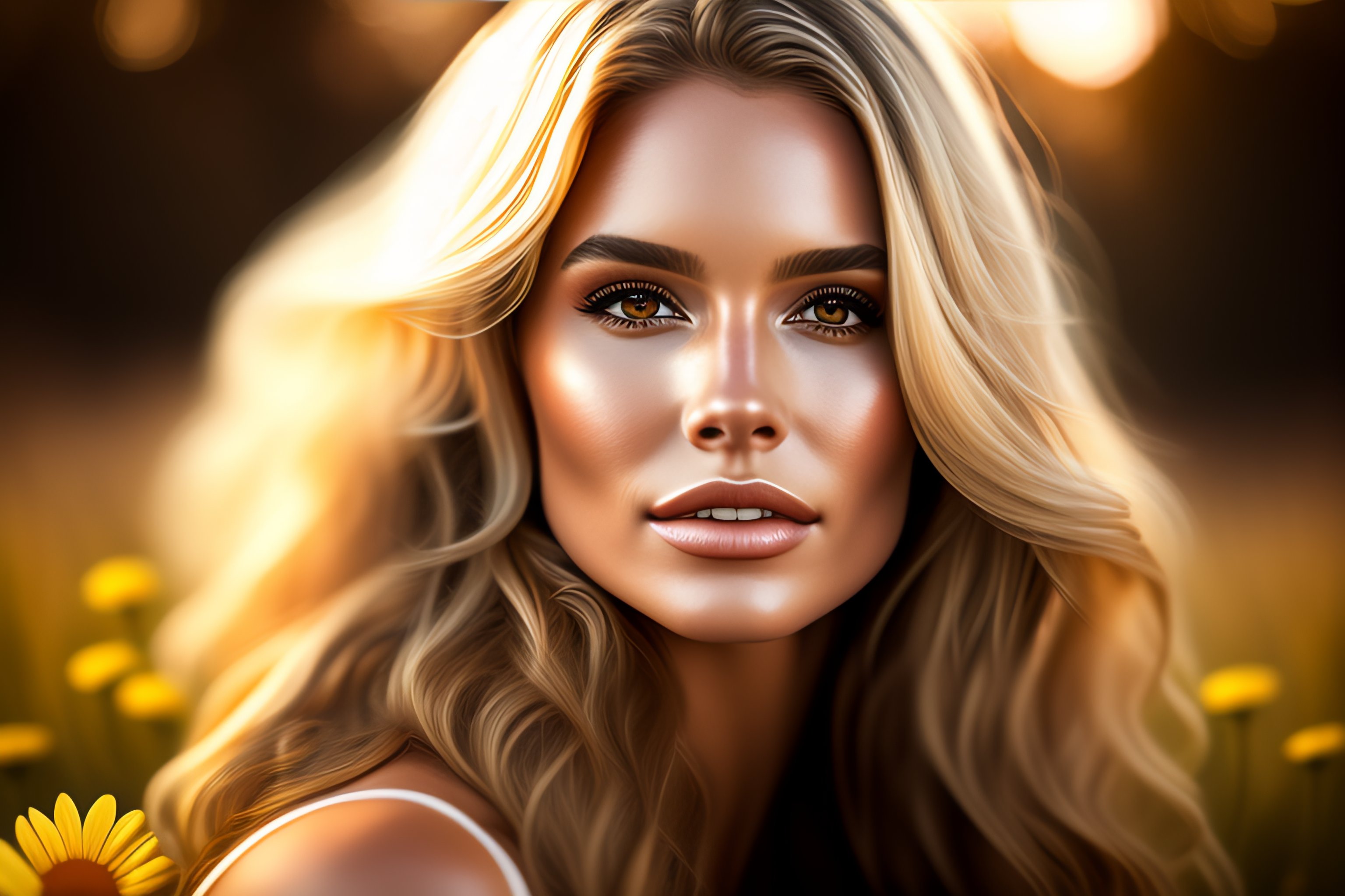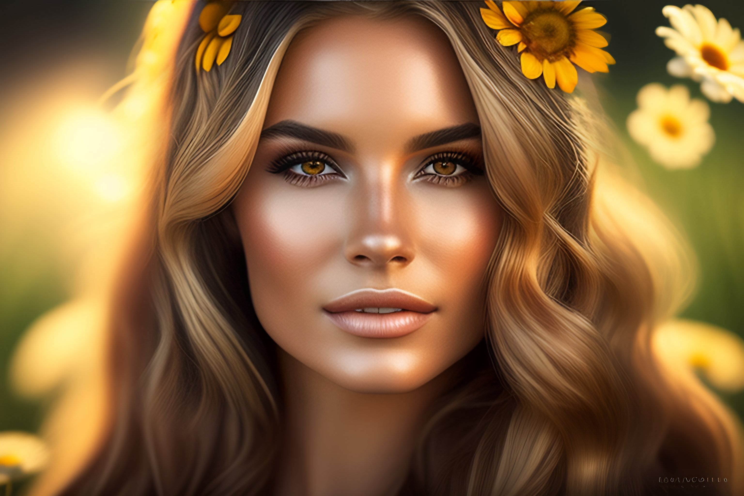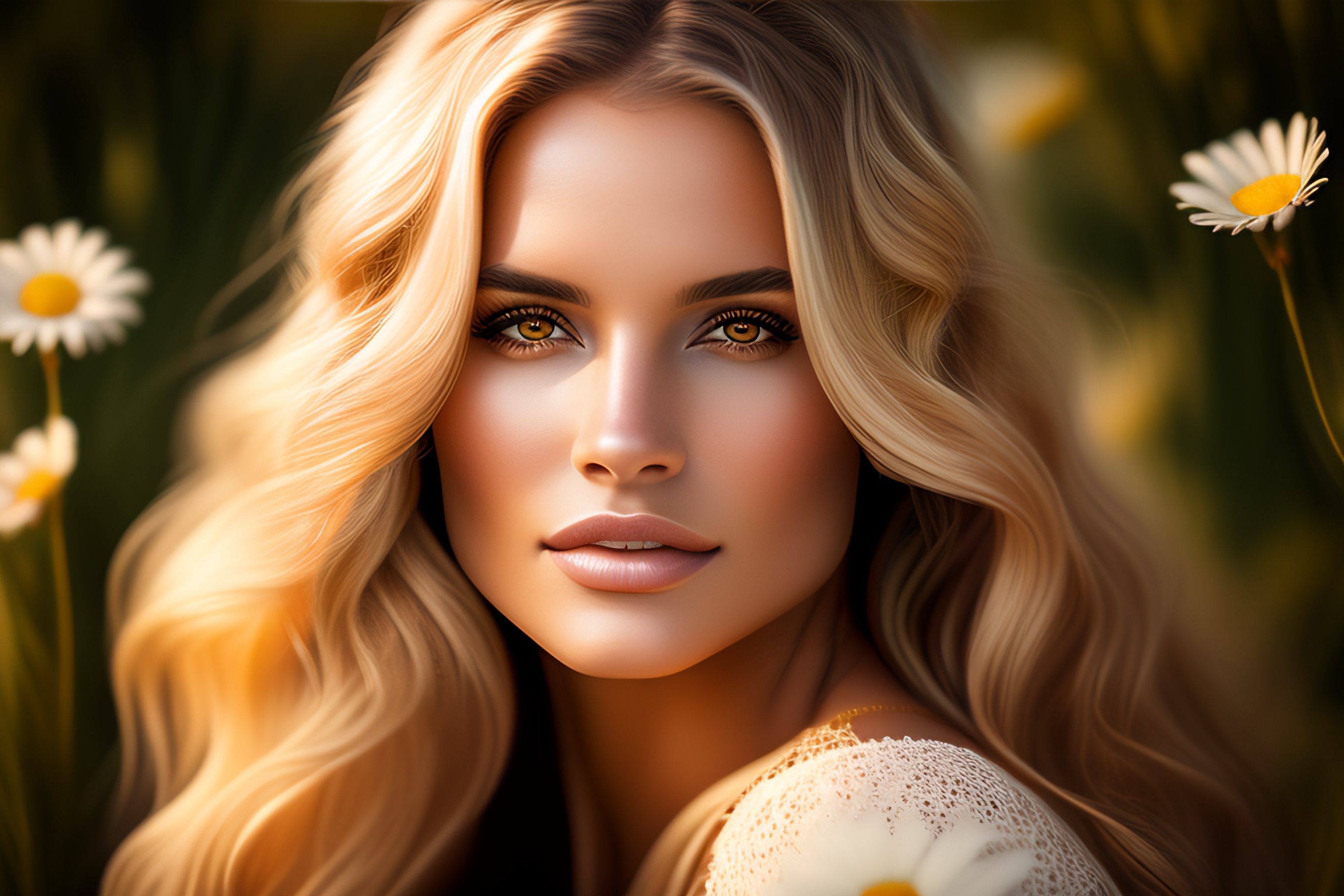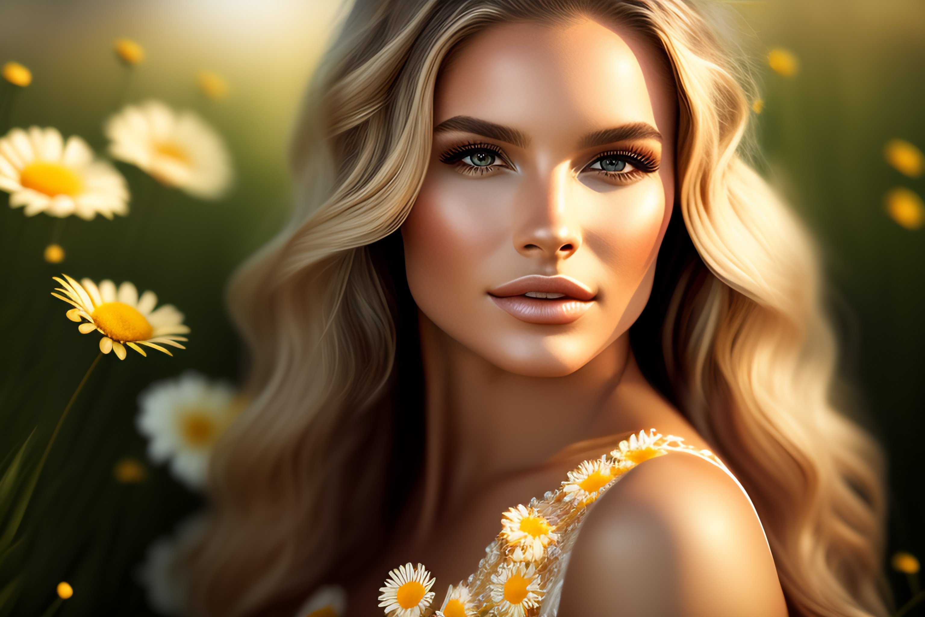 Photorealistic beautiful woman, full body, highly detailed, long wavy, blond hair with daisy flowers, big brown eyes, bokeh background, portrait --ar 9:16 --testp