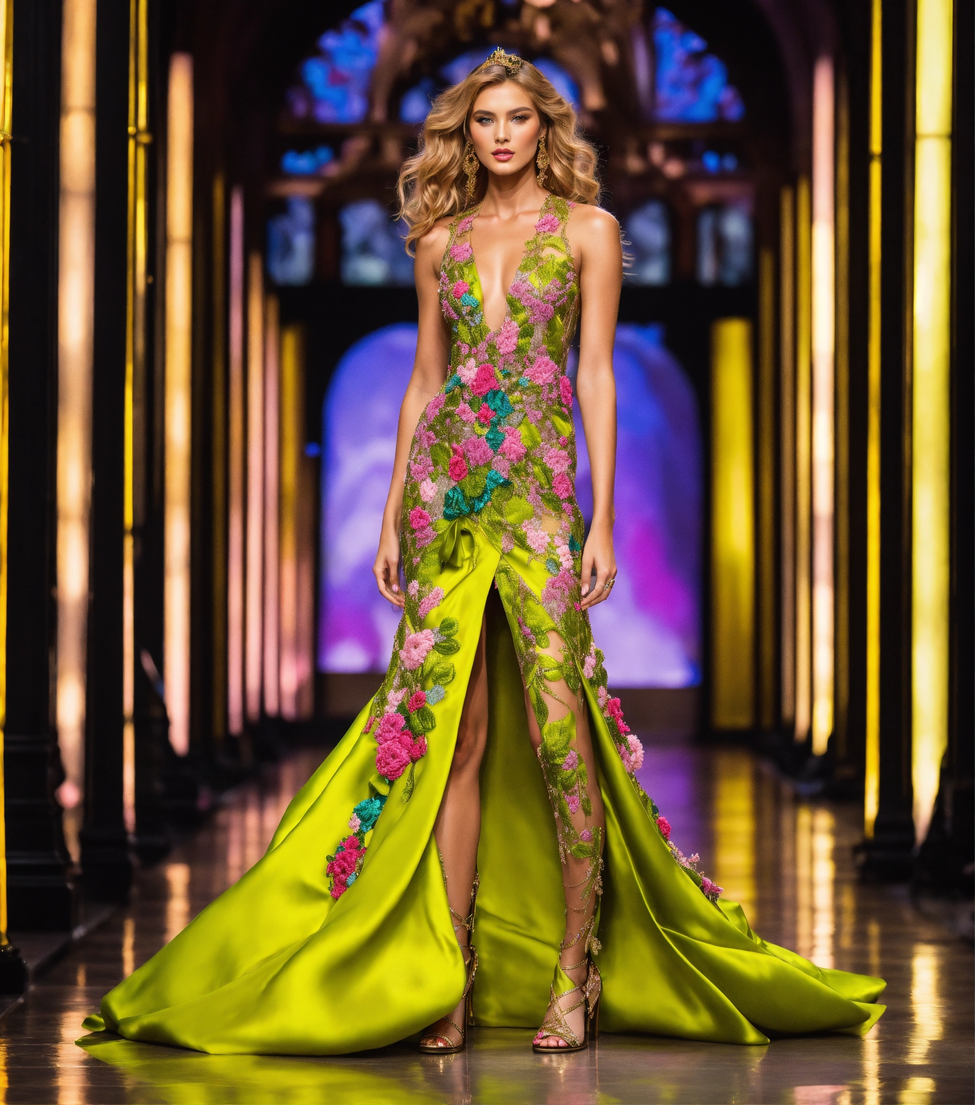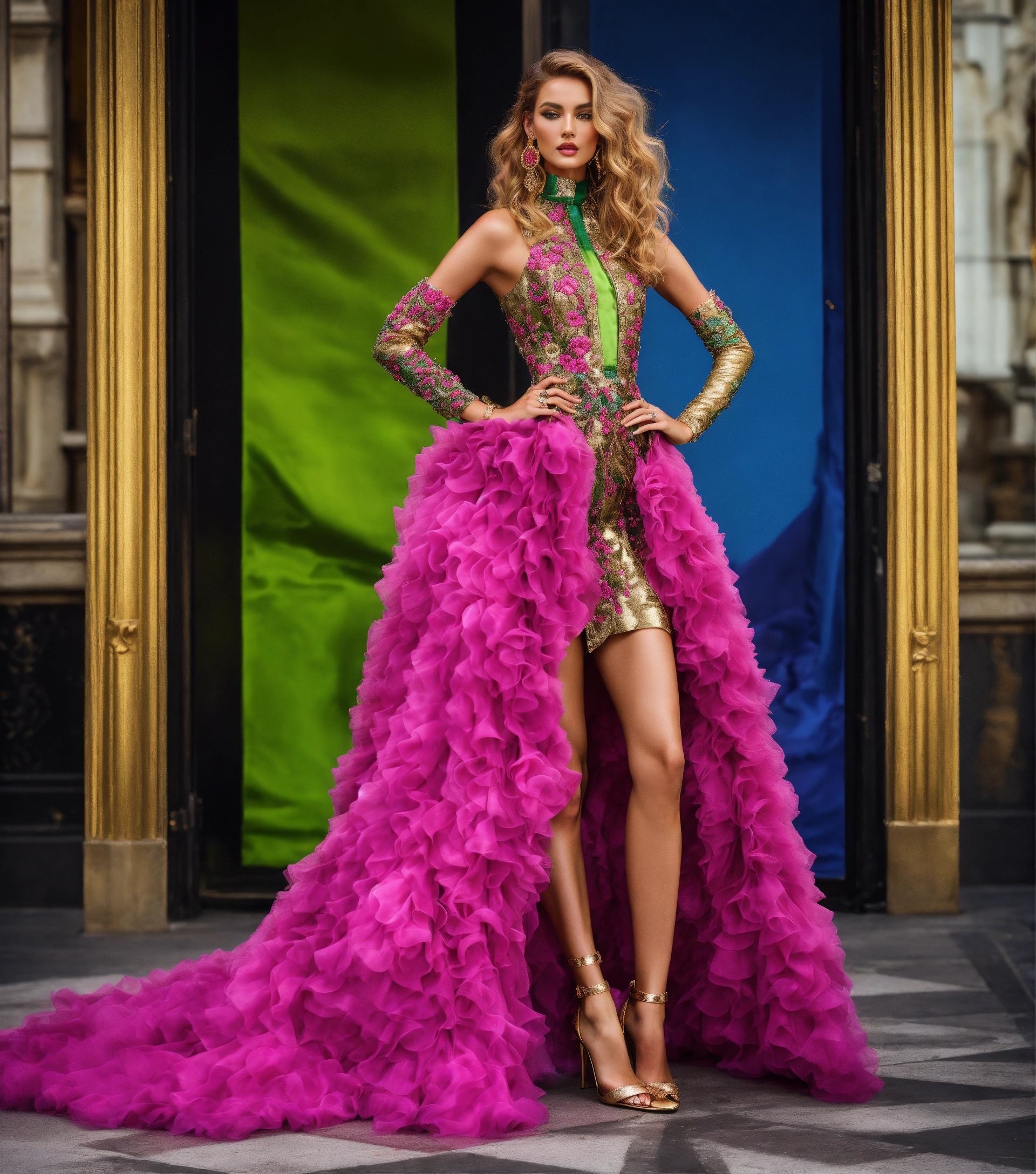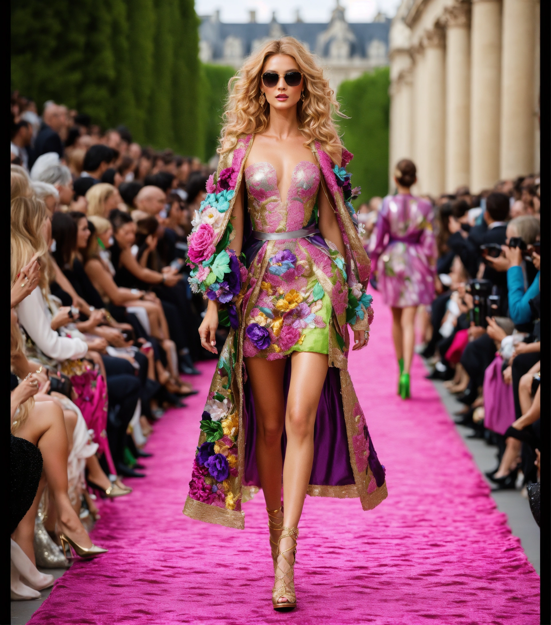 Ultra realistic full body photo of a stylish beautiful elegant german blonde supermodel voluminous wavy hair walking the runway modeling summer street designer wear brave, paris versailles details cutouts and gold geometric pattern floral avant garde pink gold green lilac peridot silver magenta lime fuchsia yellow blue black gray copper mauve bronze haute couture embroidered contrasting colors vivid intricate bold vibrant glamorous ultimate elegance diva goddess beautiful luxurious awesome wealthy opulent exquisite resplendent metallic sheen magnificent sublime 12k
