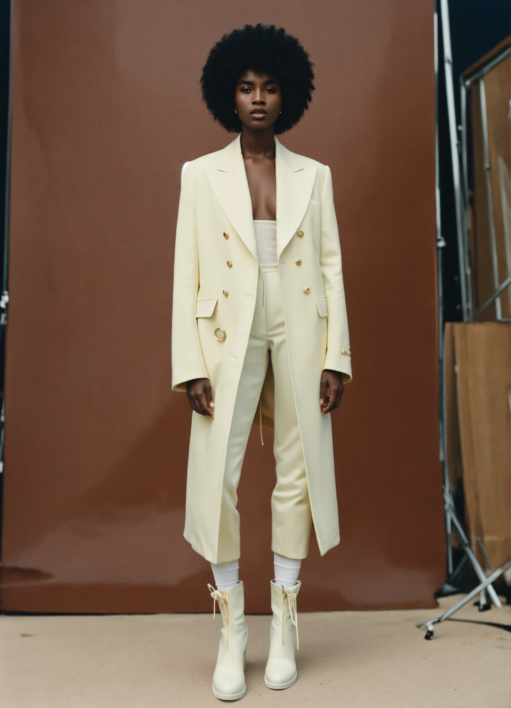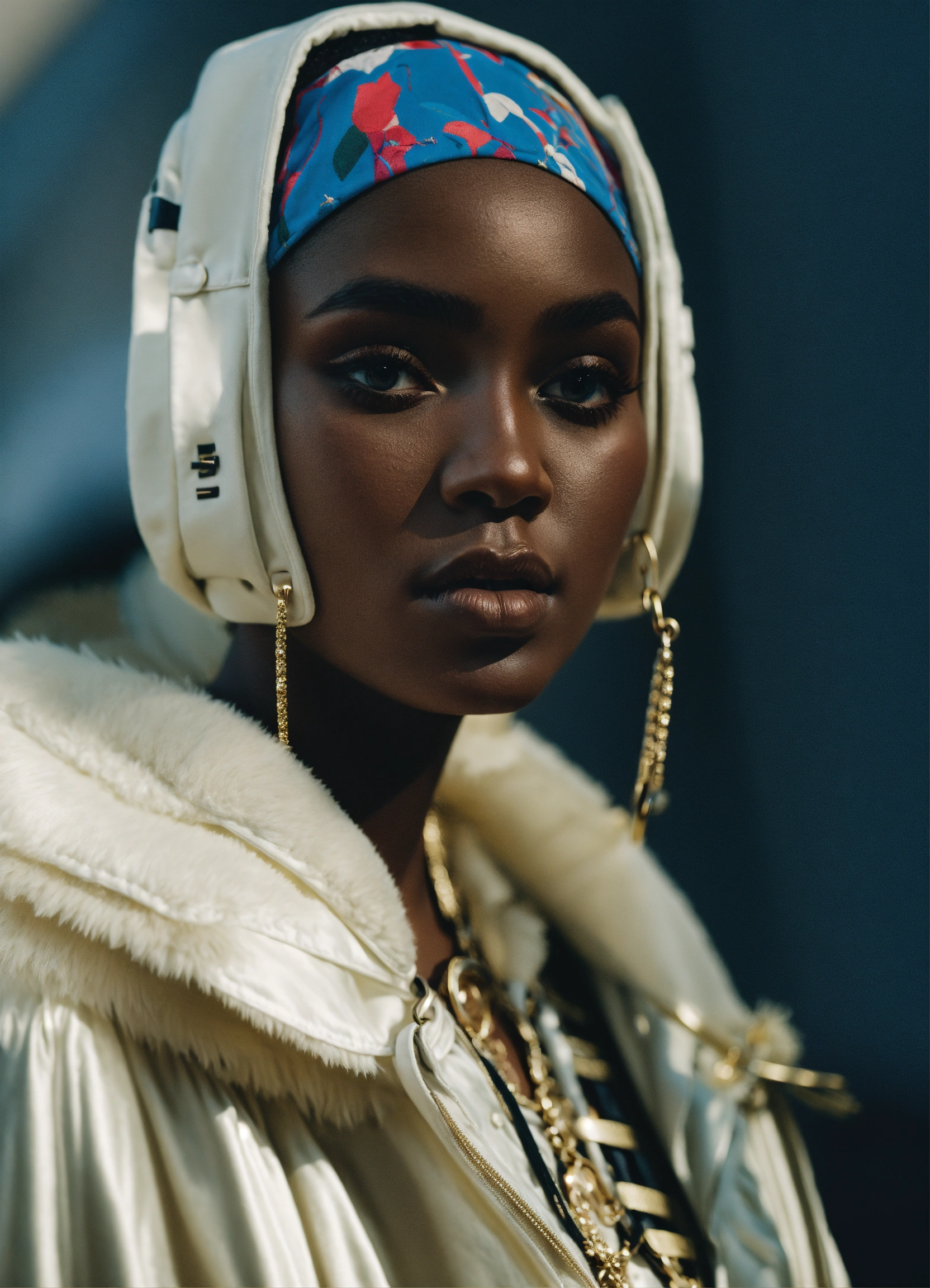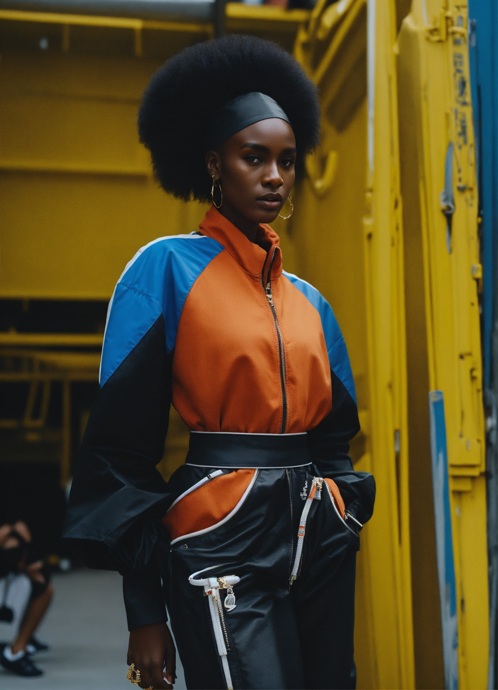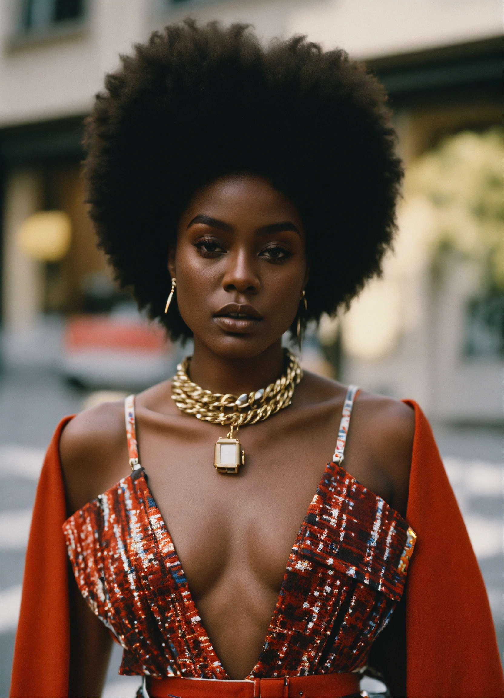 Black woman, size 12, 8k resolution, hyper realistic, day, 35mm film, editorial, high fashion, 2023, off white by virgil abloh