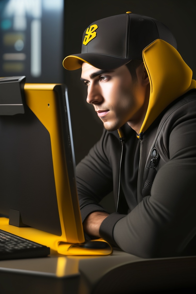 A young man facing the camera, sitting down with multiple computers, wearing baseball black cap, cover eyes, yellow designer clothes, content creator, very very dark cinematic black background, two computers, hold phone in hand, cinematic colour, create a realistic 3d in the style of disney pixar character --ar 2:3