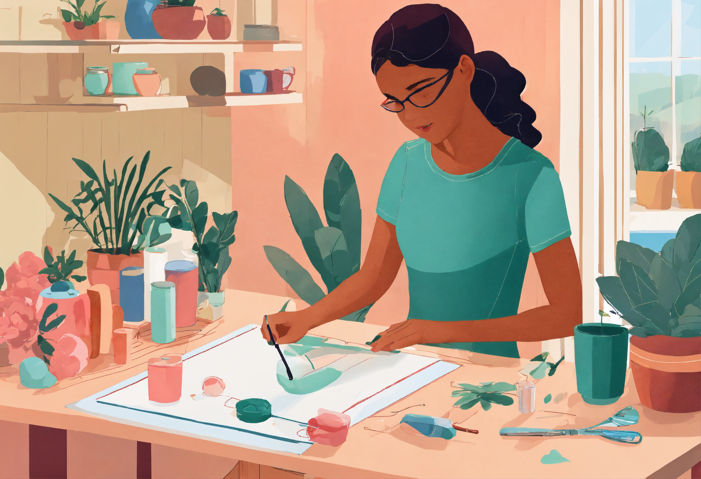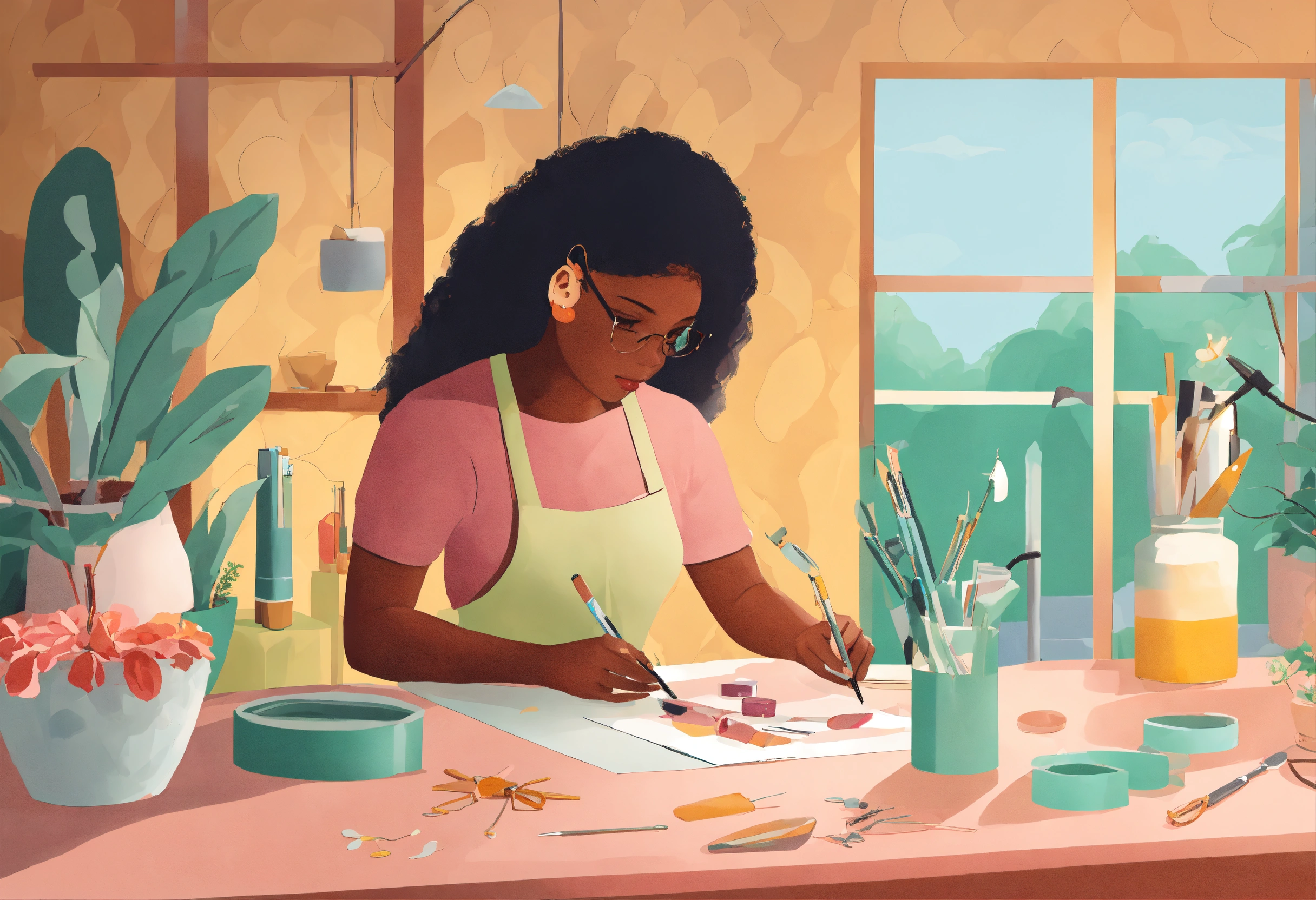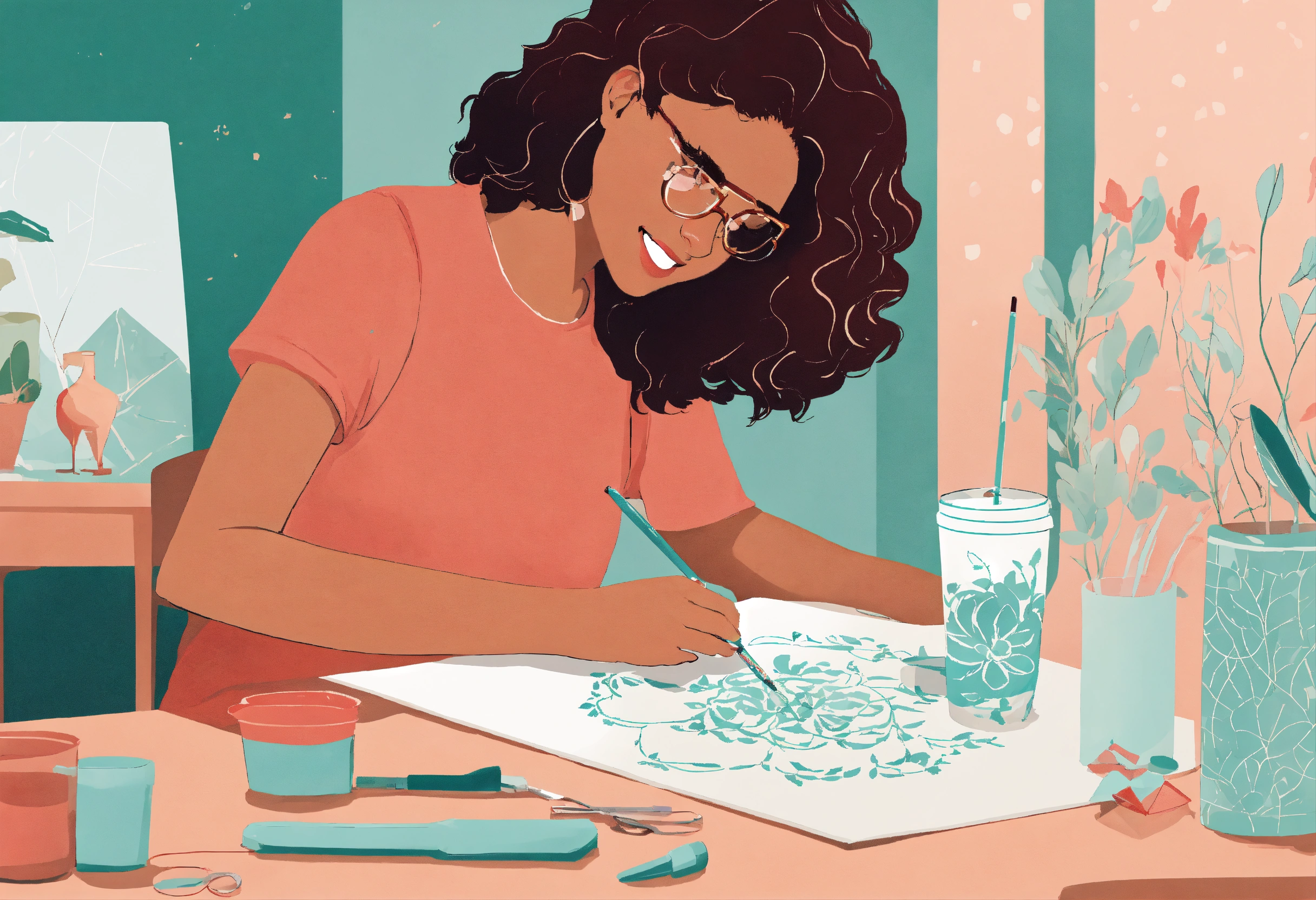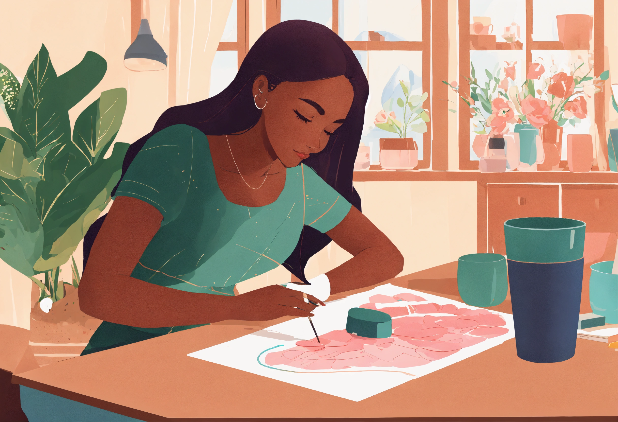 Illustration of a young woman crafting with her cricut and tumblers on the table in front of her\