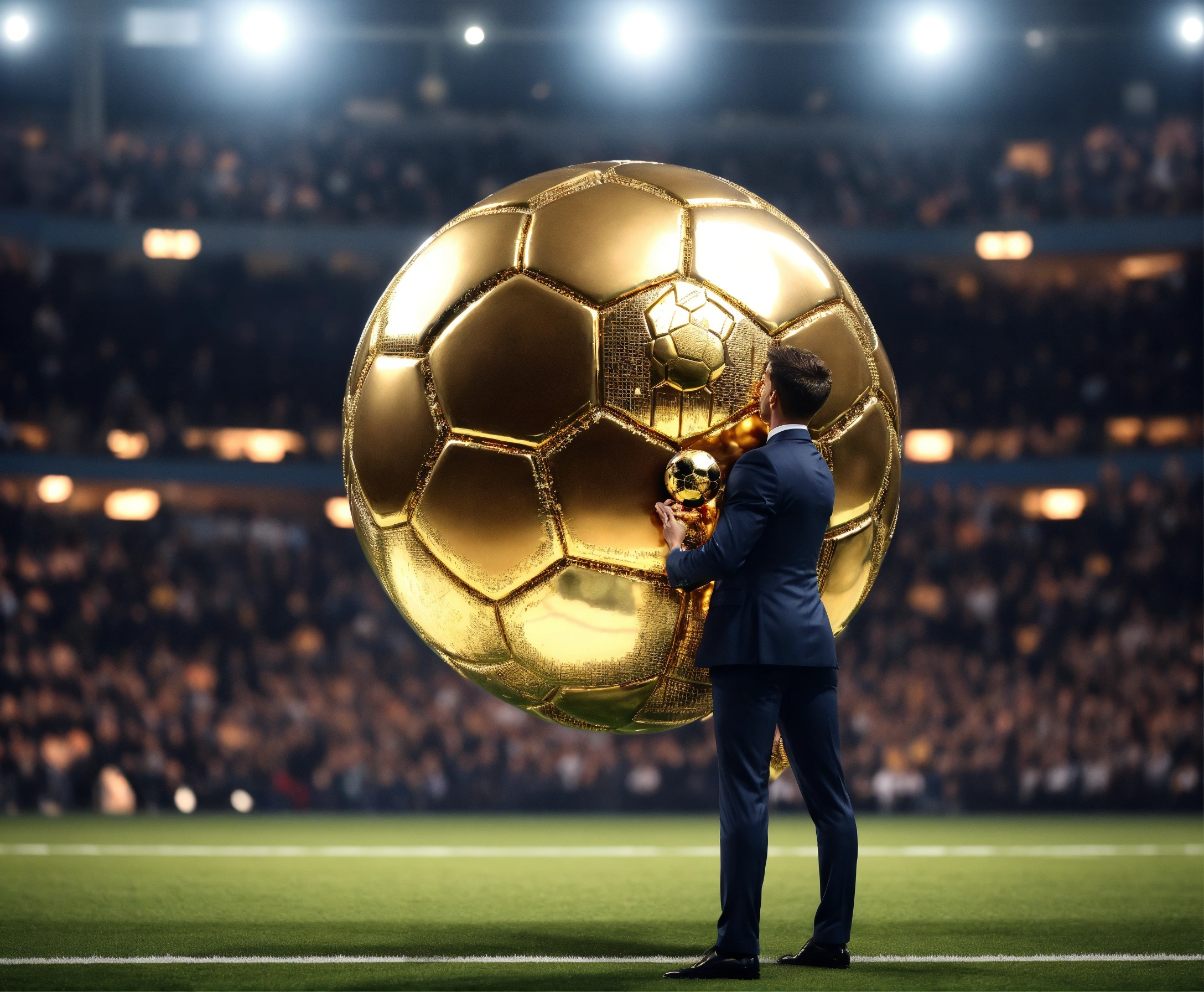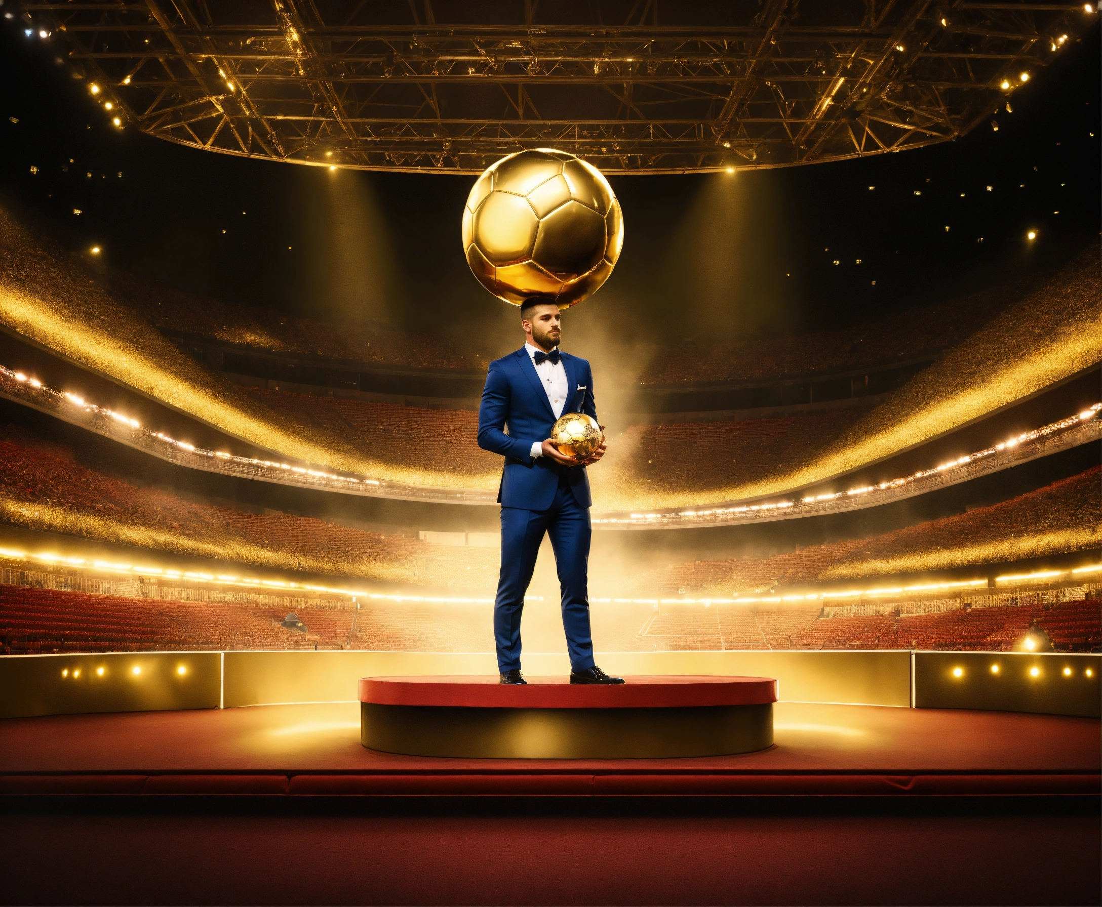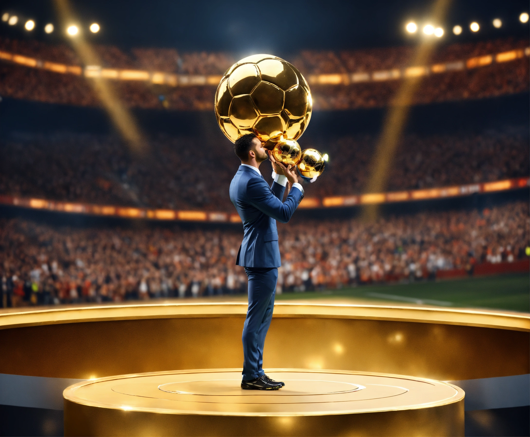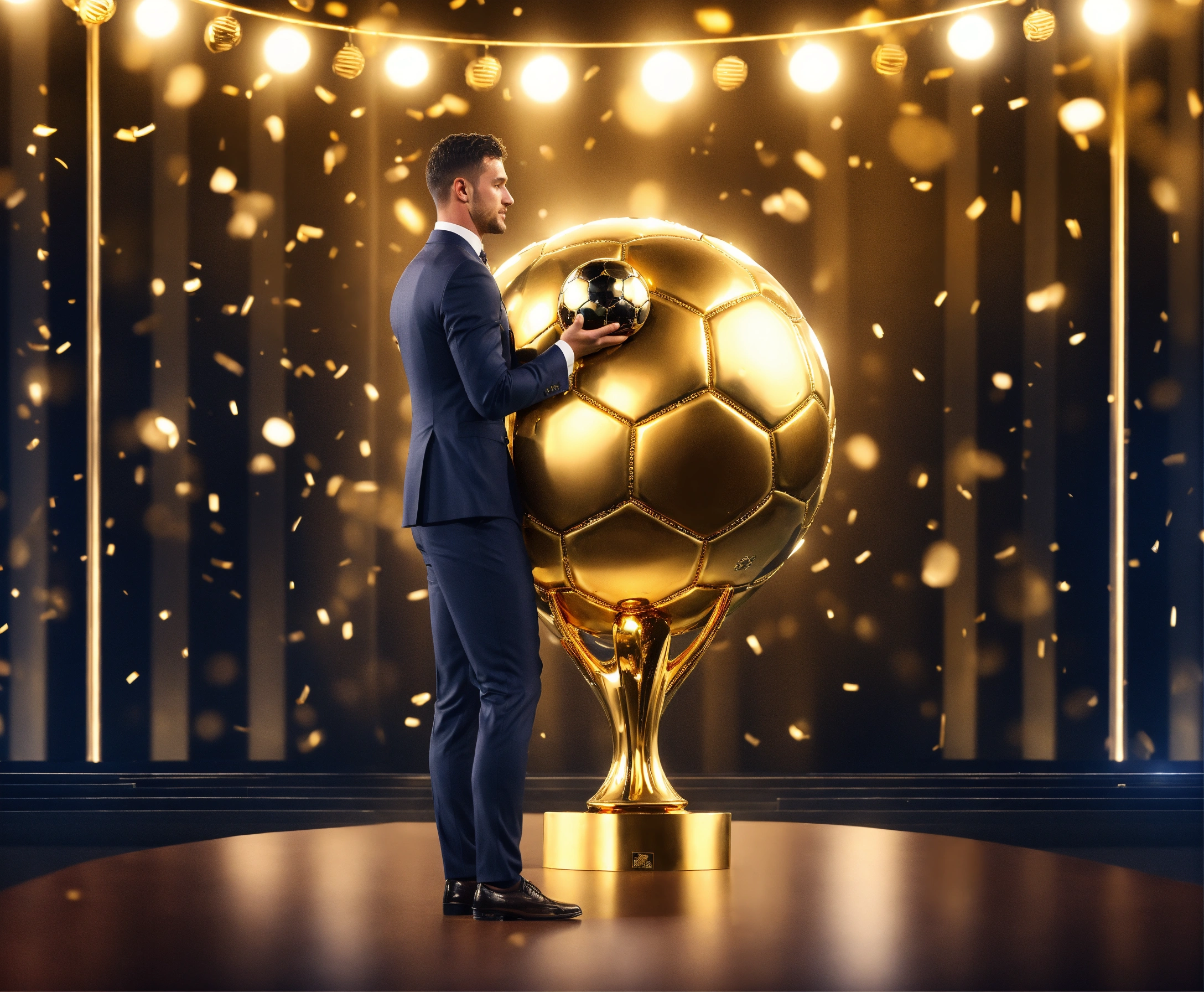 Awarding the golden ball to the best football player, on stage, half of the body is visible, a cute man in a suit