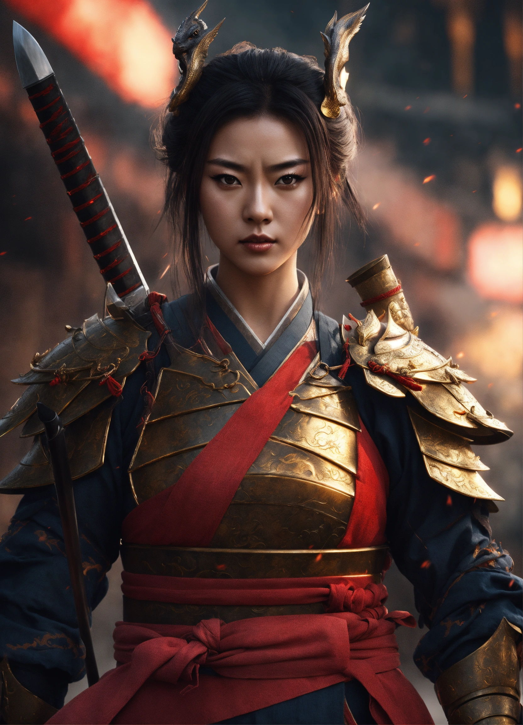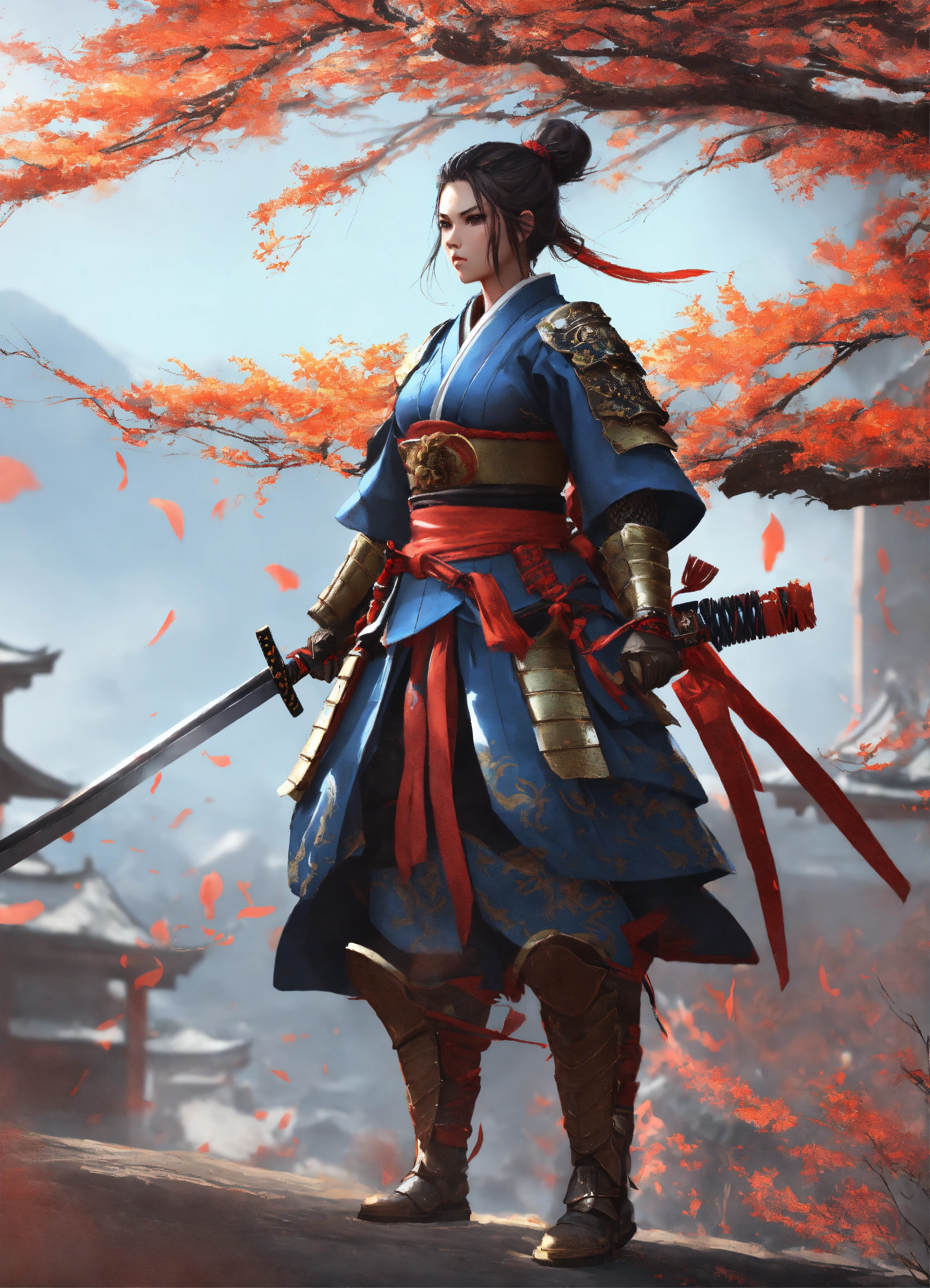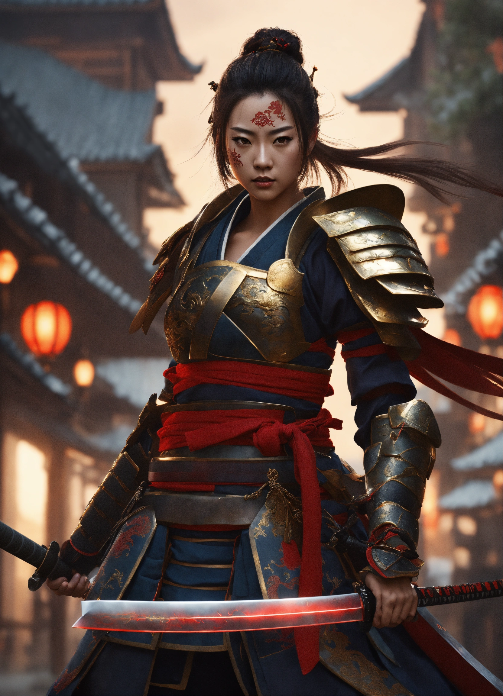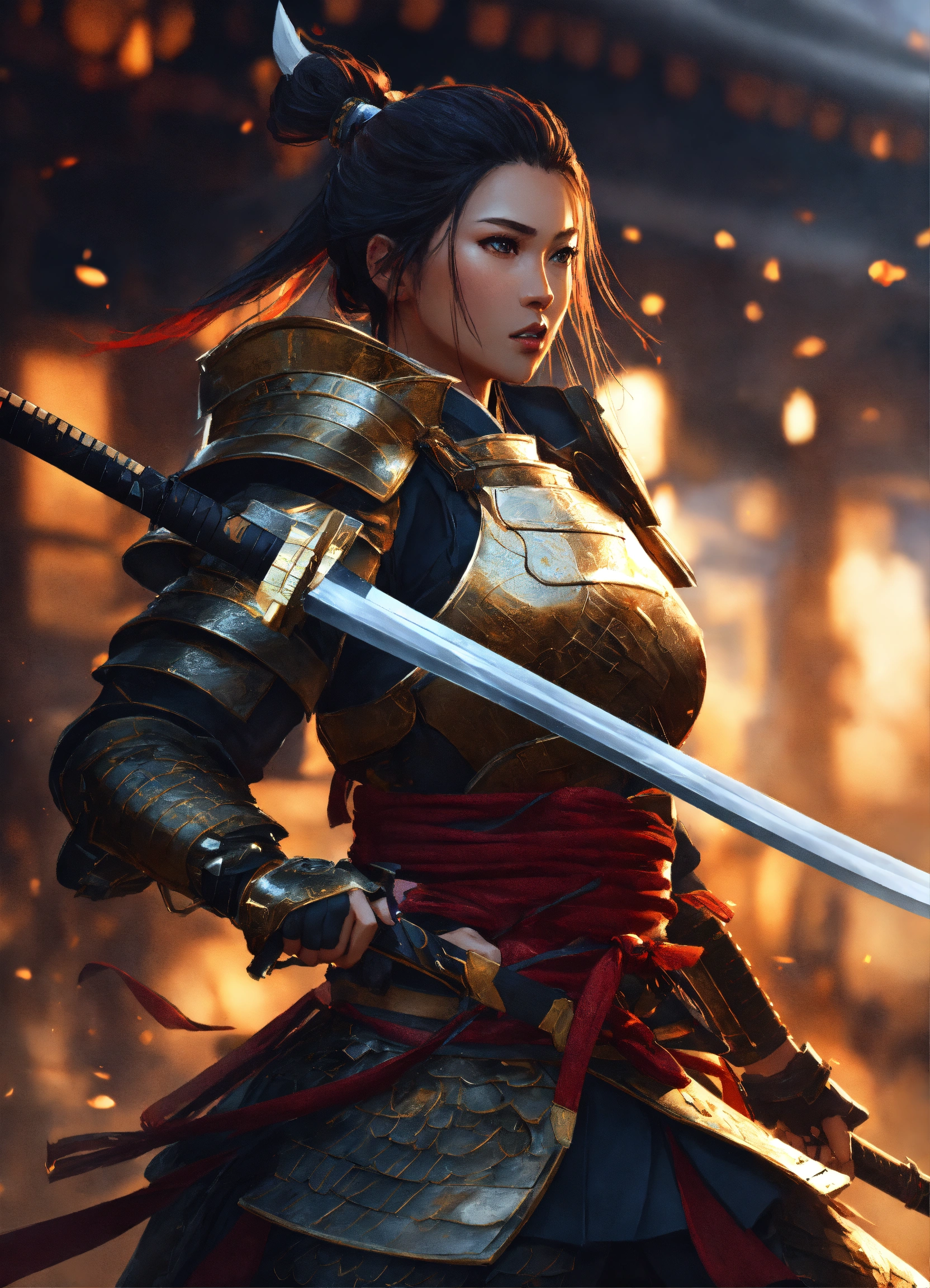 Female samurai dragon warrior, amazing armour, detailed, katana, looking badass, digital art, style of wlop, full scene, action scene