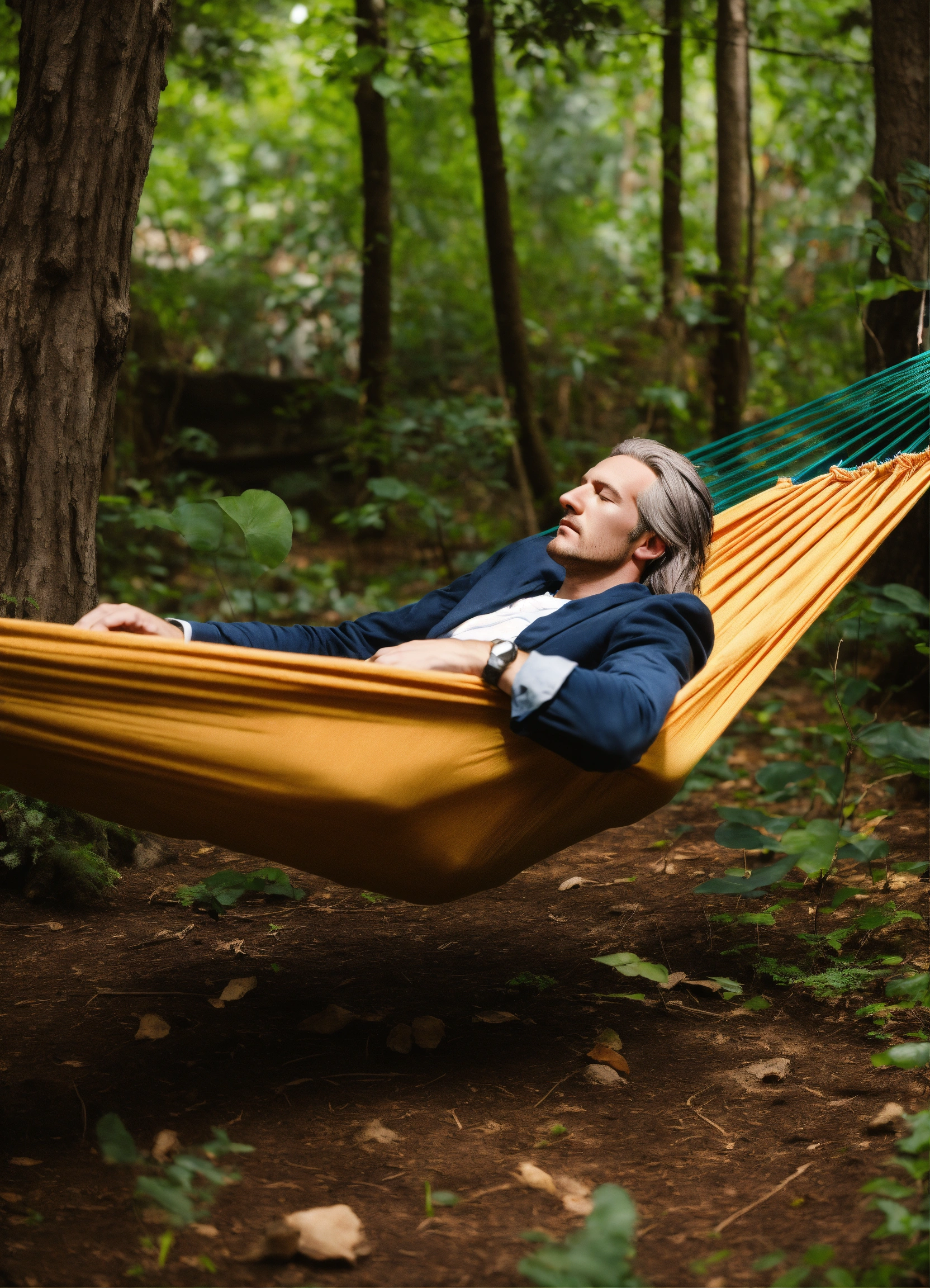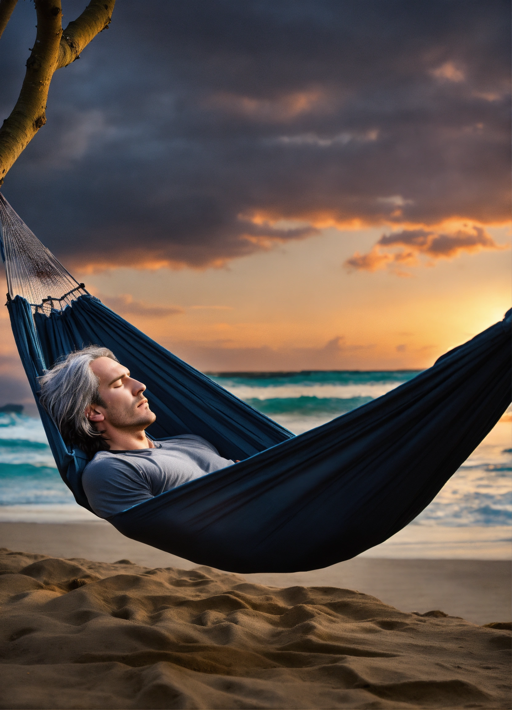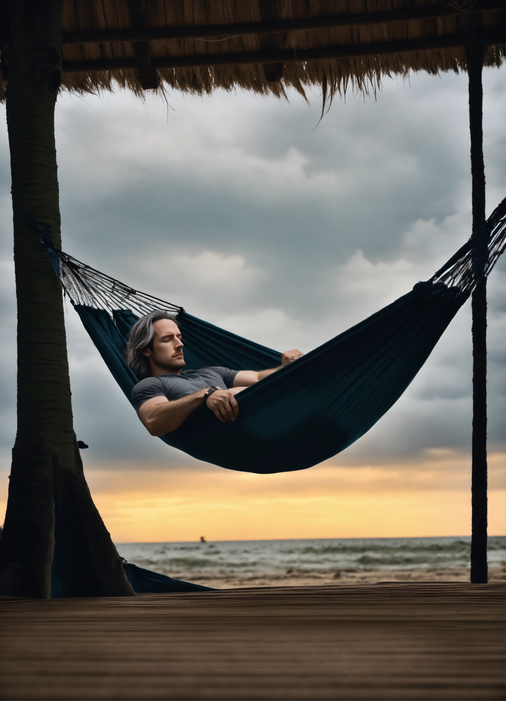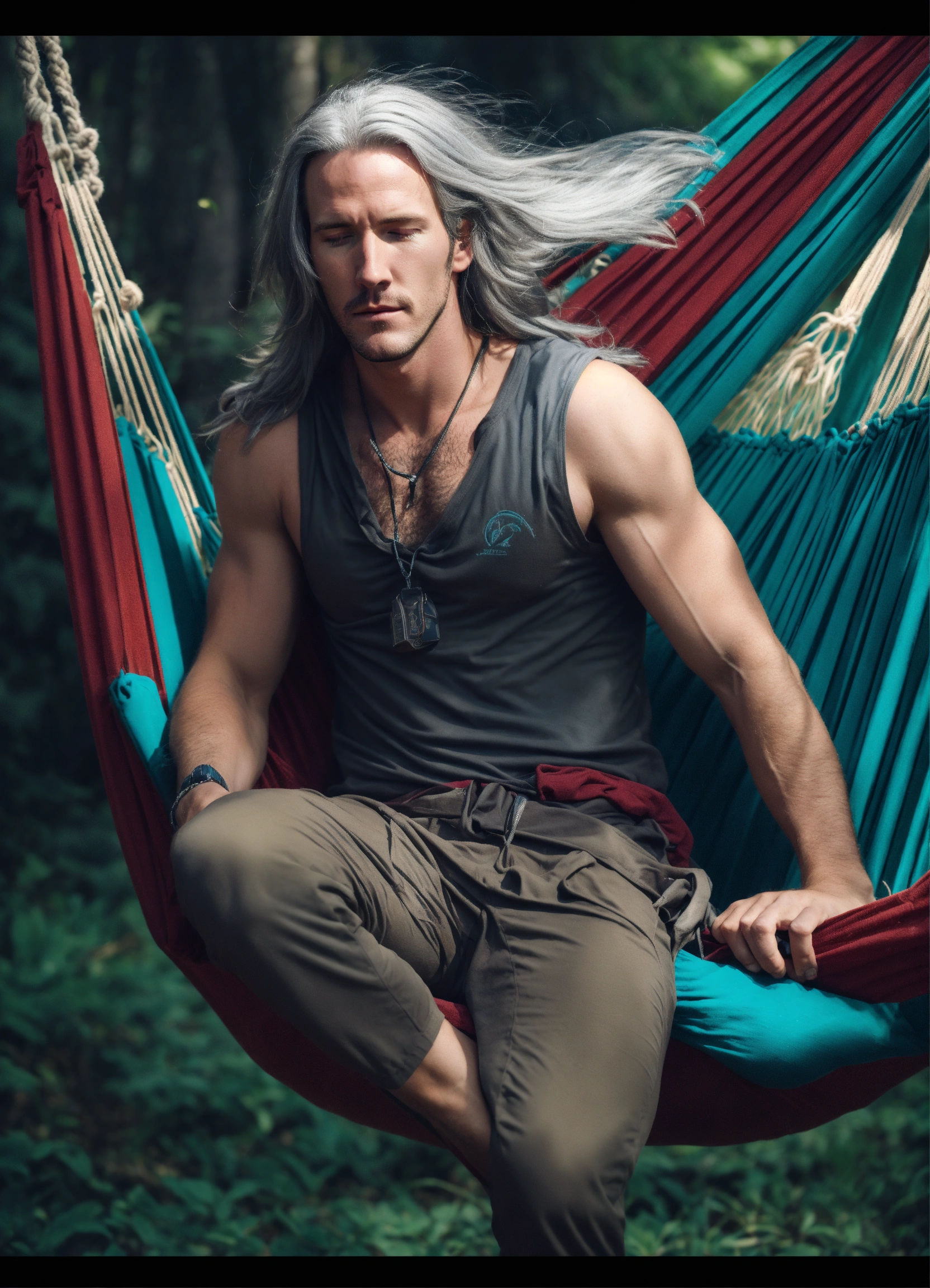 In photographic style matt mercer as a tall long distance runner with long straight gray hair asleep in a hammock
