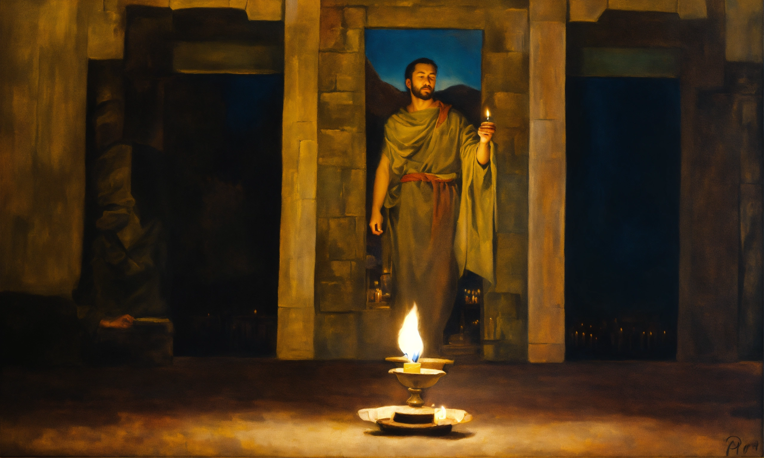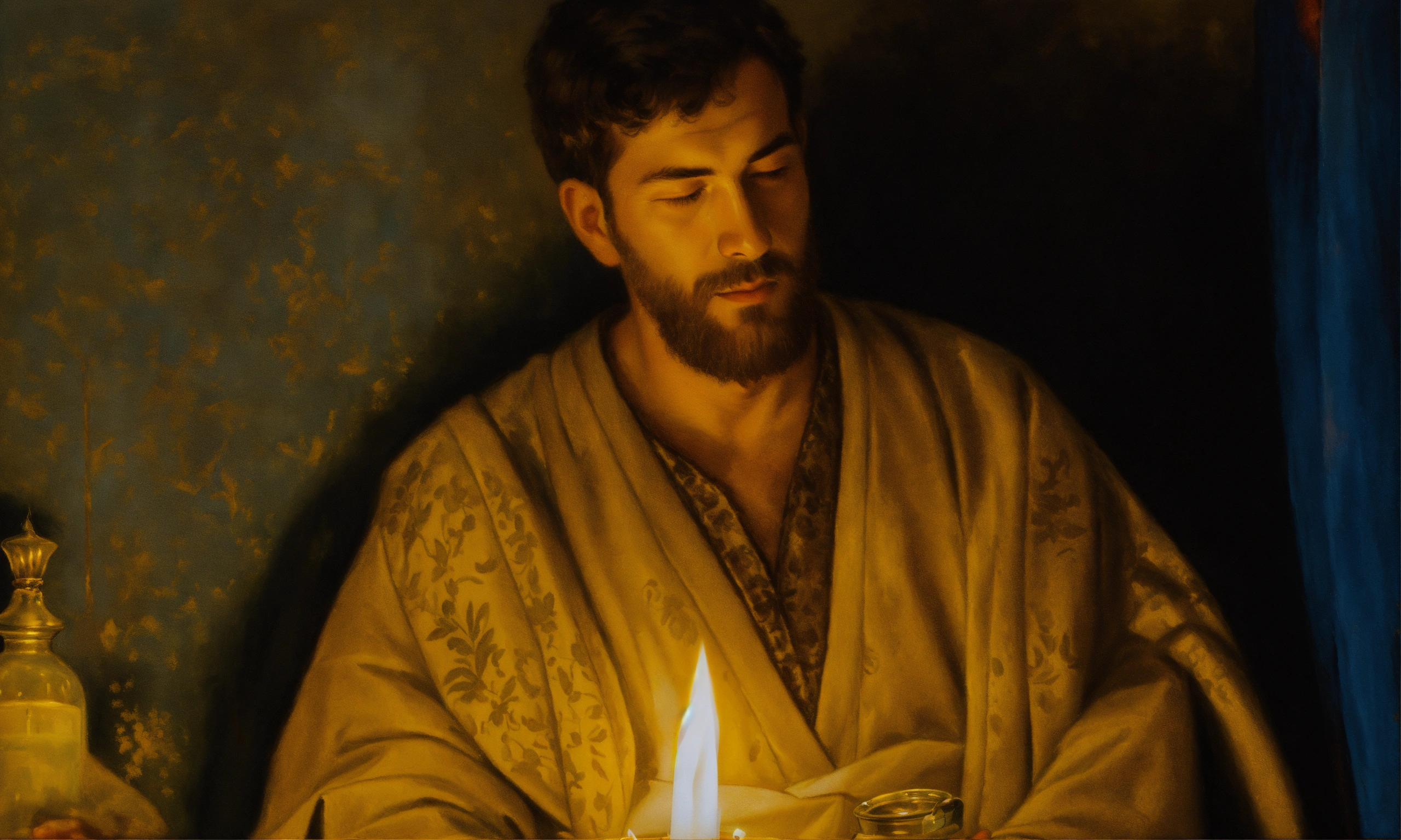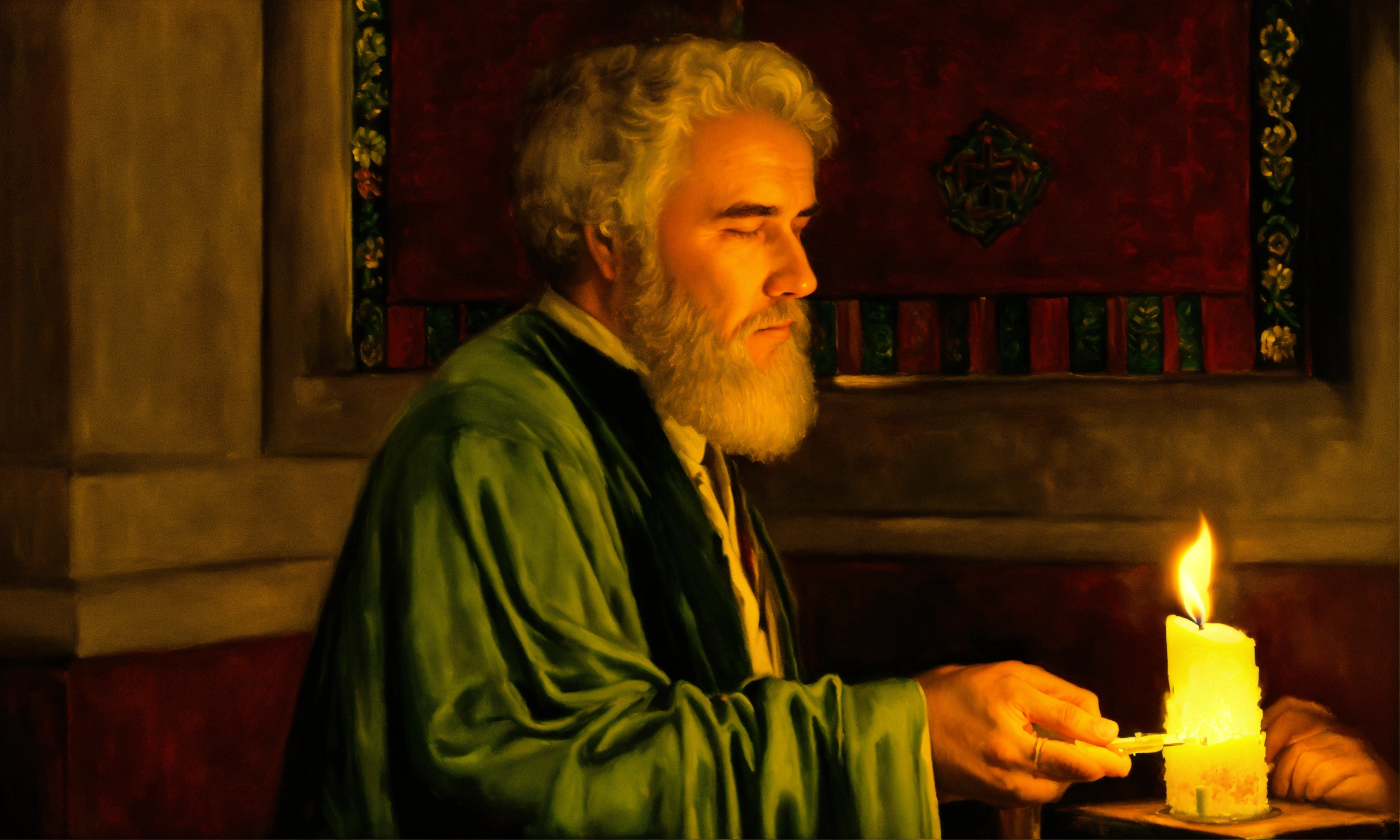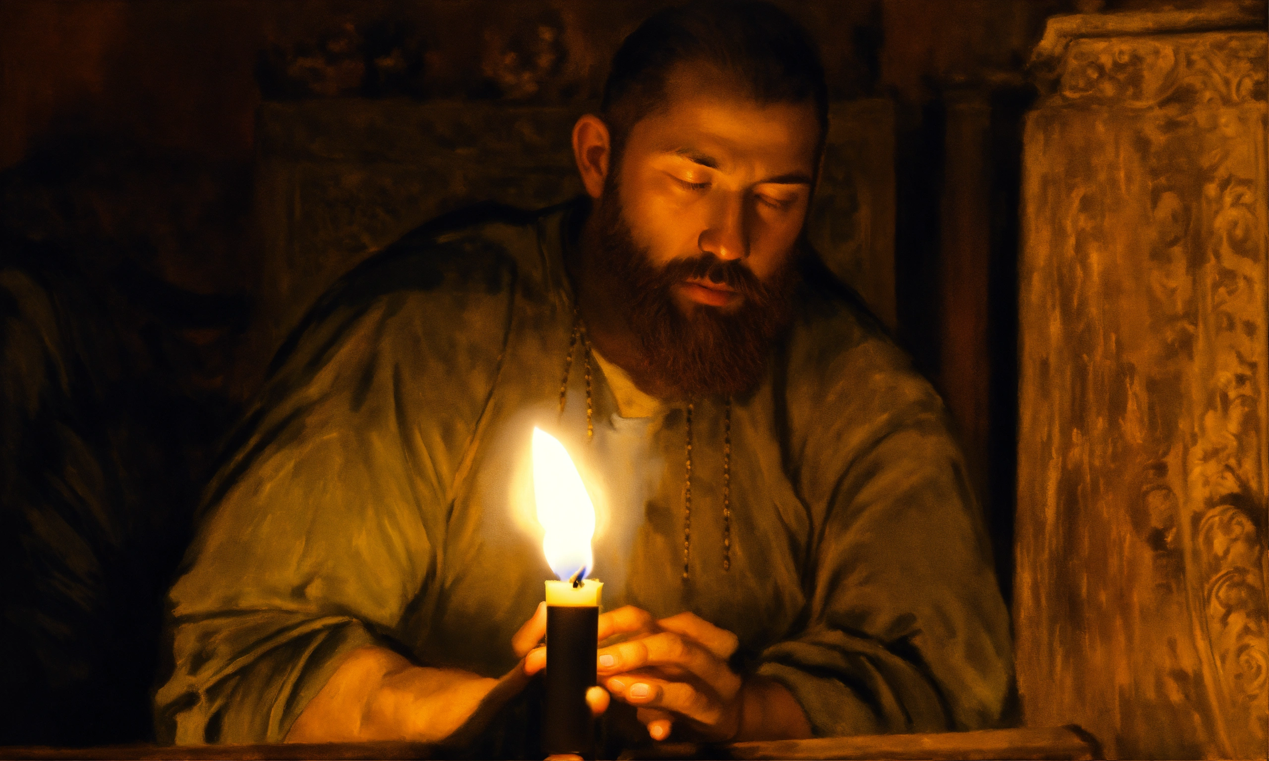 Oil painting of a man holding a candle to pray