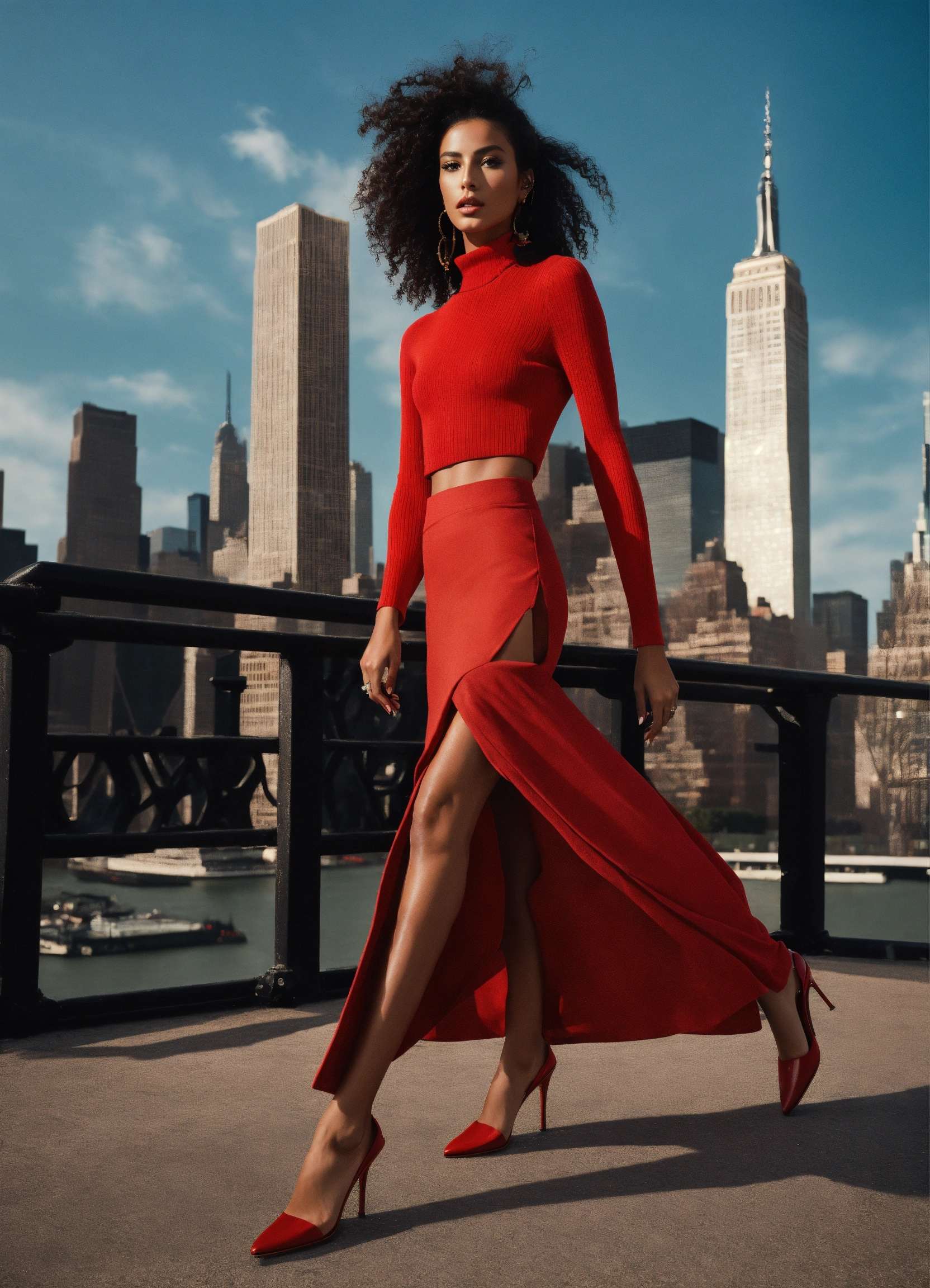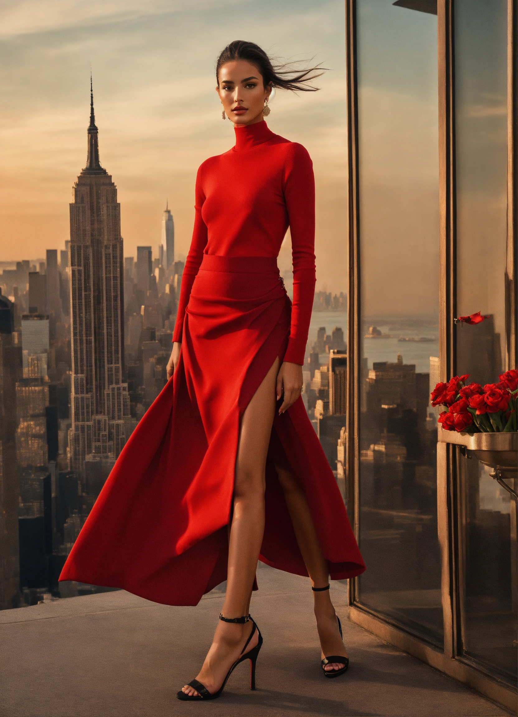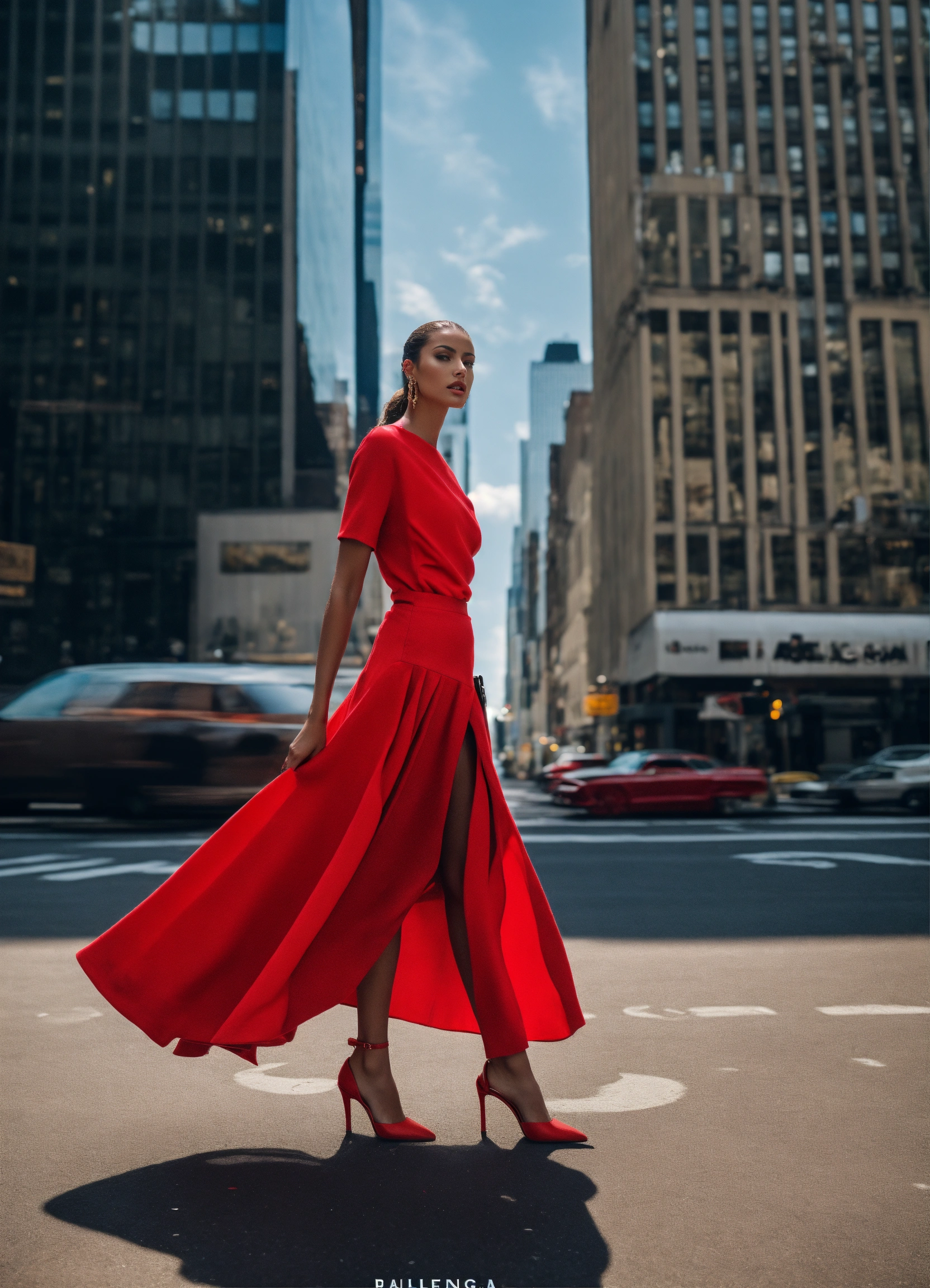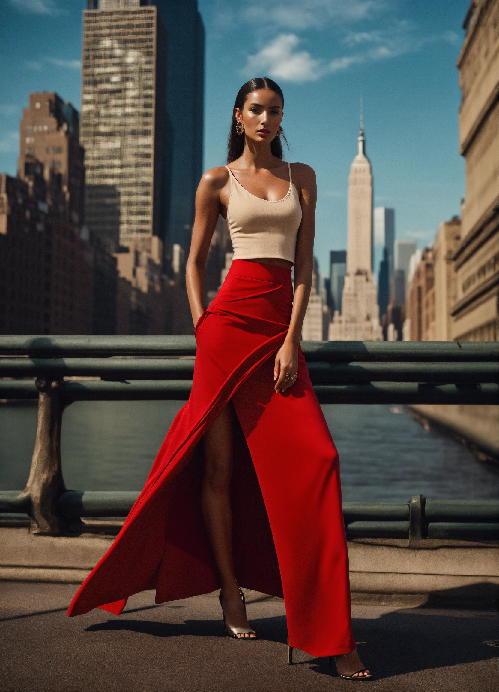 Create a visually stunning scene balenciaga photoshoot featuring a tanned brazillian supermodel wearing cotton simple red midi skirt with draping and side slit., stilettos, iso 400, surrealistic, 8k, full frame, new york city background