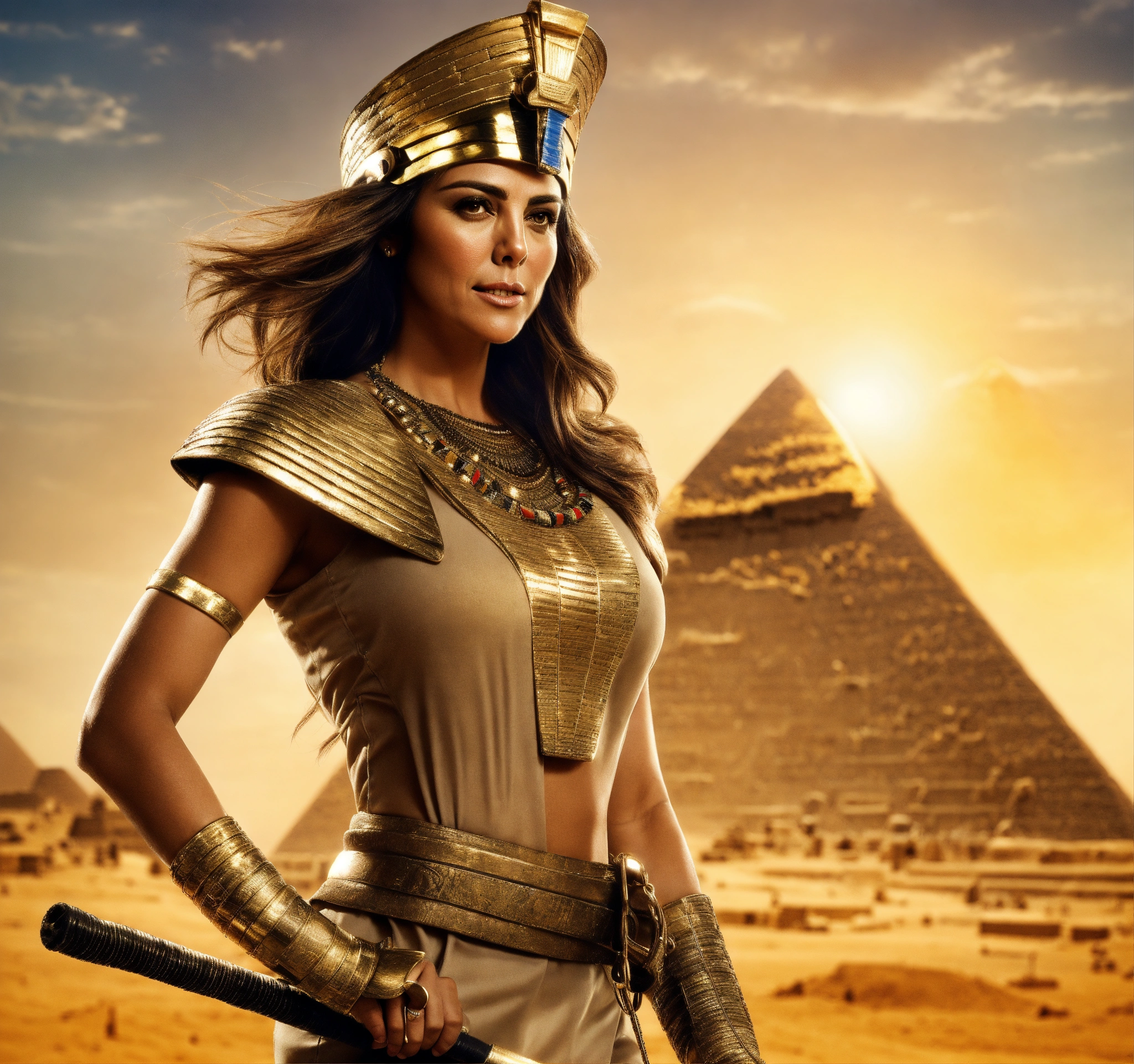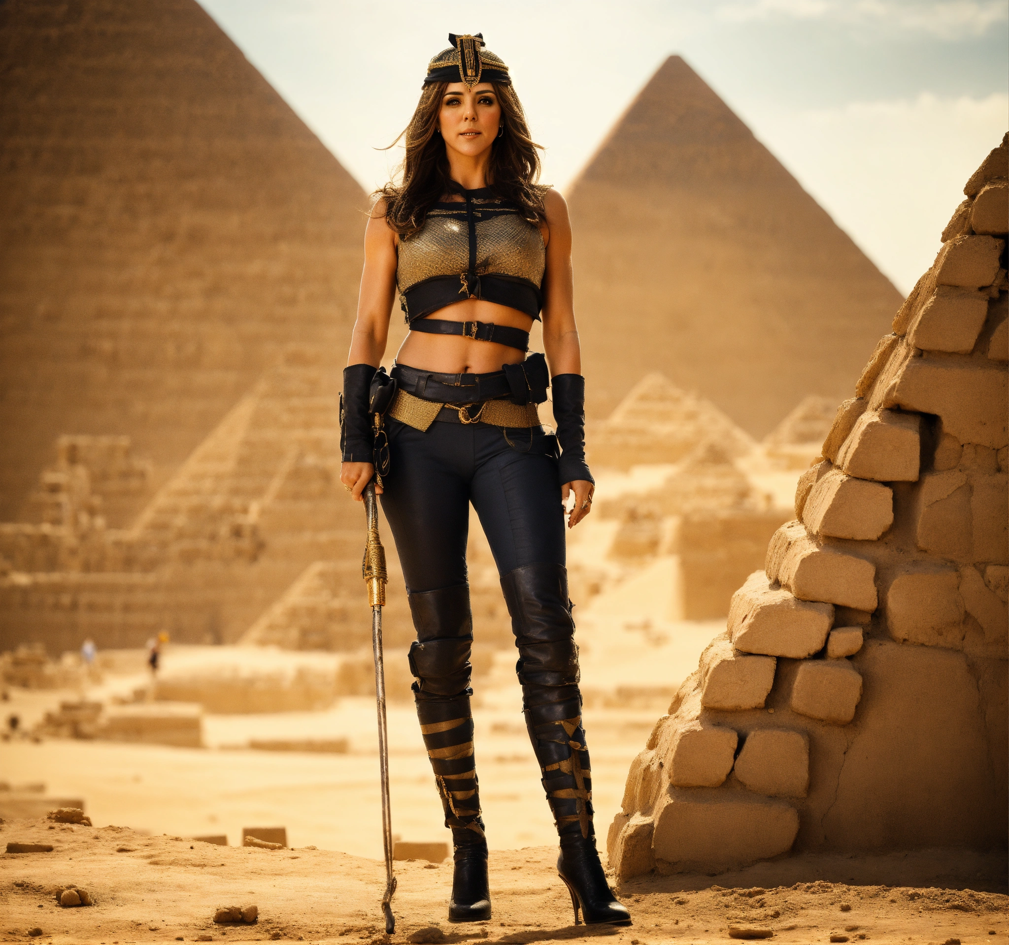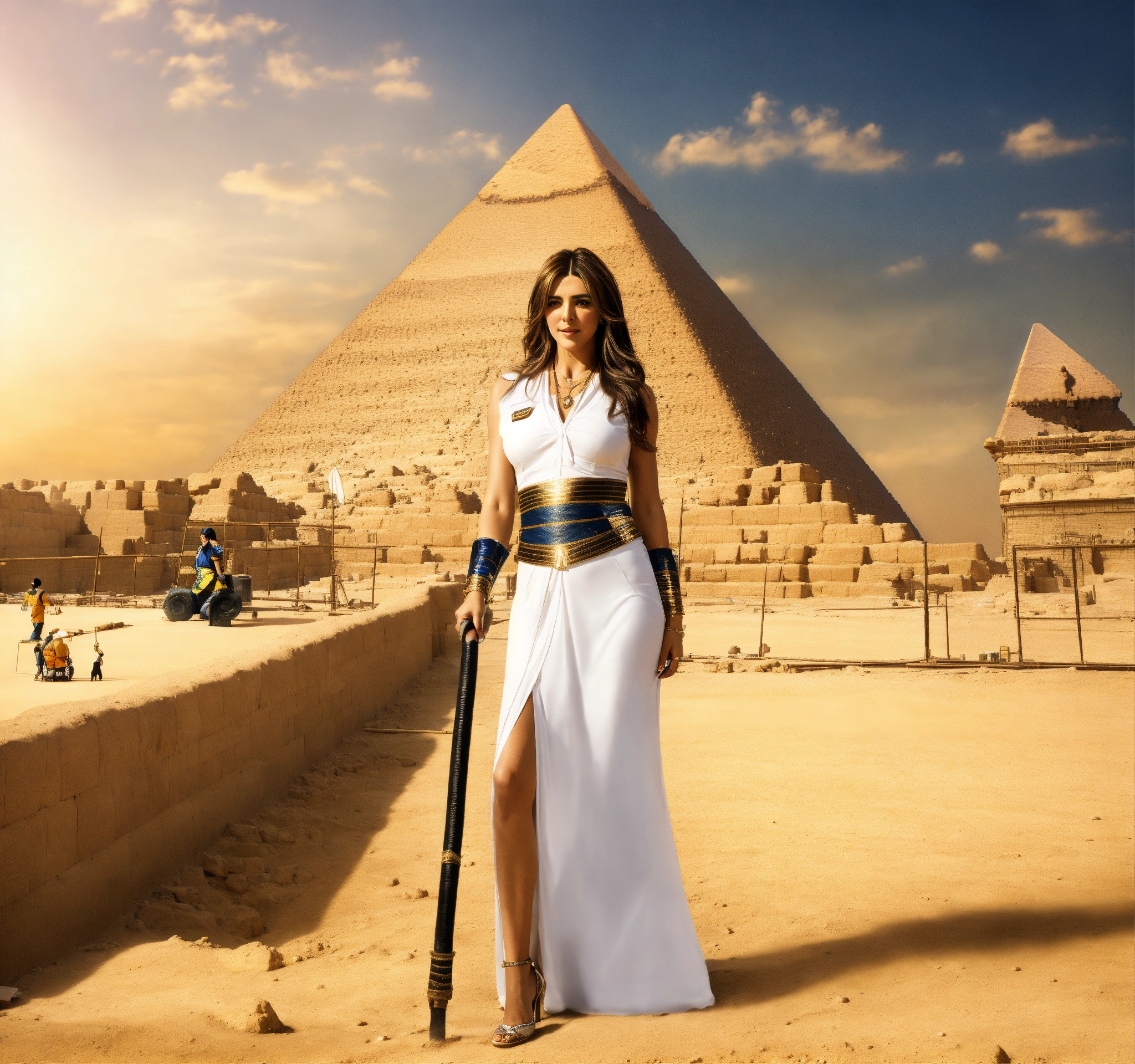 A gorgeous beautiful egyptian female like elizabeth hurley in full height holding a whip in hand in attractive outfit, working as prison guard on the construction of the great pyramid. a lot of egyptian workers around are doing their job. cinematic view. sharp detail.
