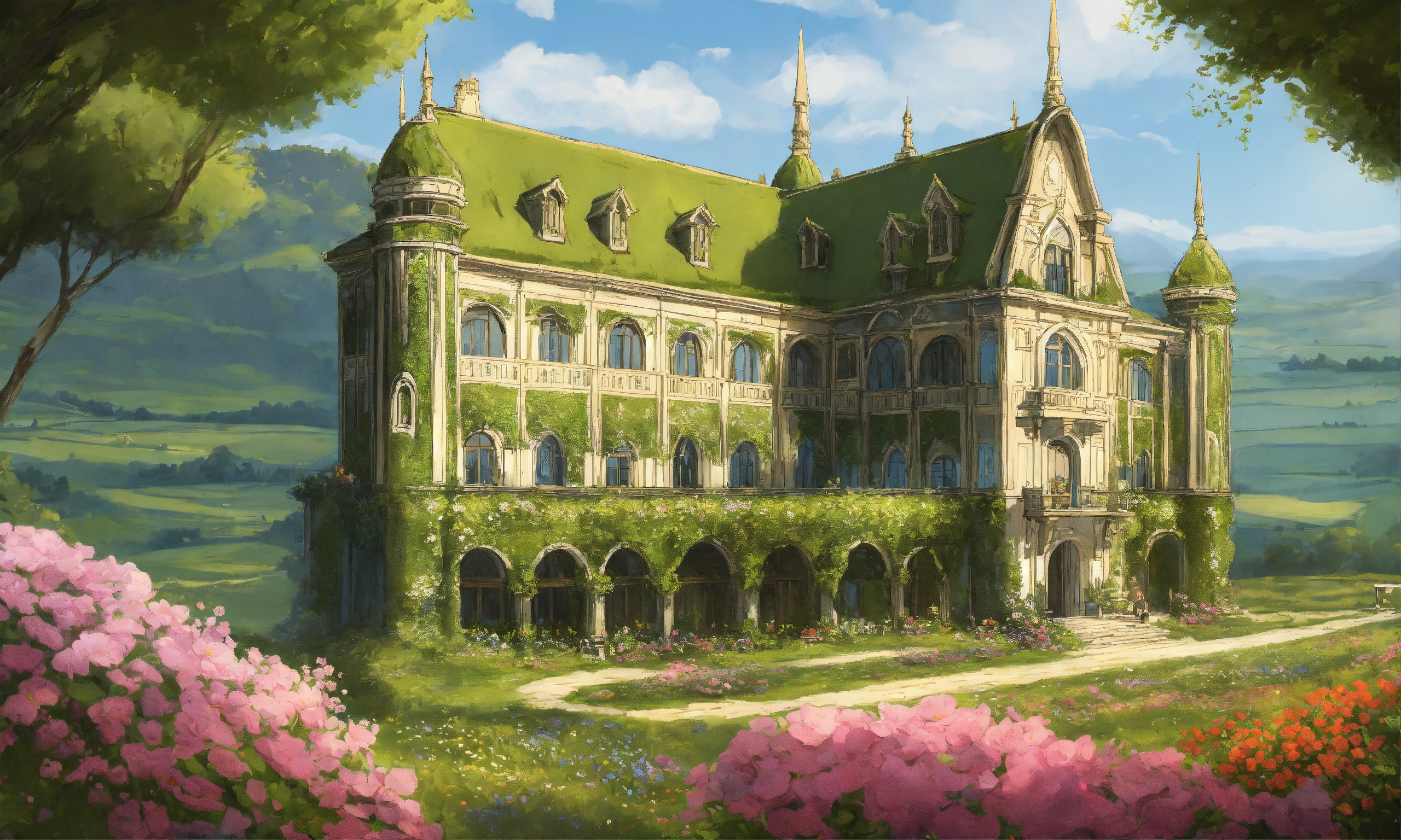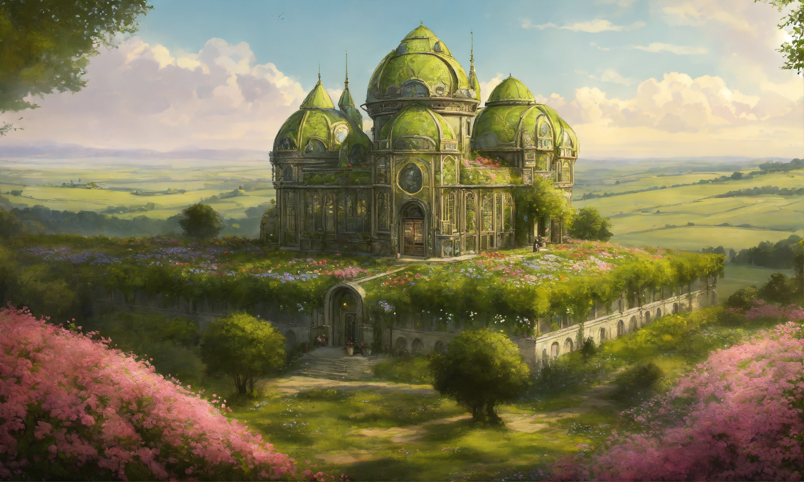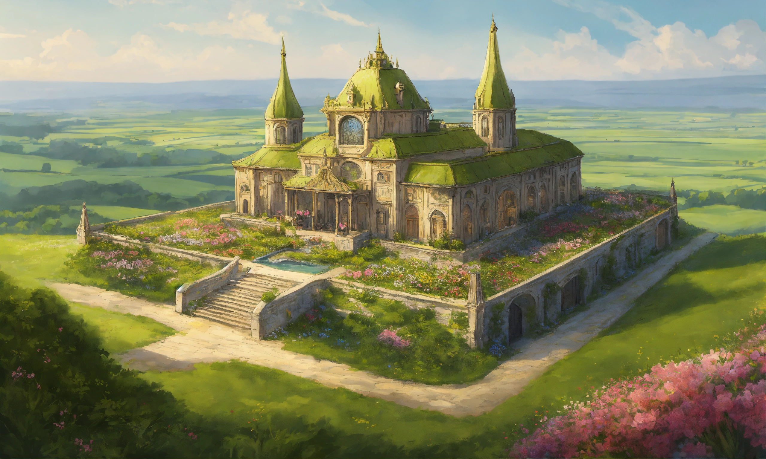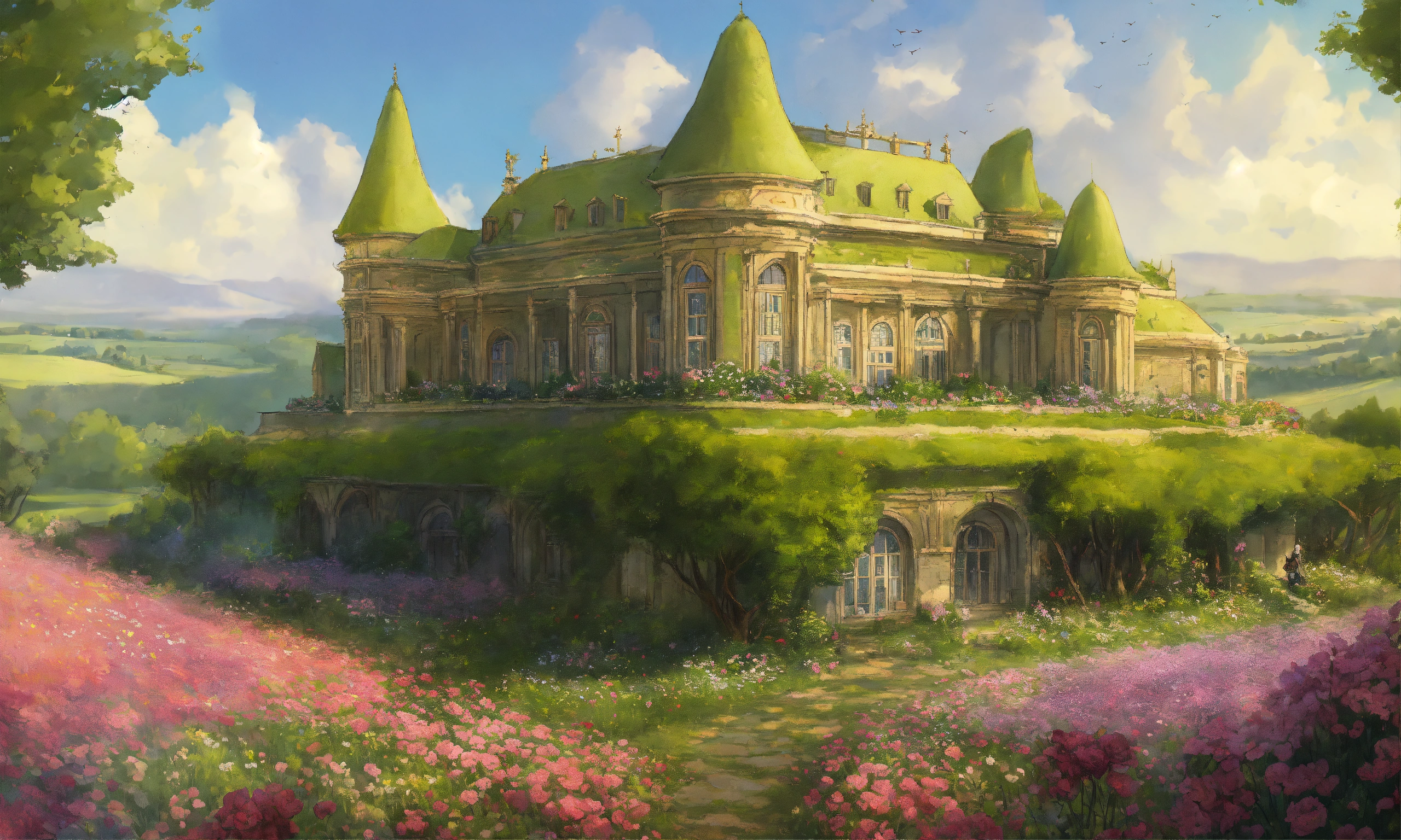 Drawing of a fully shown elegant high elf sci fi palace overlooking a field of flowers in the french countryside, olive green roof, beautiful day, immensely detailed