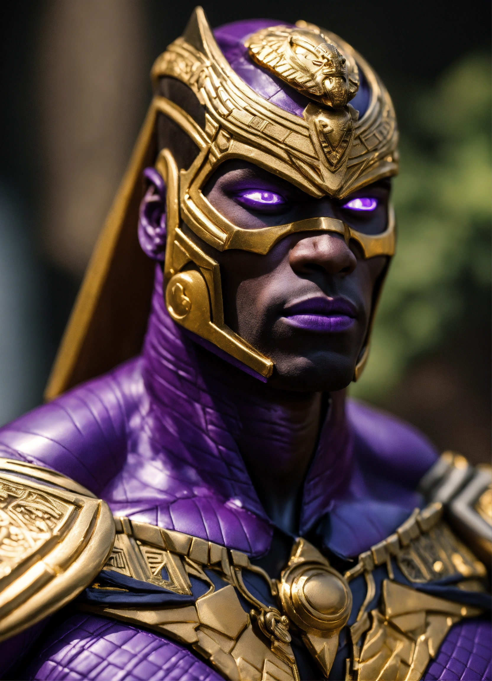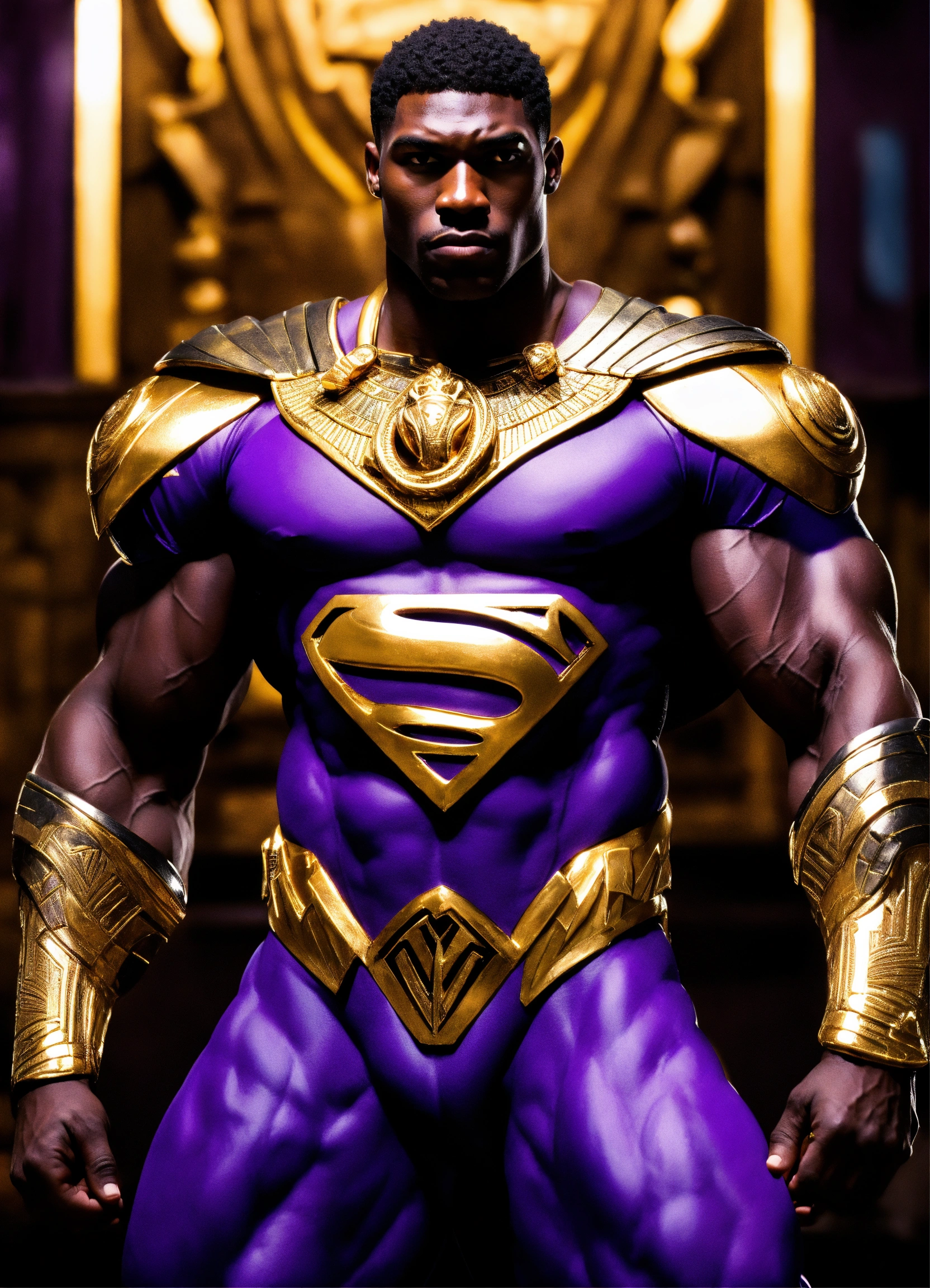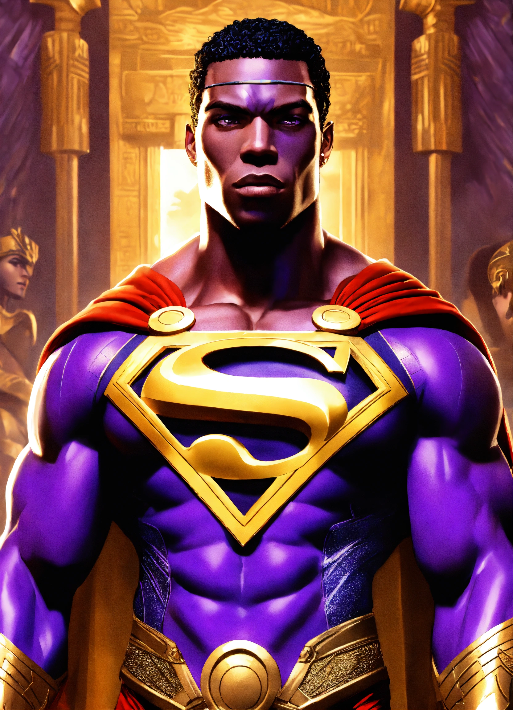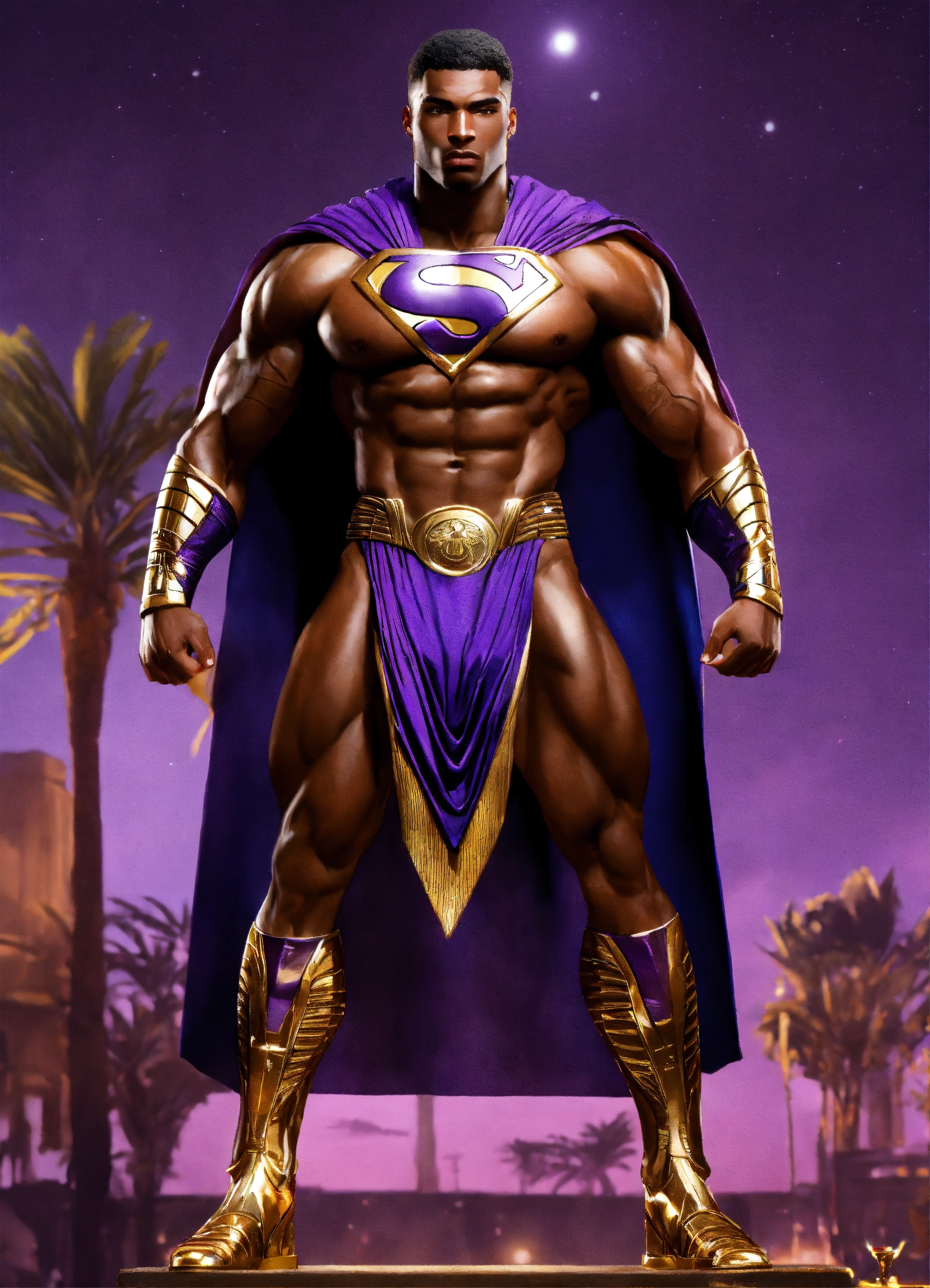 Ultra-detailed purple black & gold egyptian-designed super-advanced muscular african superman
