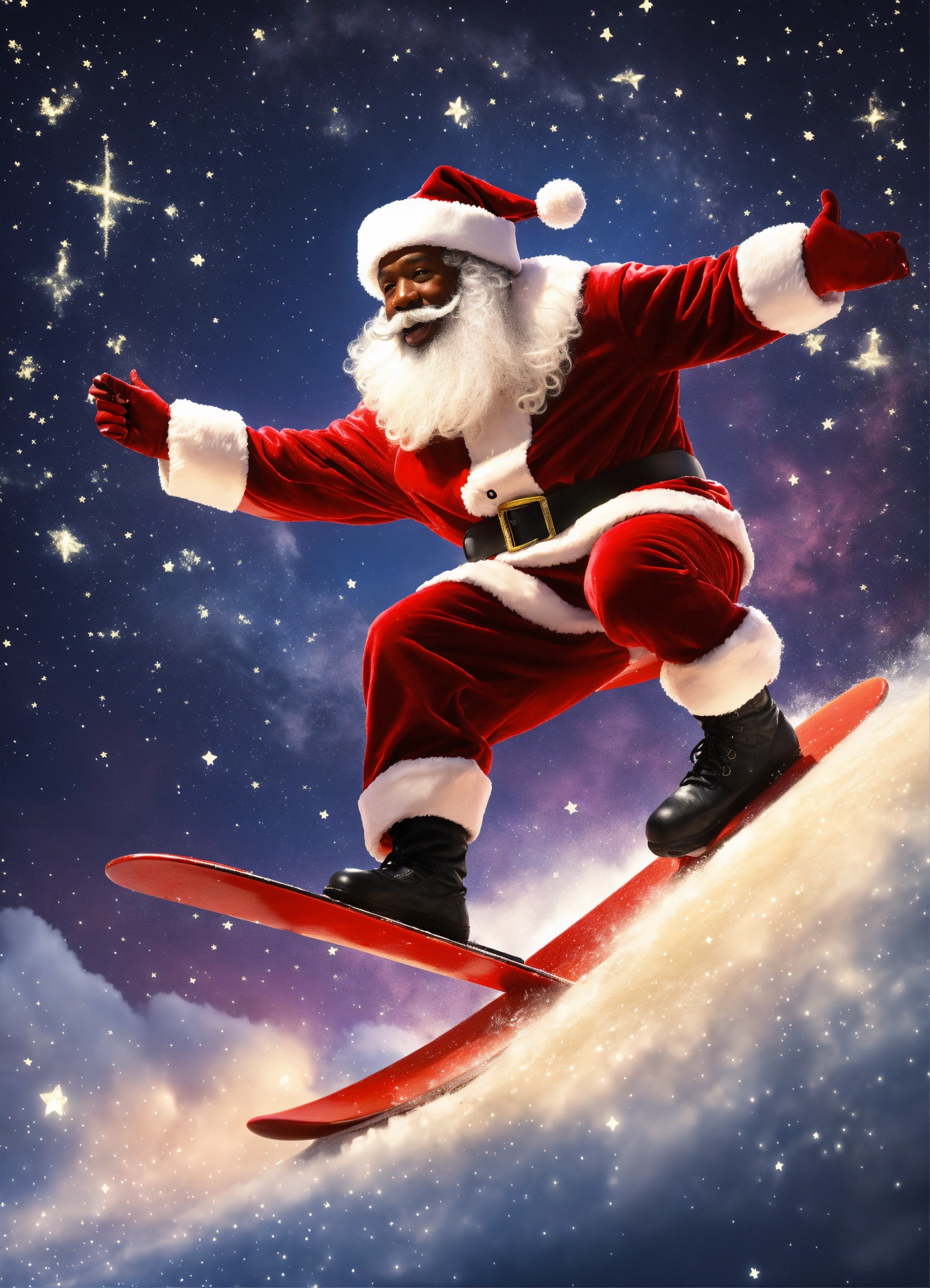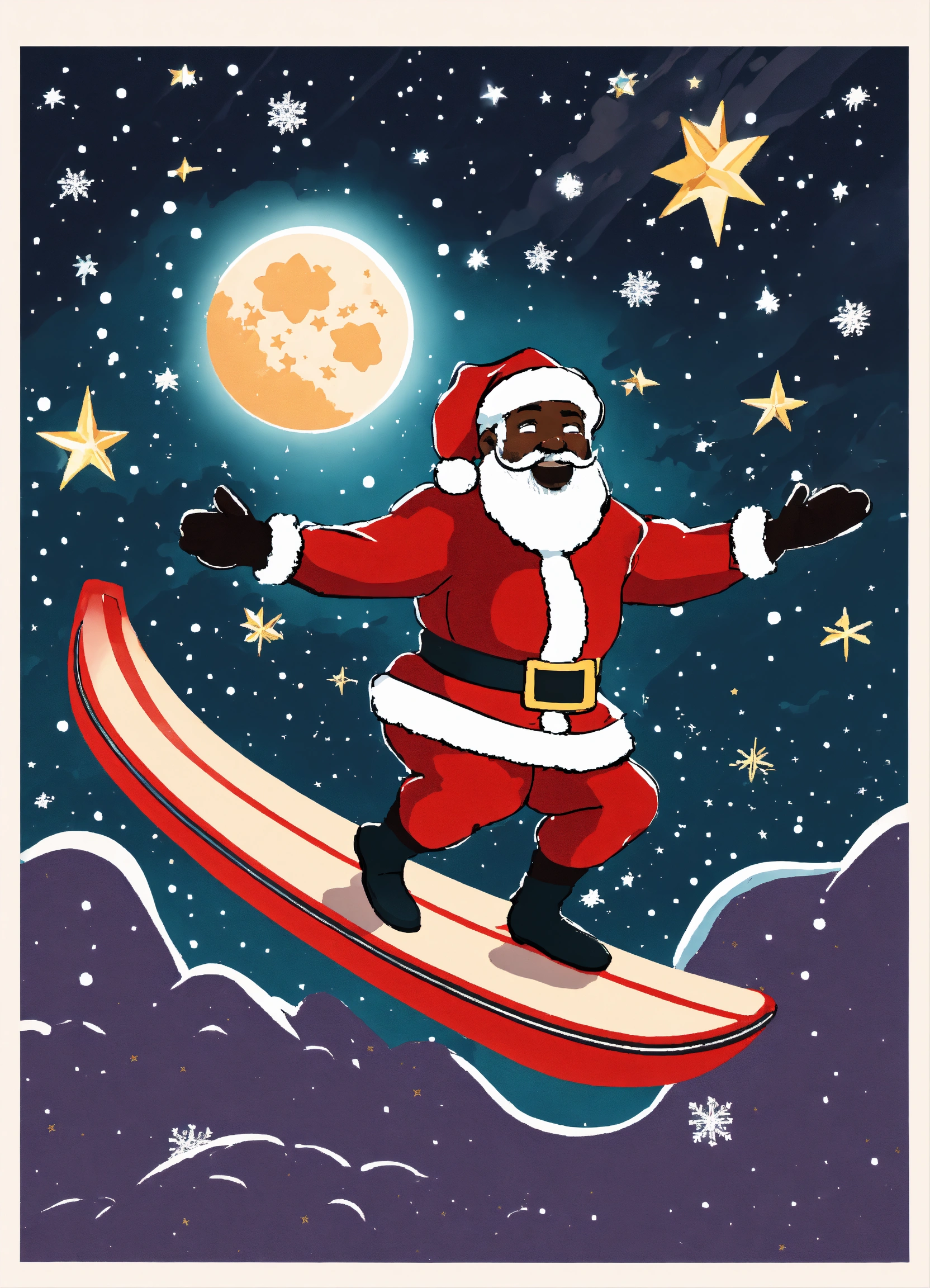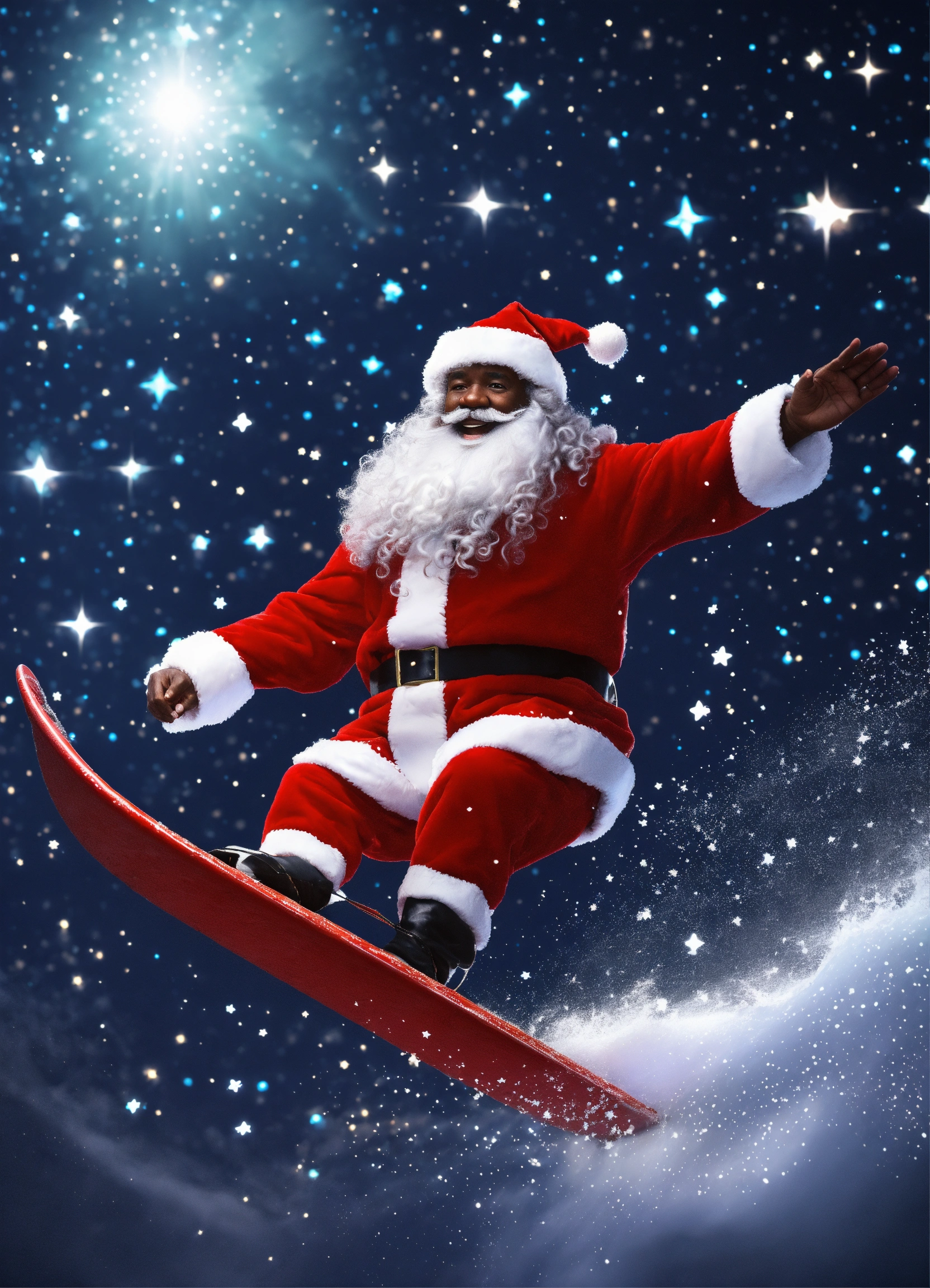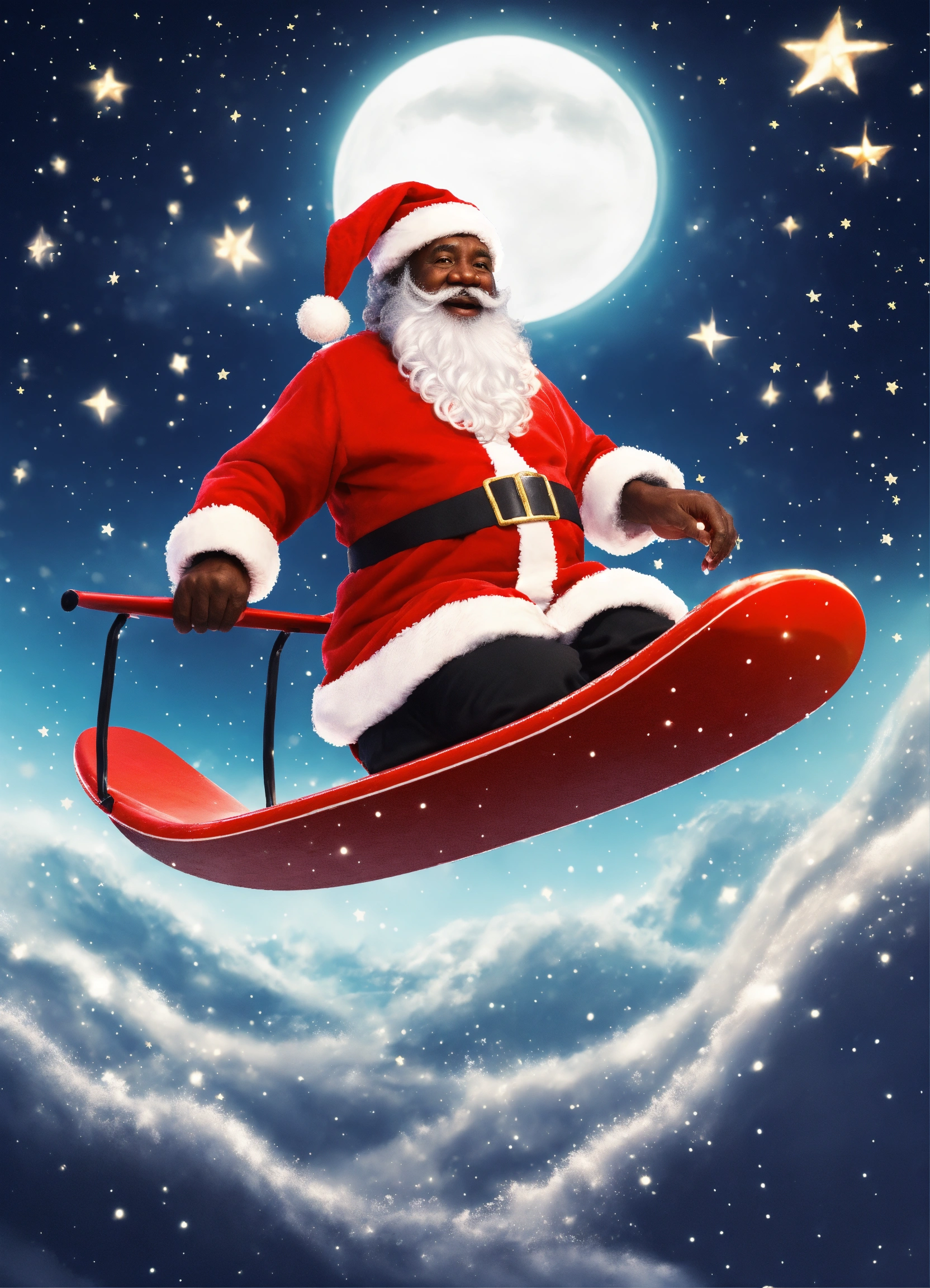 Black santa clause surfing on red sled in the sky with stars in the sky