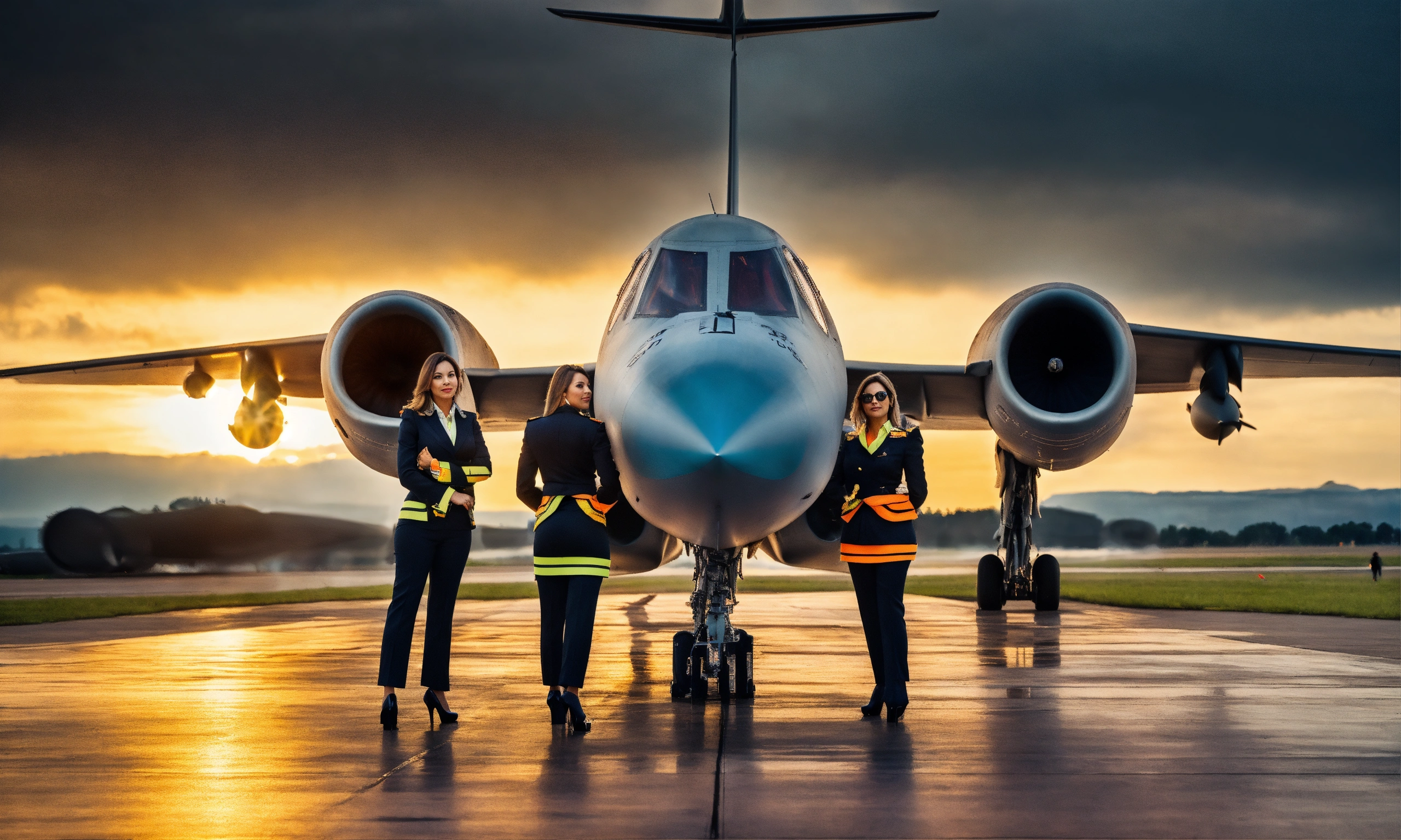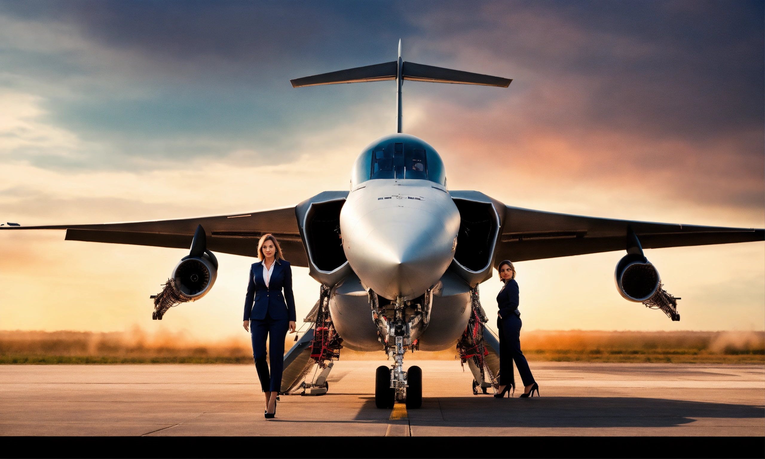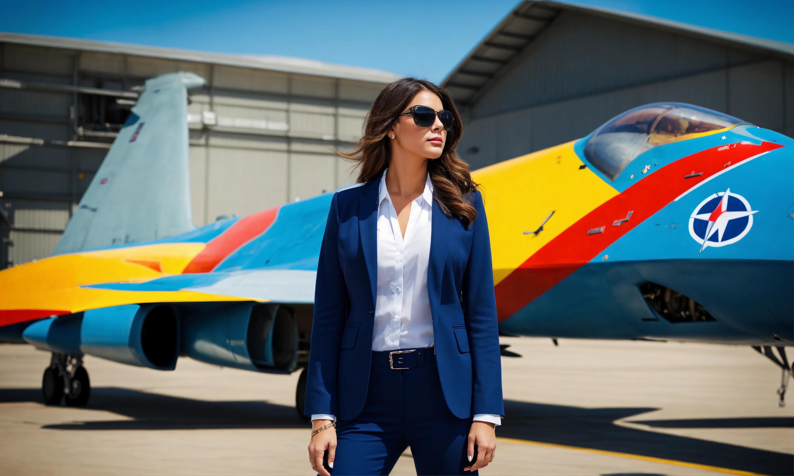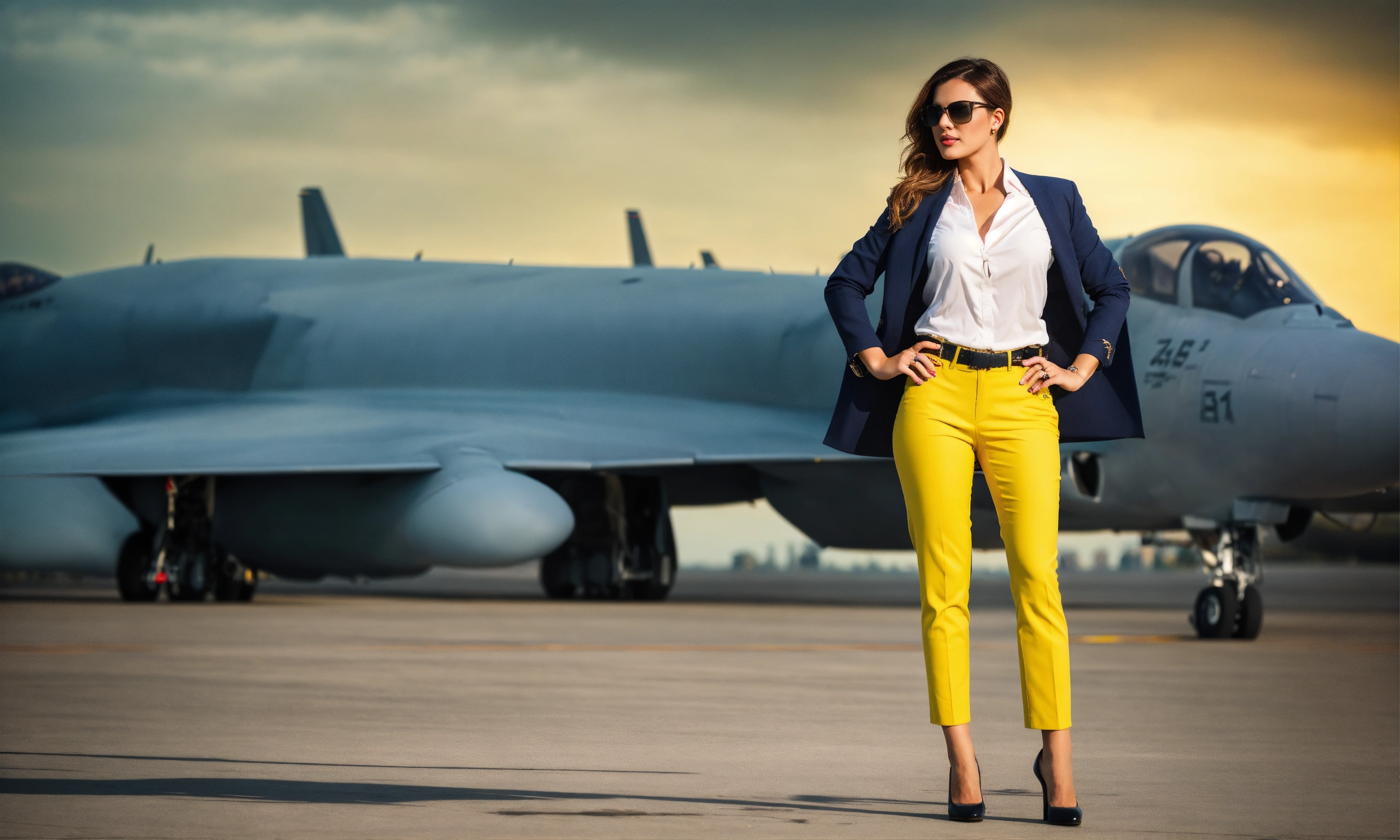 Cool businesswomen standing in the front of a big military jet, hands in the pants, colorful image, view a little be from the down to the up