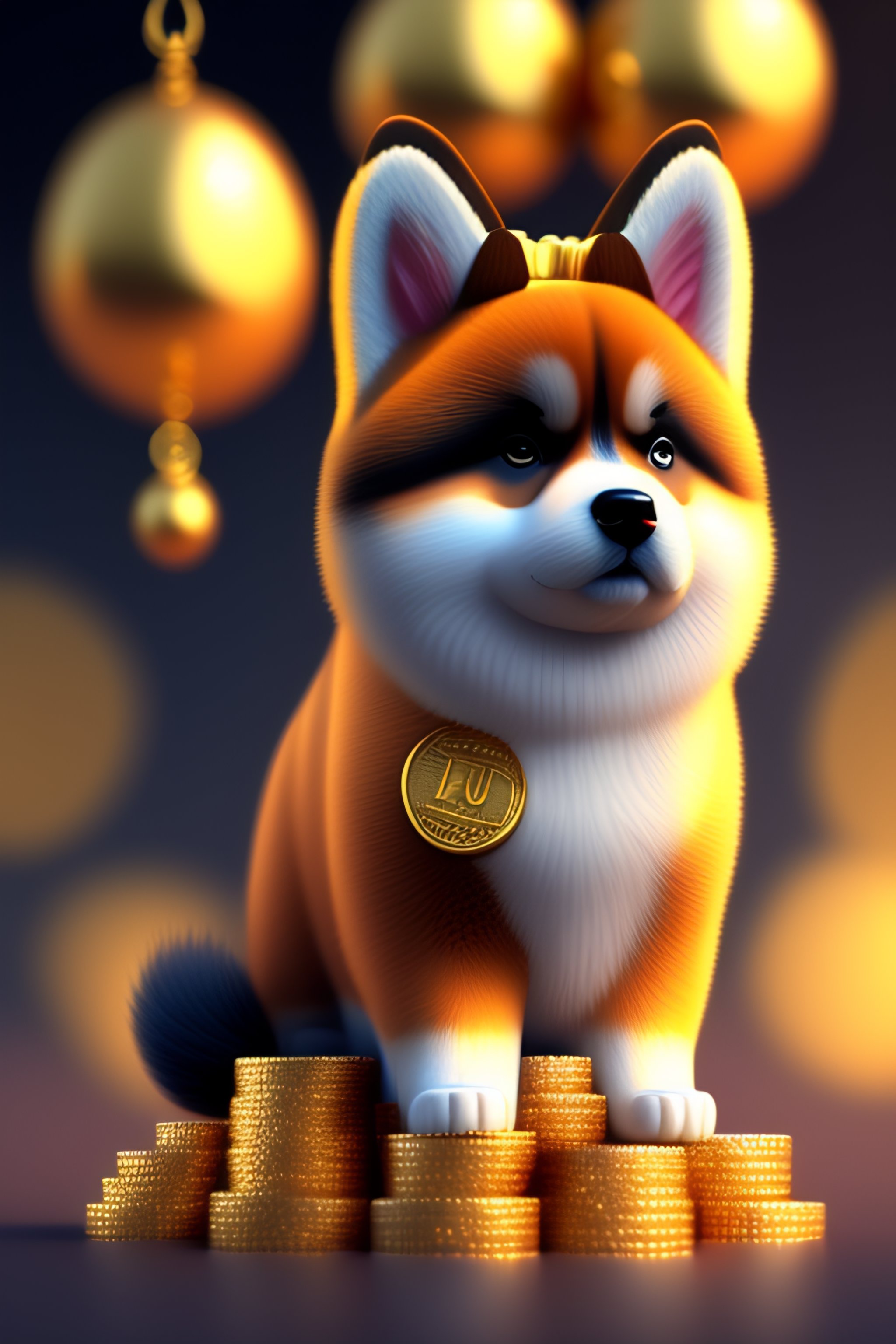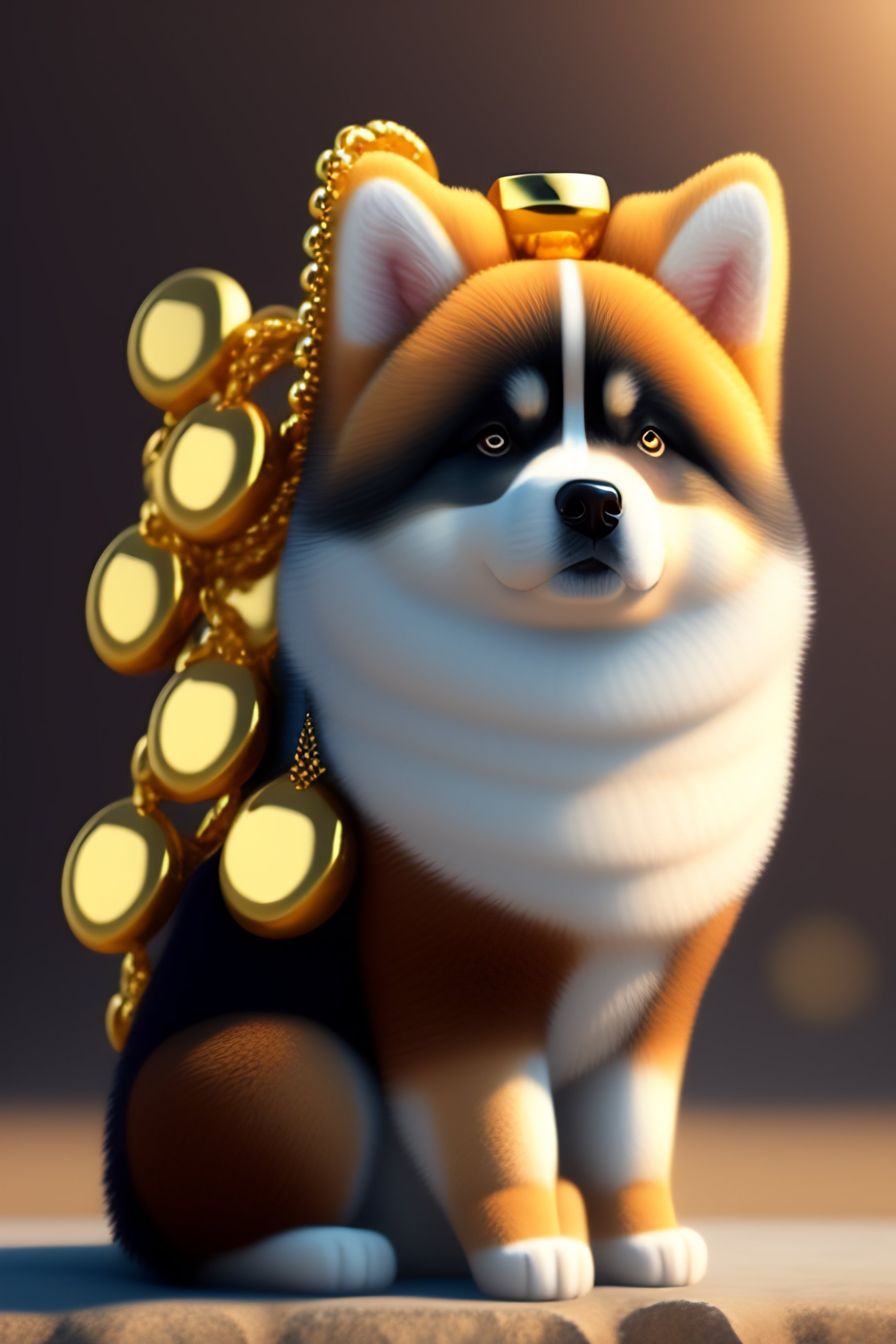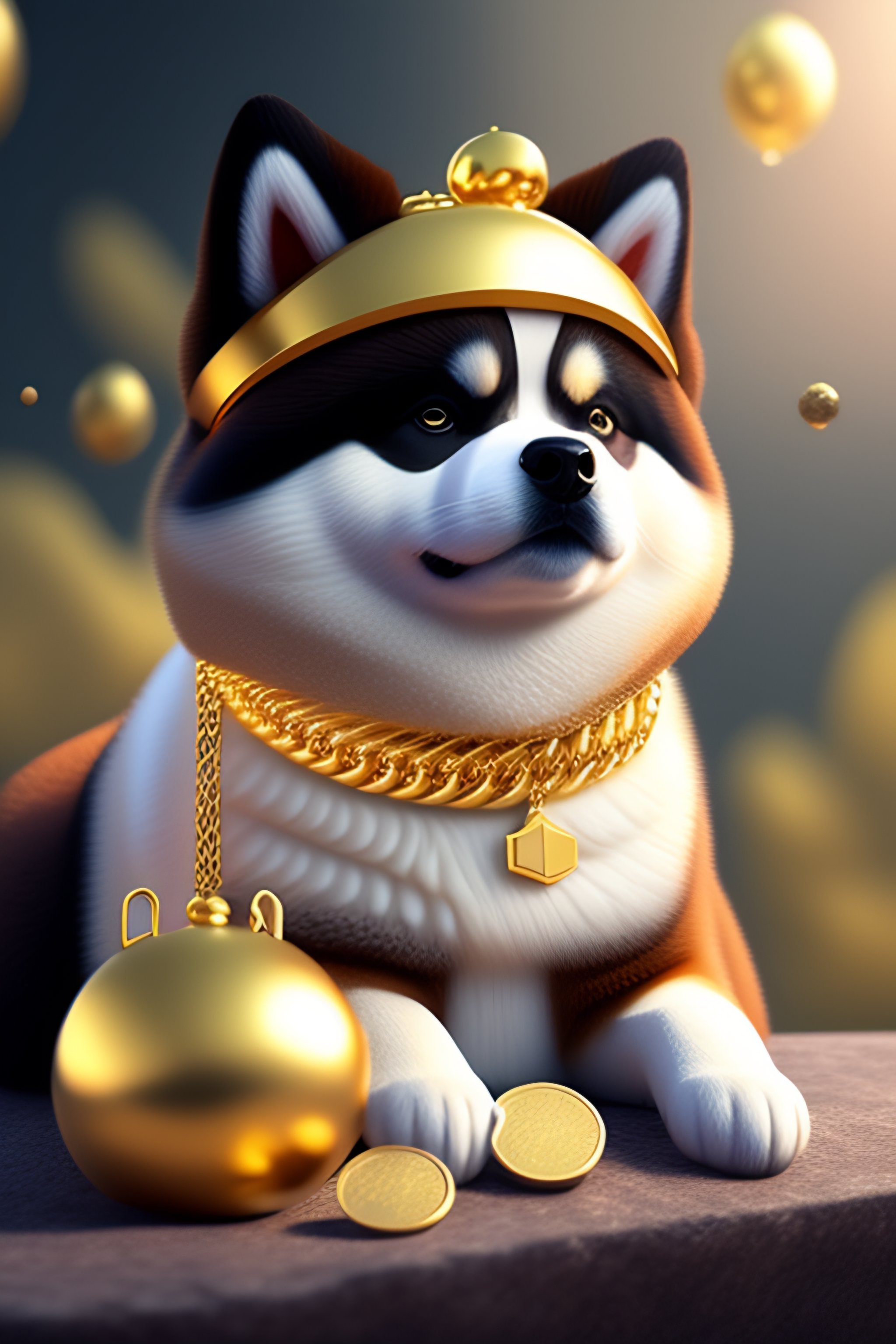 Cute and adorable cartoon fluffy akita inu with cap and a goldchain sitting on a pile of golden coins btc, fantasy, dreamlike, city scenario, surrealism, super cute, trending on artstation