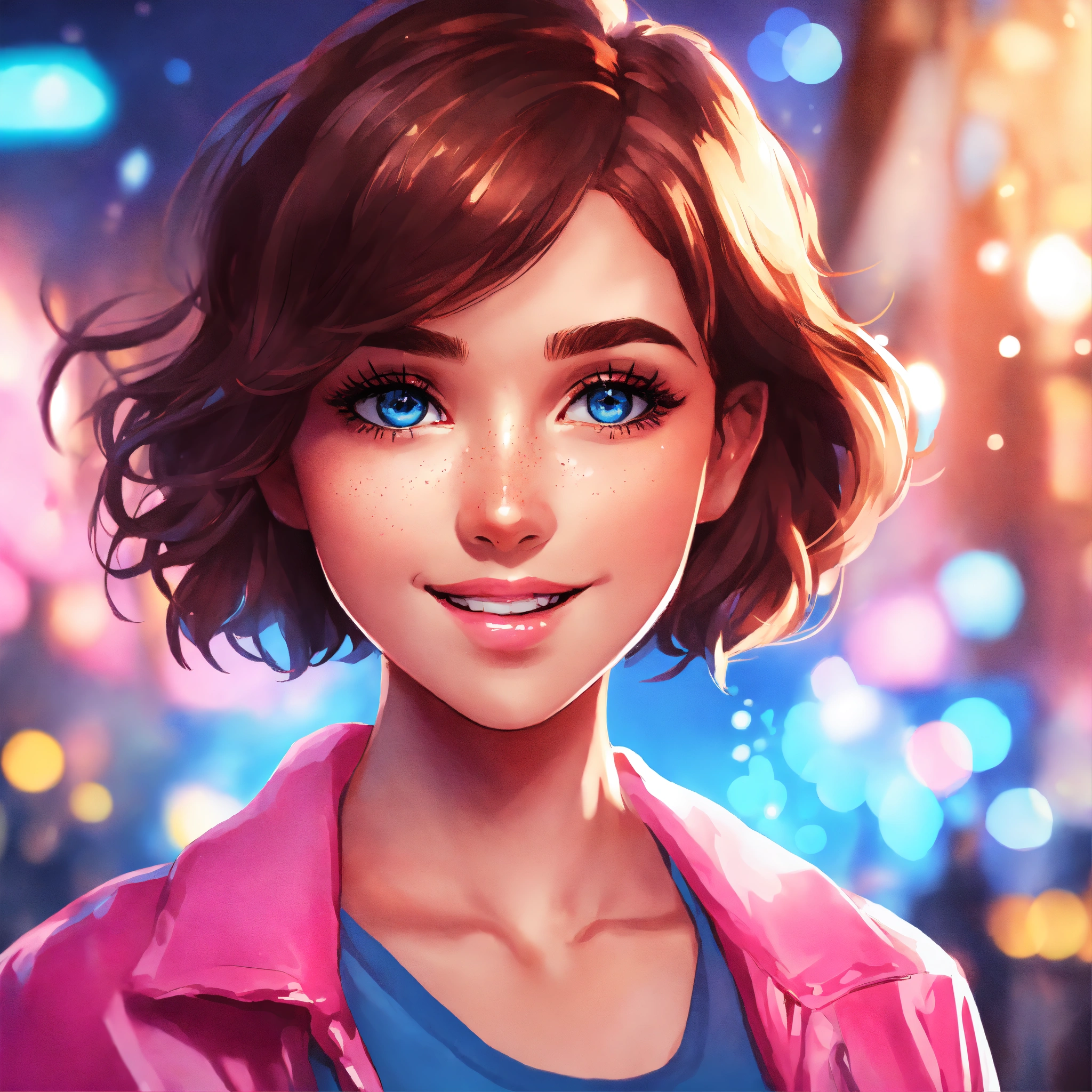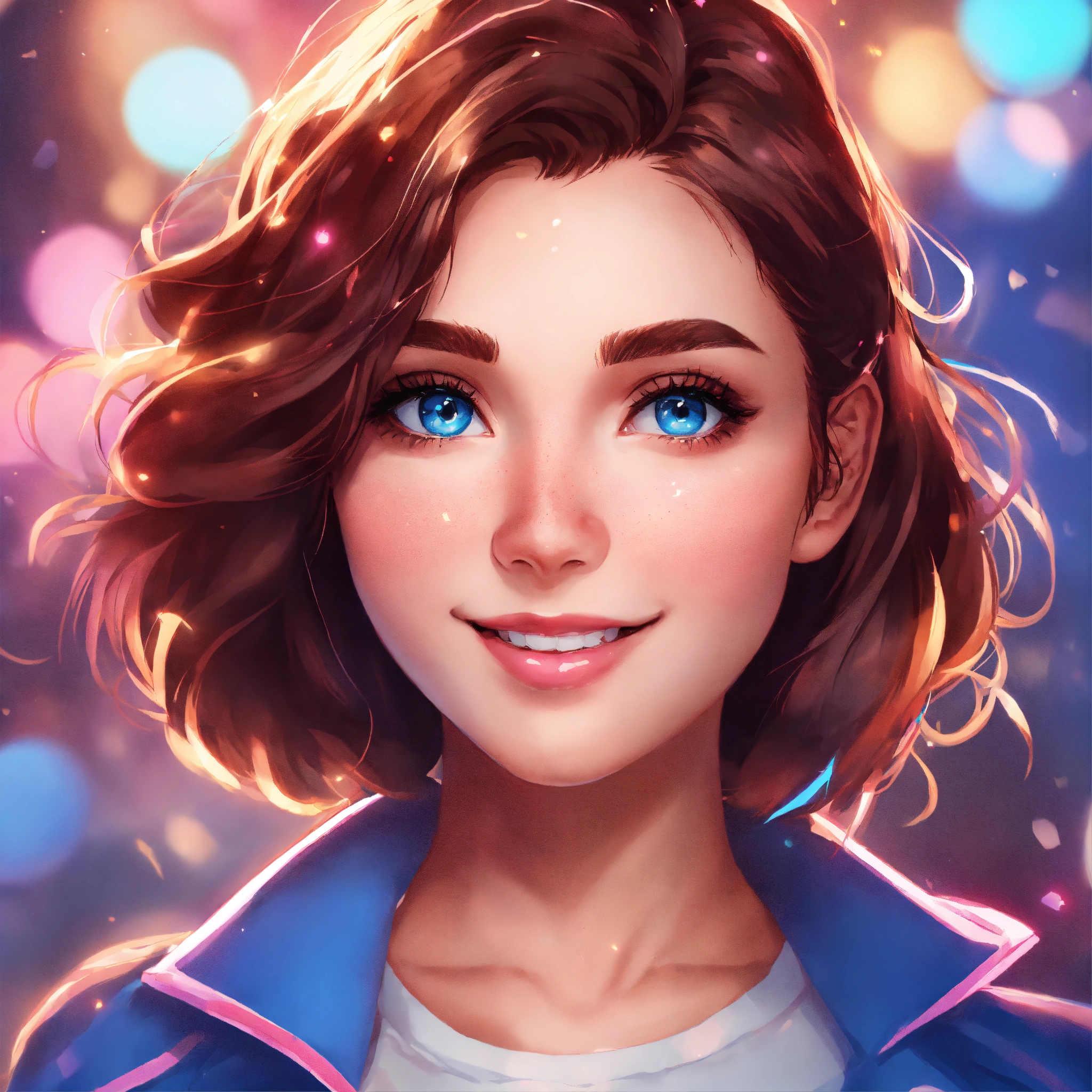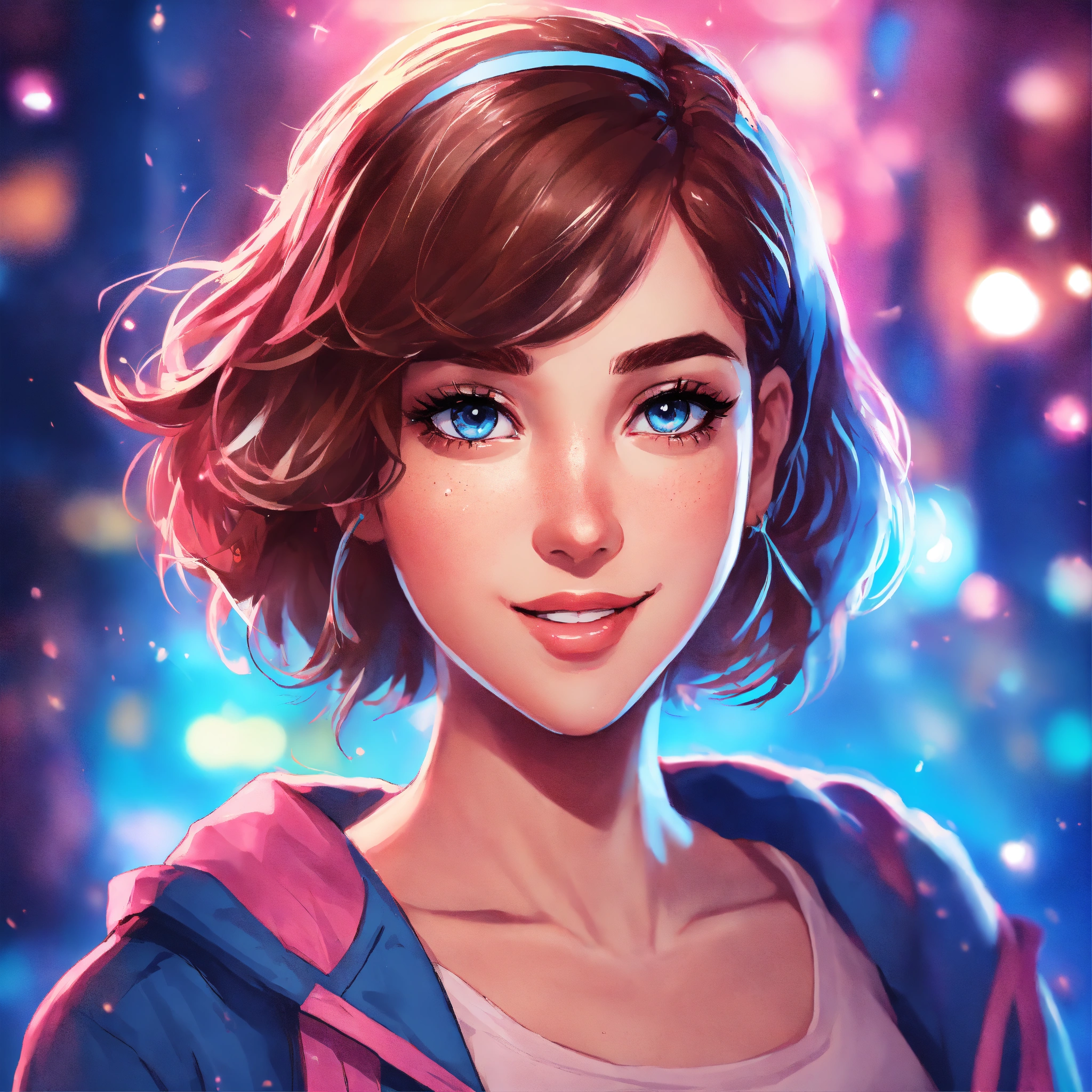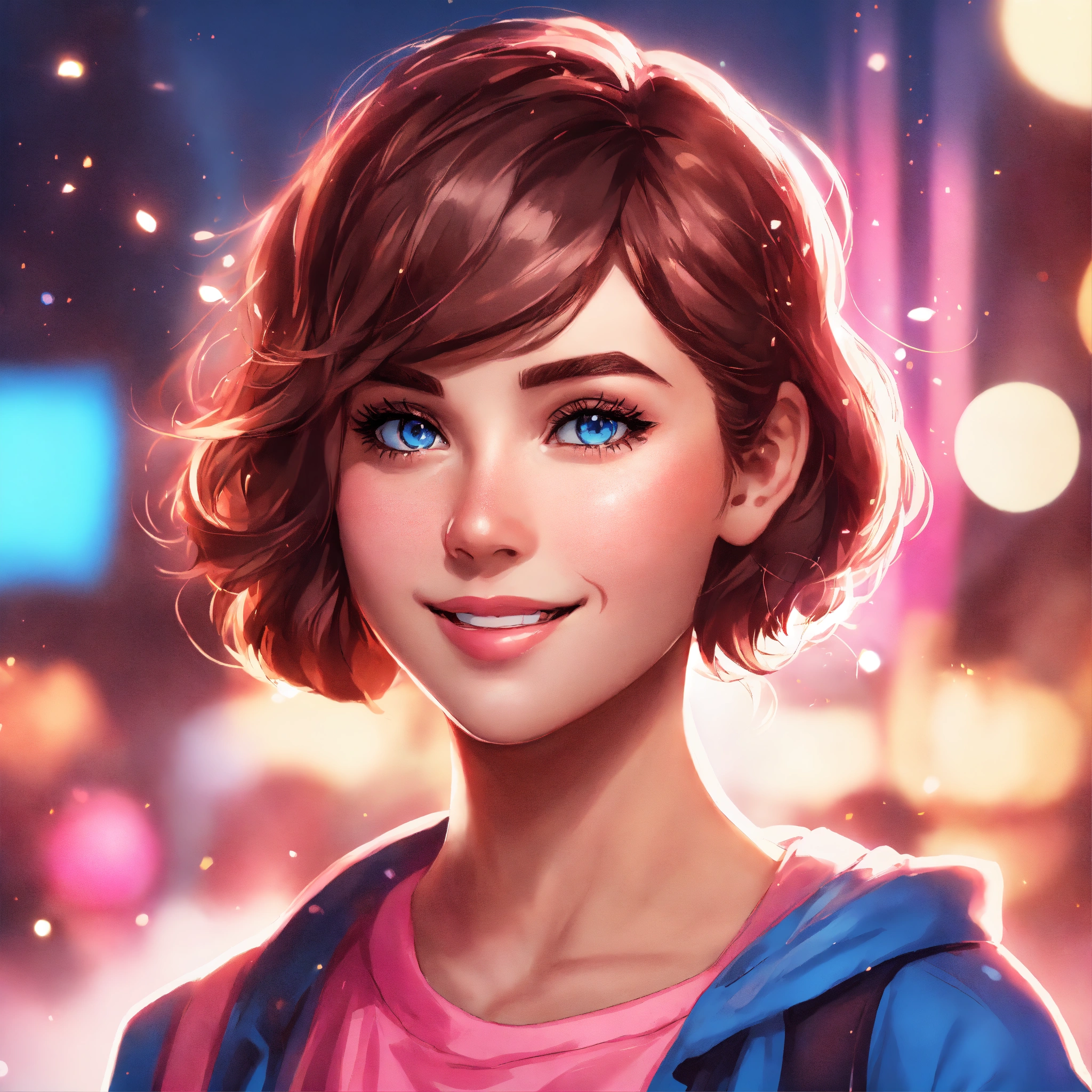 Youtube icon, comic book art style, bright lighting, pink and blue theme, bokeh, animated character cute girl, short brown hair, smiling, white skin, blue eyes